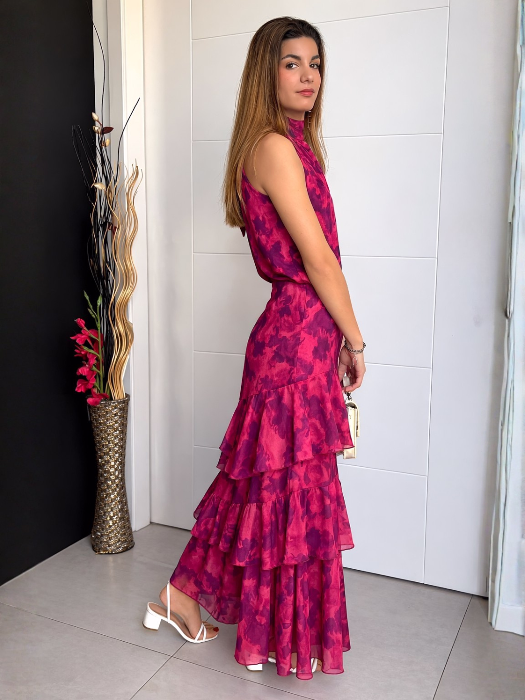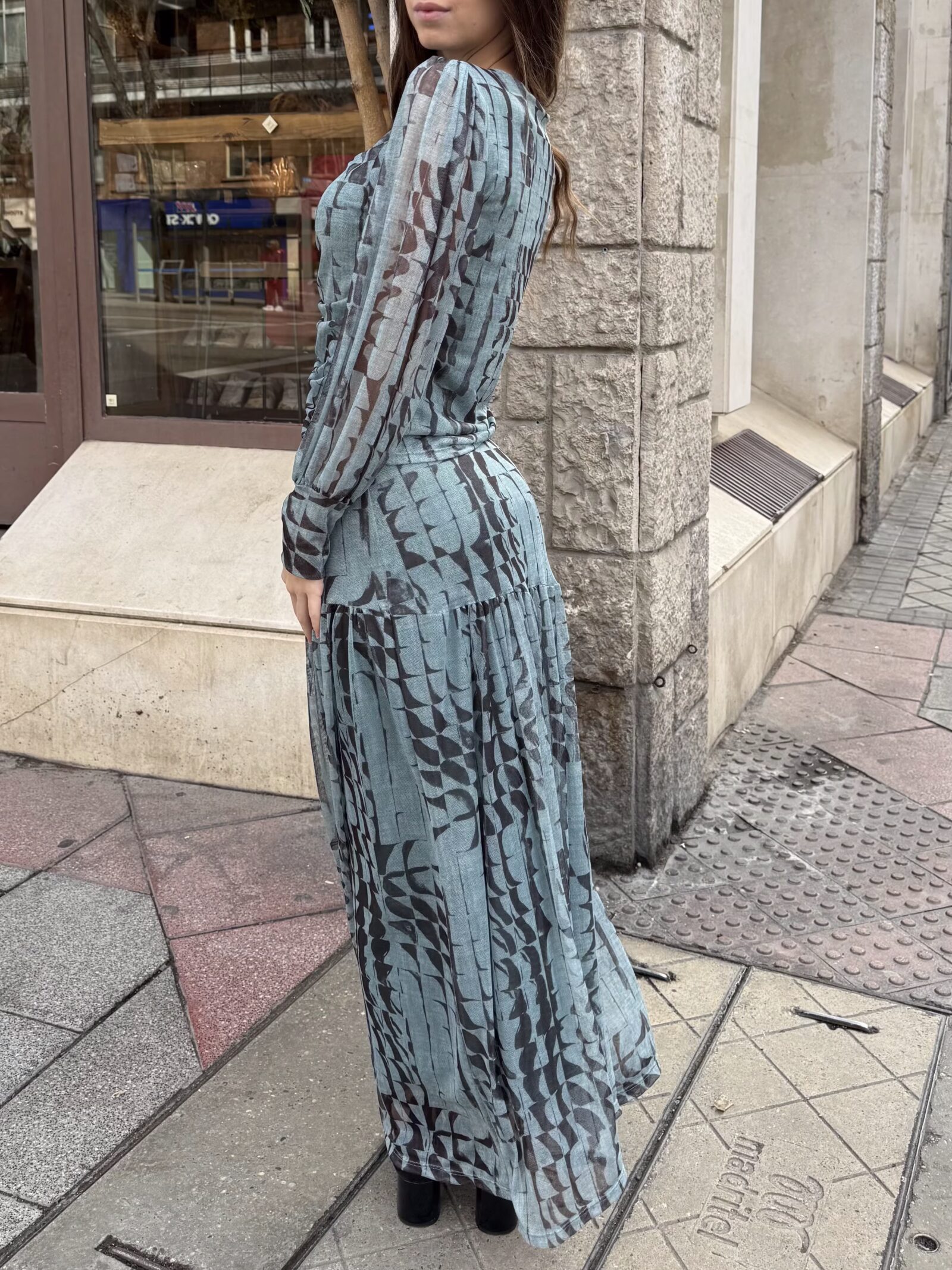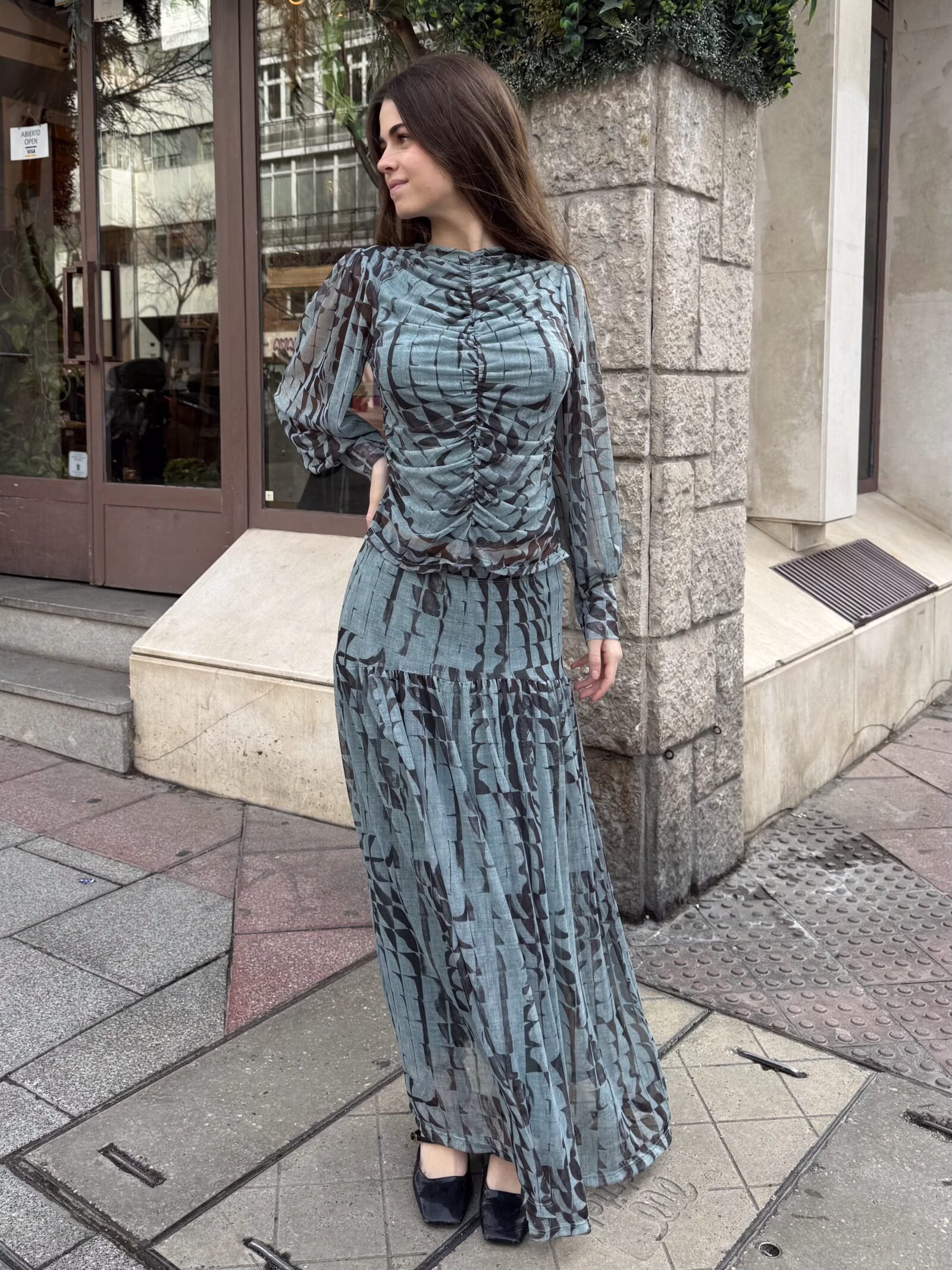 Falda Larga Volantes Estampada Turquesa y Chocolate