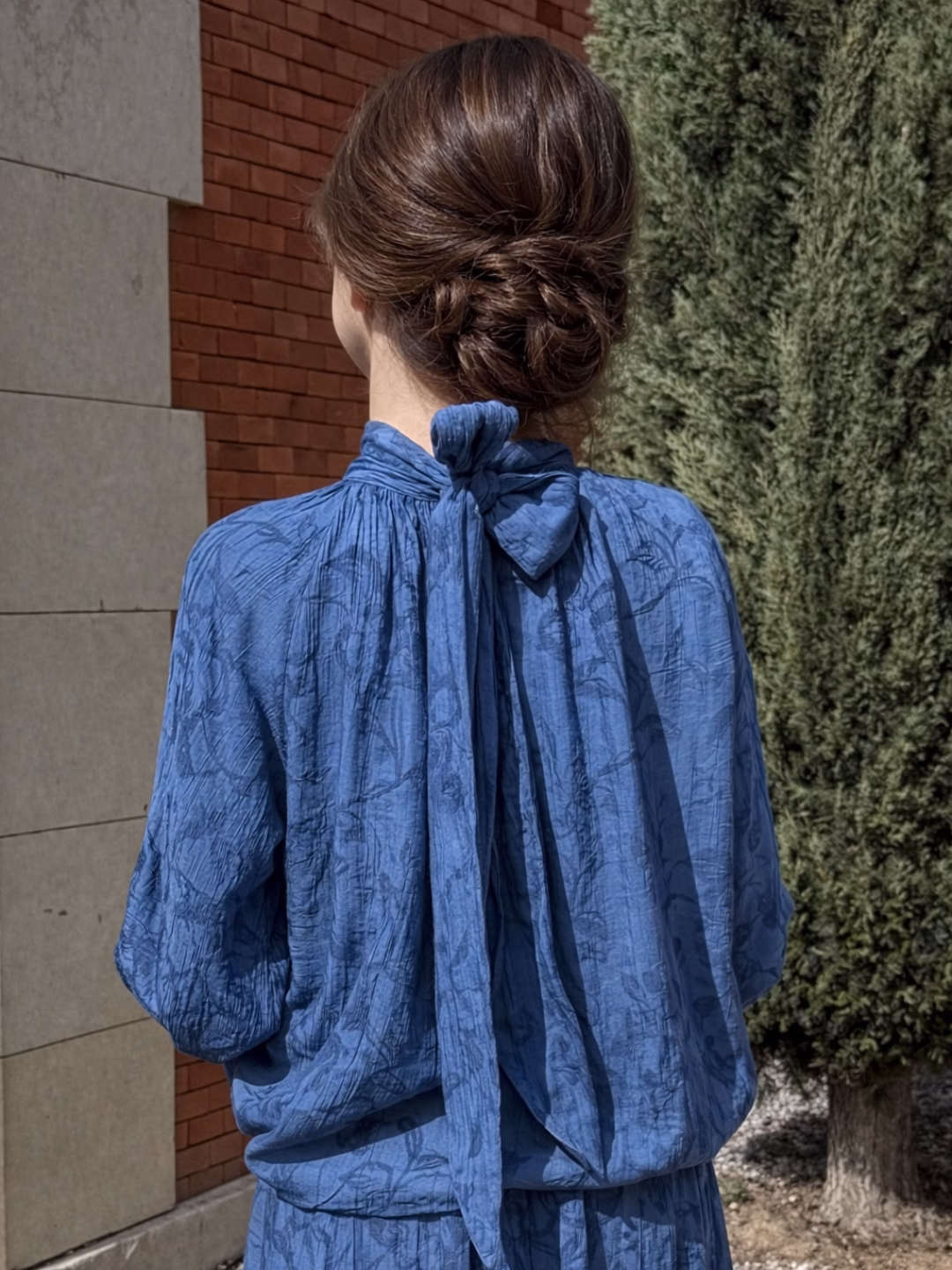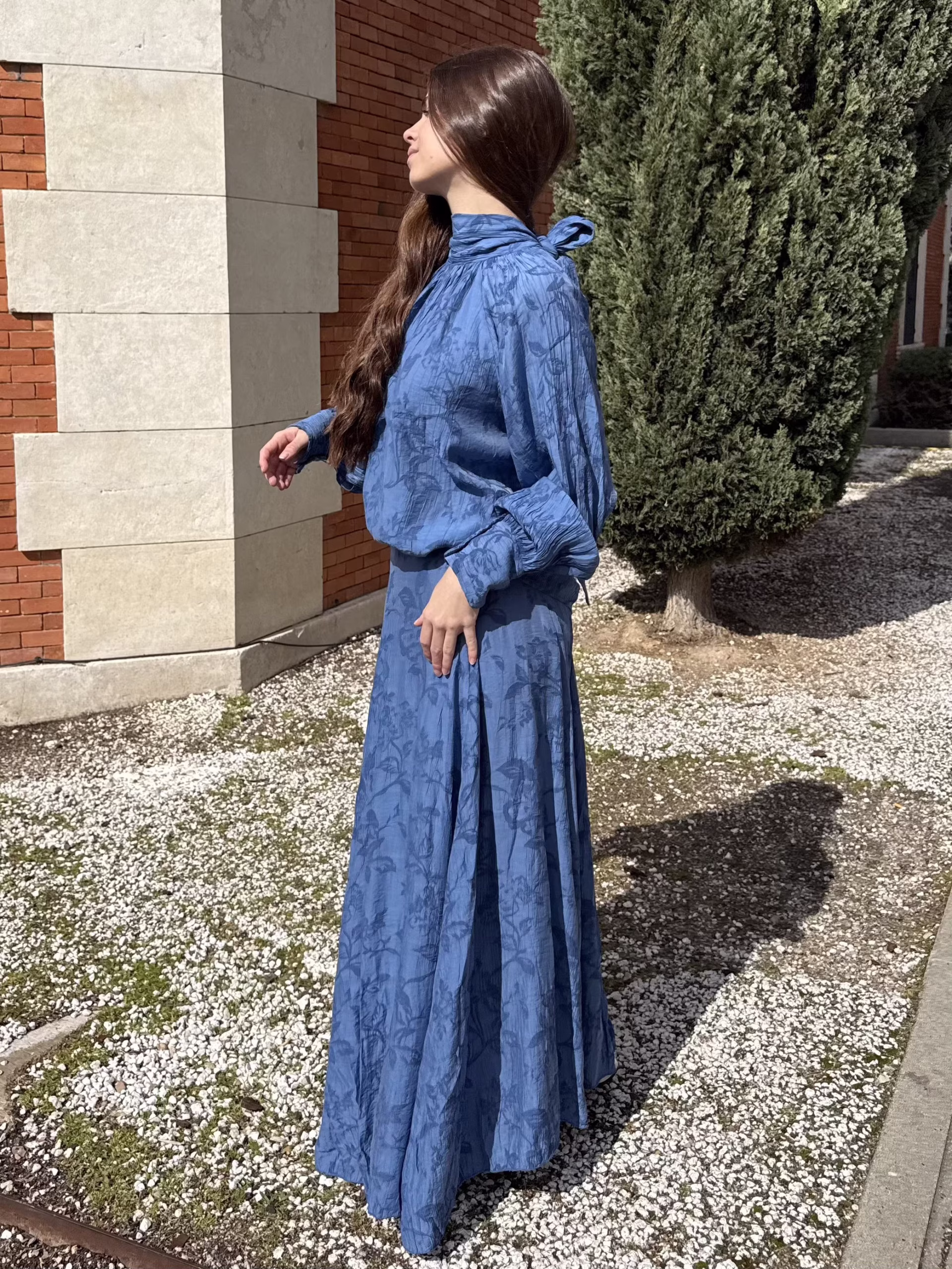 Blusa en tono azul empolvado con delicado bordado floral. Cuello alto con lazada en la parte trasera. El corte es amplio y fluido, con mangas largas ligeramente abullonadas y puño ajustado.
