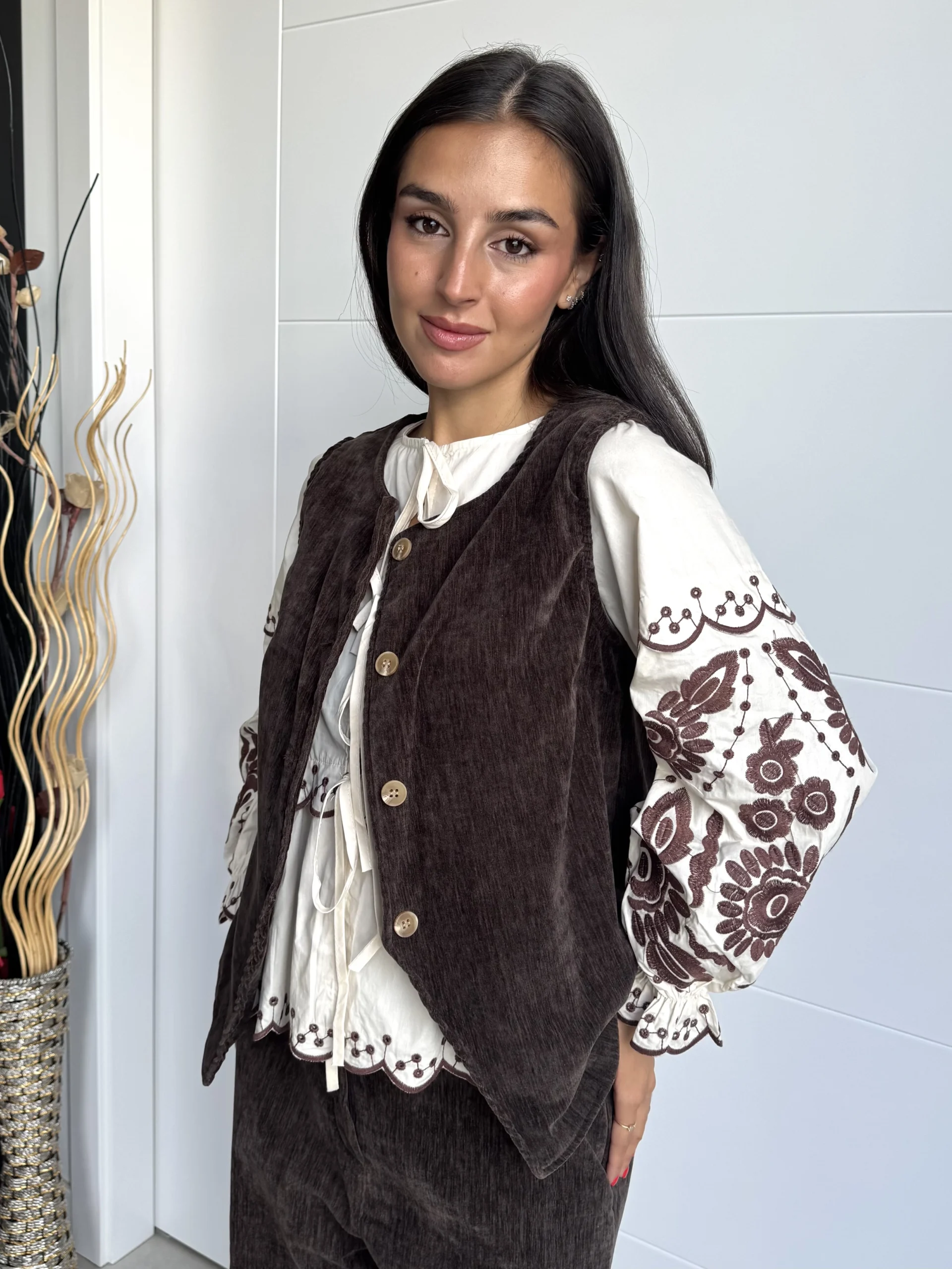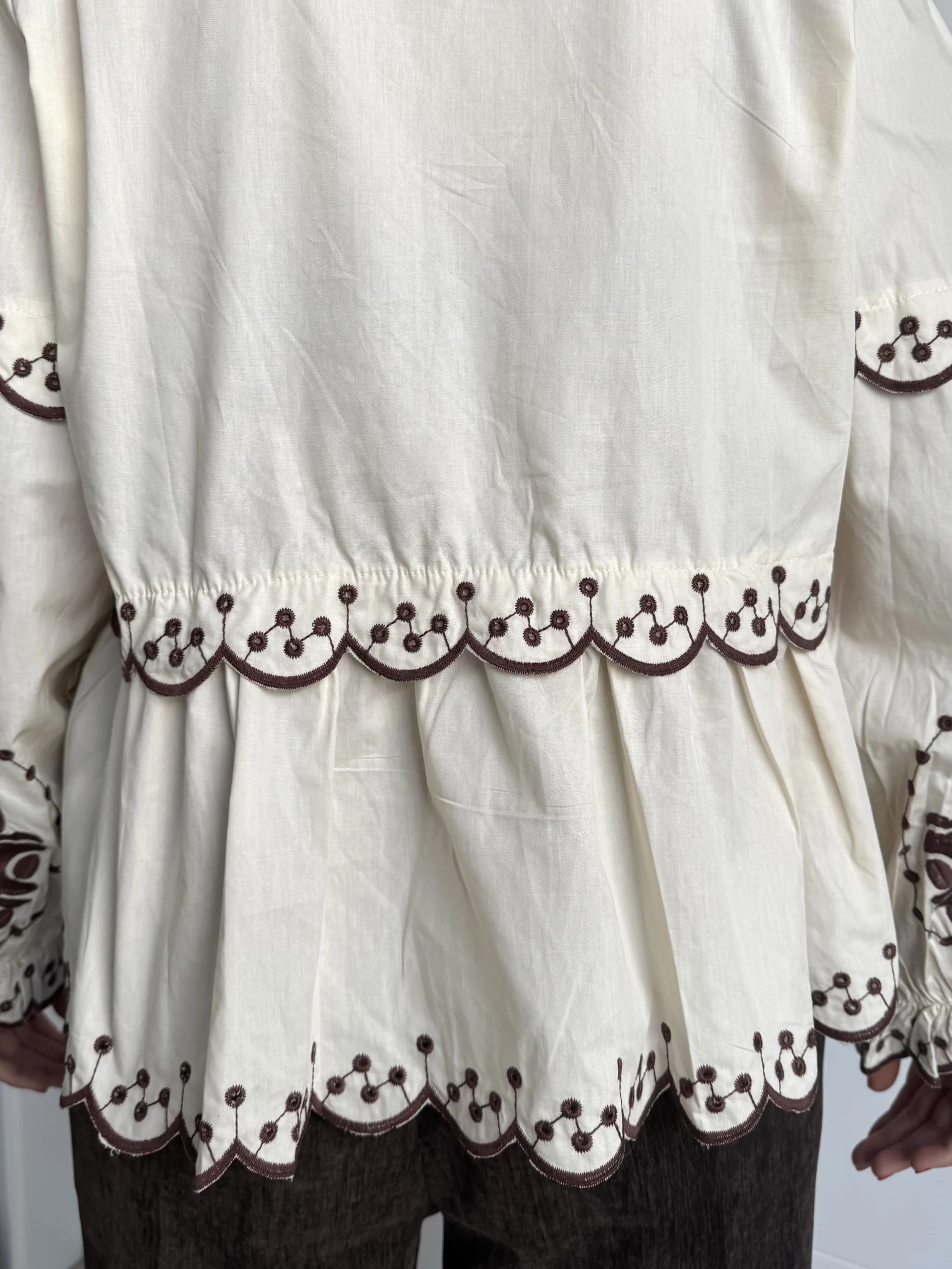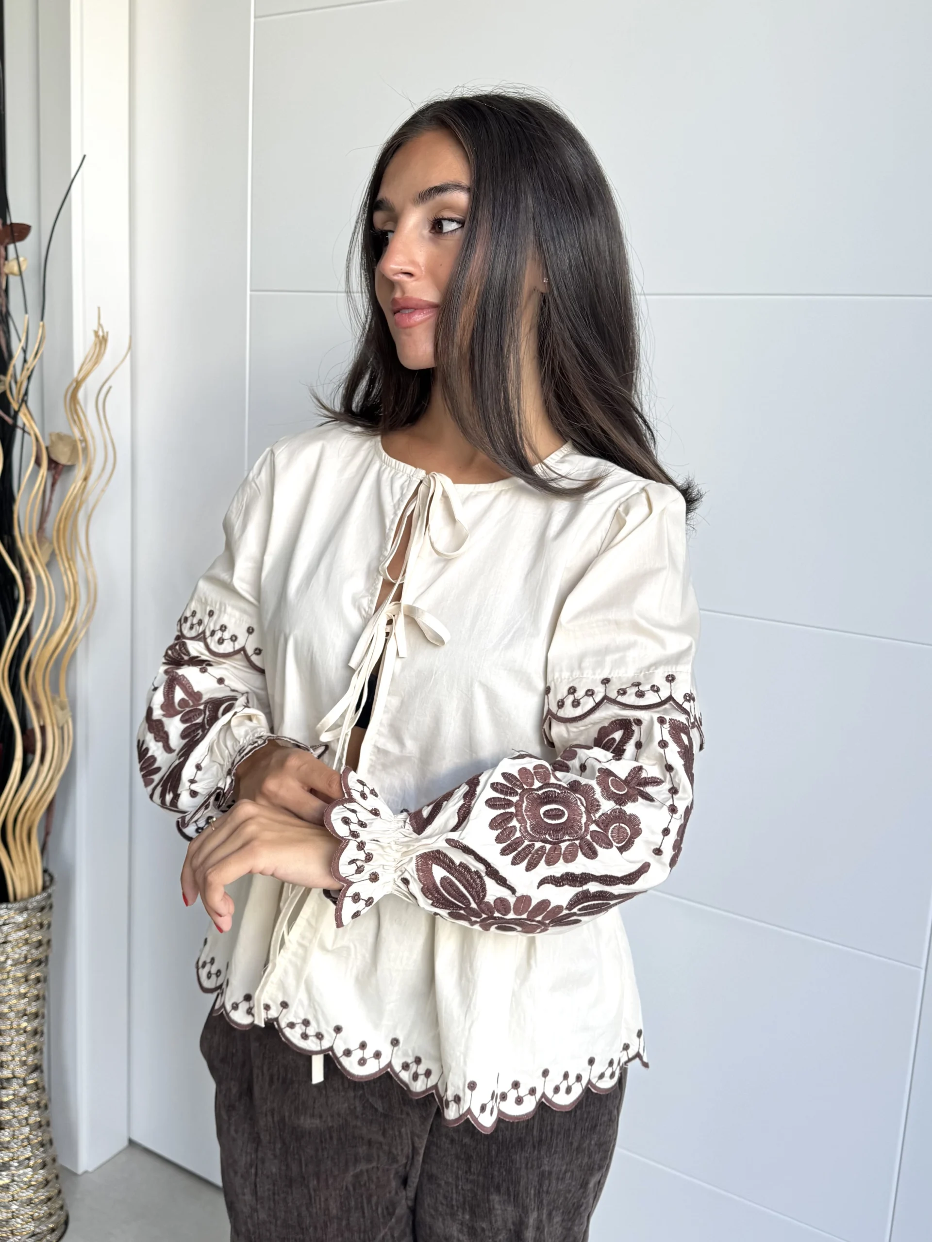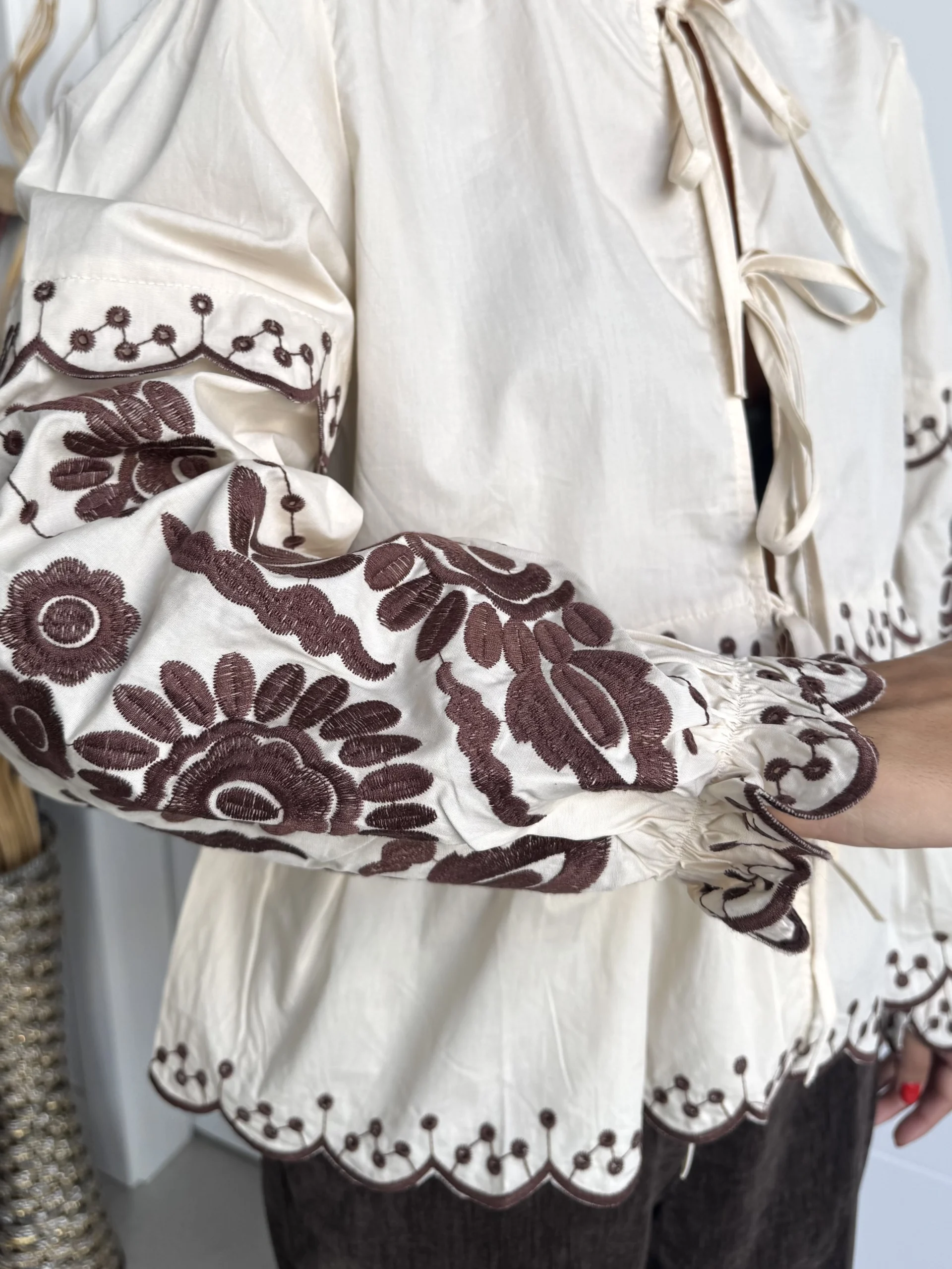 Blusa beige bordada manga larga boho chic con los bordados florales en tono marrón chocolate. Presenta escote redondo con cierre mediante lazadas delanteras, mangas abullonadas con puño elástico y bajo acabado en ondas con bordado calado. Su estilo boho chic y femenino la convierte en una prenda versátil, perfecta para combinar con jeans, pantalones de lino o faldas. Ideal para looks casuales con un toque romántico y artesanal.