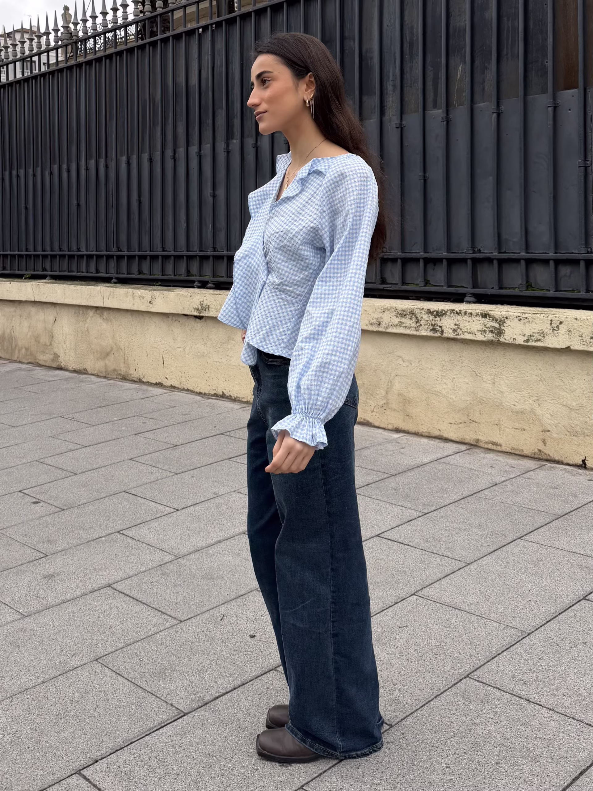 Blusa de algodón con estampado vichy en azul bebé y blanco, de corte ligeramente evasé. Presenta escote en pico con volante frontal, manga larga abullonada y puños fruncidos con goma elástica. Tejido ligero y estructurado, con caída suave y acabado natural.
