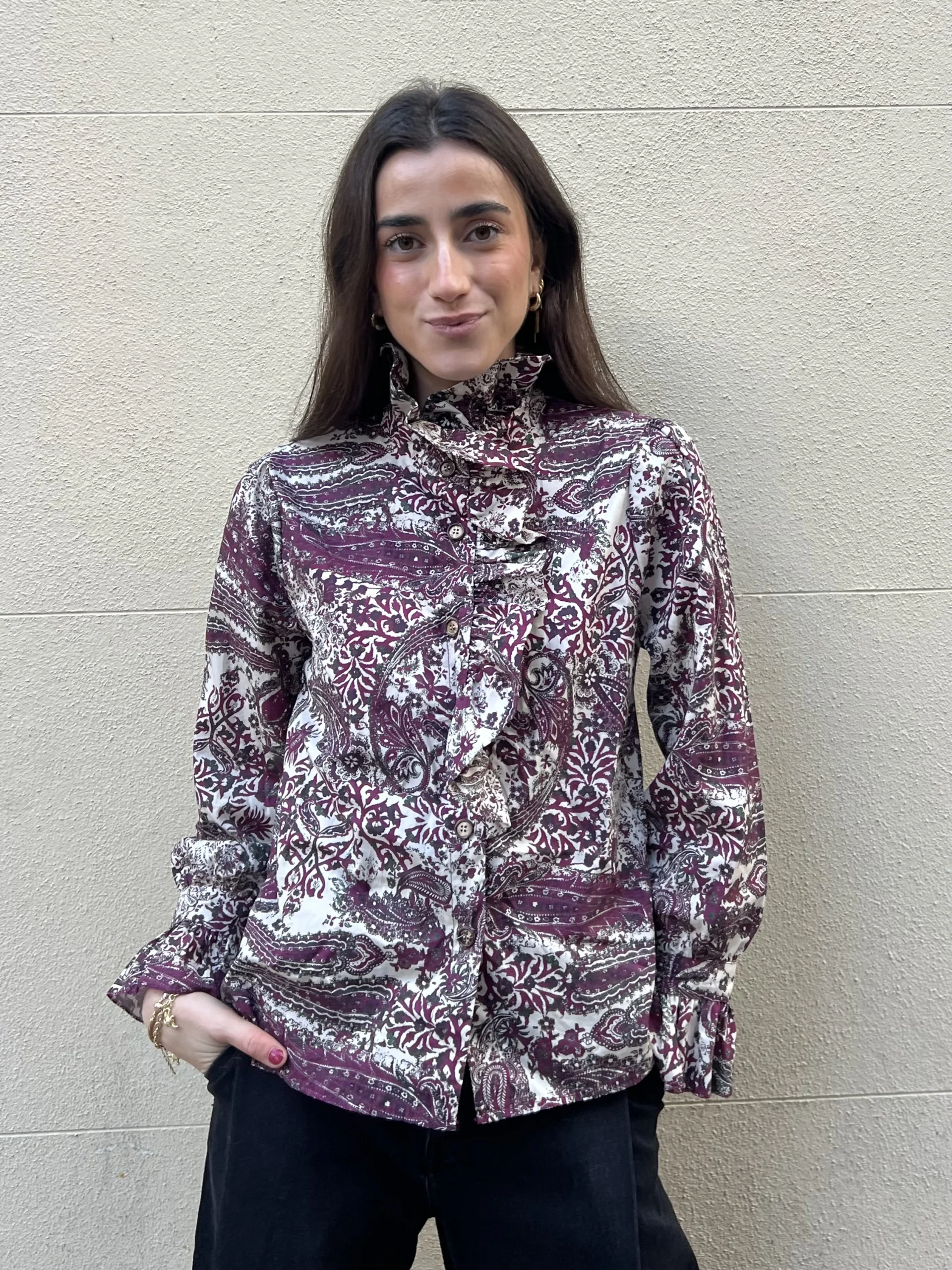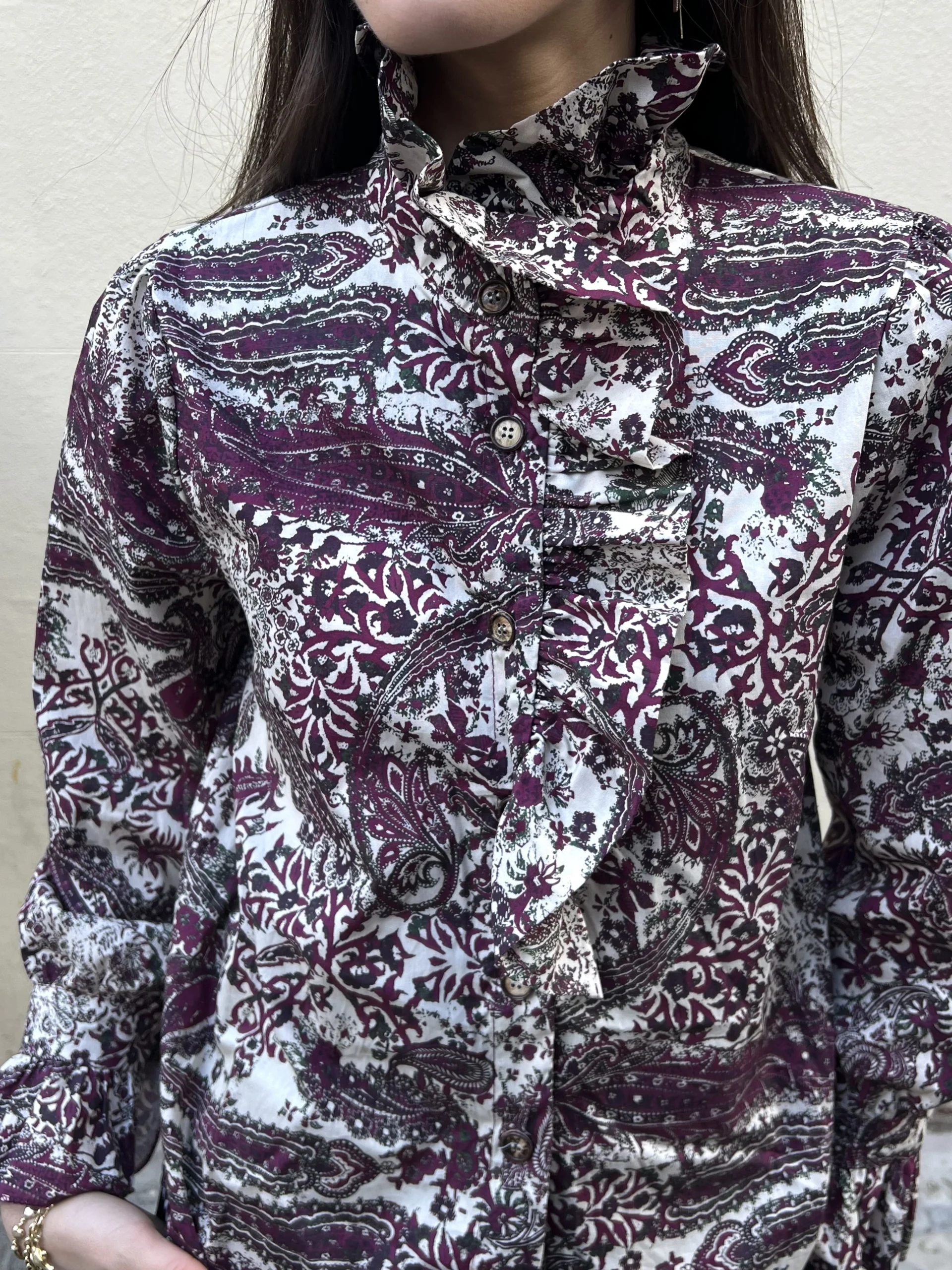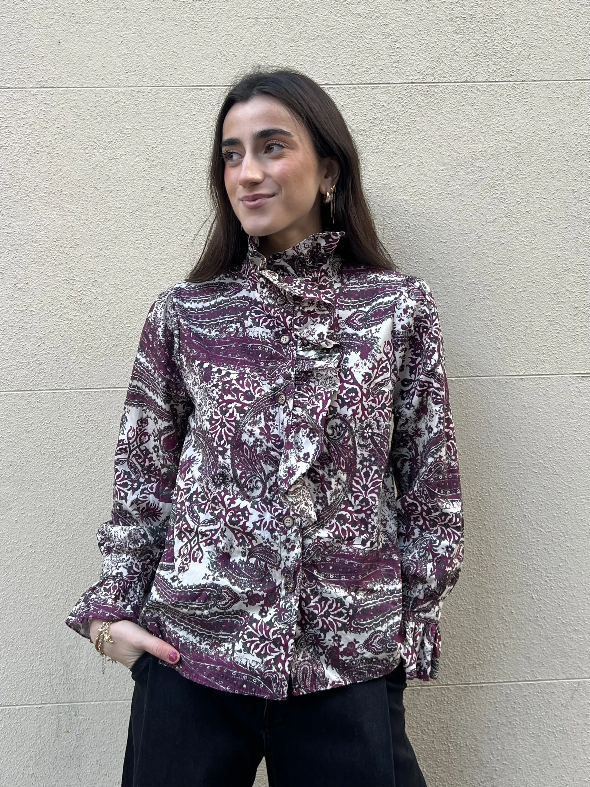 Blusa estampada en tonos uva y crudo con inspiración boho. Diseño con cuello fruncido, botonadura frontal y manga larga con puño elástico. Tejido ligero y fluido, ideal para looks otoñales elegantes y femeninos.