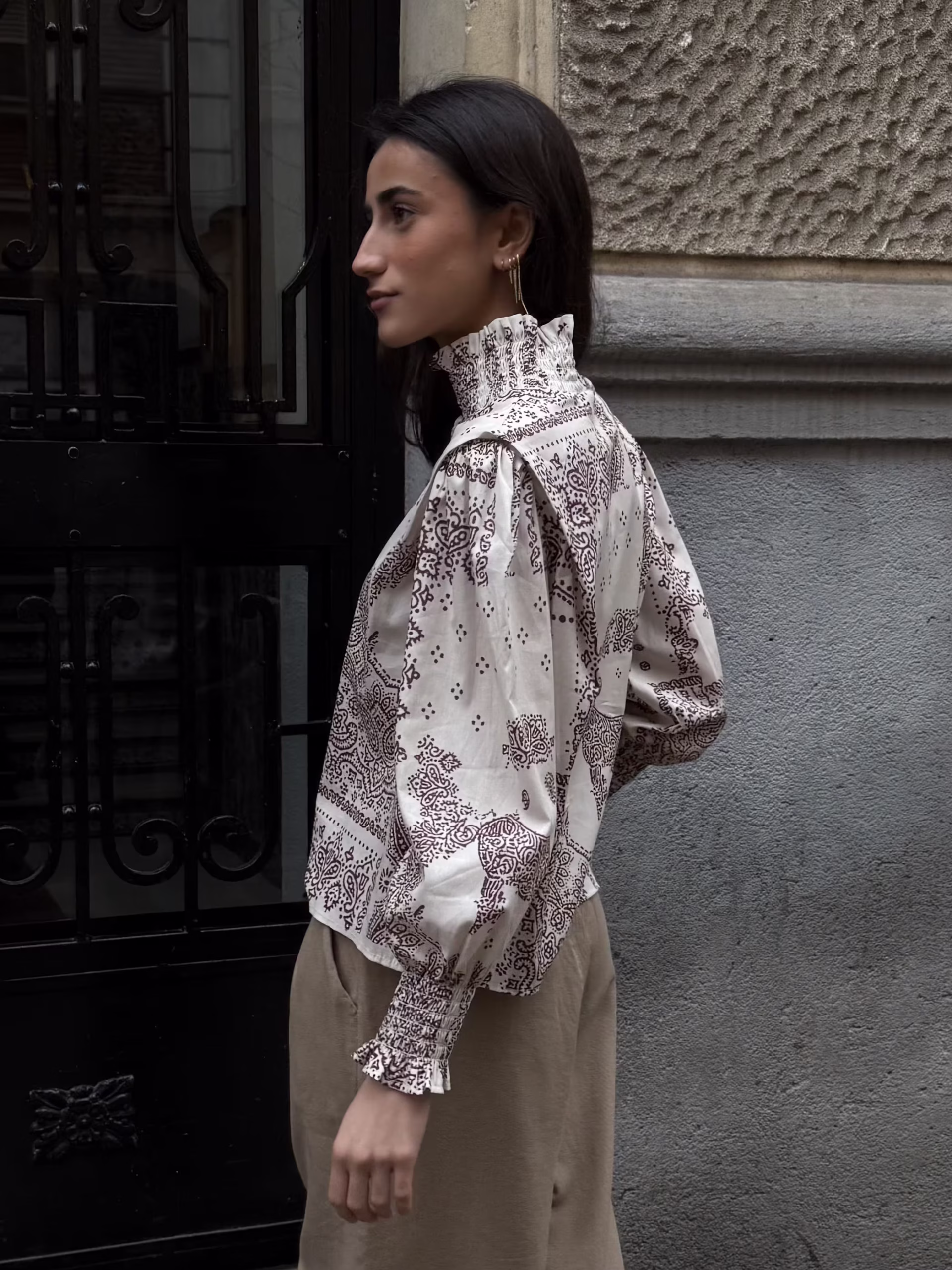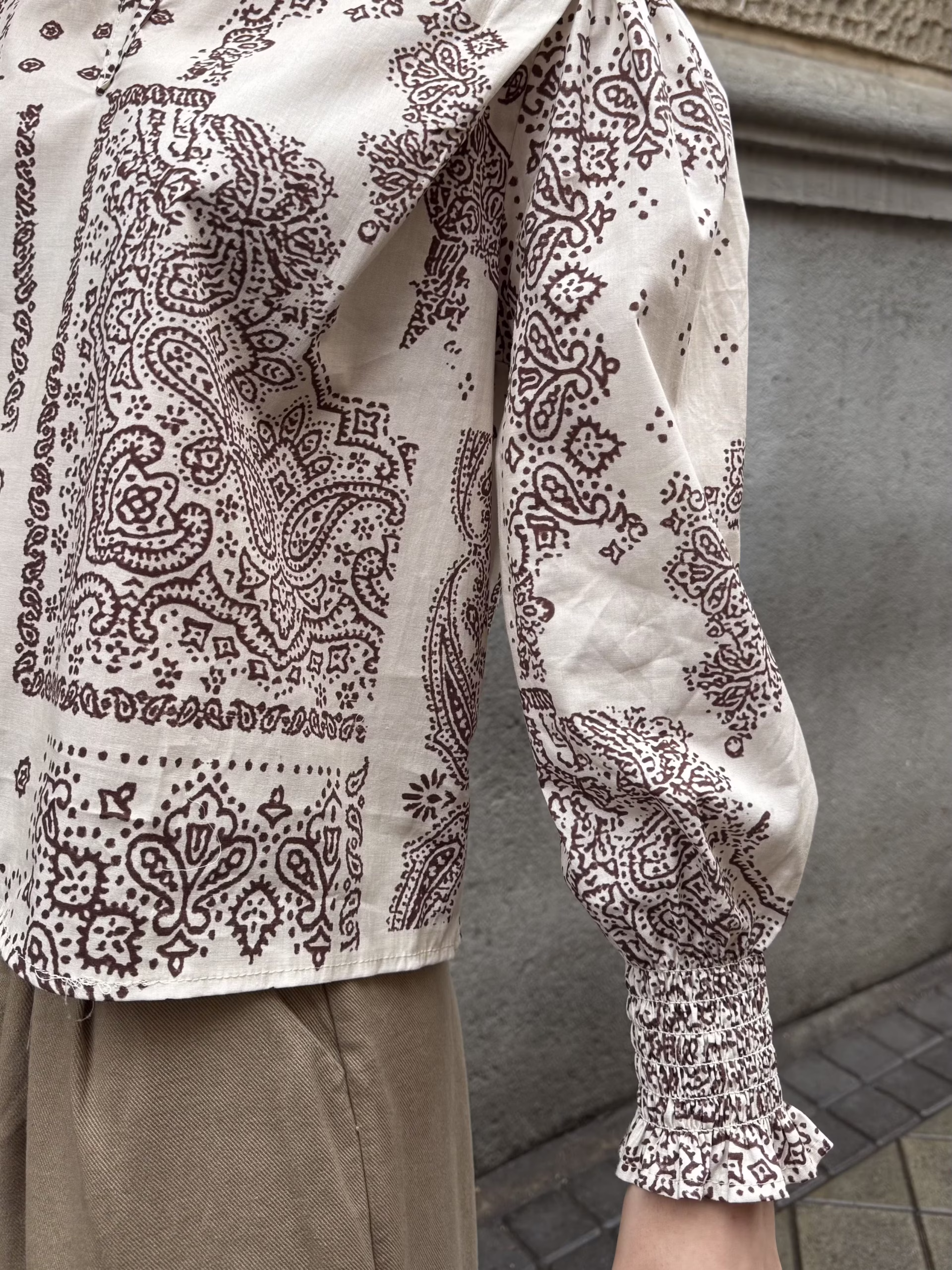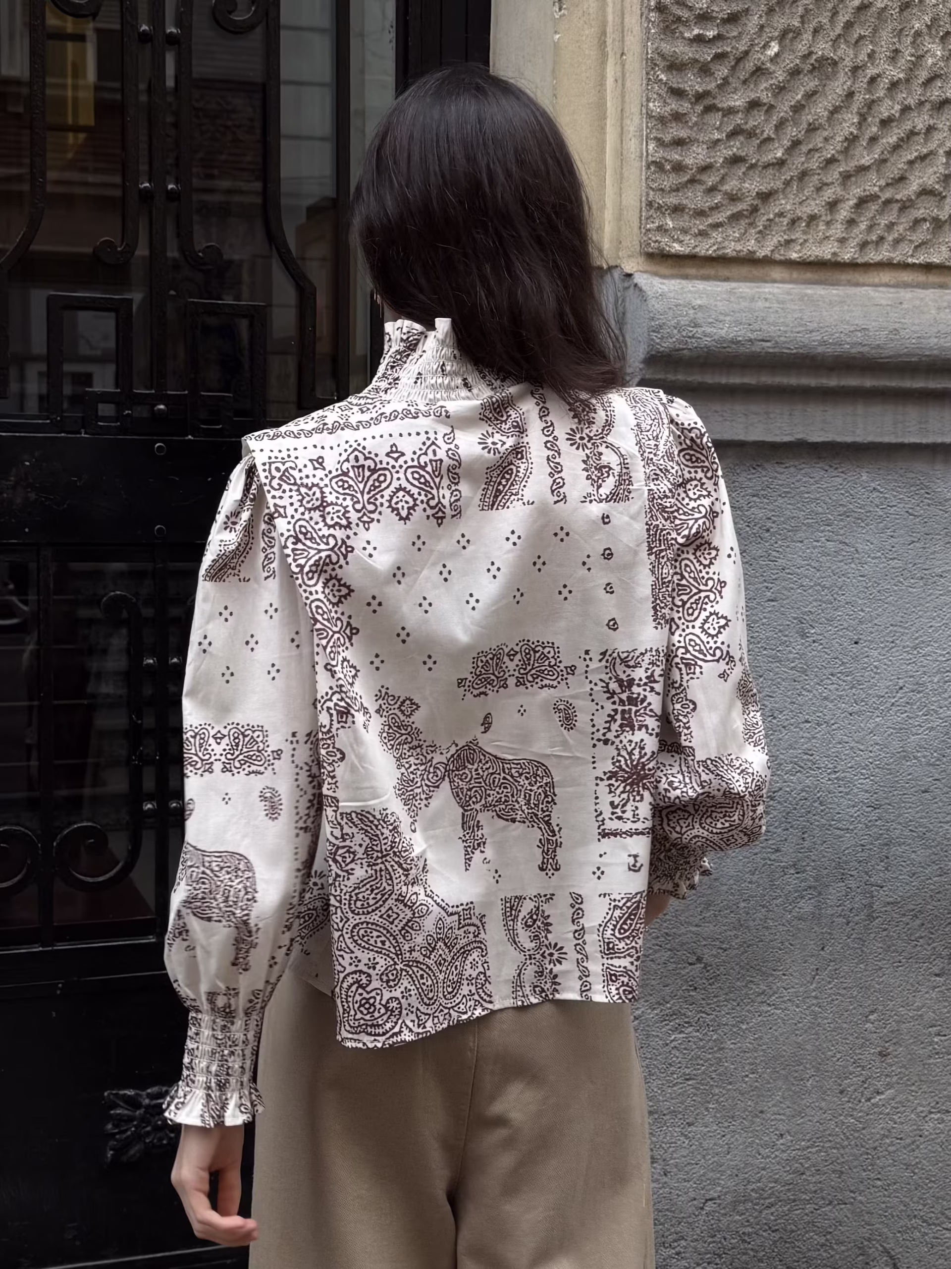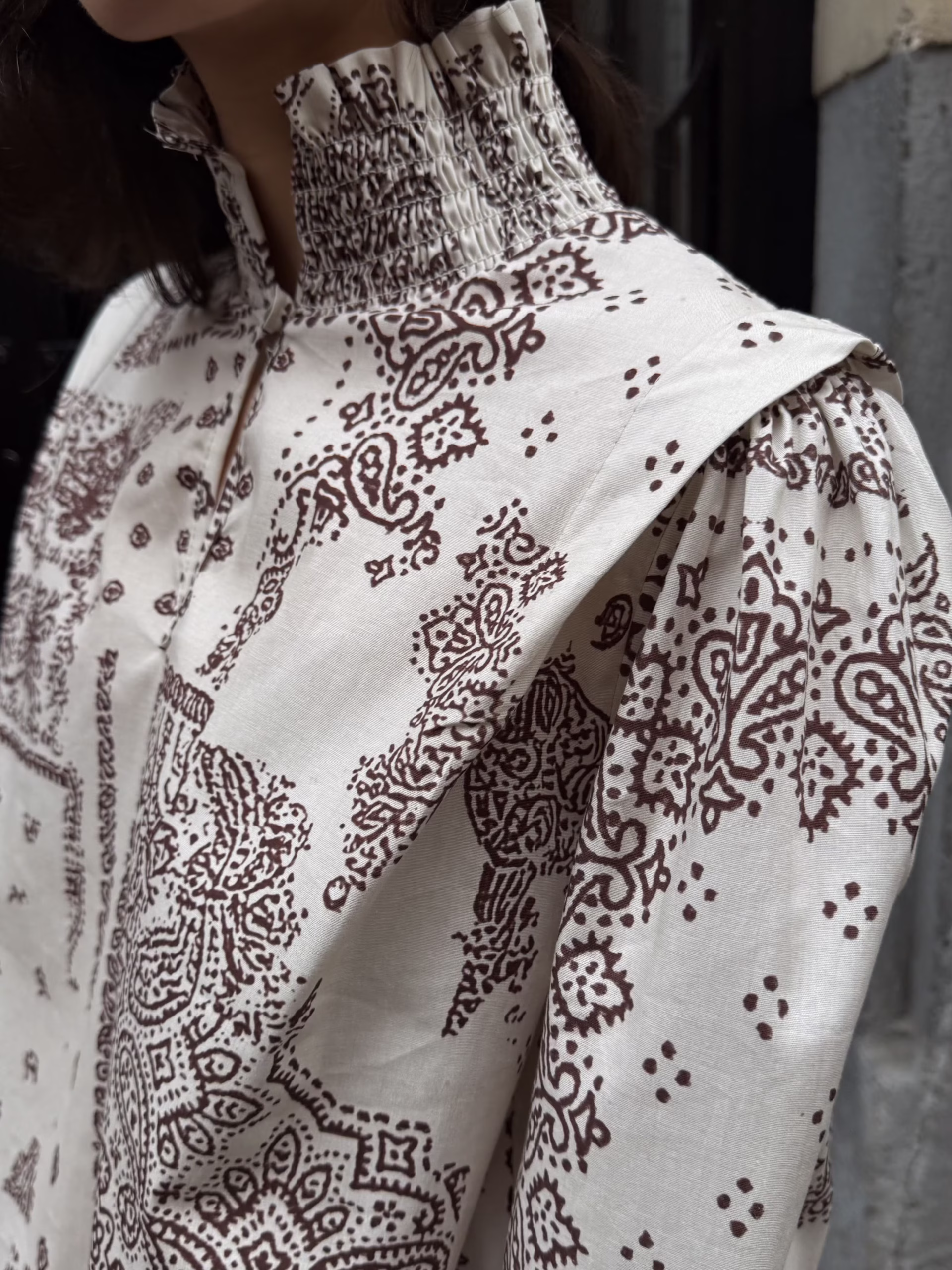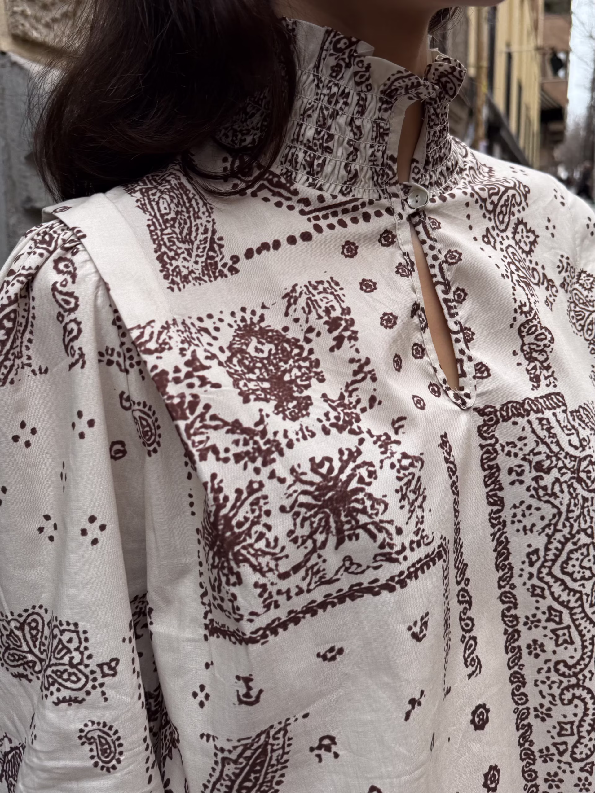 Blusa estampada en base crudo con motivo cachemir en tonos marrón. Cuello alto con abertura frontal y botonadura visible. Manga larga ligeramente abullonada con puño fruncido. Corte recto y caída fluida.