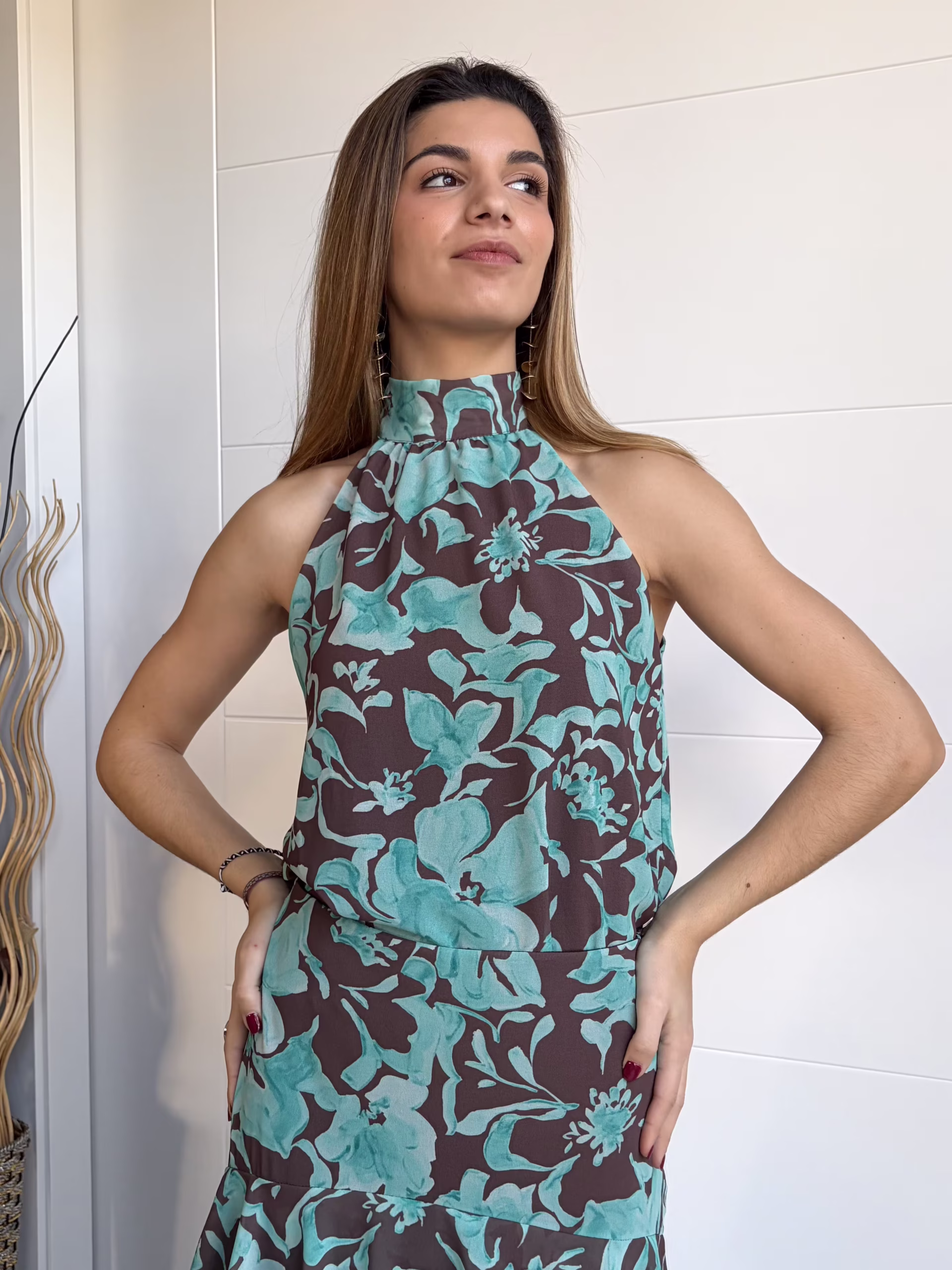 Top halter de gasa con estampado floral en tono turquesa sobre base chocolate. Escote cerrado con cuello alto que estiliza hombros y realza la parte superior. Caída fluida y ligera. Forro interior en color chocolate.