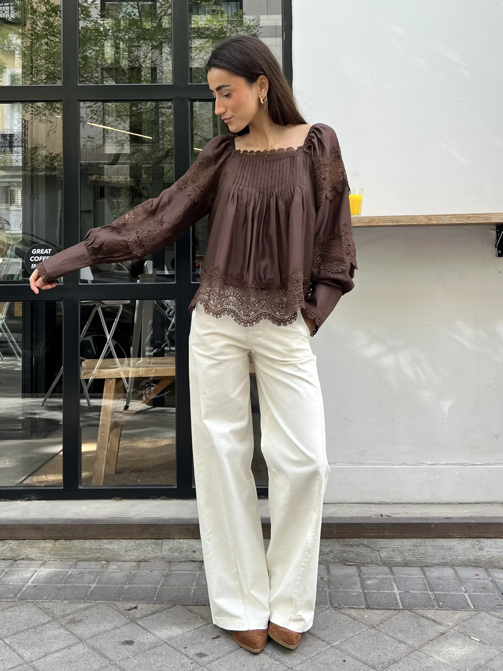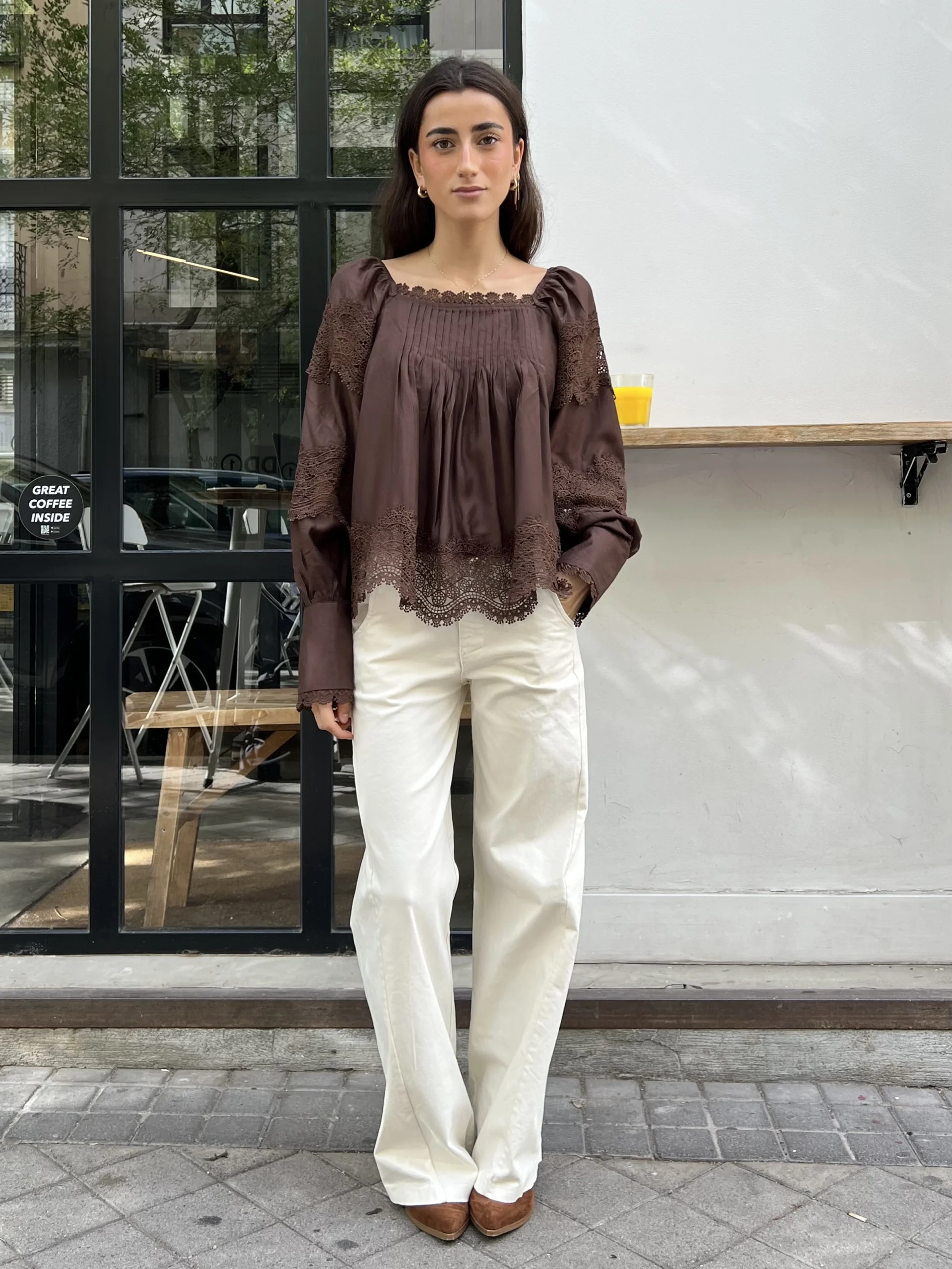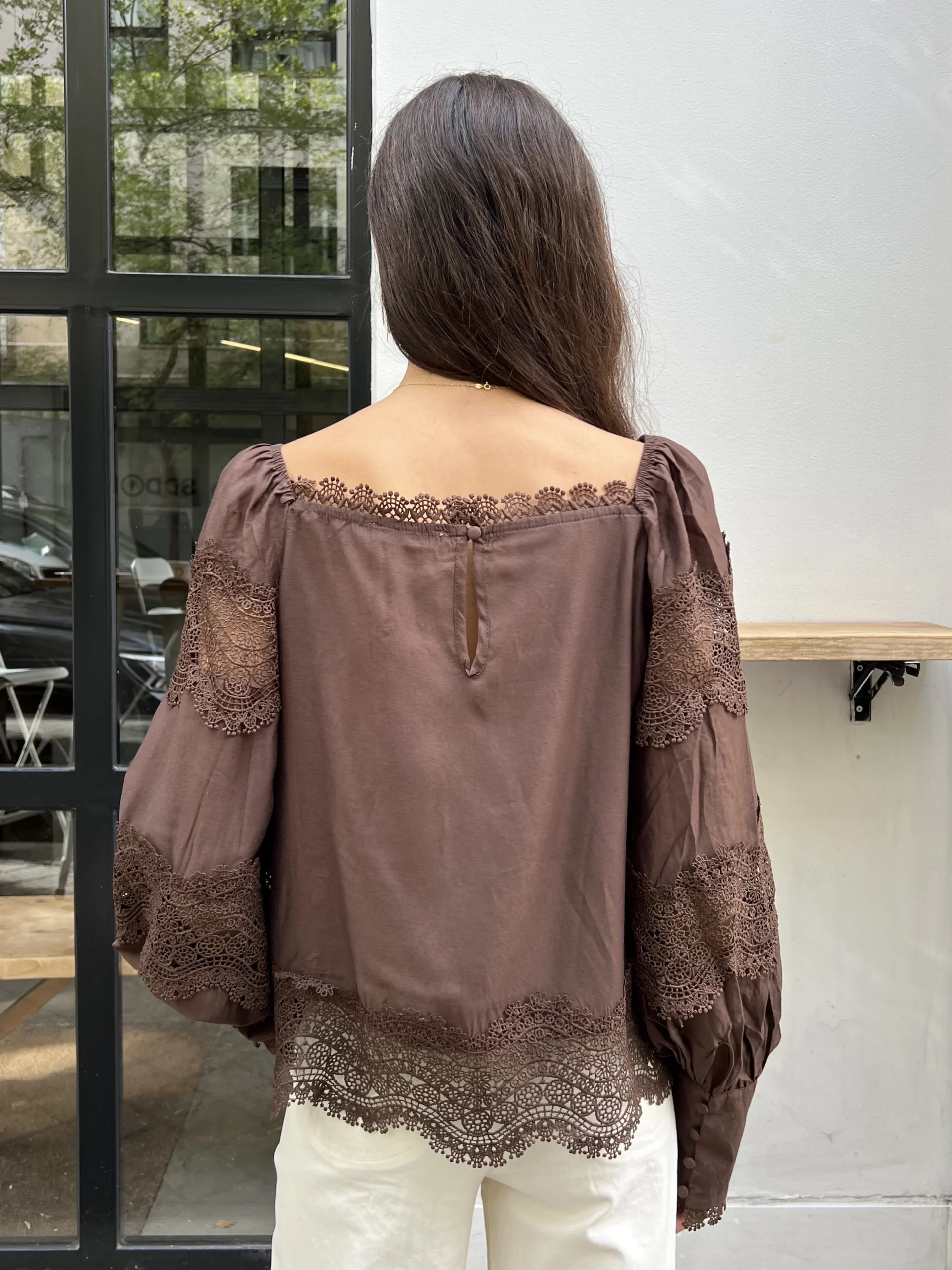 Blusa marrón chocolate con detalle de jaretas por toda la prenda. Bordes de encaje y diseño plisado en el pecho.