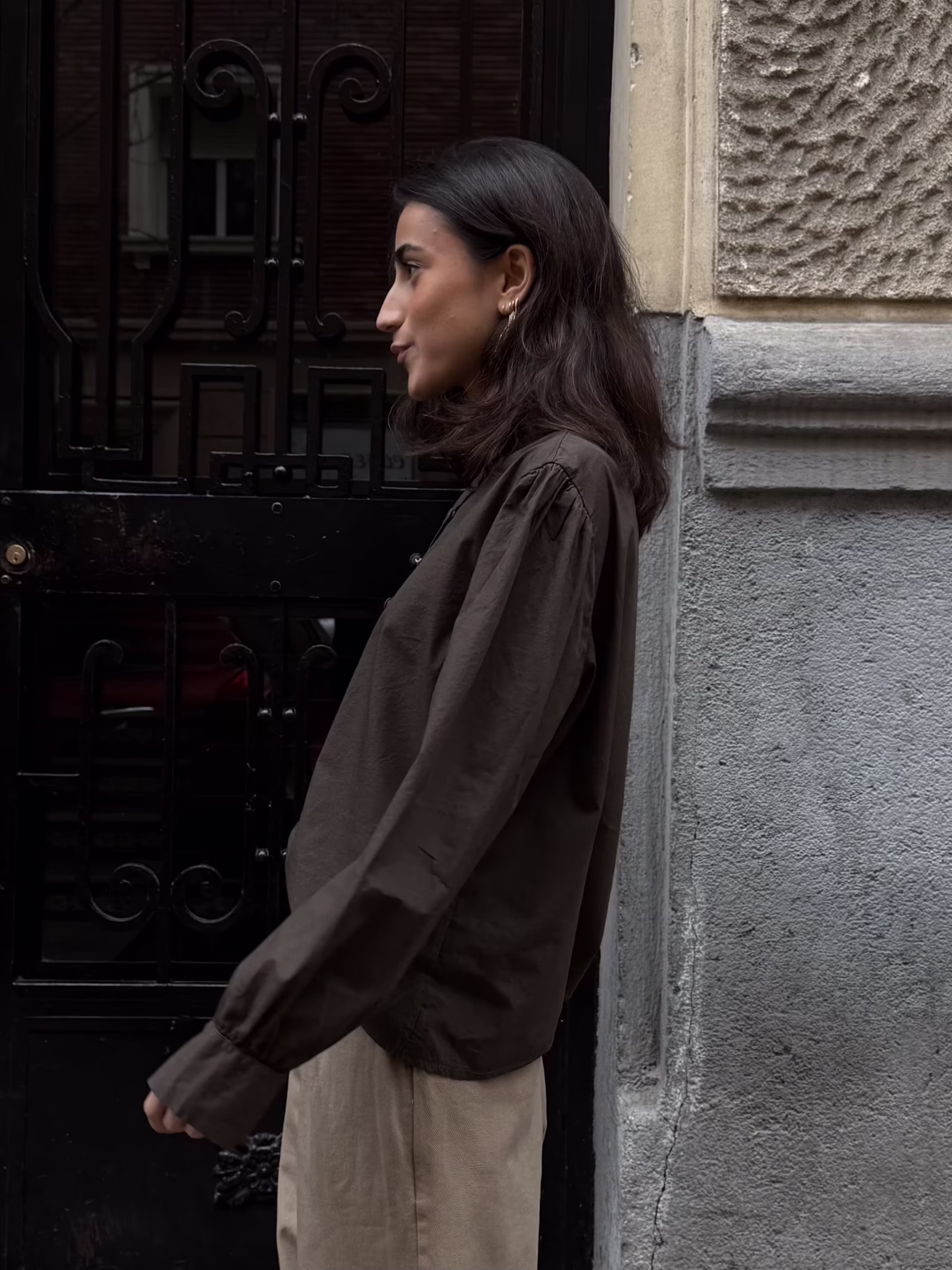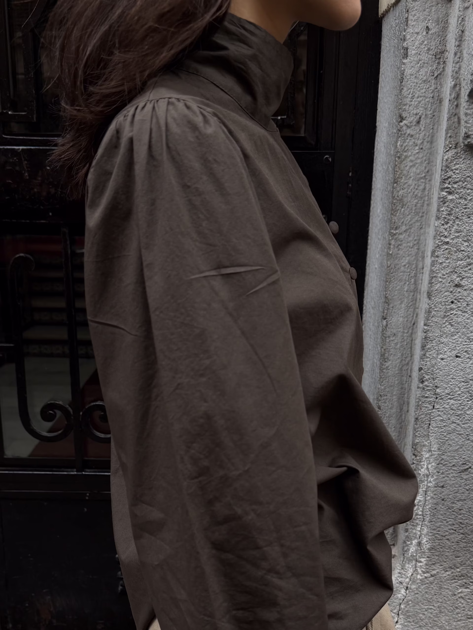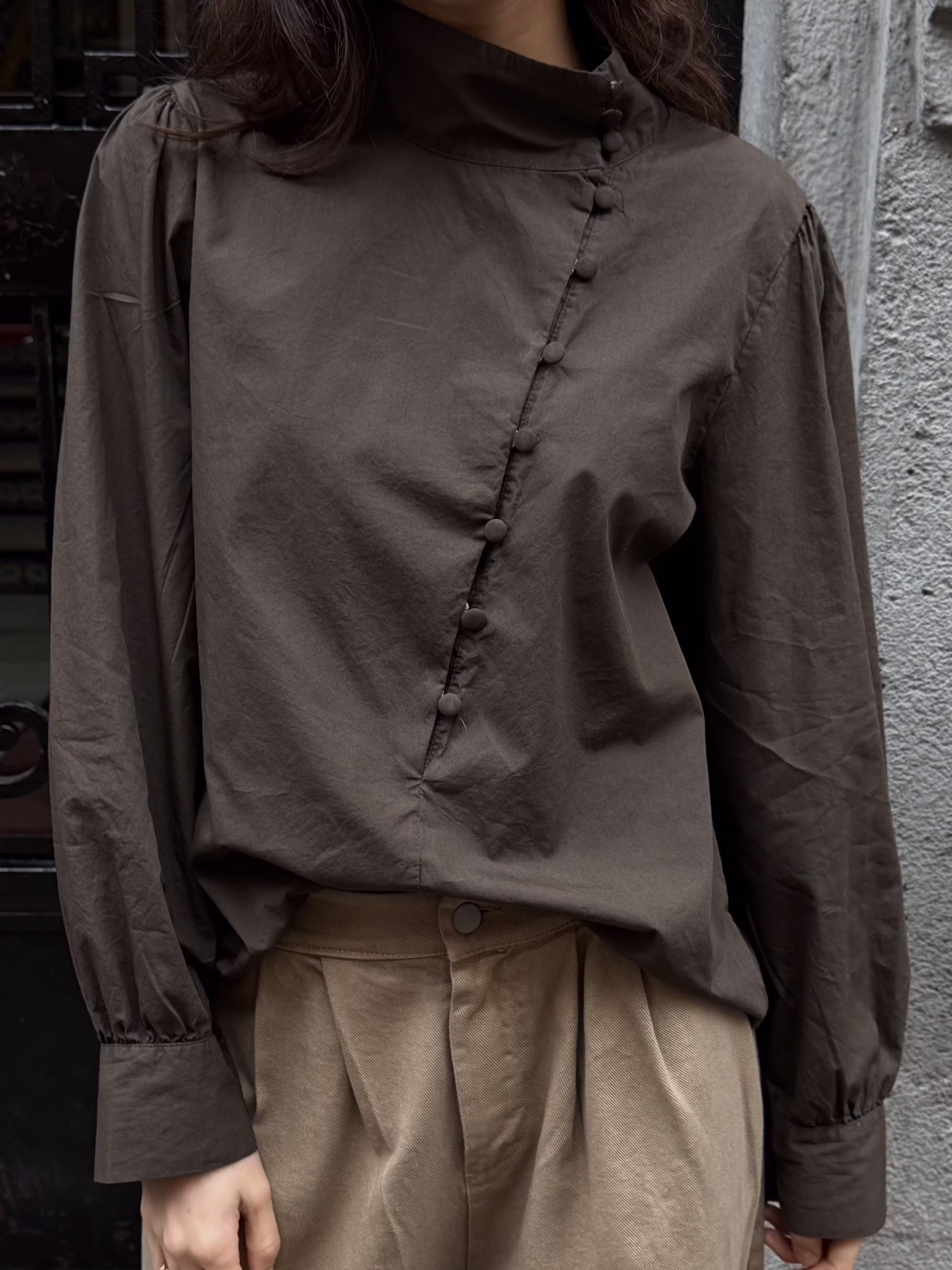 Blusa marrón chocolate con cierre lateral estilo oriental y botones forrados integrados en el tejido. Diseño estructurado con cuello elevado y manga larga.