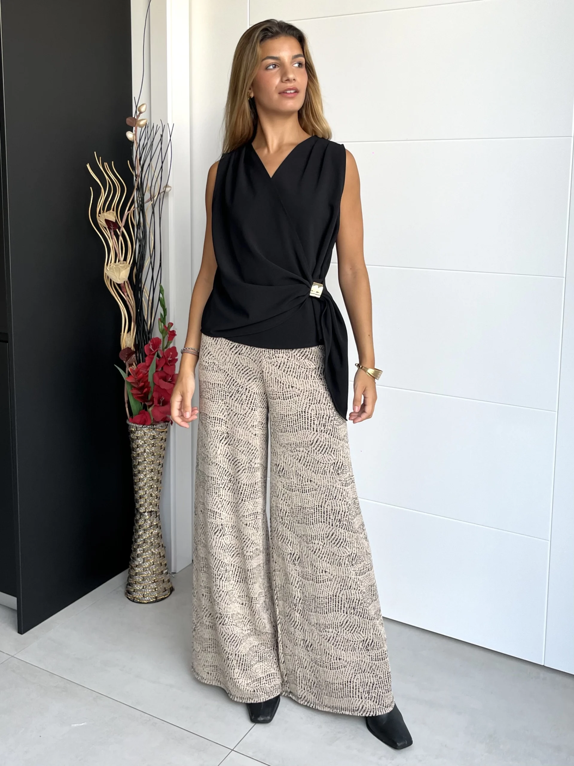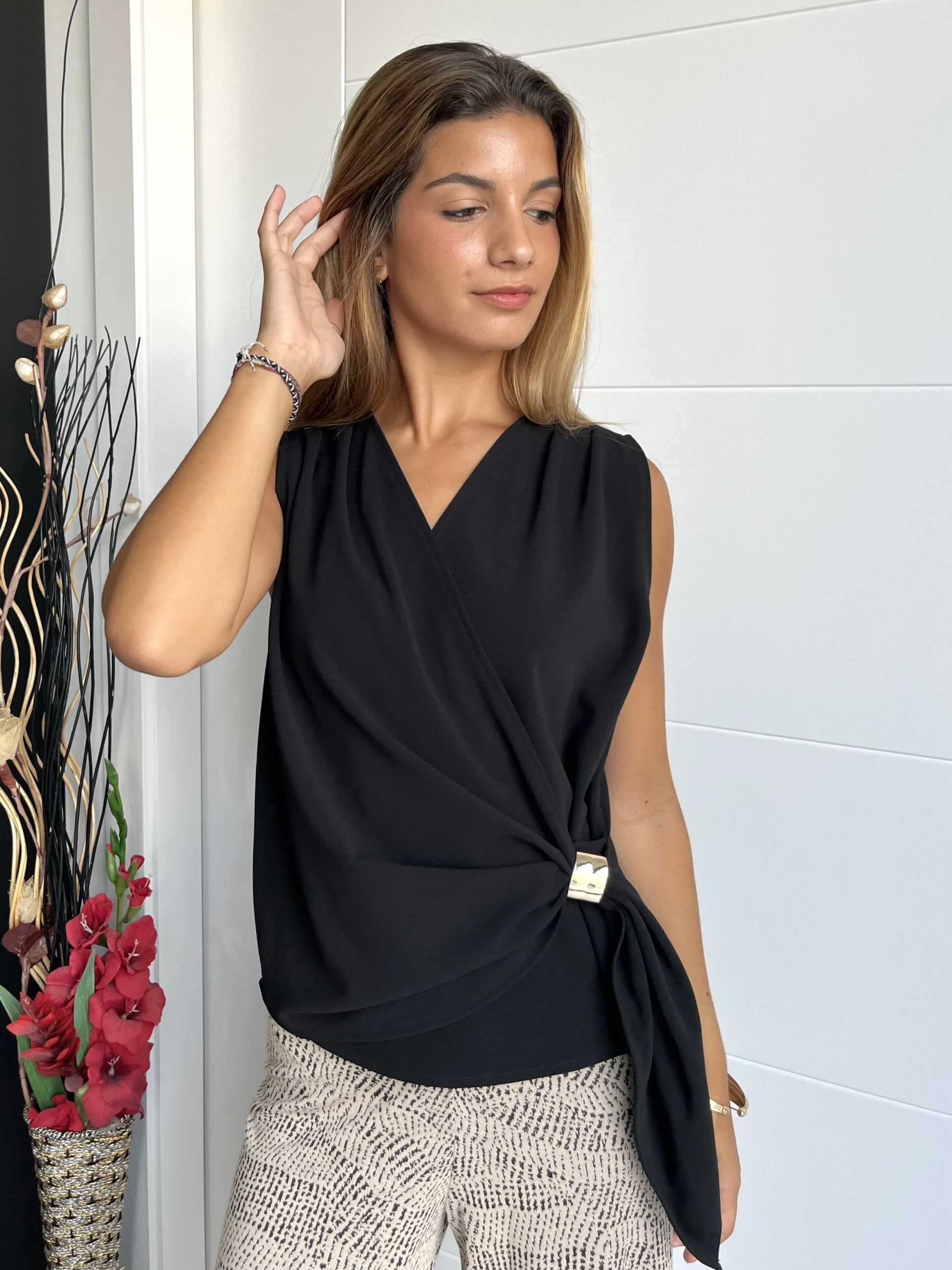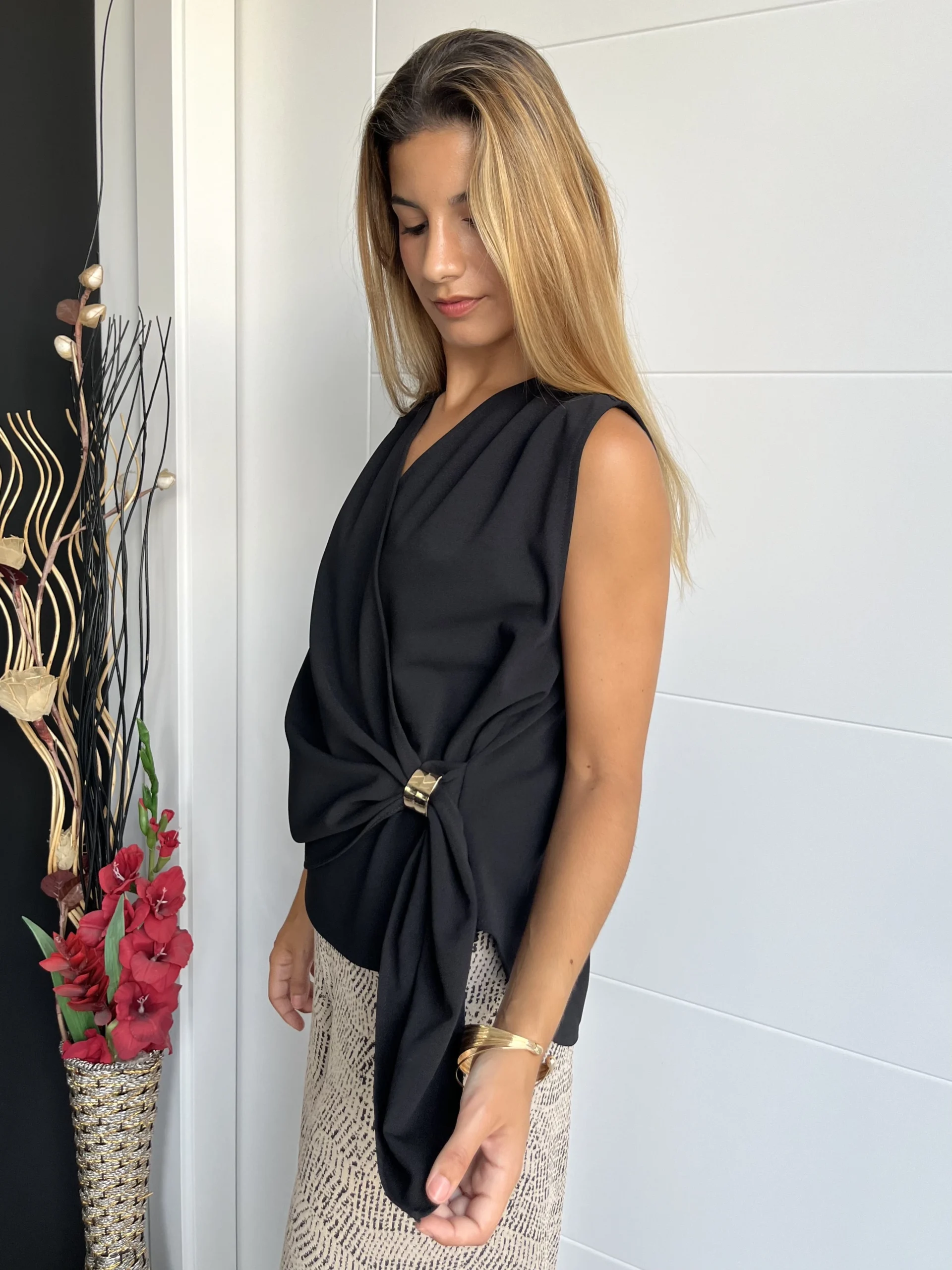 Blusa de tirantes cruzada en color negro. Con detalle dorado para ajustar la tela. Escote en pico.