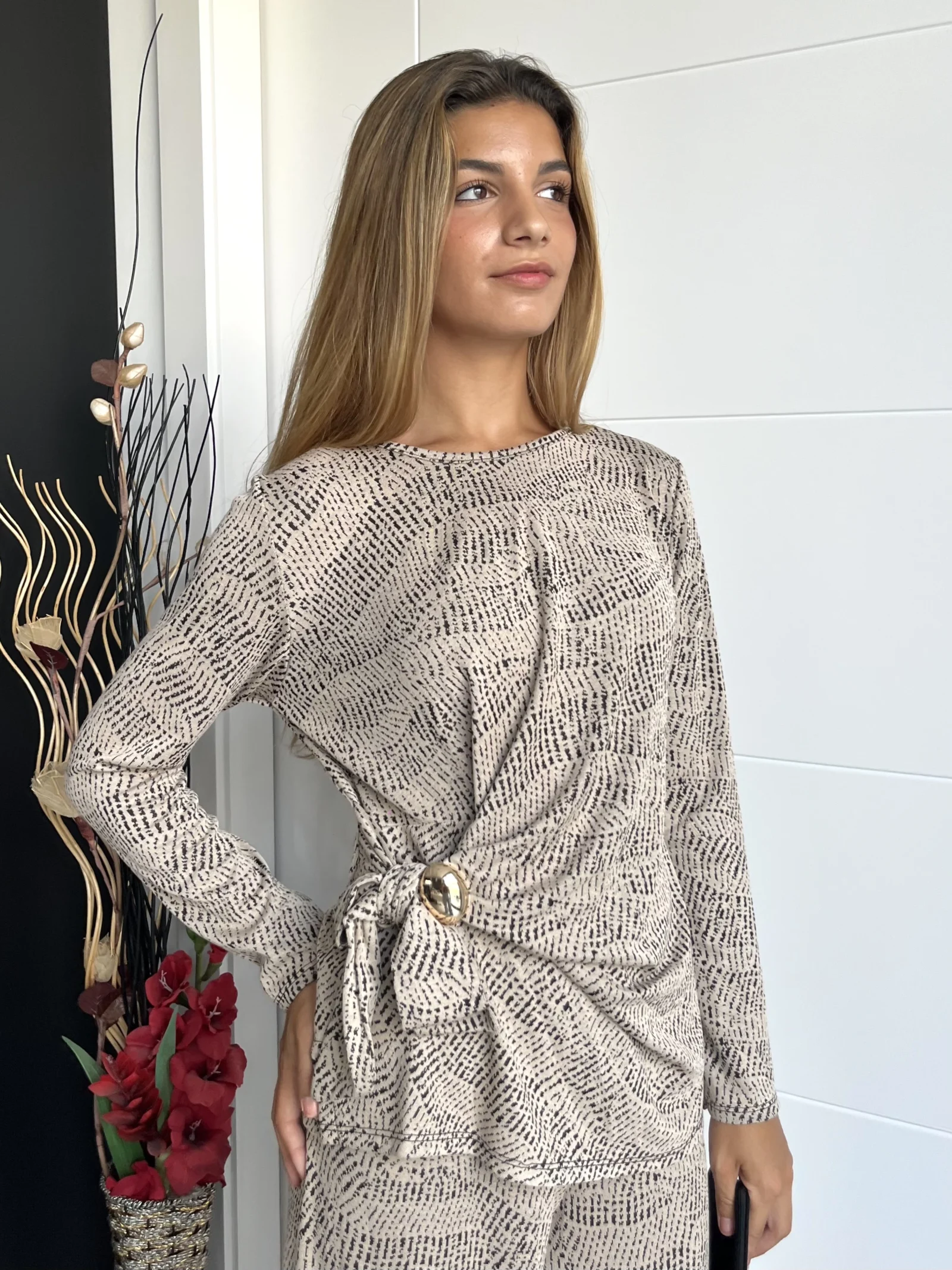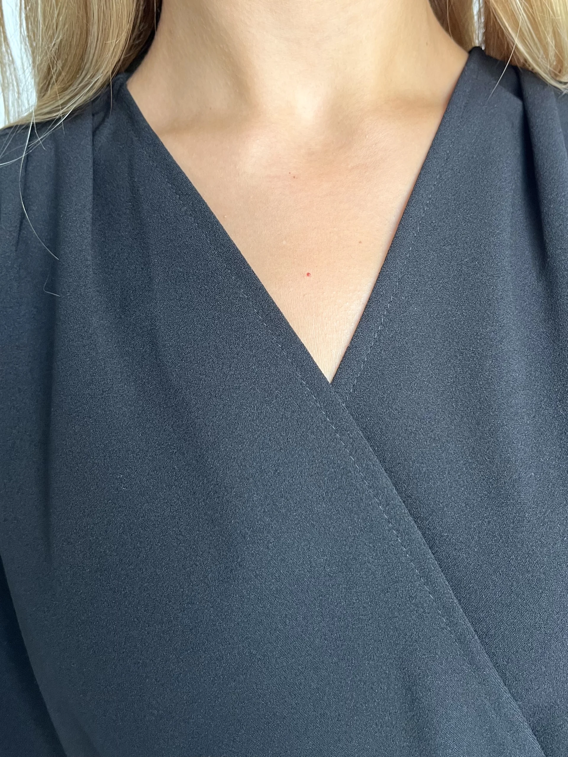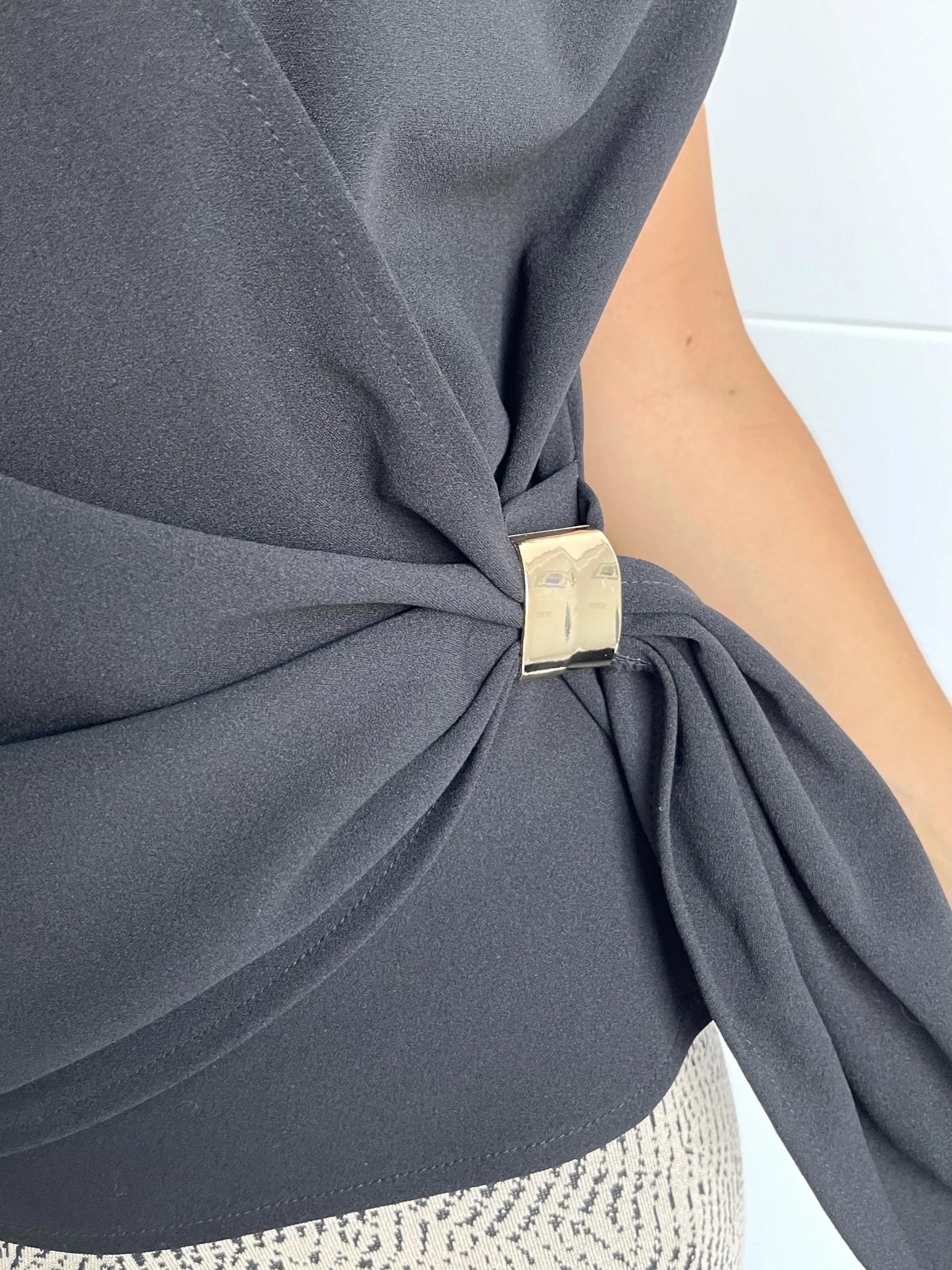 Blusa de tirantes cruzada en color negro. Con detalle dorado para ajustar la tela. Escote en pico.