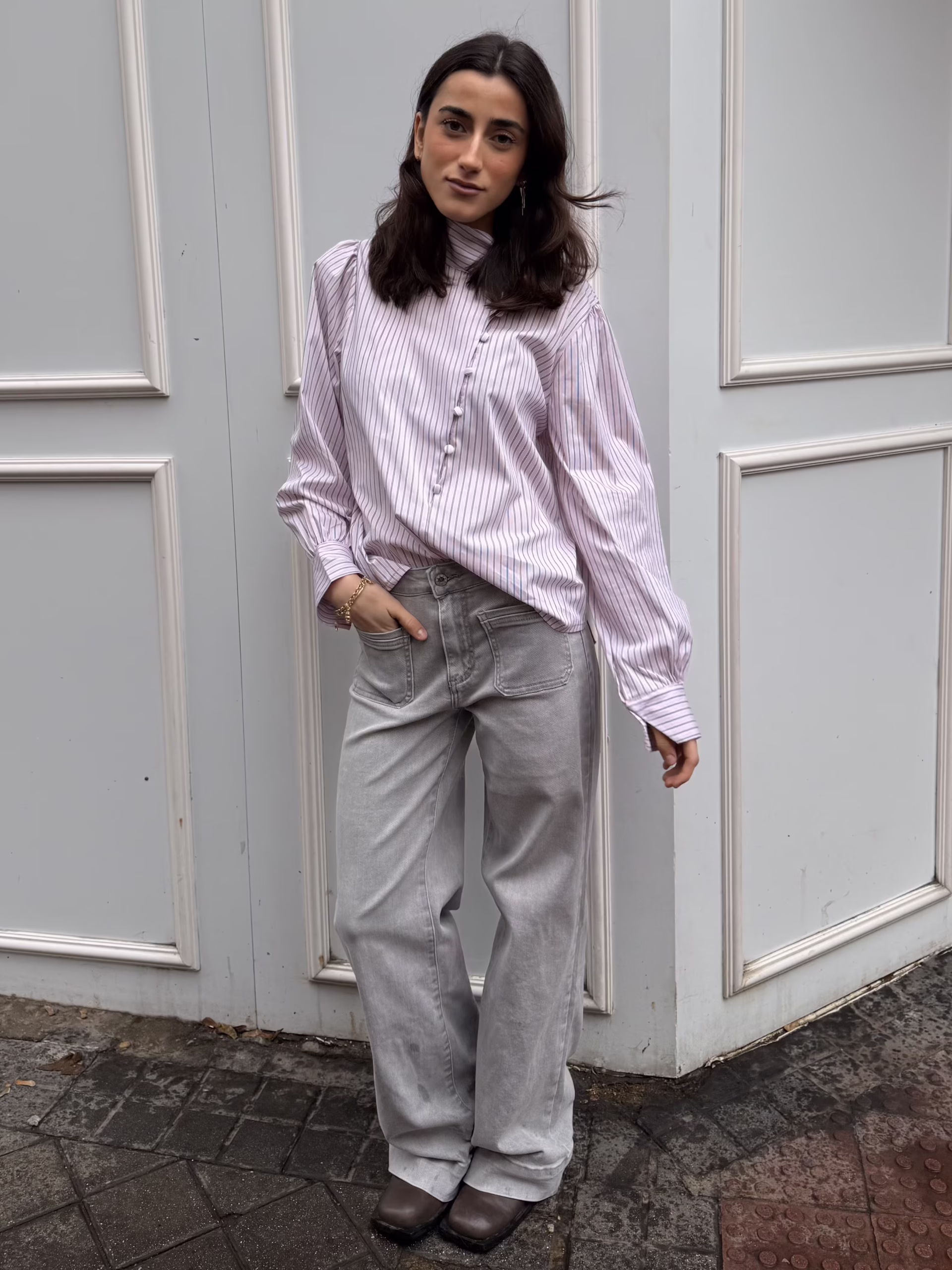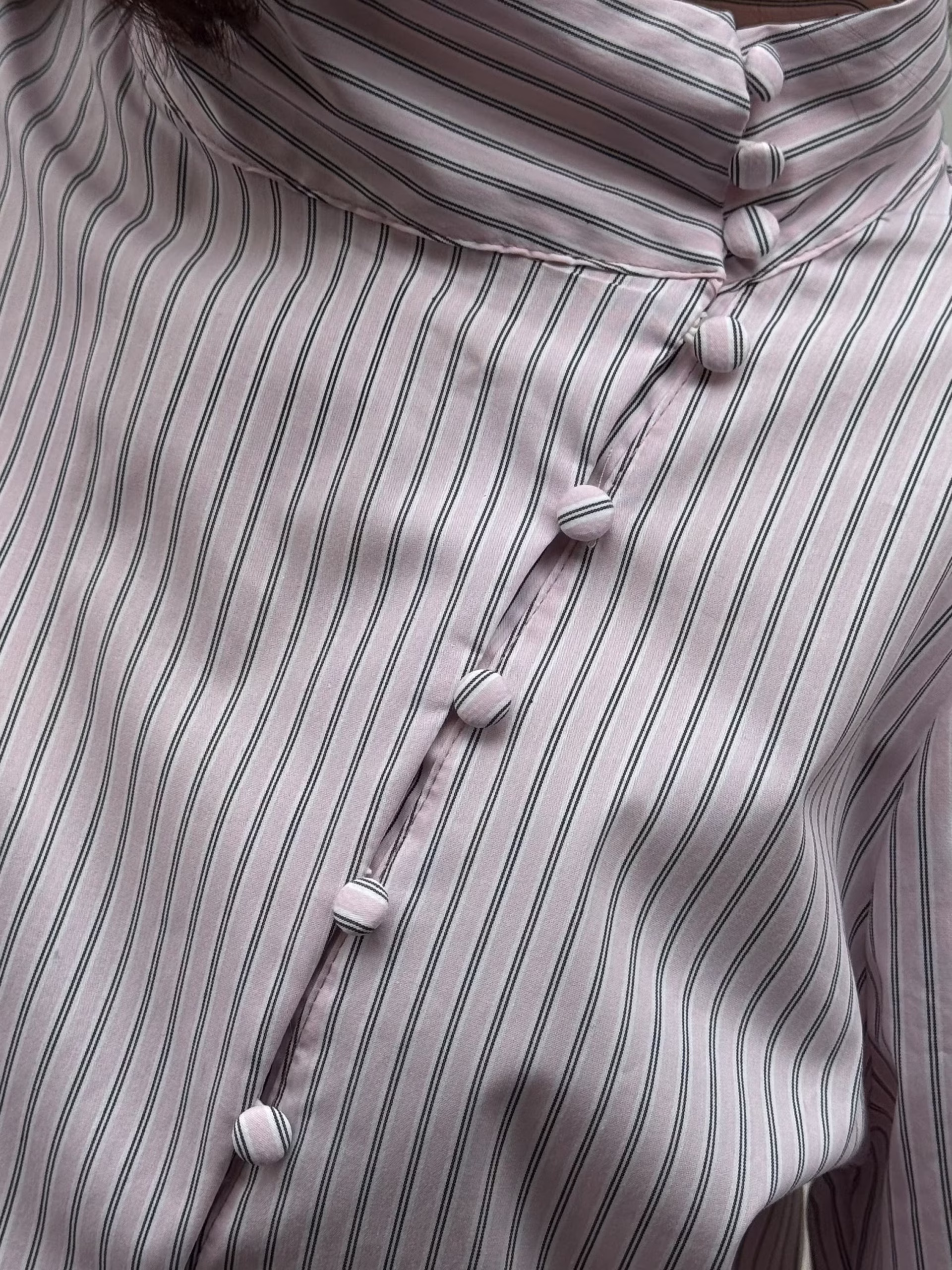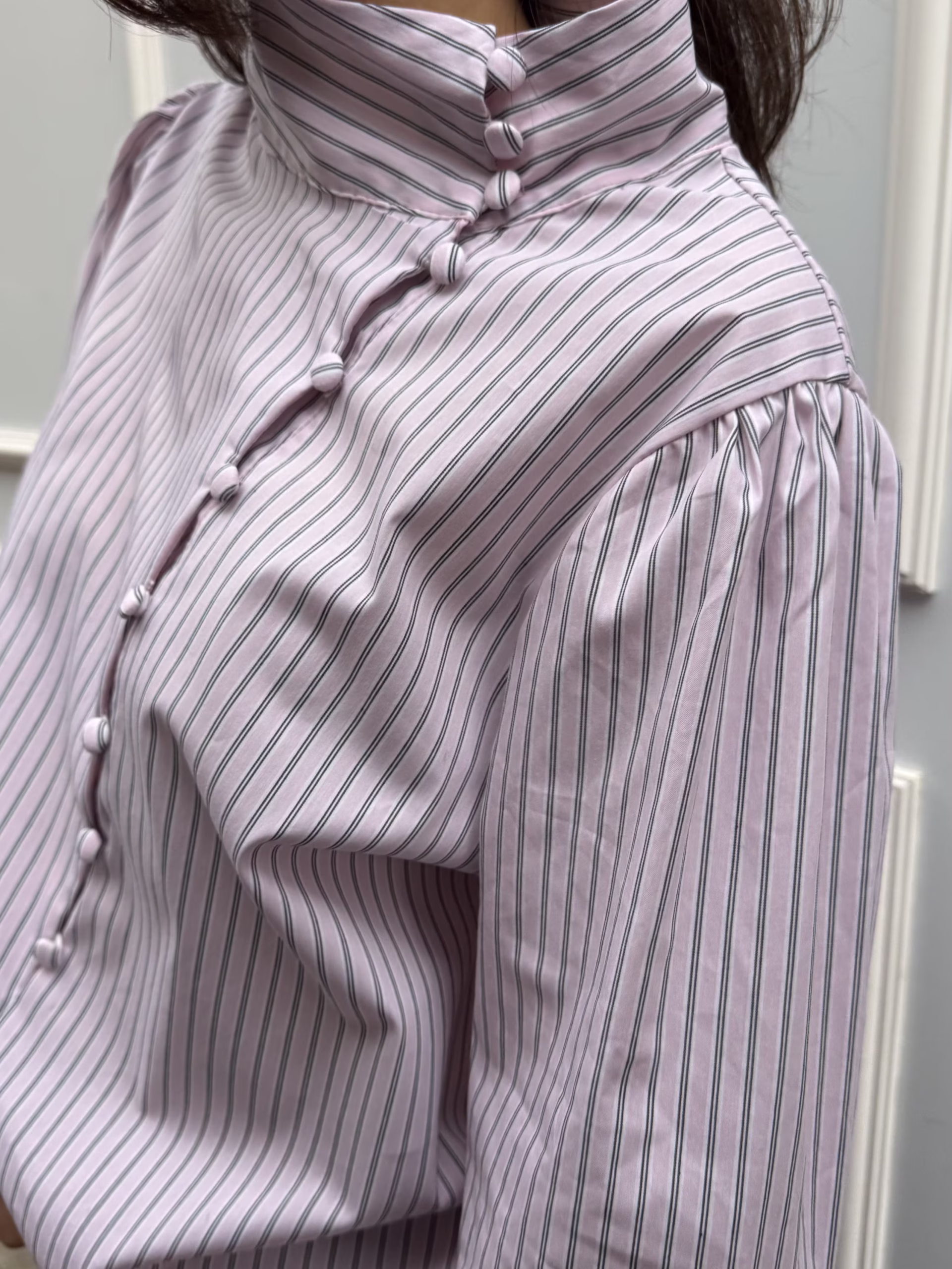 Blusa de rayas rosa empolvado. Cierre lateral estilo oriental con botones forrados. Cuello elevado. Manga larga ligeramente abullonada con puño. Corte recto y tejido con caída.