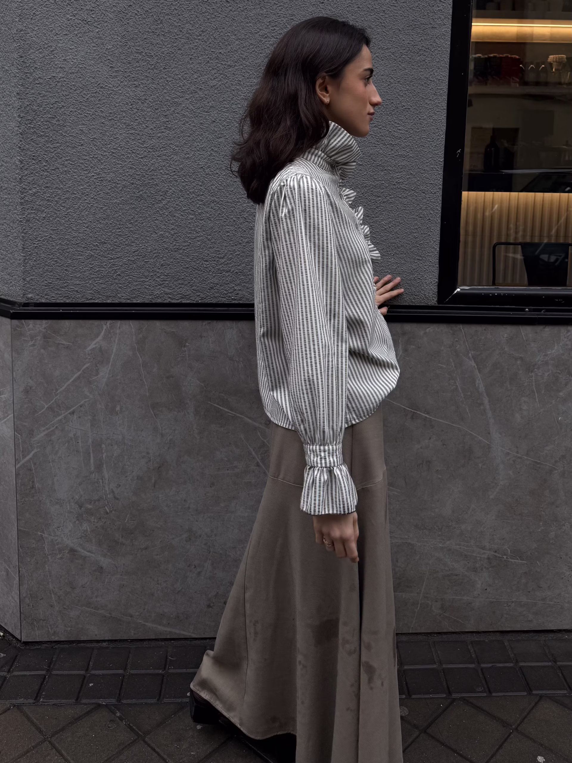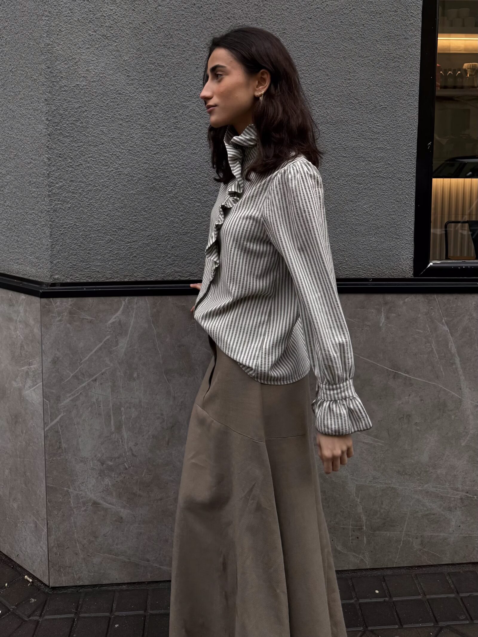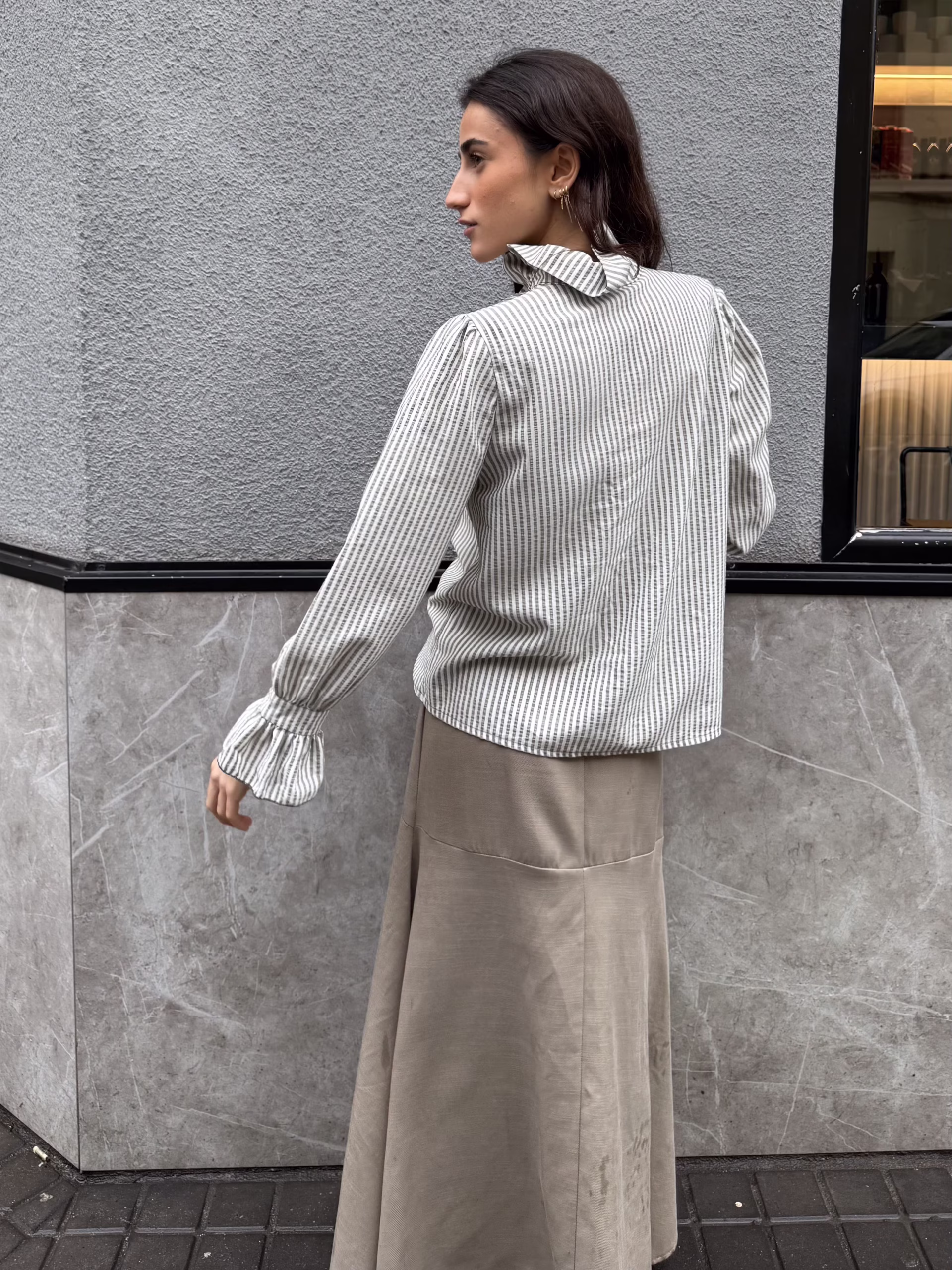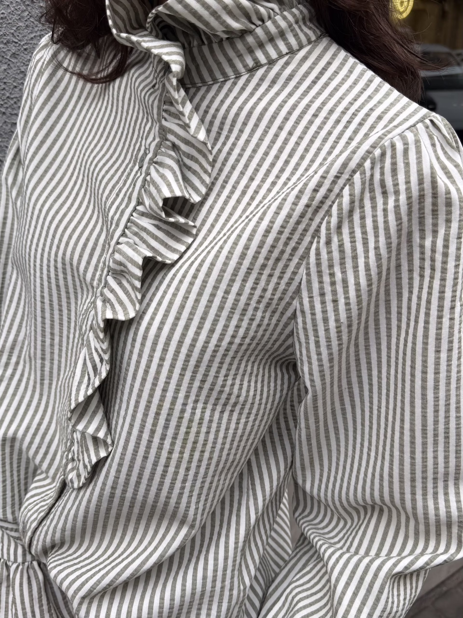 Blusa de rayas verticales en tono sable con volante frontal asimétrico y cuello ligeramente elevado.