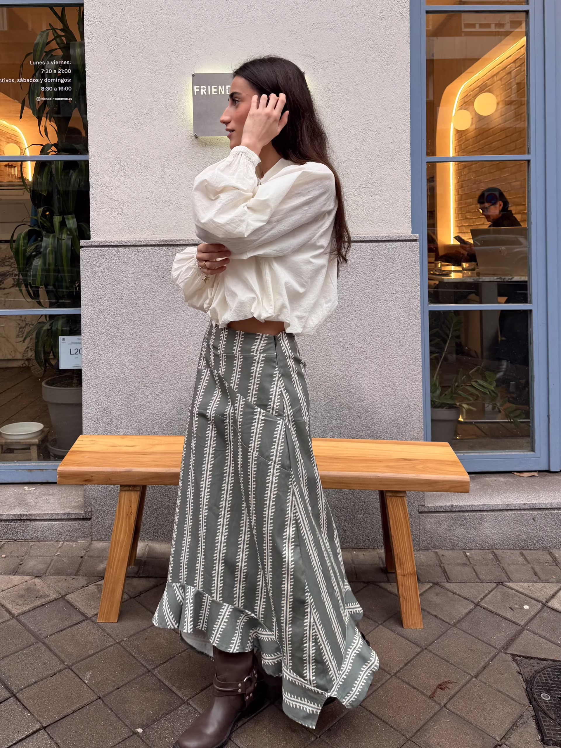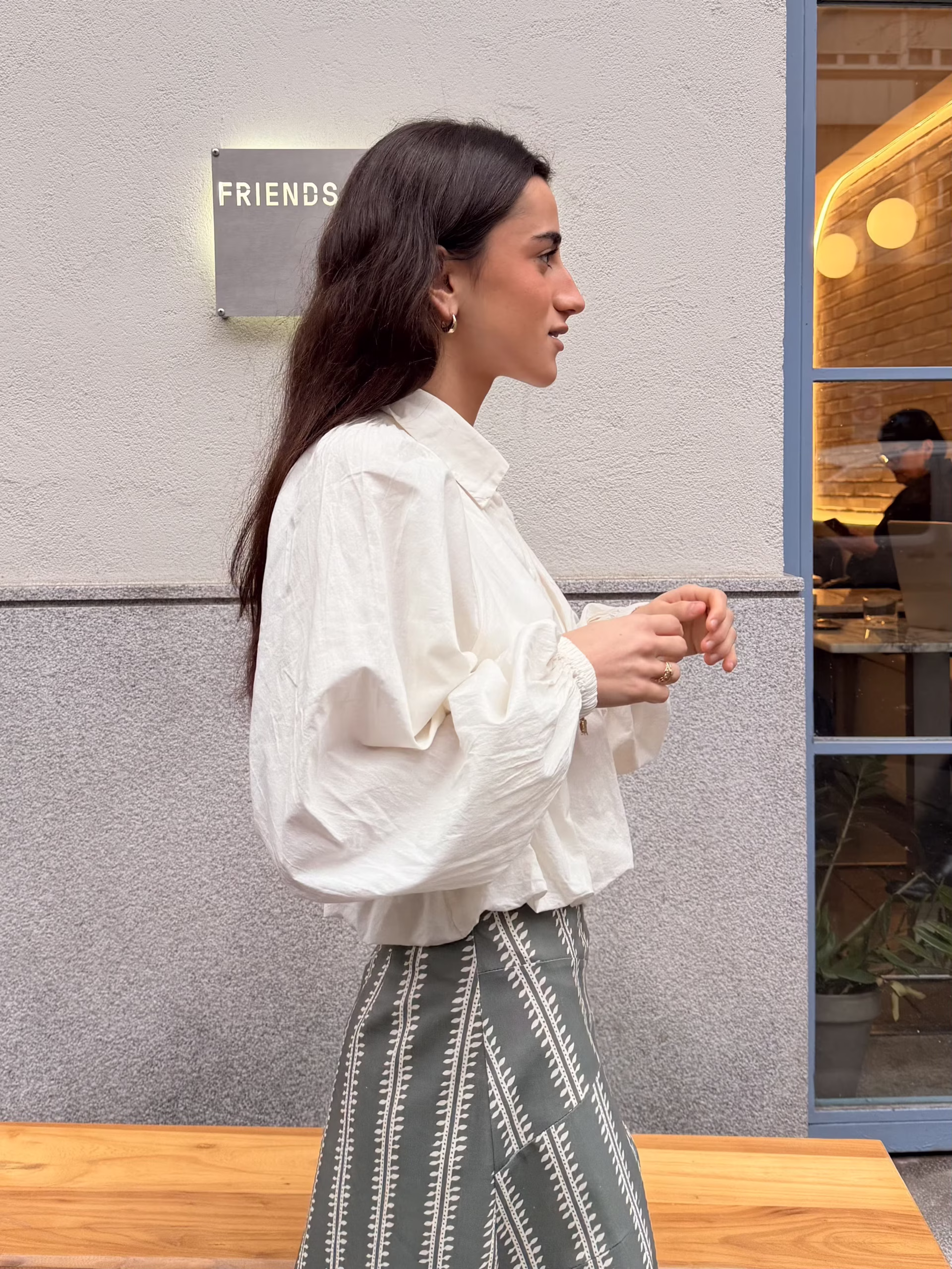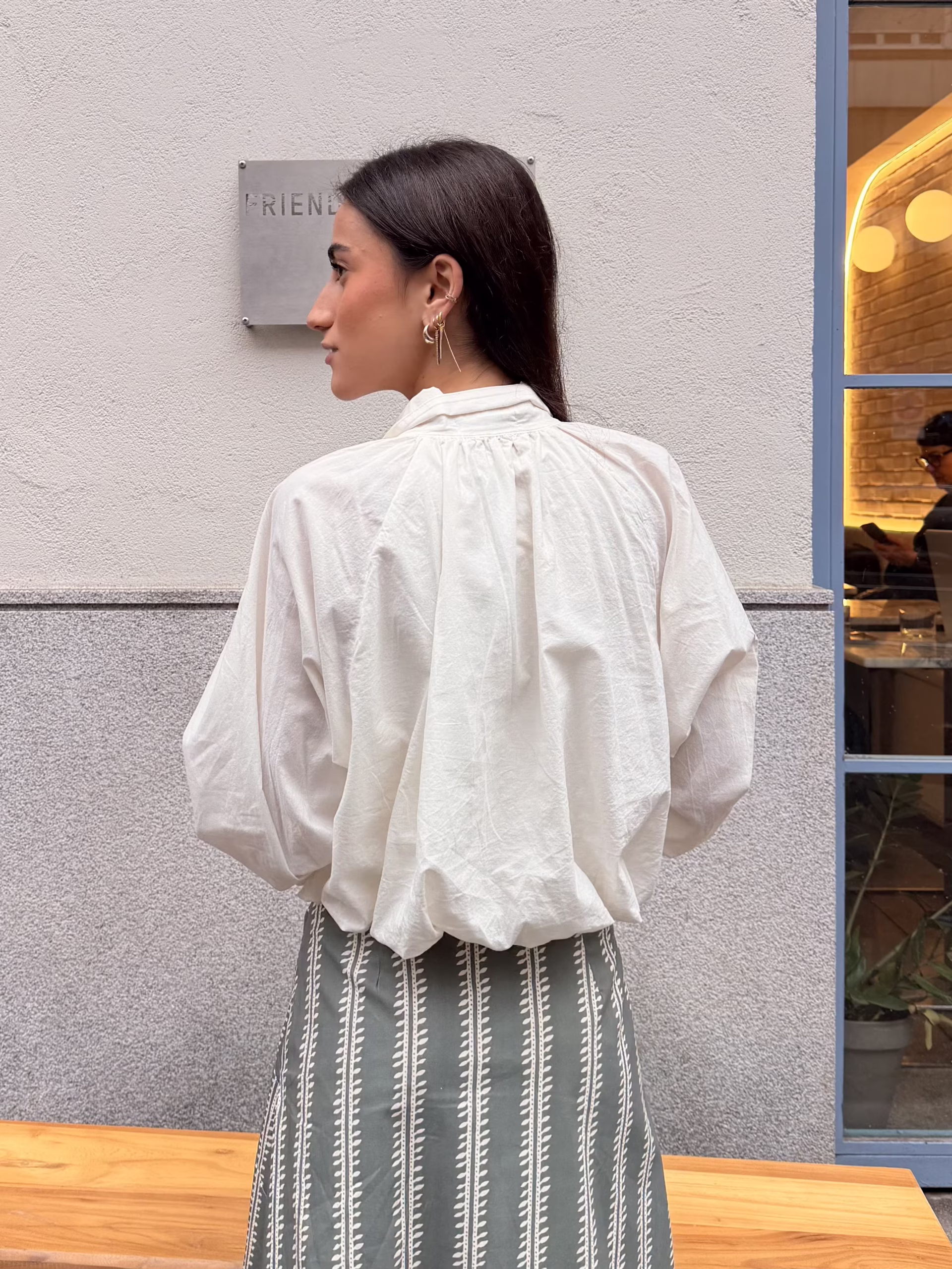 Camisa fluida en color crudo con cuello camisero suave y cierre frontal abotonado. Diseño de manga larga con volumen y puño elástico que aporta estructura sin rigidez. Tejido ligero con caída natural y silueta relajada.