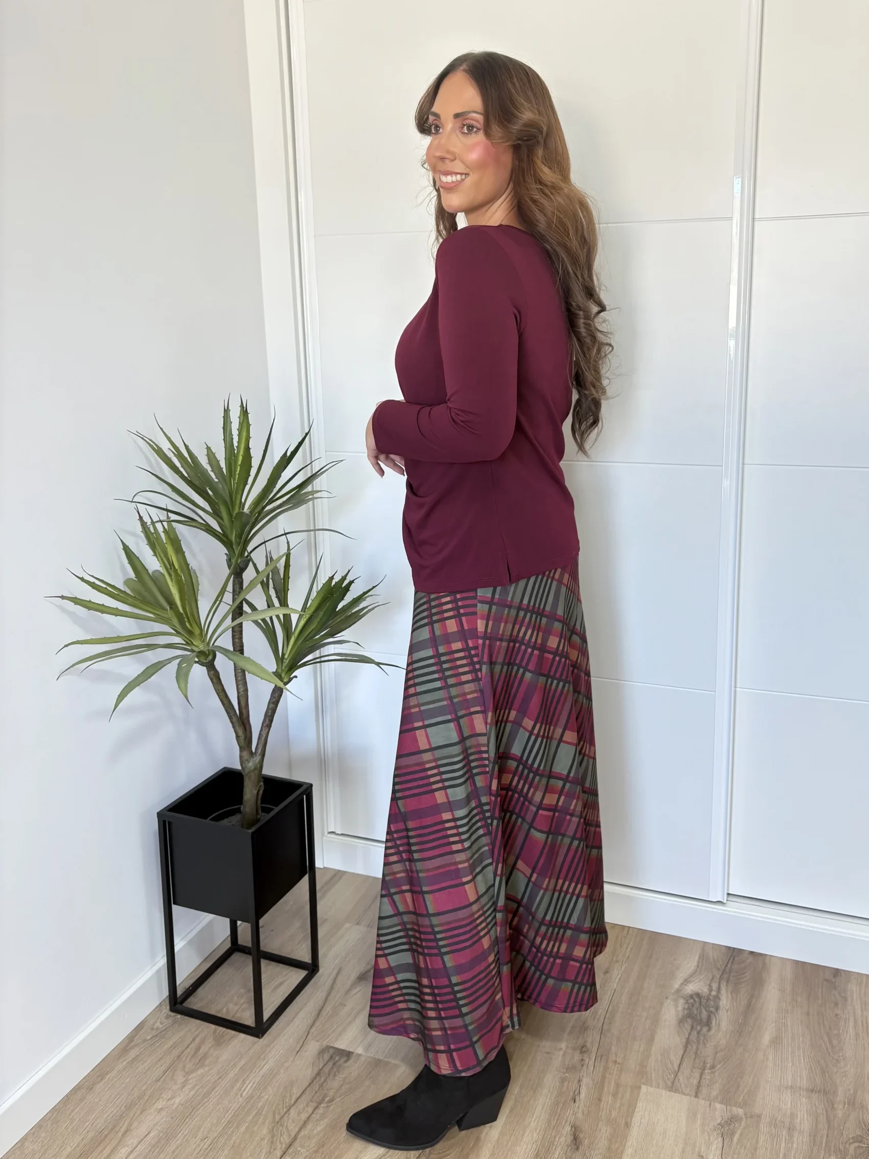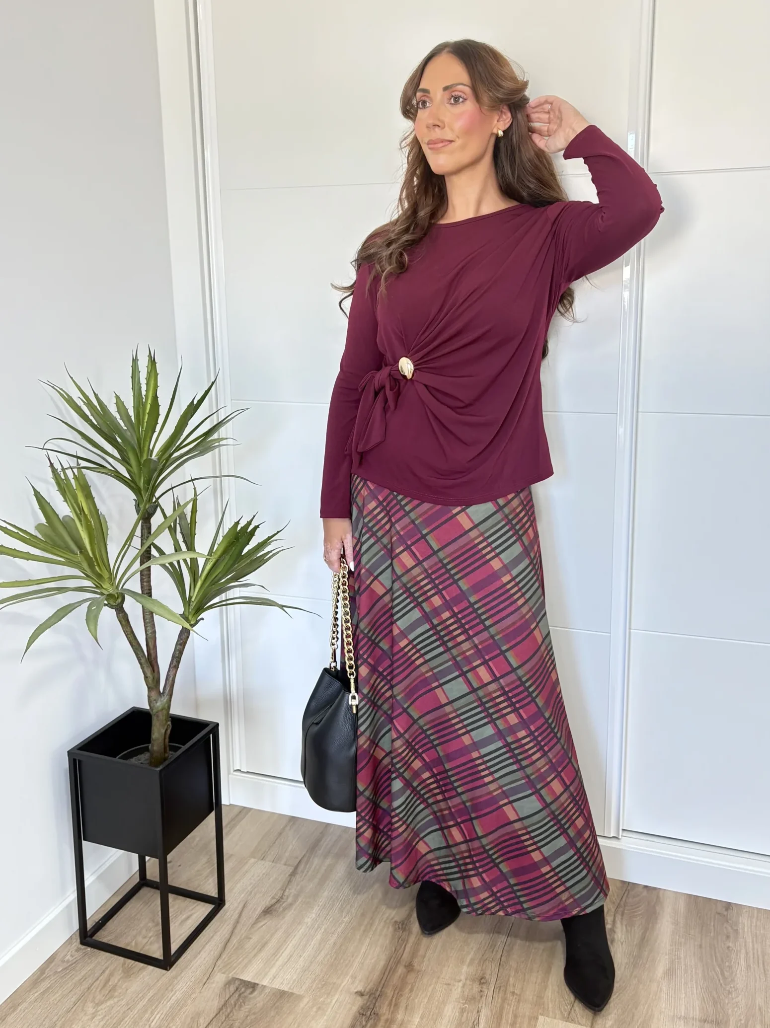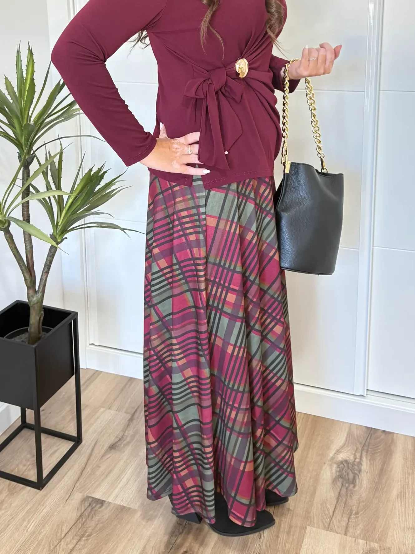 Camiseta de manga larga en color granate confeccionada en tejido de poliéster ligero y cómodo. Destaca por su detalle lateral fruncido con lazo y hebilla decorativa, que realza la cintura y aporta un toque elegante al diseño. Una prenda fácil de llevar, ideal para dar un aire distinto a un look diario o combinar en ocasiones más especiales