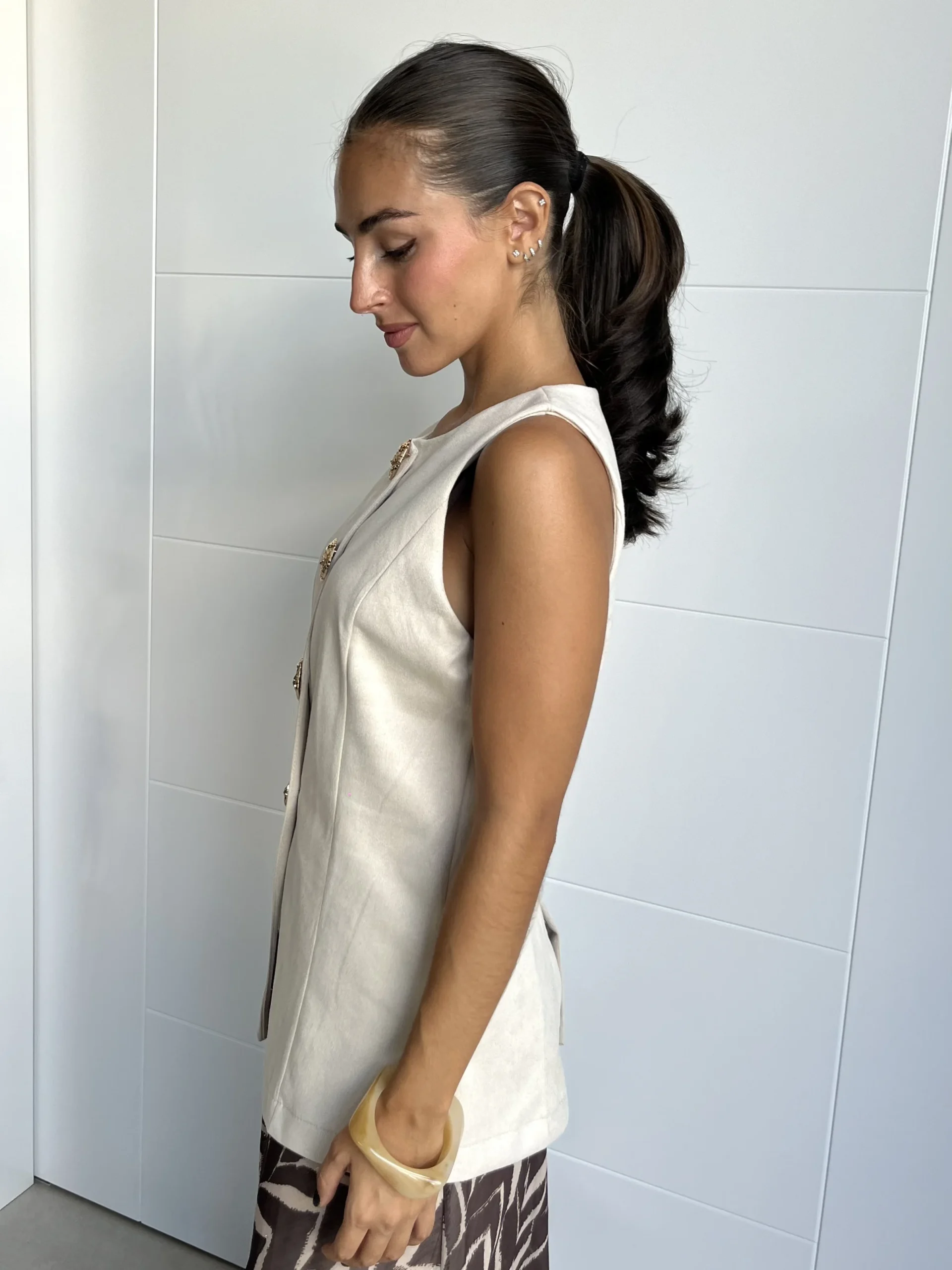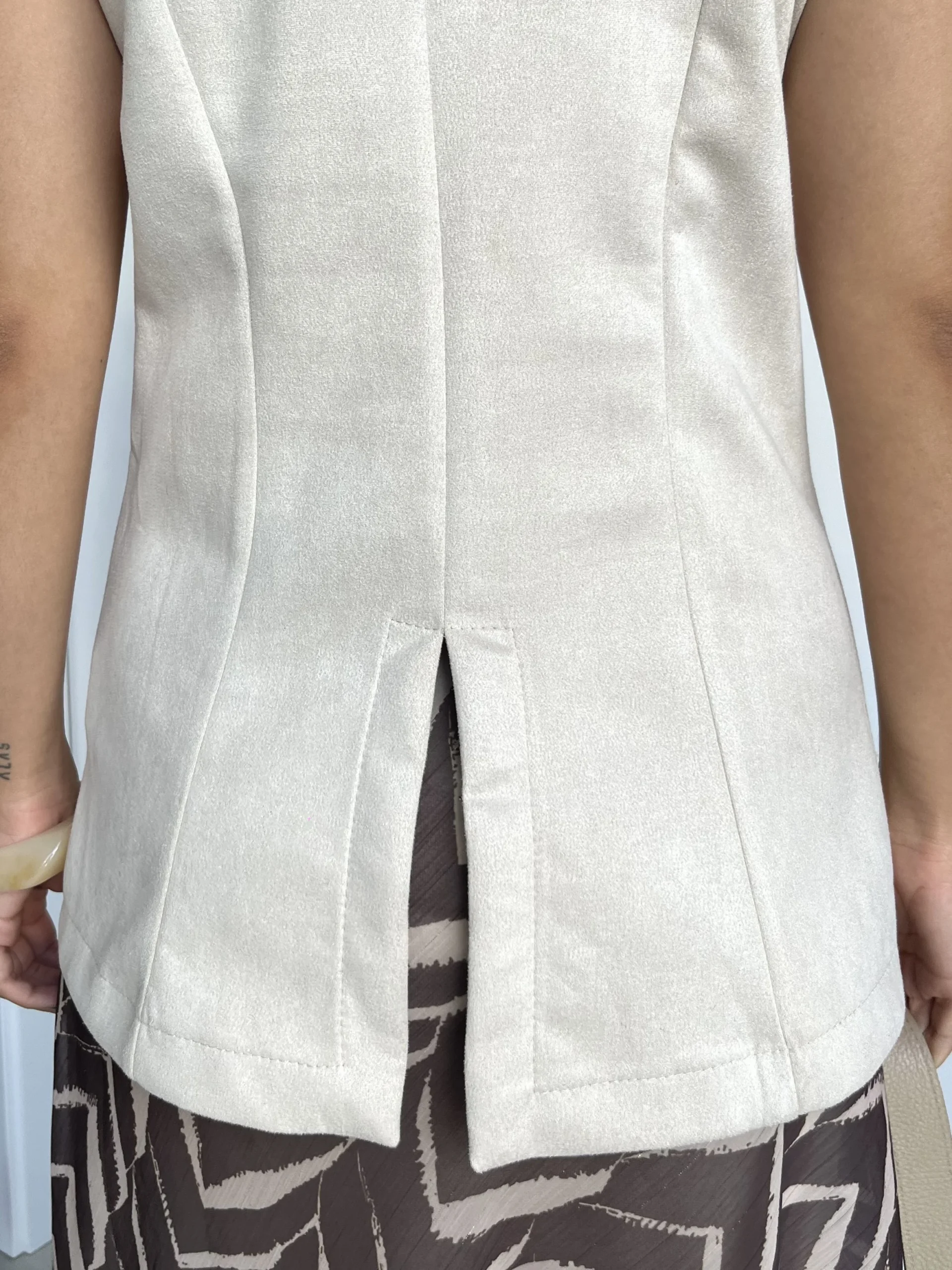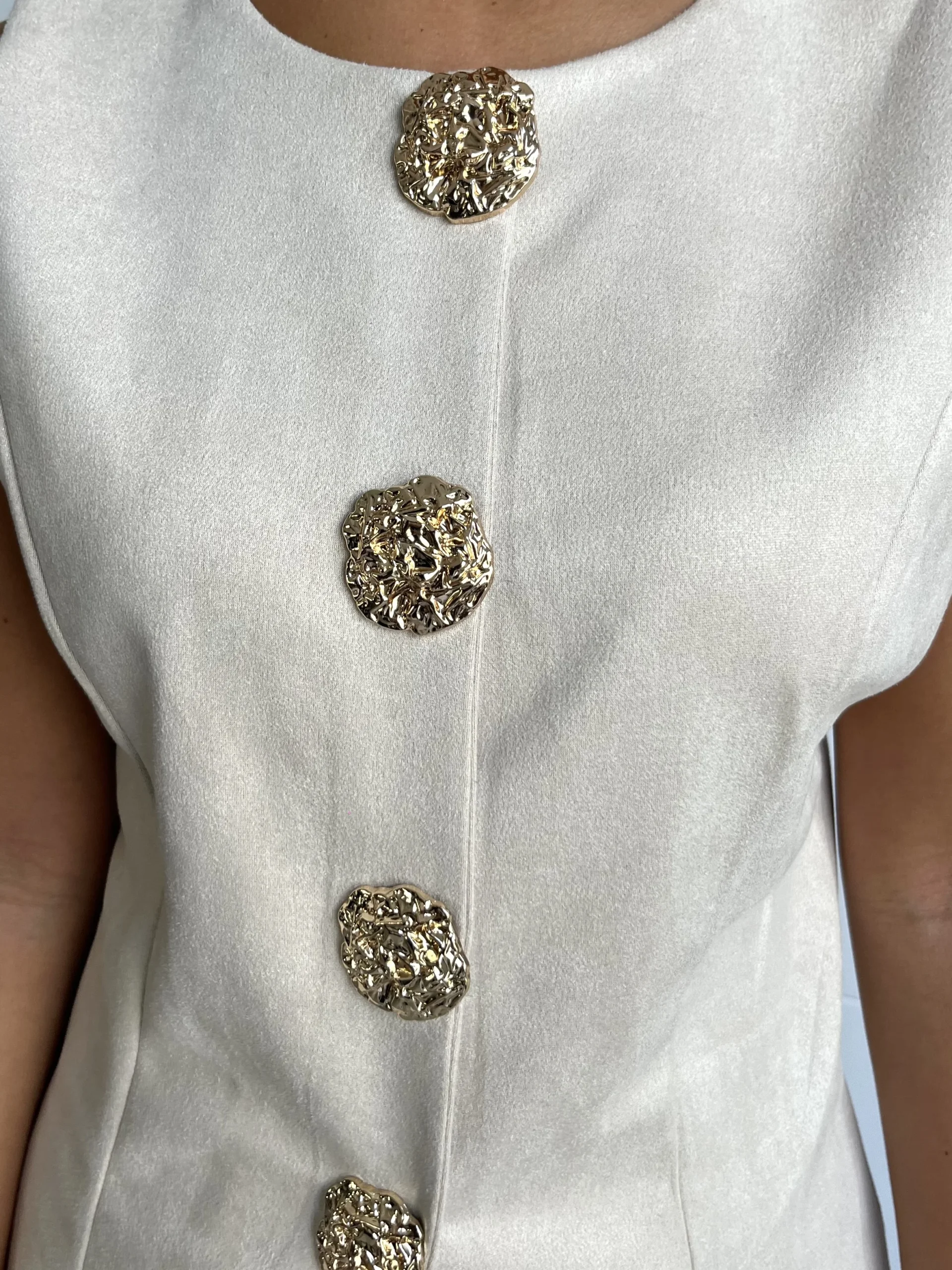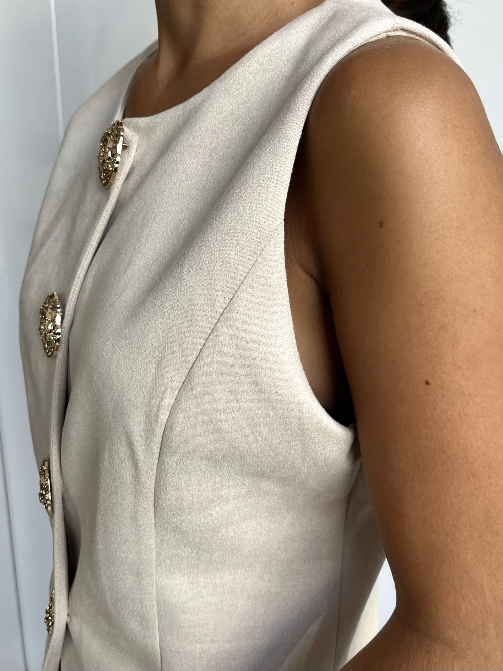 Chaleco midi de ante en color crudo, con 4 botones ajustables dorados en la parte frontal. Cuello redondo y ceñido a la cintura.
