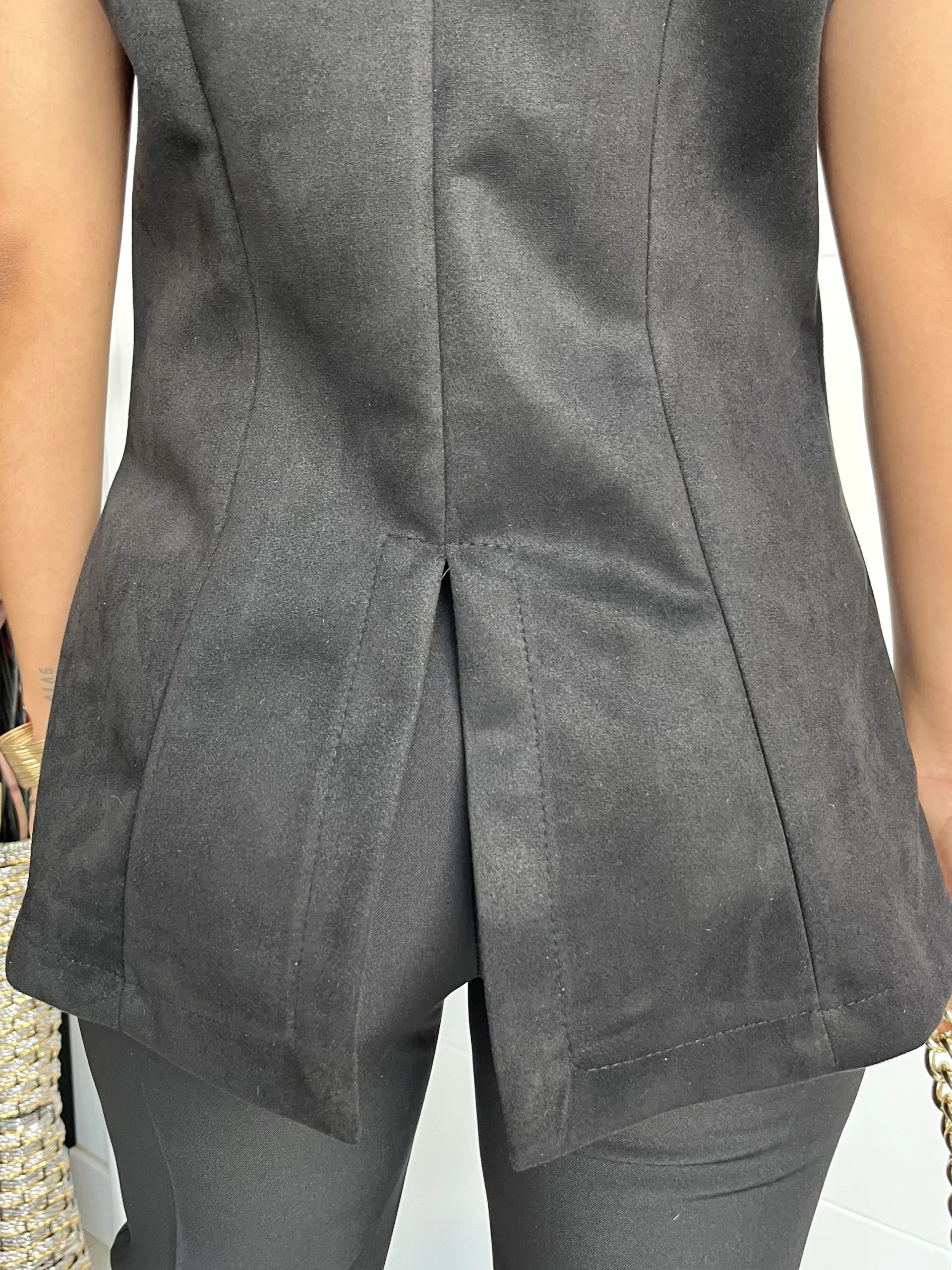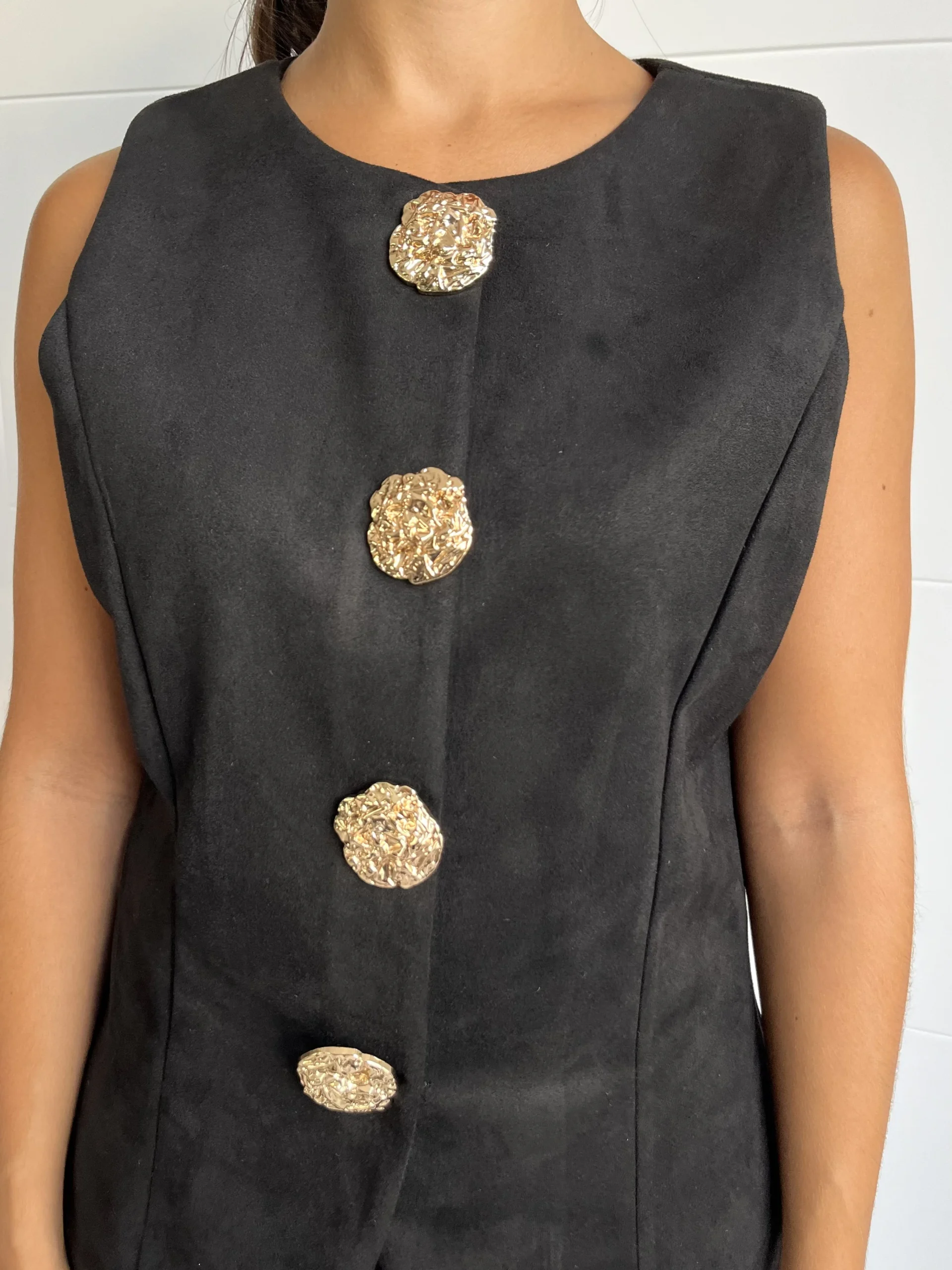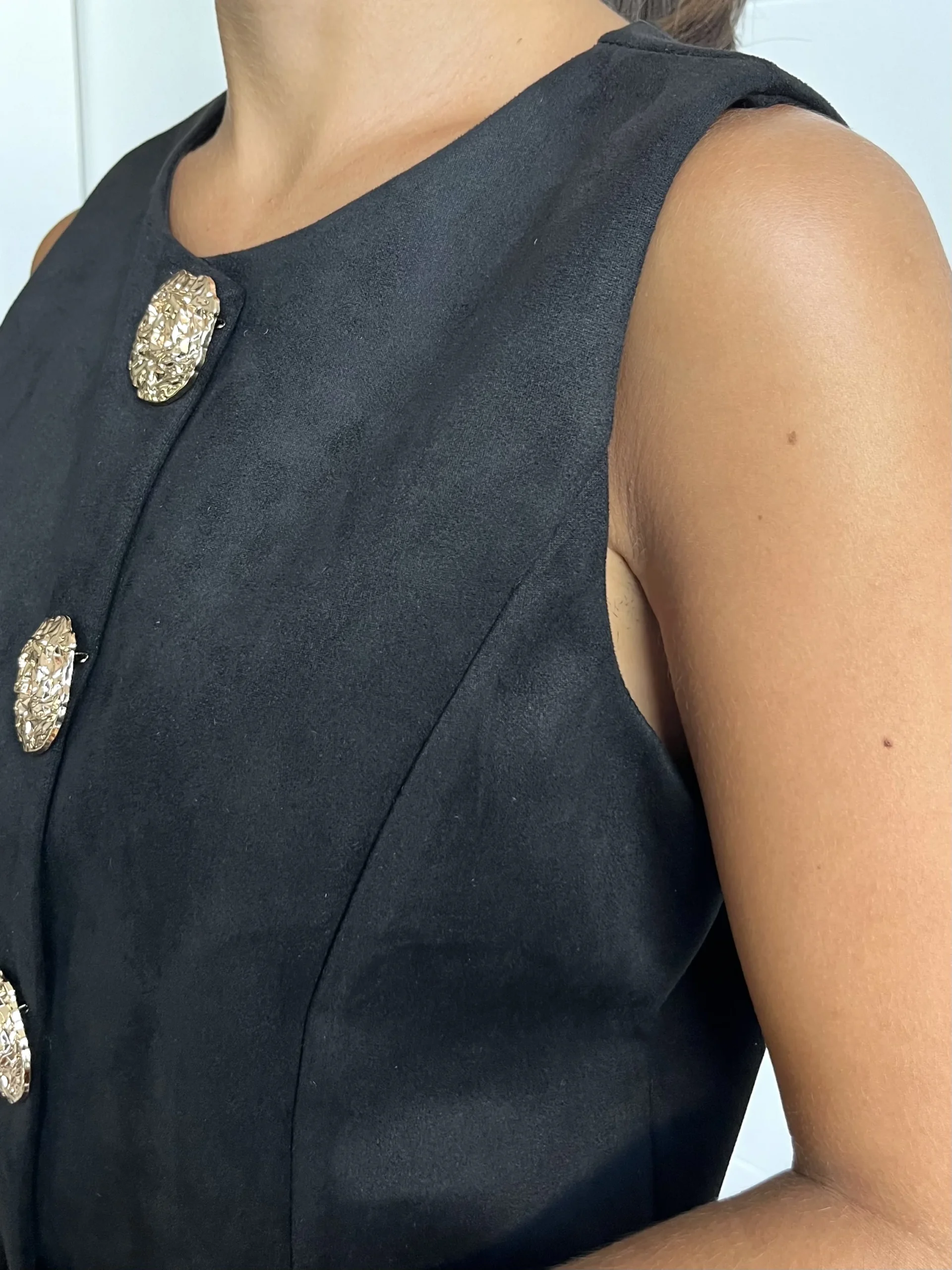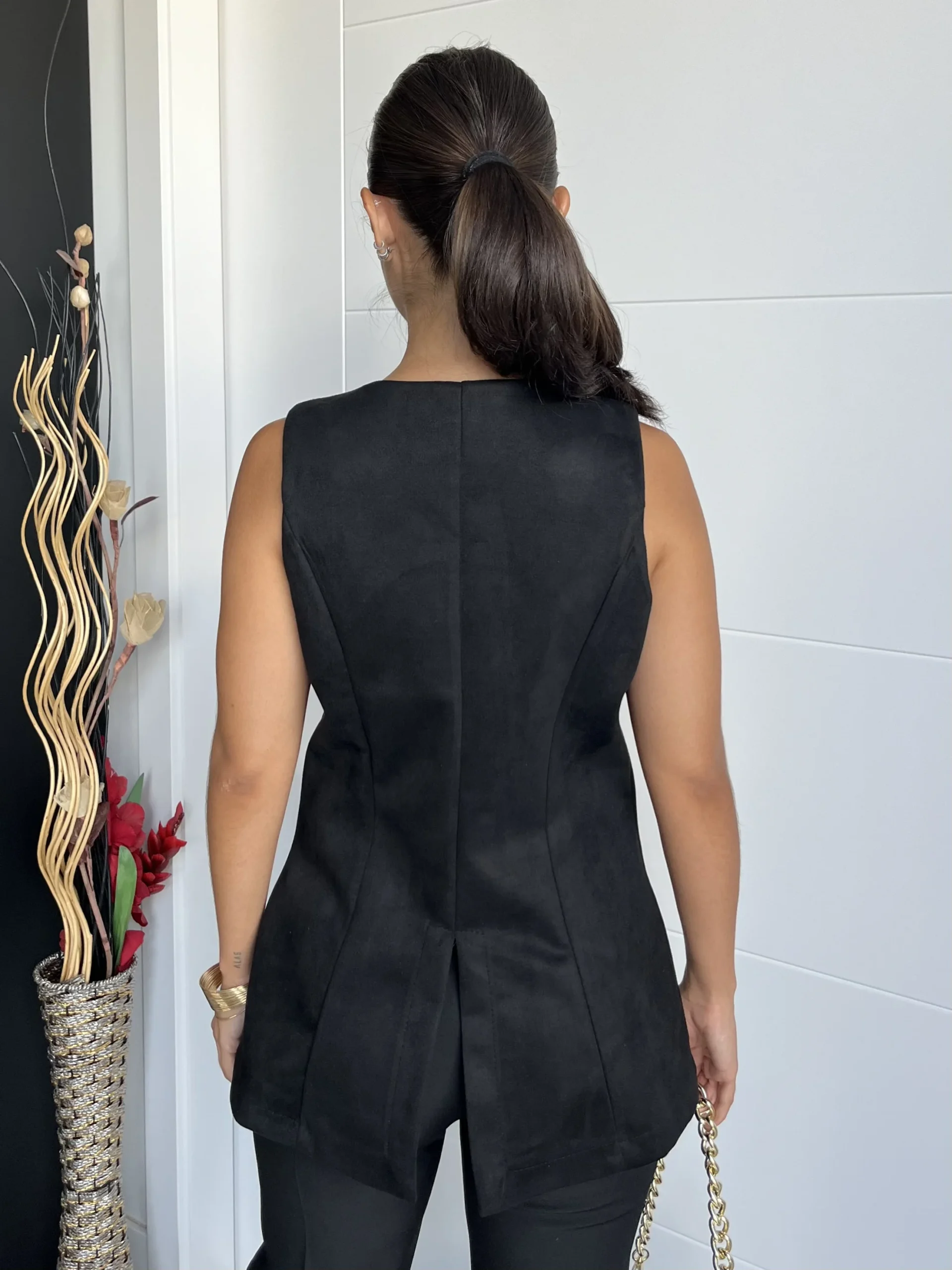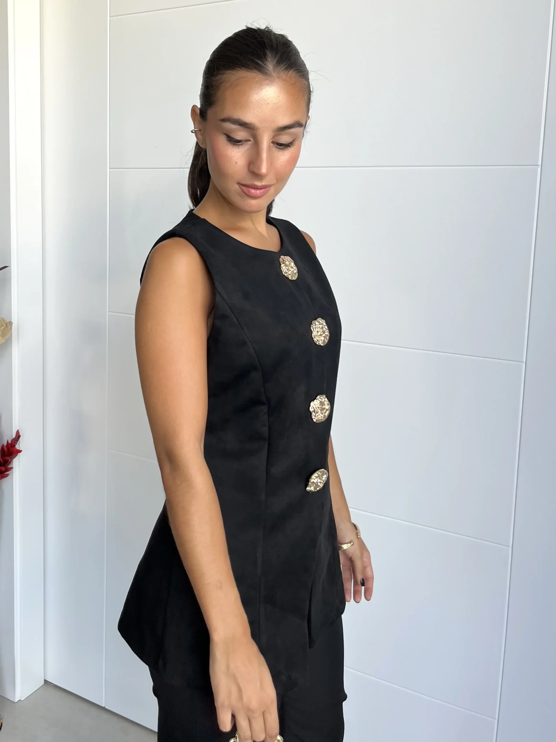 Chaleco midi de ante en color negro, con 4 botones ajustables dorados en la parte frontal. Cuello redondo y ceñido a la cintura.