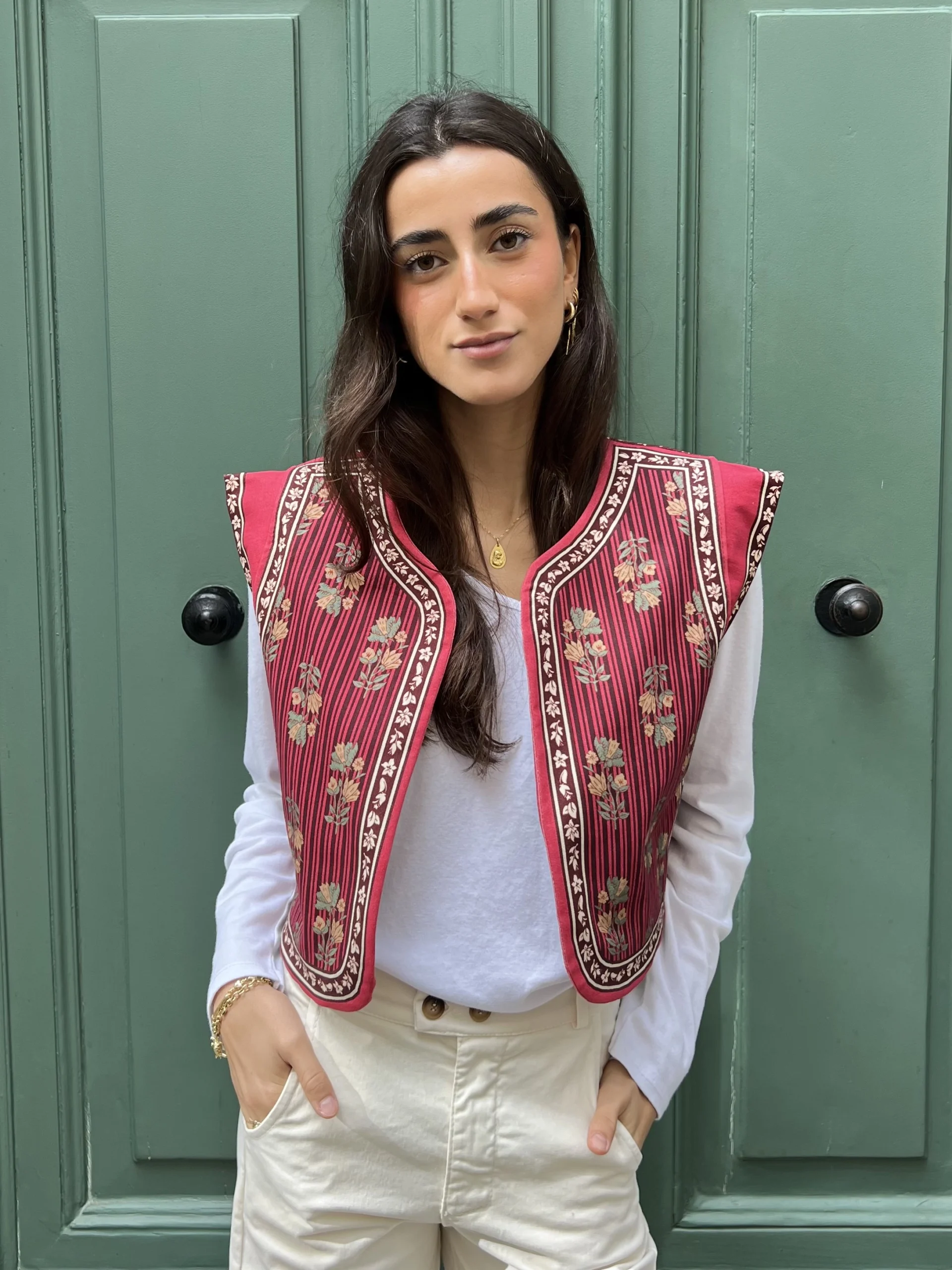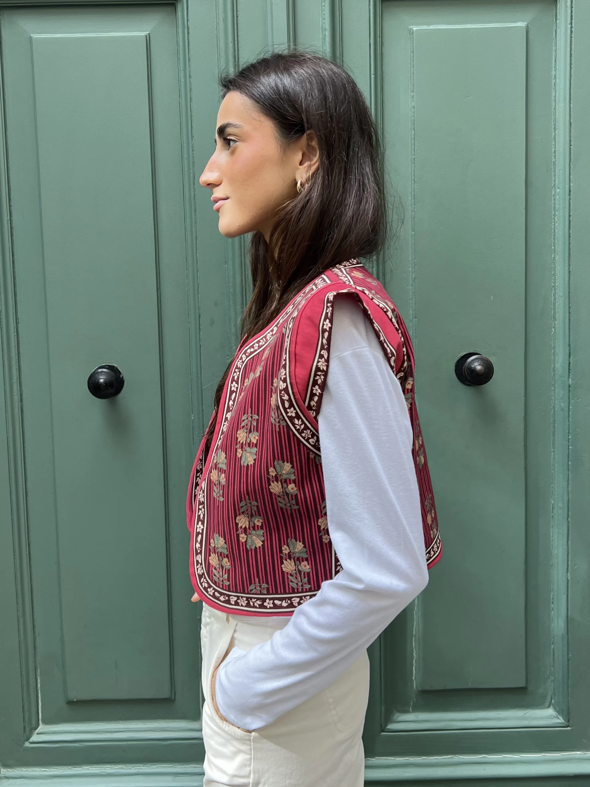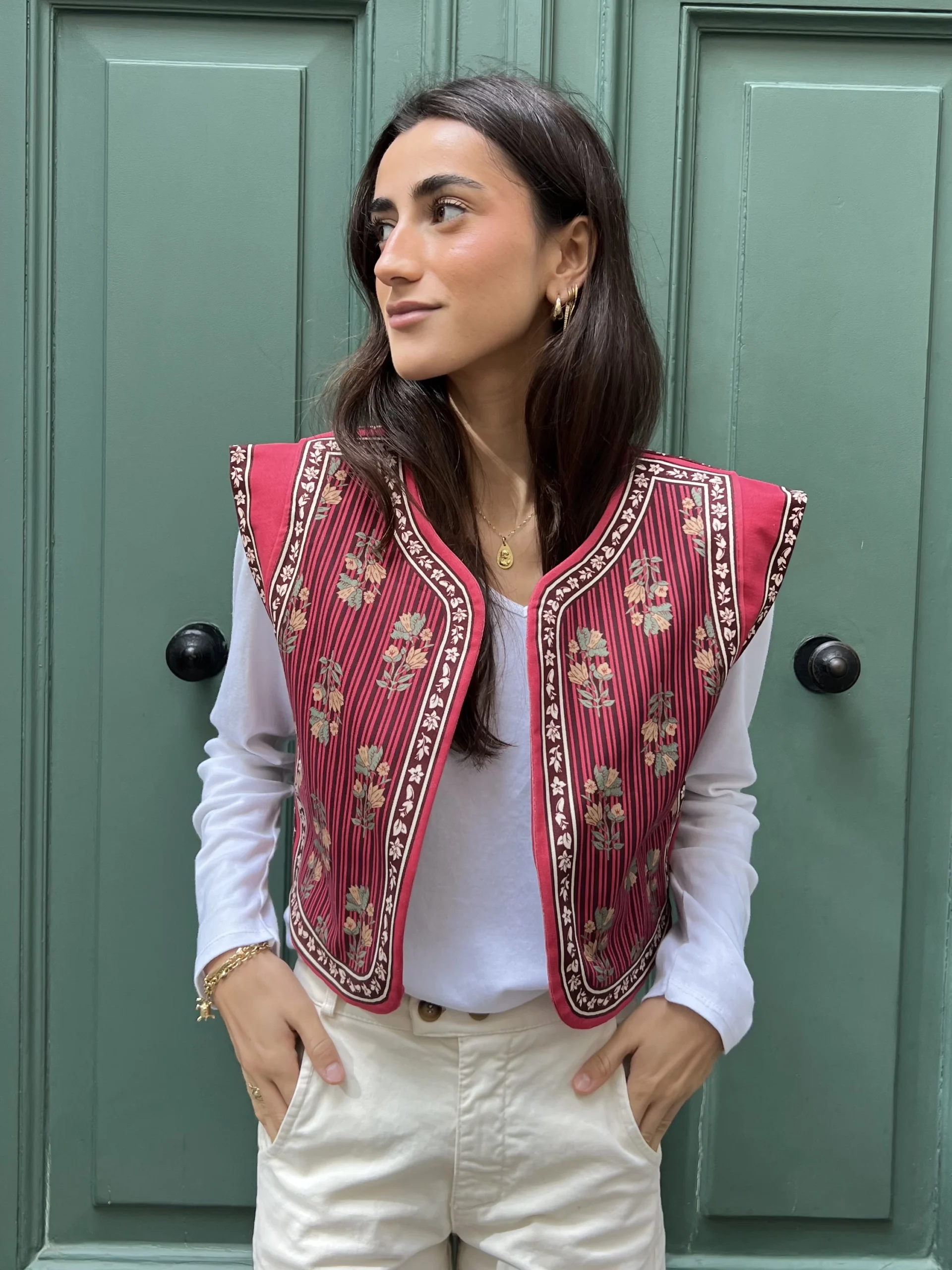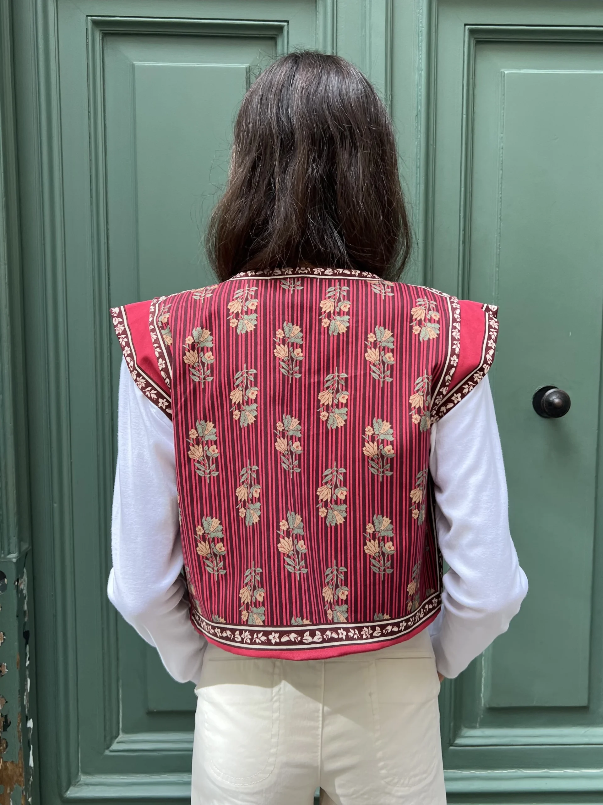 Chaleco loneta rojo estampado, con rayas verticales marrones y flores multicolor por toda la prenda. hombreras rectas y bordes con dibujo.