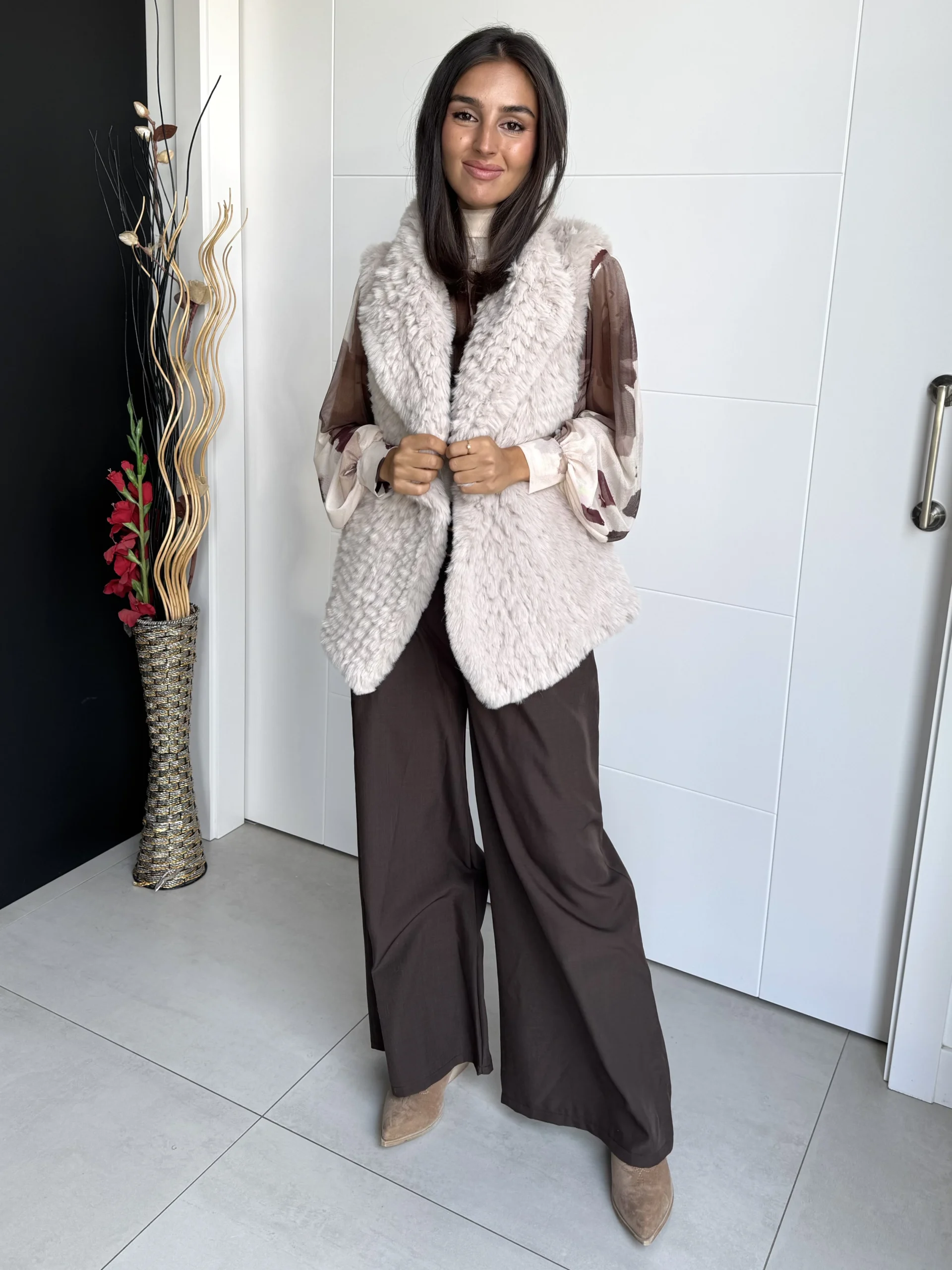 El chaleco de pelo sintético beige es la prenda perfecta para dar un toque sofisticado y cálido a tus looks de entretiempo e invierno. Confeccionado en pelo sintético de alta calidad, ofrece una textura suave y mullida que aporta volumen sin renunciar a la comodidad. Su corte recto y largo a la cadera estiliza la silueta y permite múltiples combinaciones, desde blusas fluidas hasta jerséis ajustados.