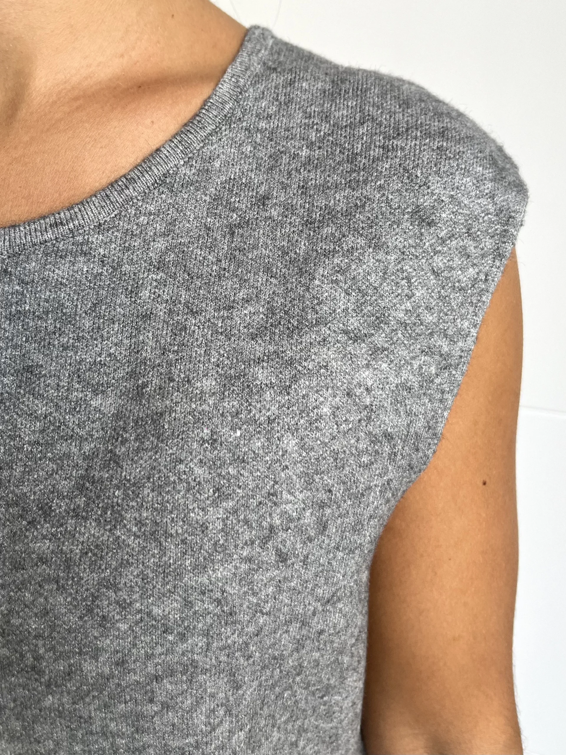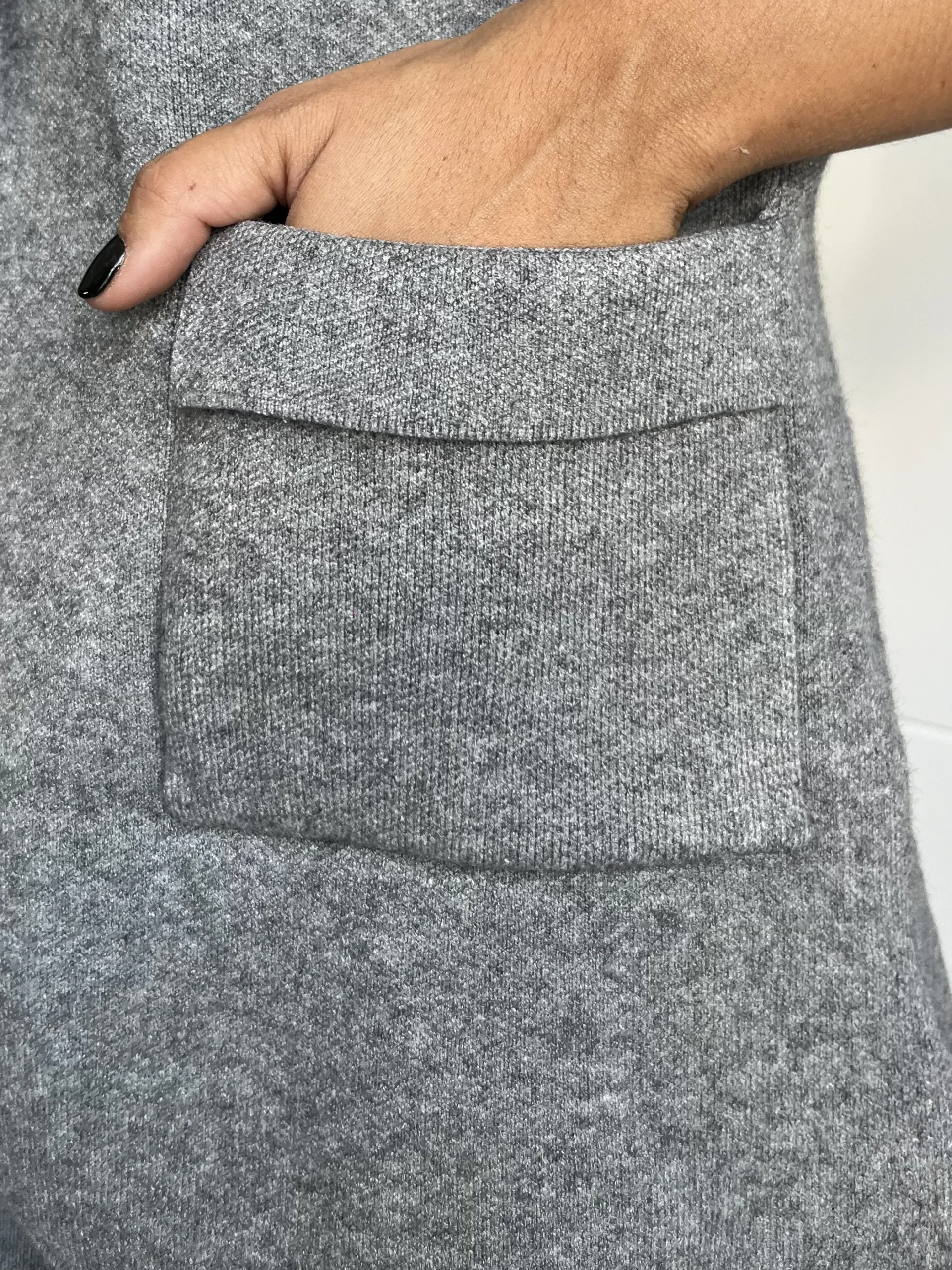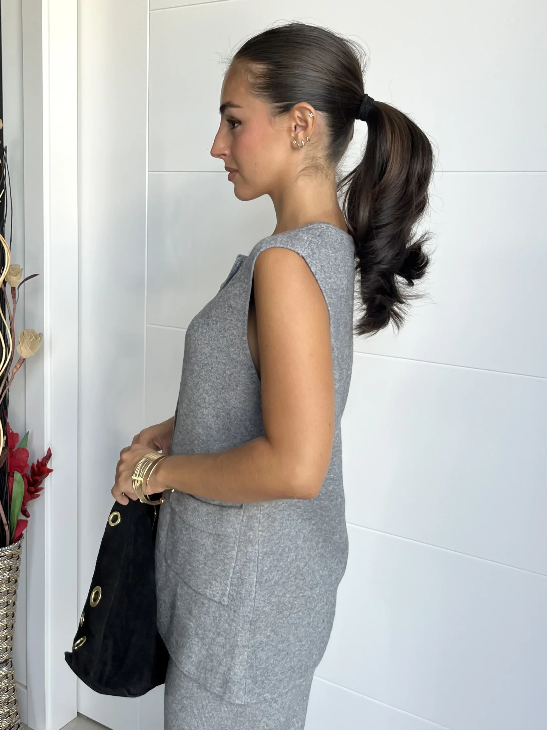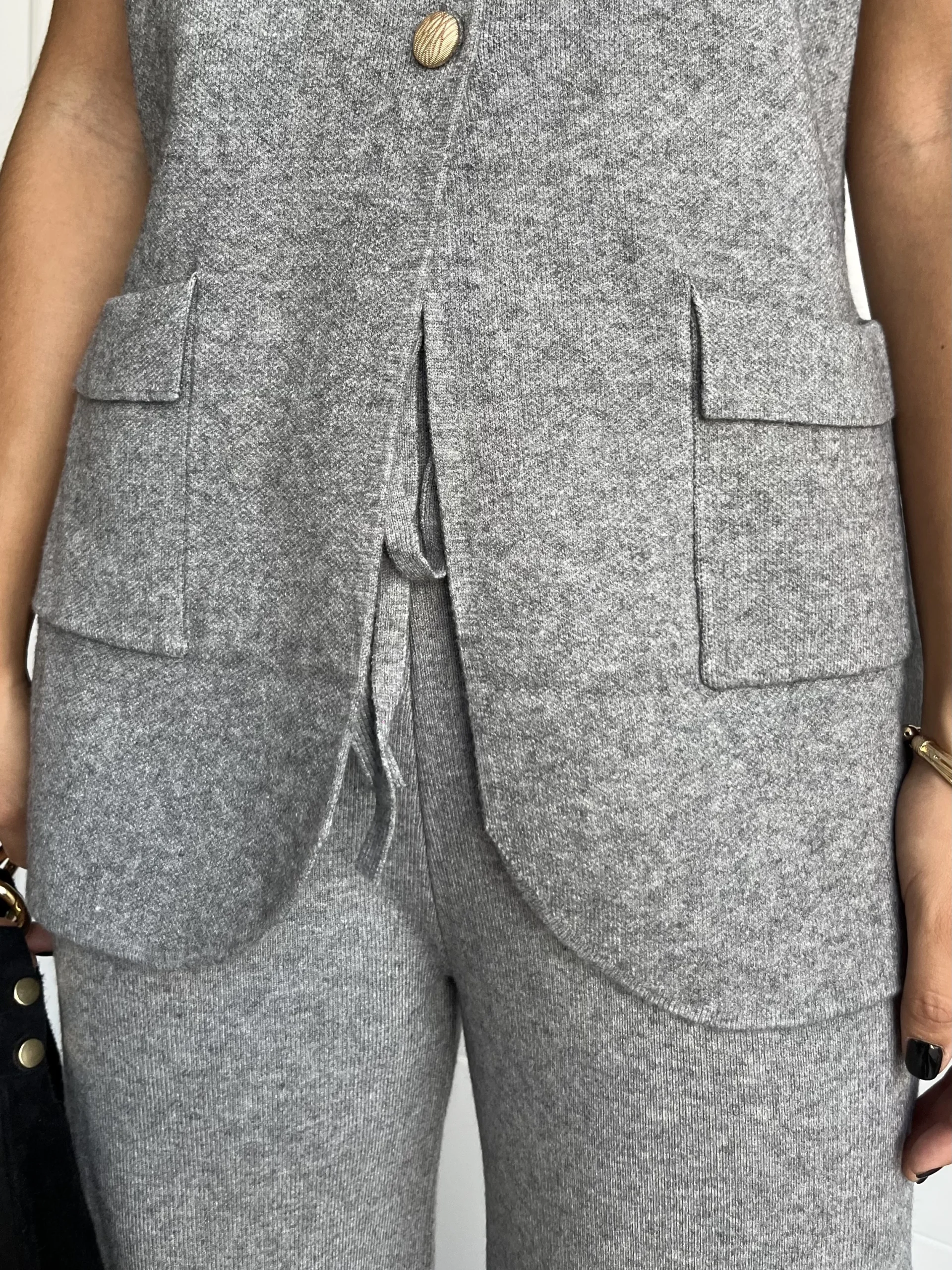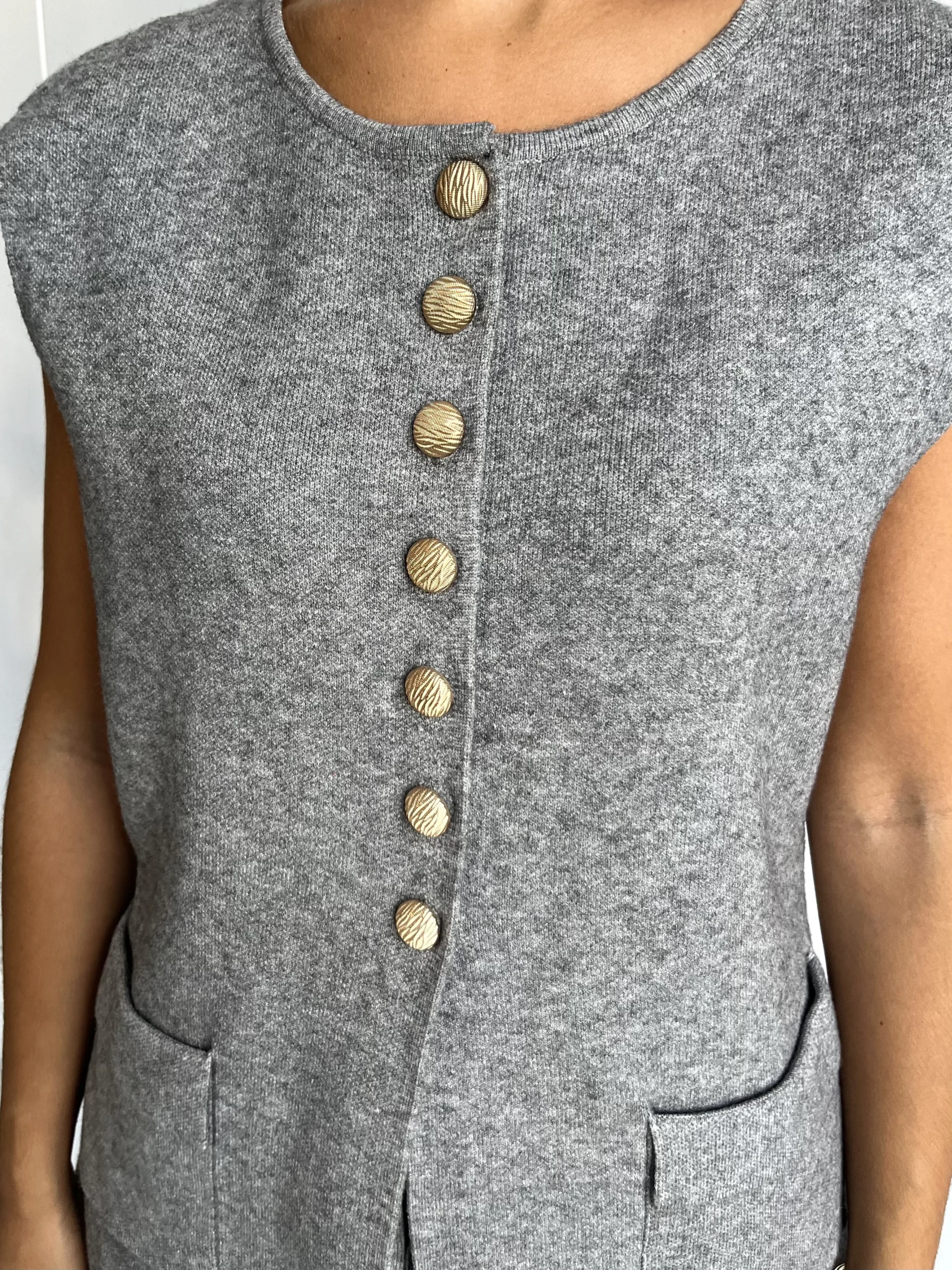 Chaleco de punto suave en color gris, cuello redondo y botones dorados en la parte frontal. Bolsillos en la parte frontal. A juego con el Pantalón Punto Suave Gris.
