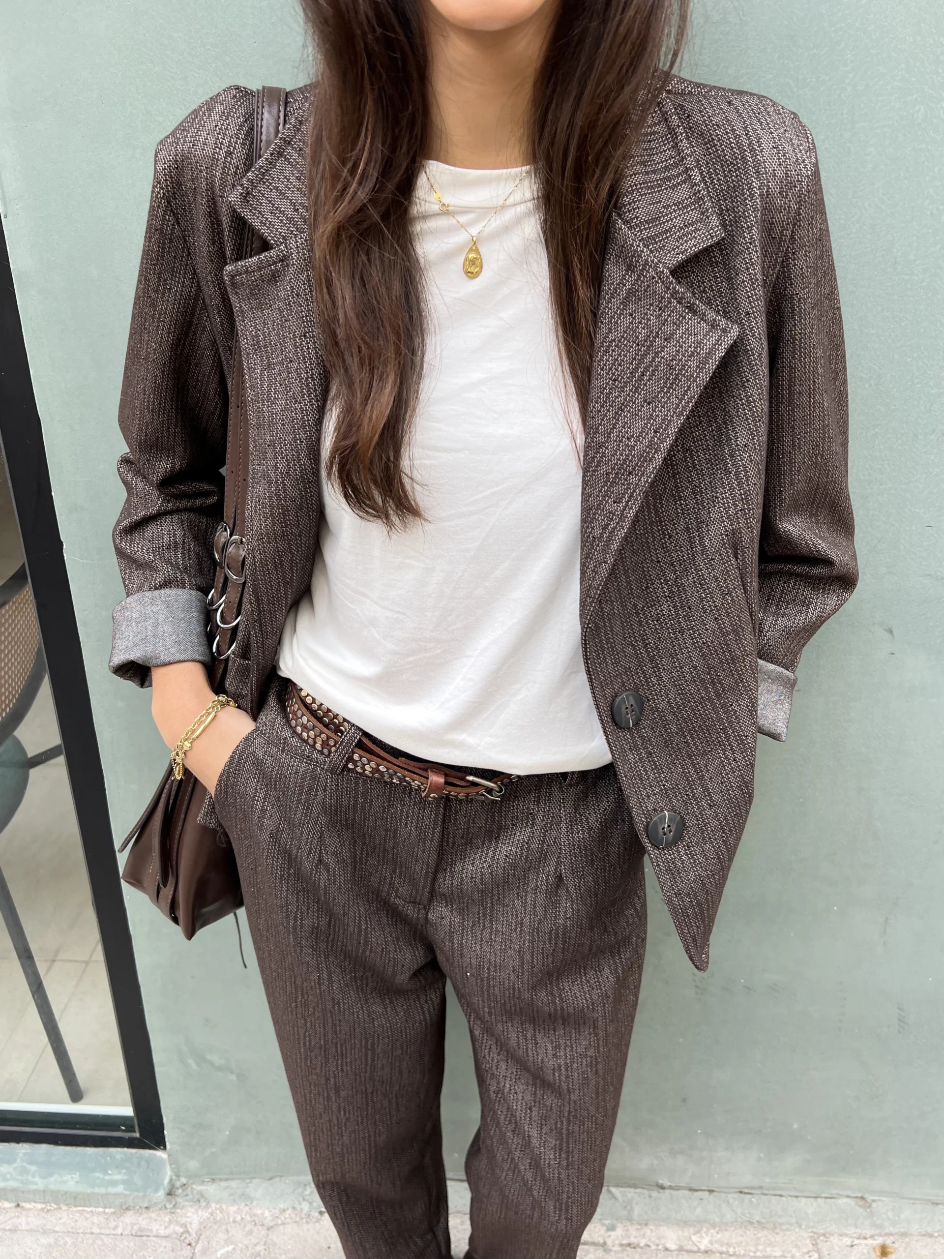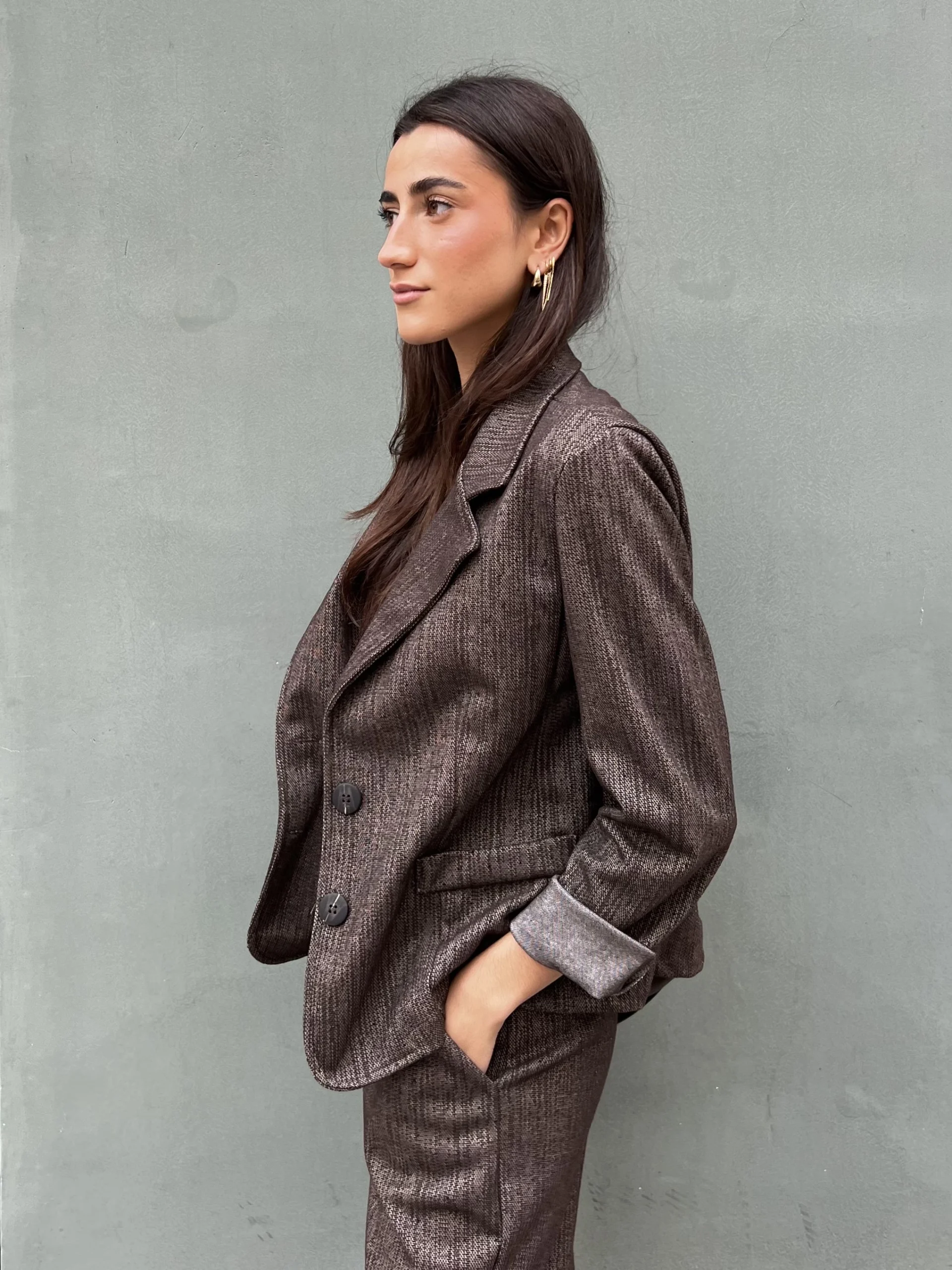 Chaqueta de traje en tejido con brillo satinado color moka. Cuello solapa y cierre delantero con dos botones. Mangas con ligera amplitud y vuelta en el puño. Forro interior parcial para mayor comodidad.