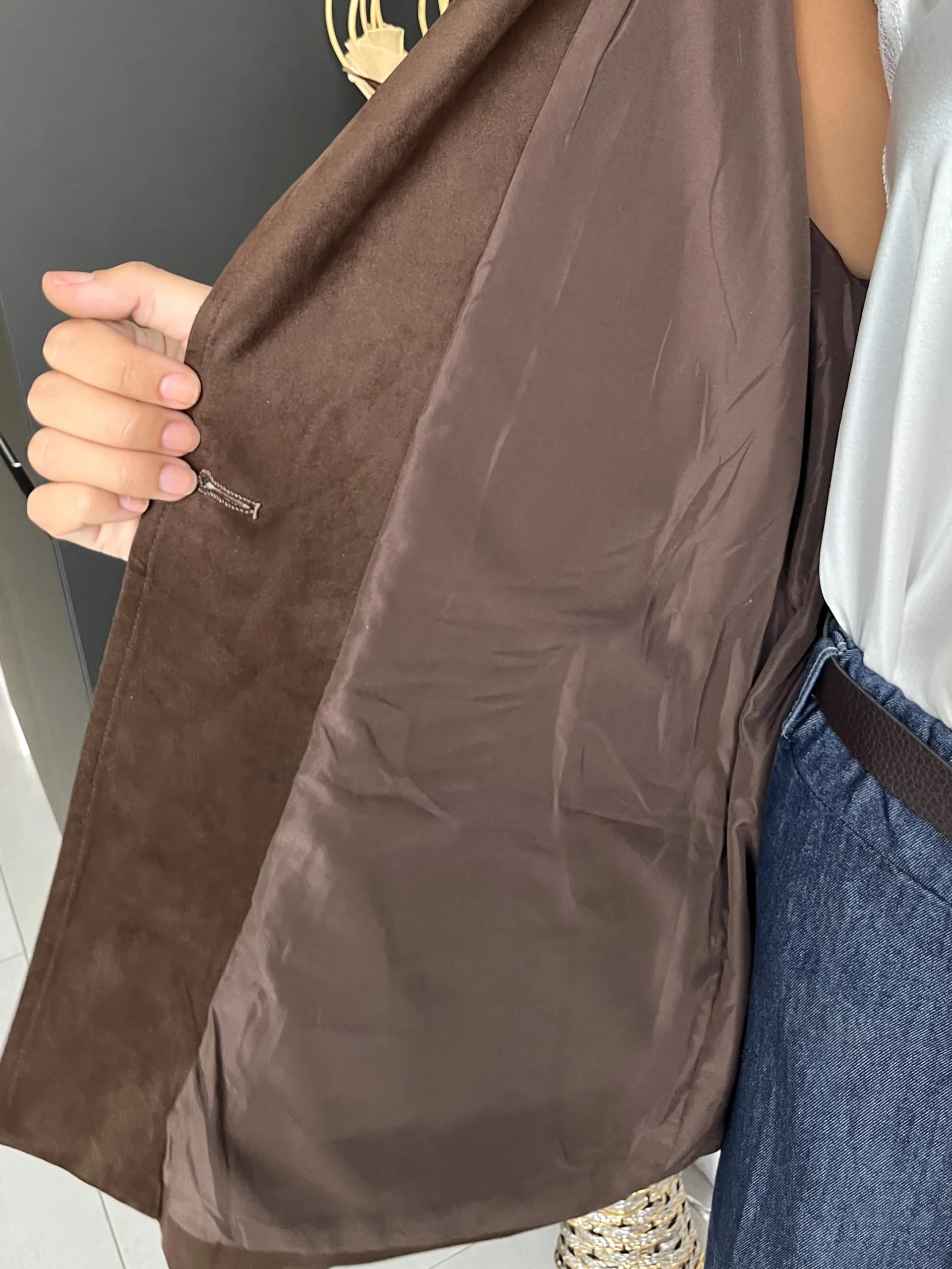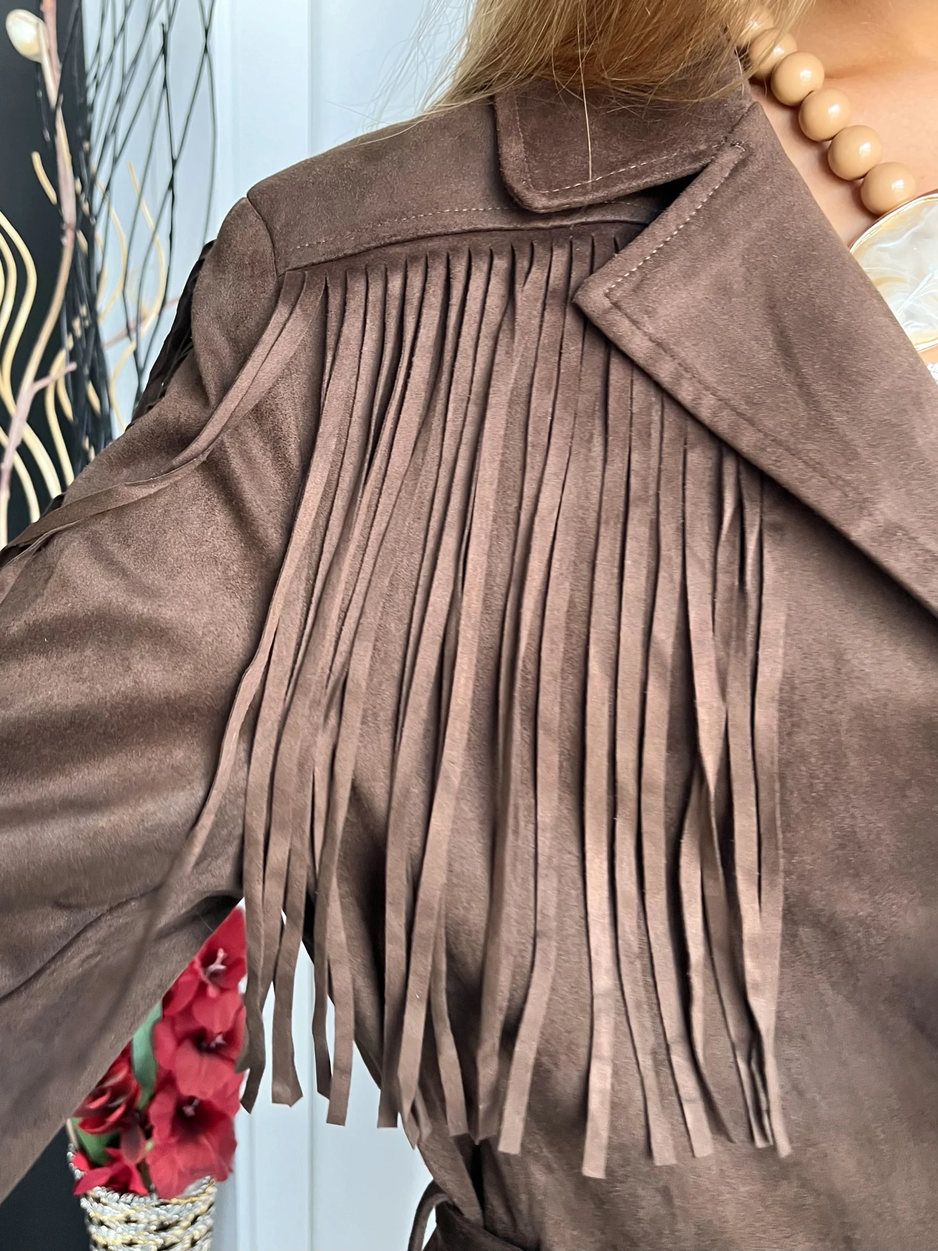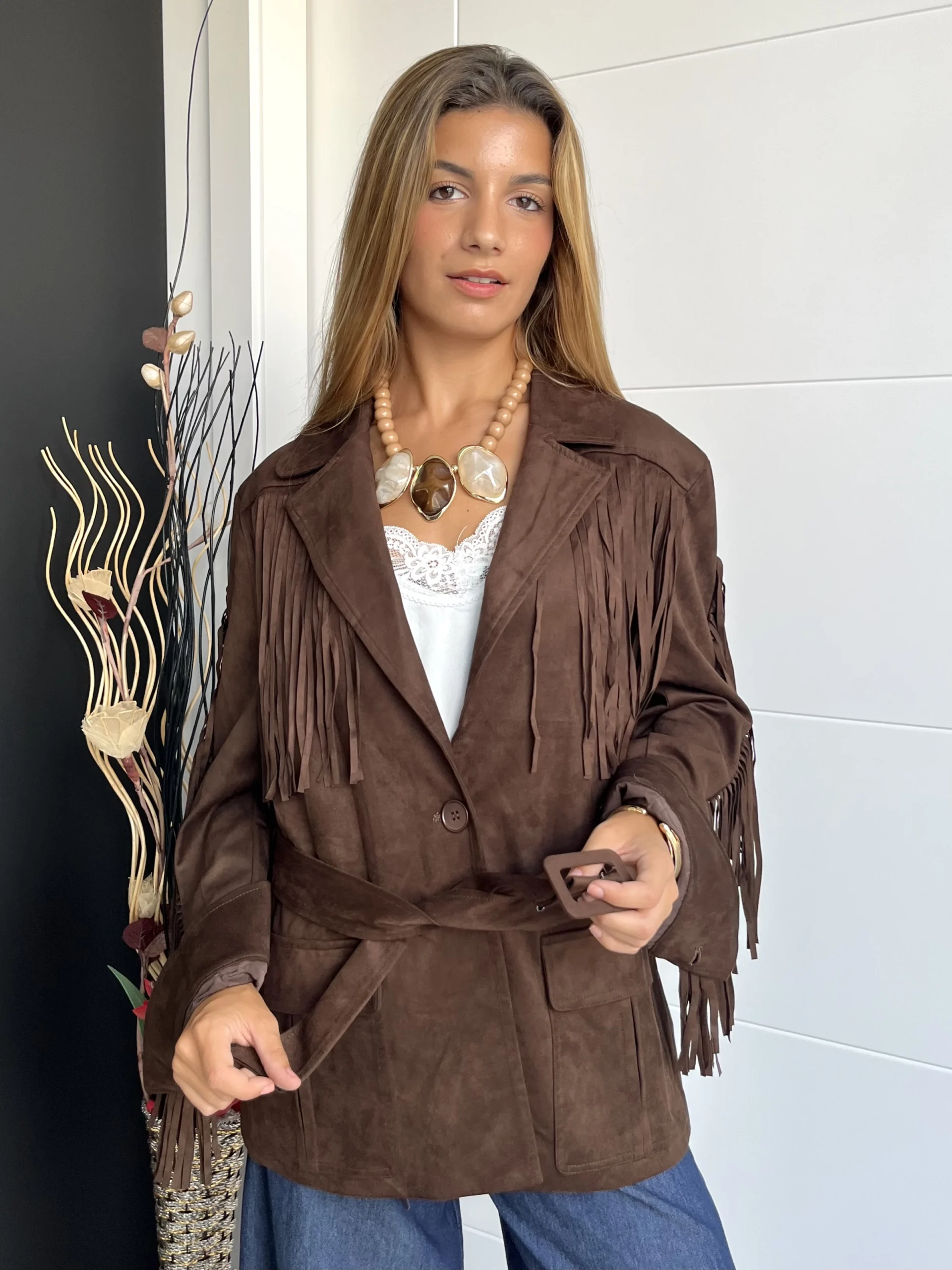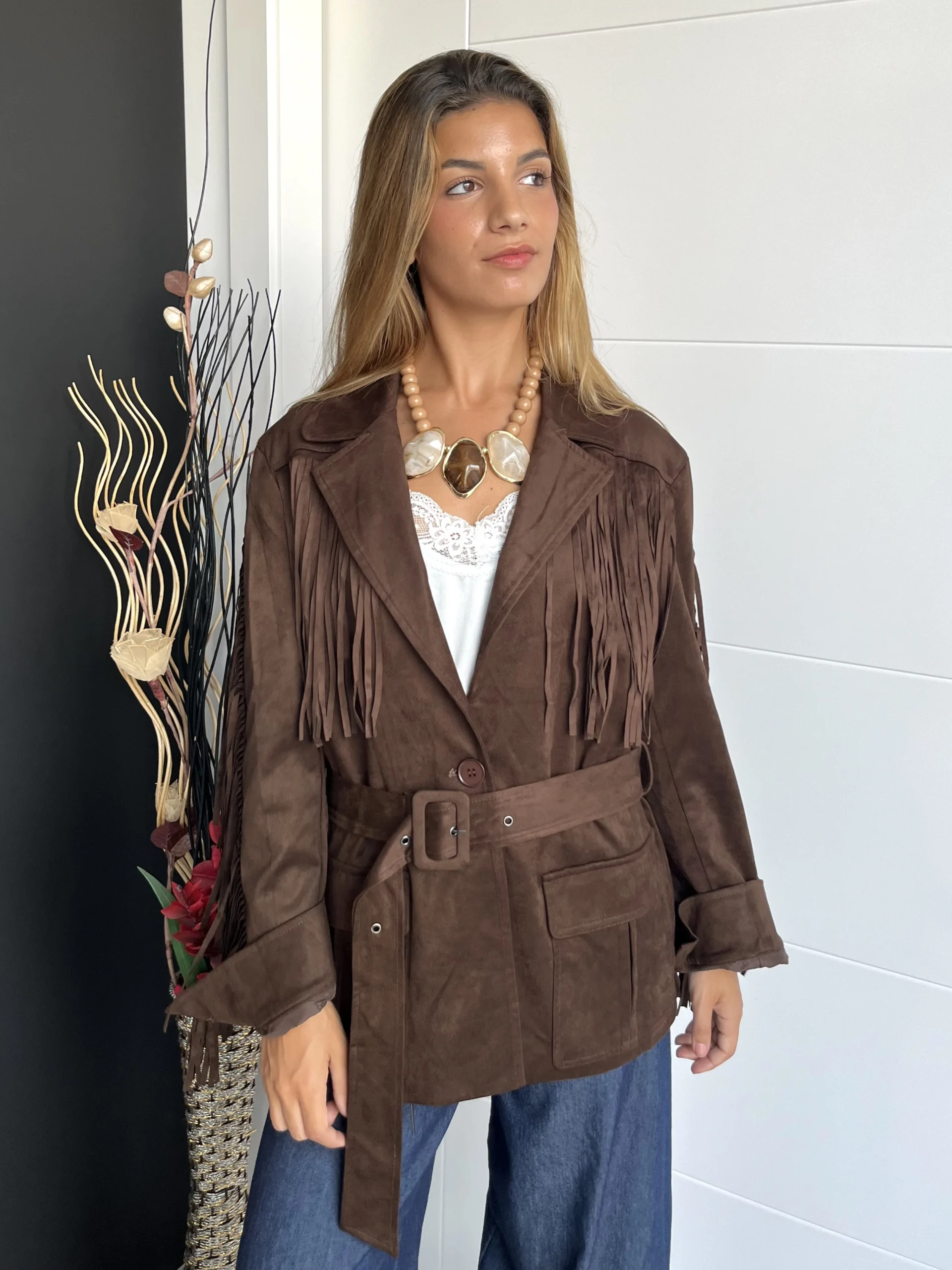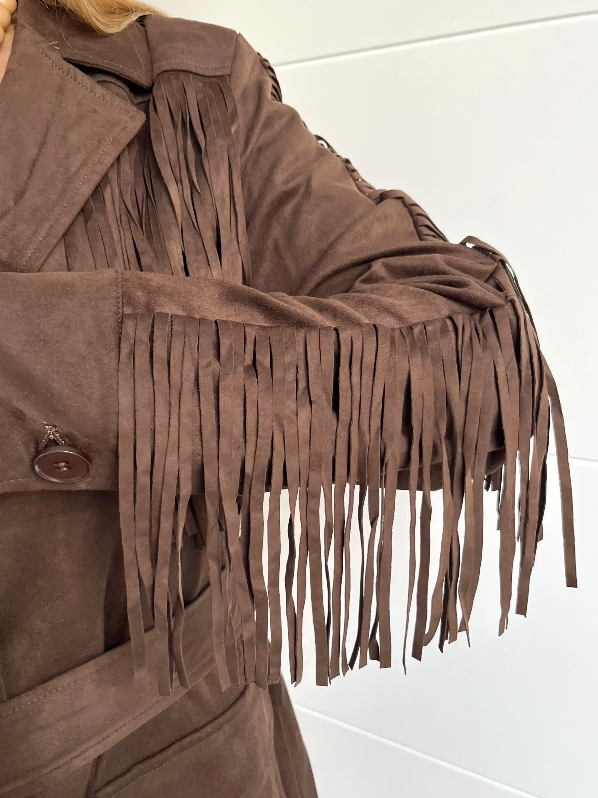Chaqueta de ante en color marrón chocolate, con flecos en las mangas y en el pecho. Cuello camisero y botón en el centro para cerrarla. Cinturón incluido. Botones en los puños y bolsillos frontales.