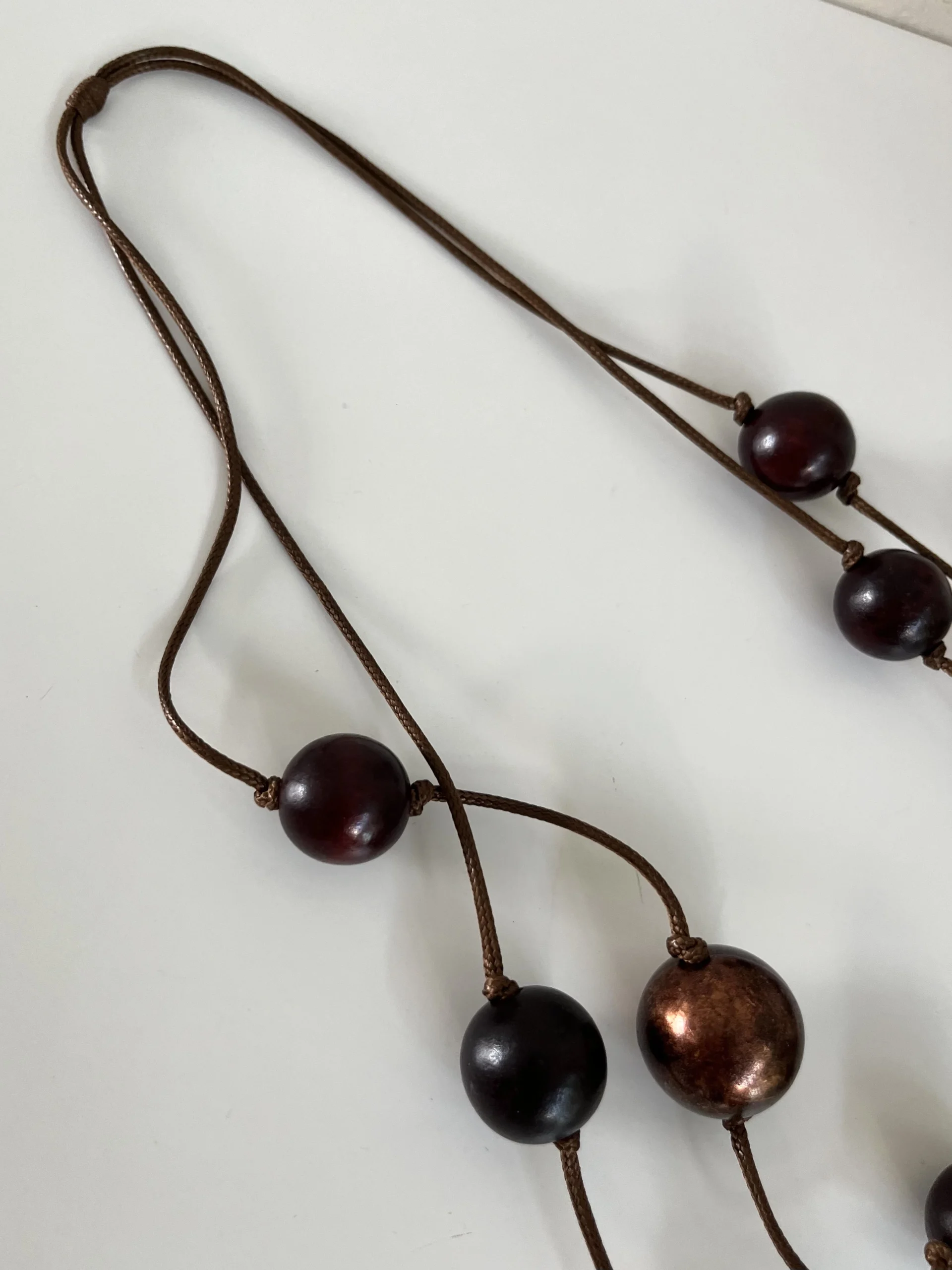 Collar con cordón marrón y bolas en tonos bronce, dorado y oscuro.