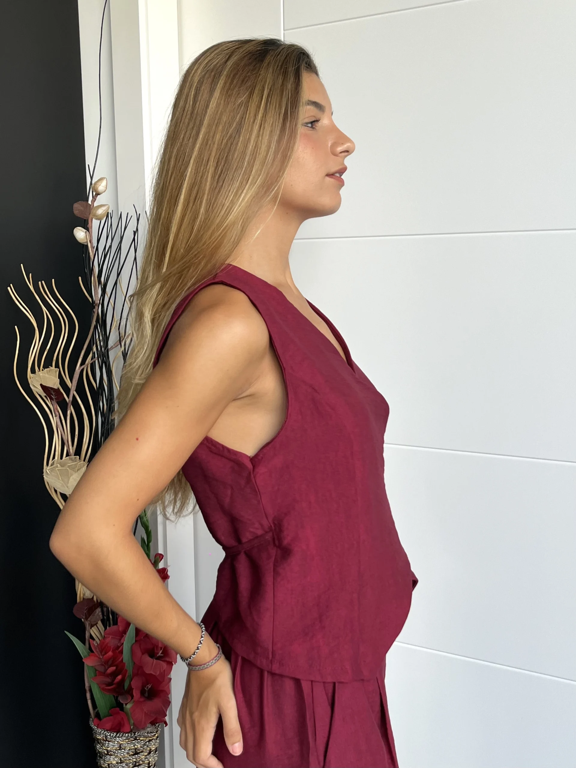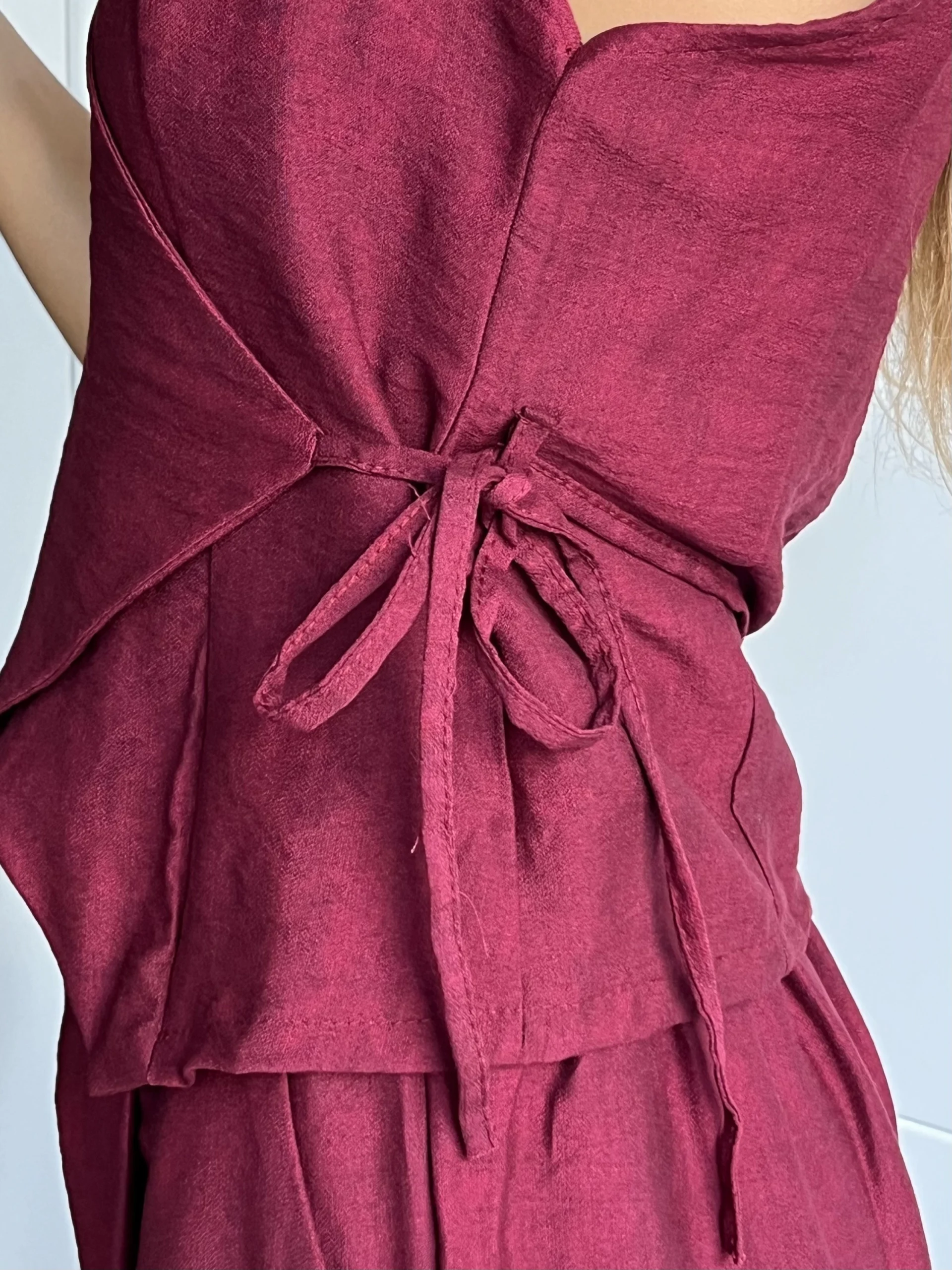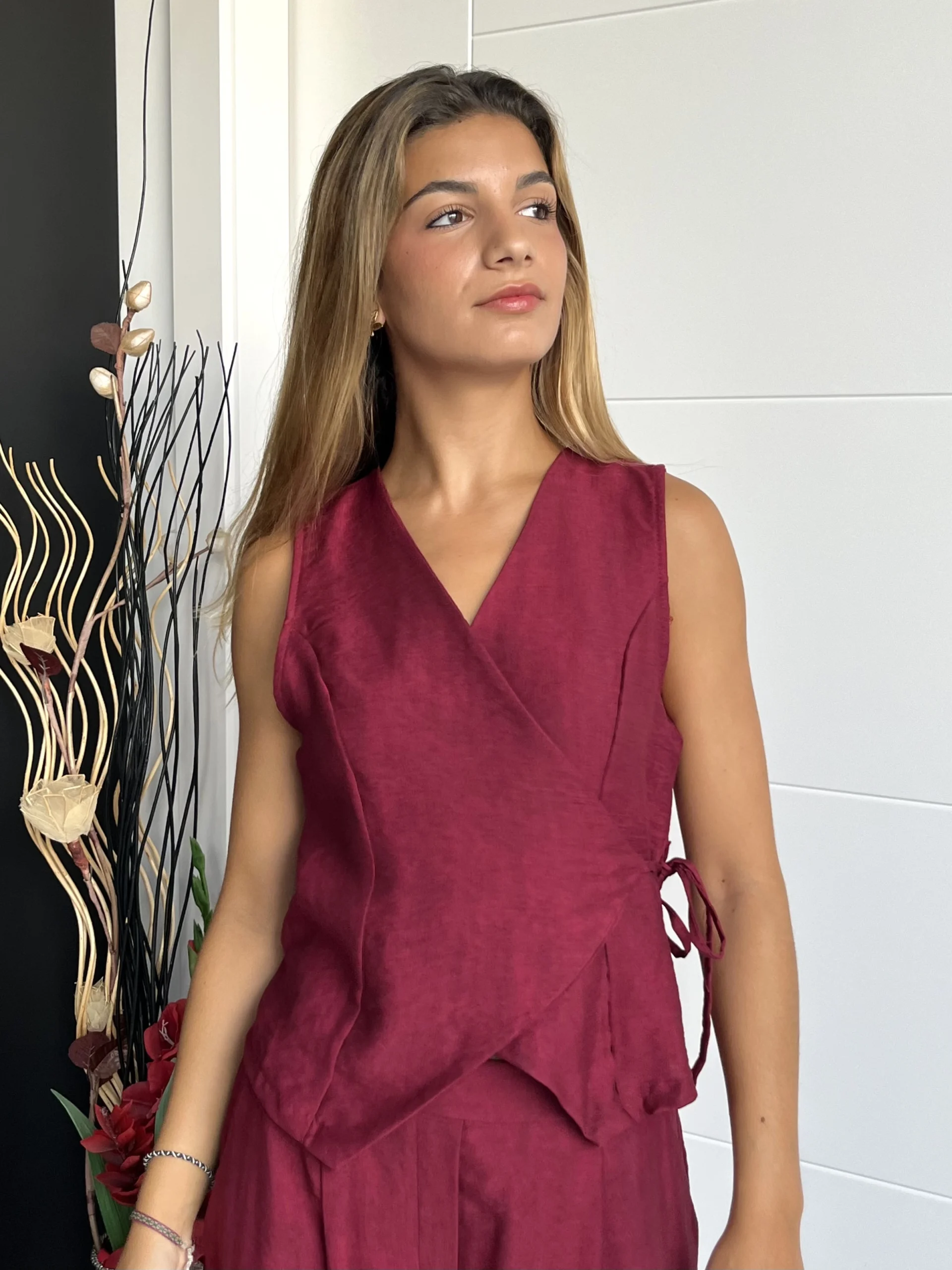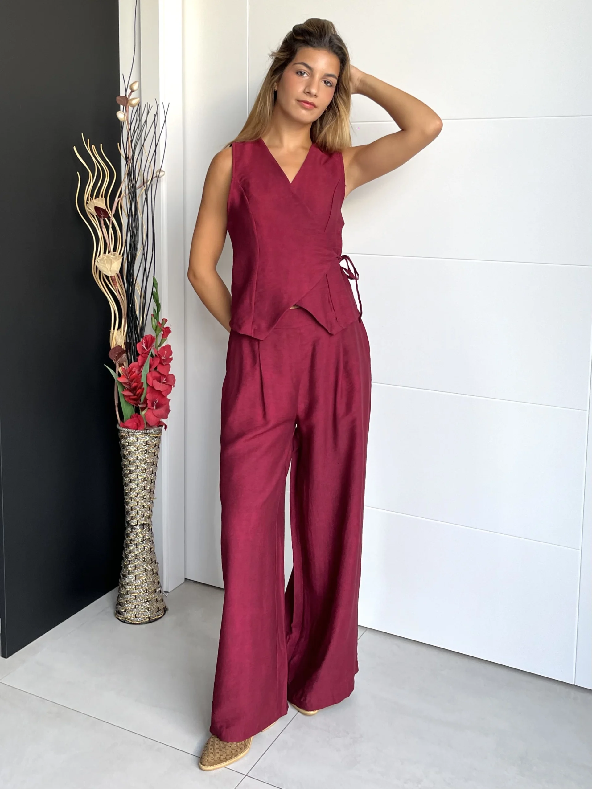 Top de tirantes cruzado con lazada en el lateral. Pantalón con pernera ancha, bolsillos en los laterales y goma elástica en la parte trasera de la cintura.