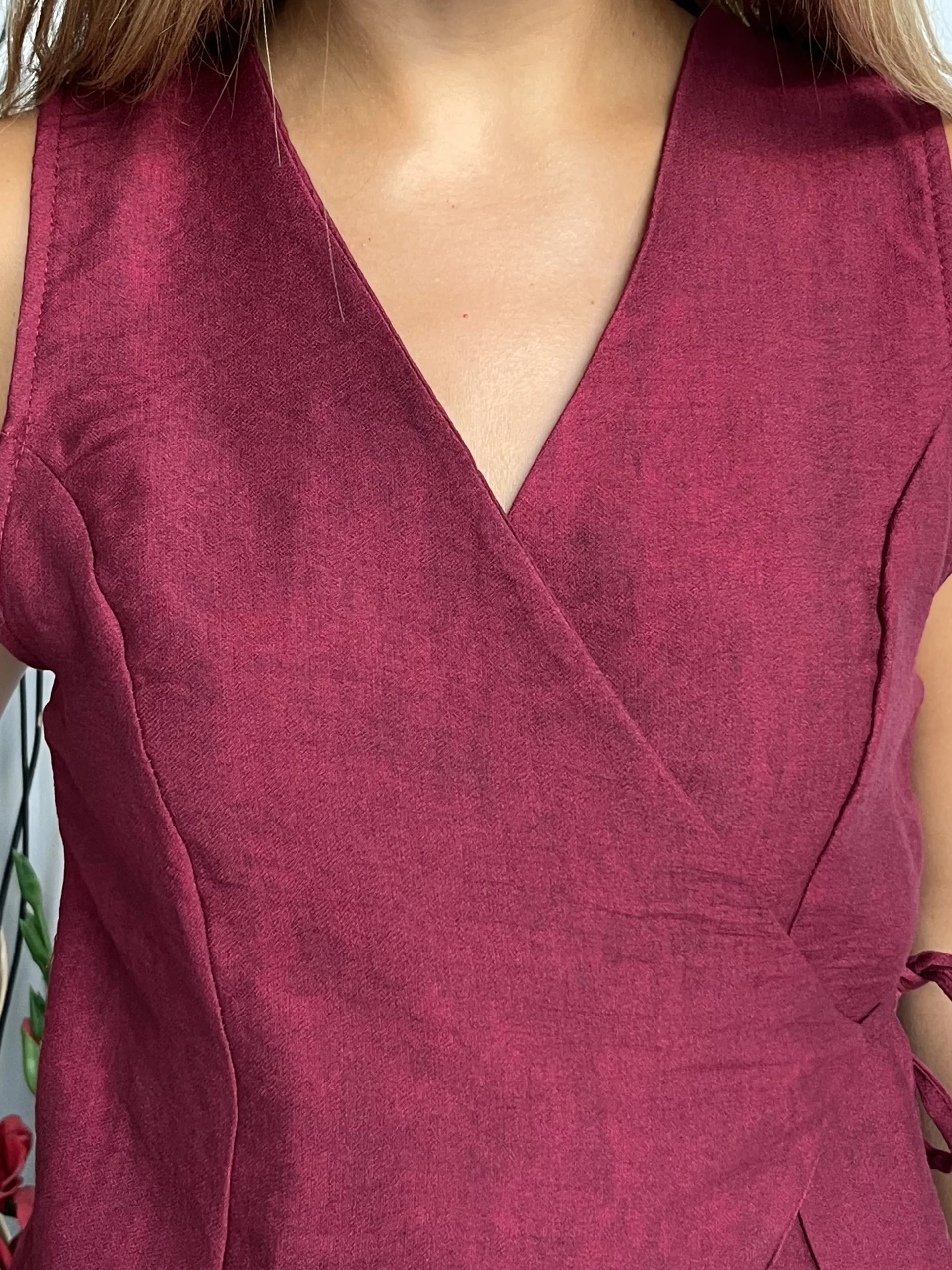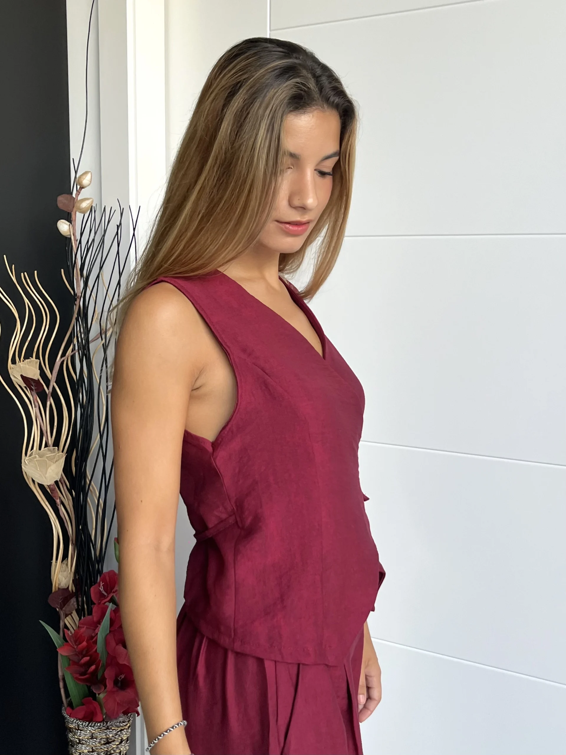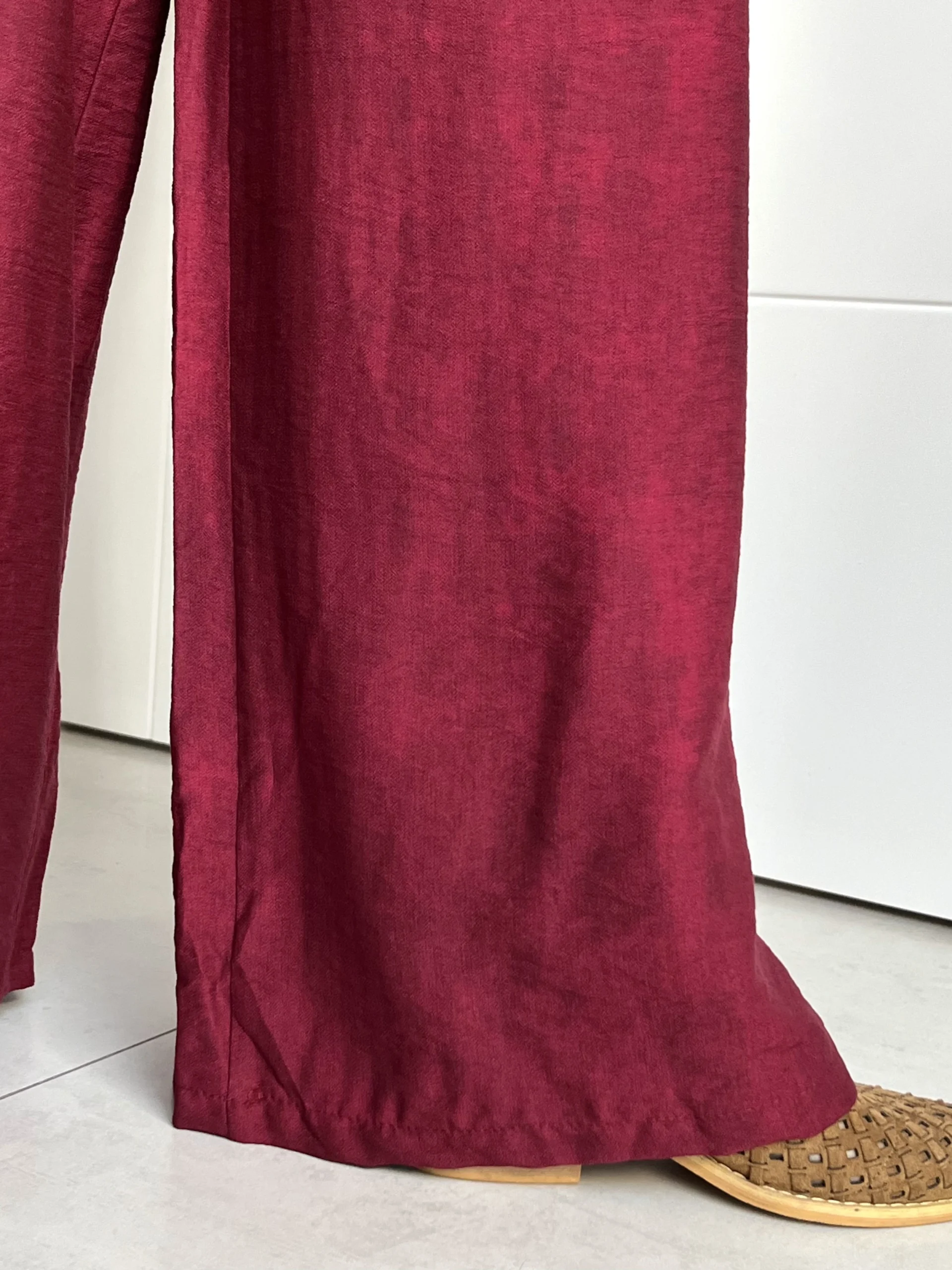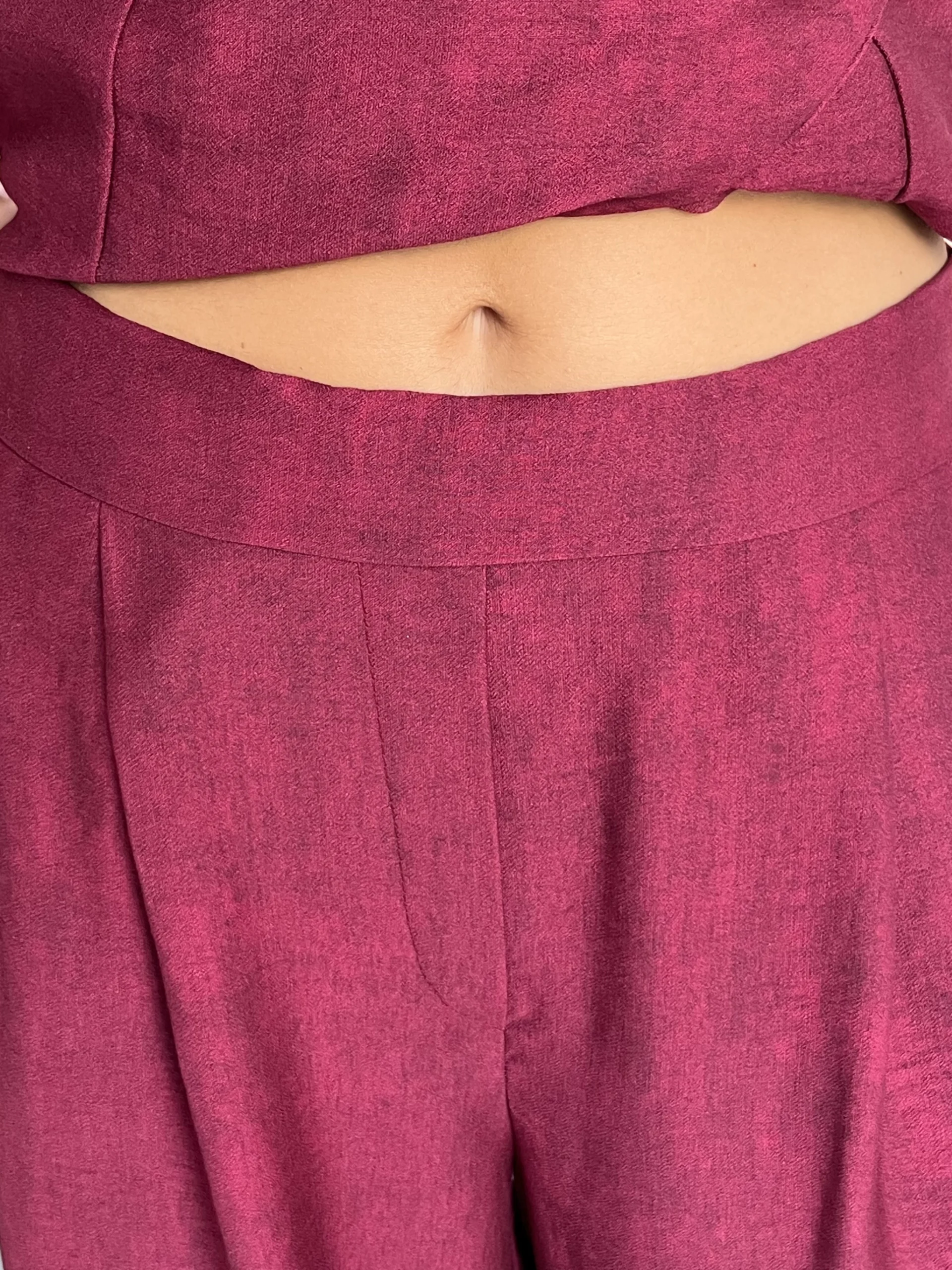 Top de tirantes cruzado con lazada en el lateral. Pantalón con pernera ancha, bolsillos en los laterales y goma elástica en la parte trasera de la cintura.