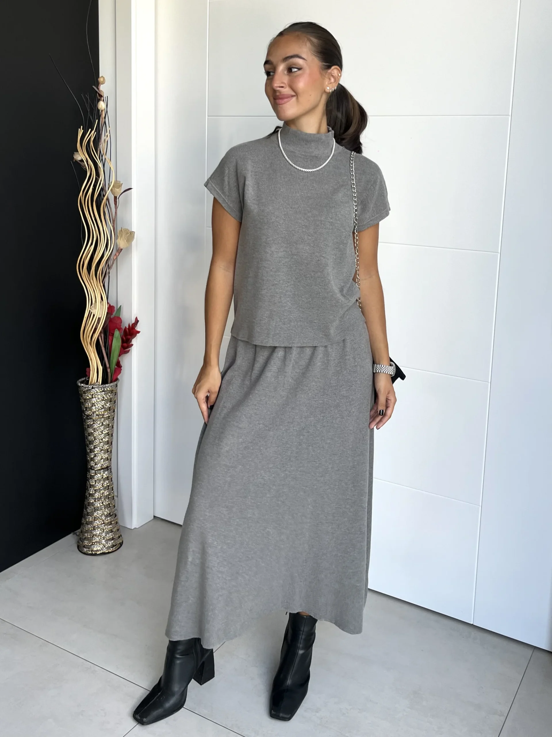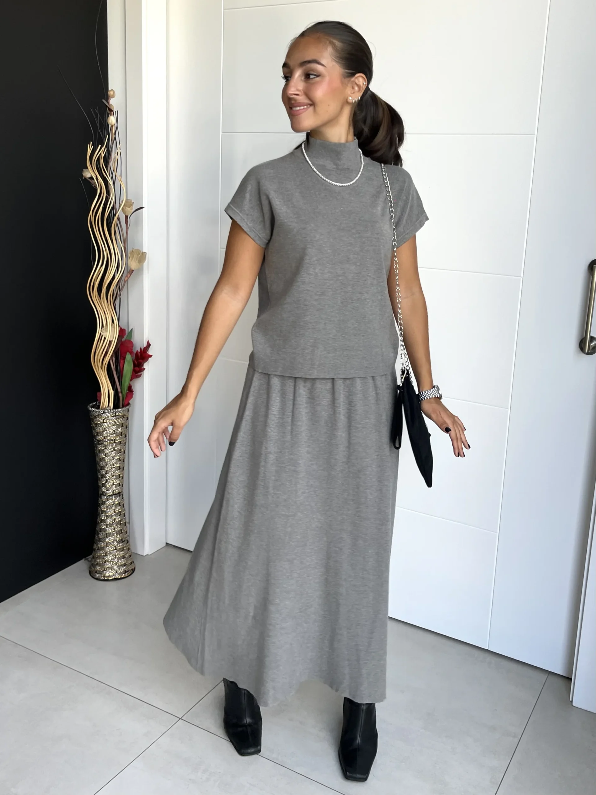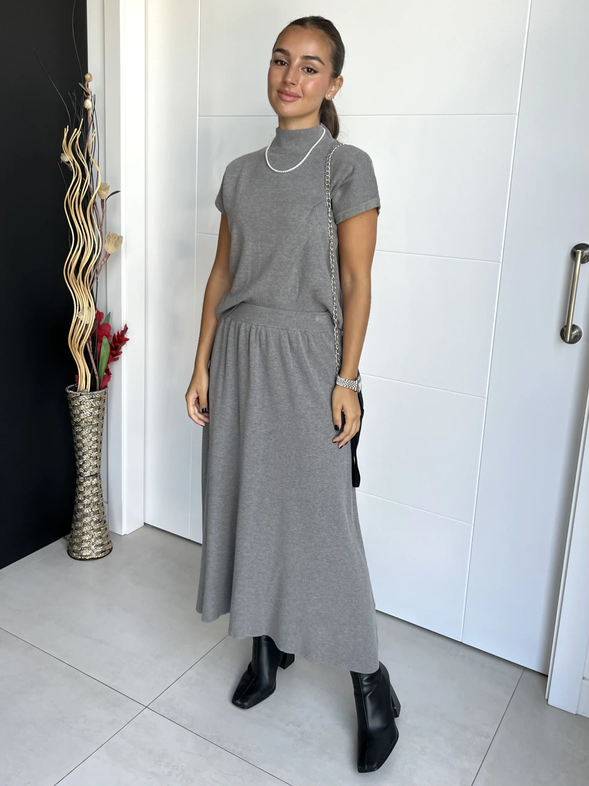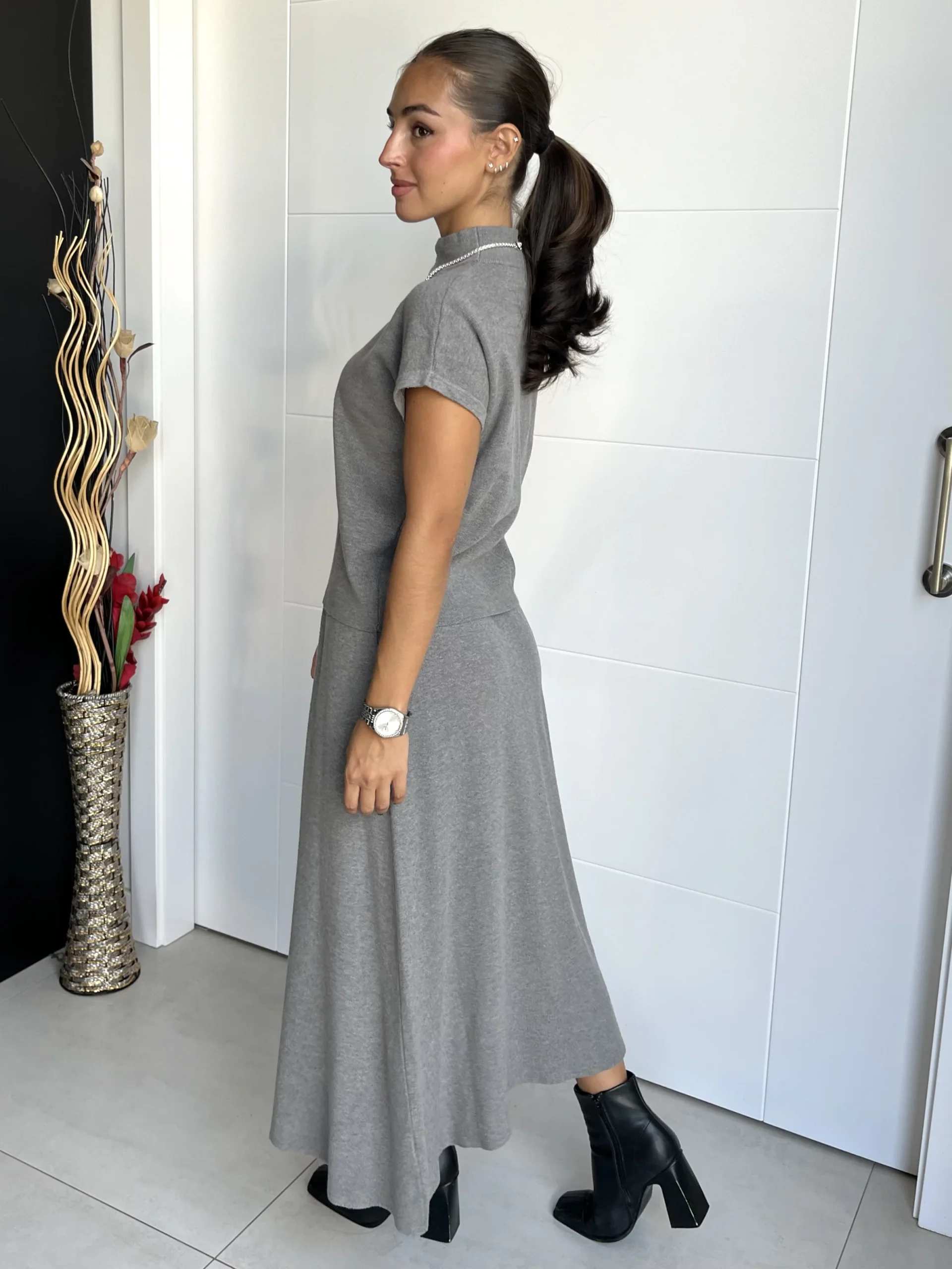 Top de manga corta y cuello perkins. Falda midi acampanada con goma elástica en la cintura.