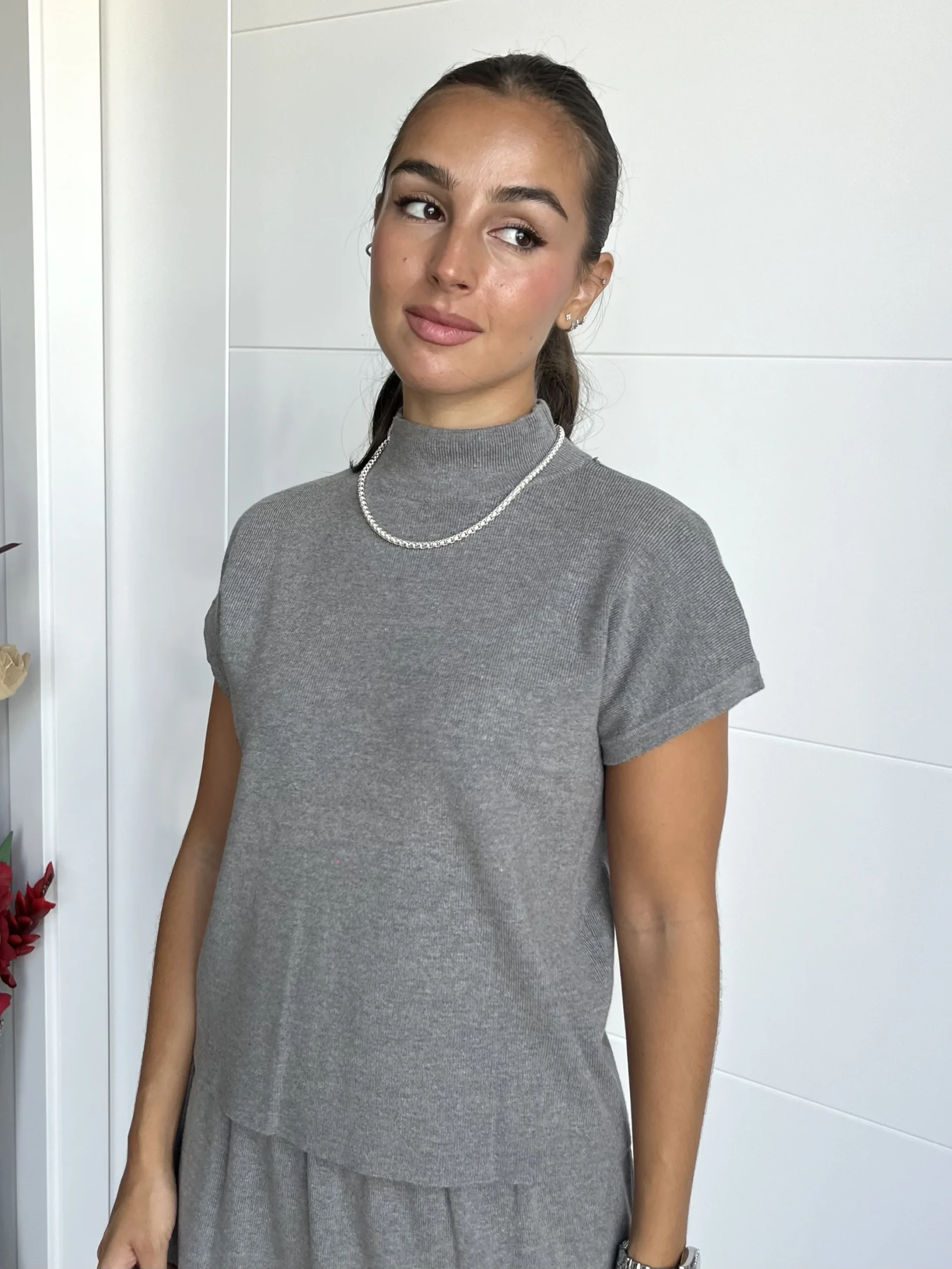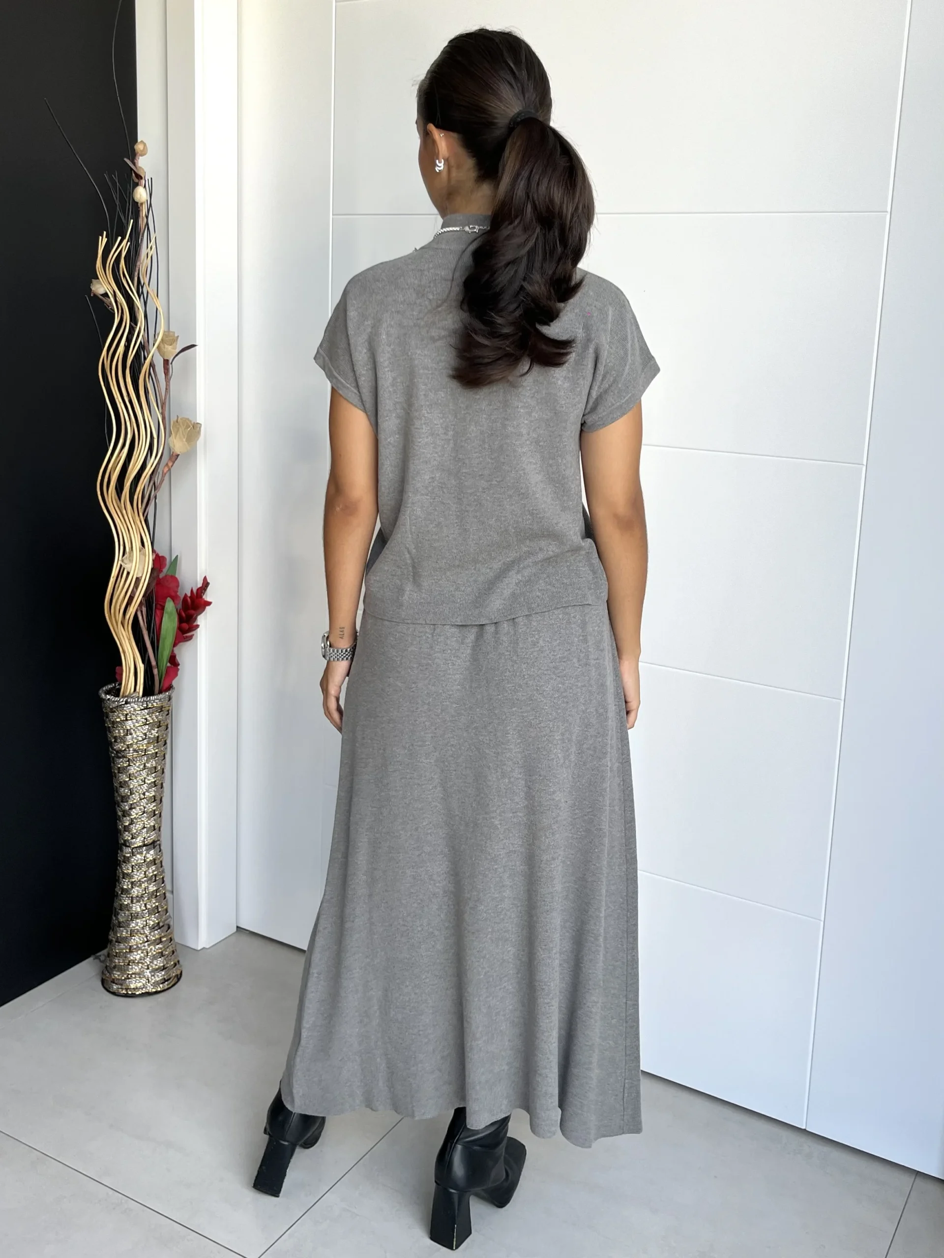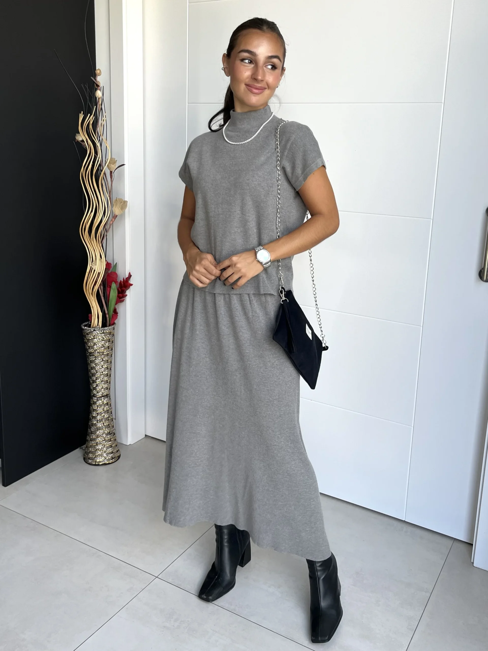Top de manga corta y cuello perkins. Falda midi acampanada con goma elástica en la cintura.