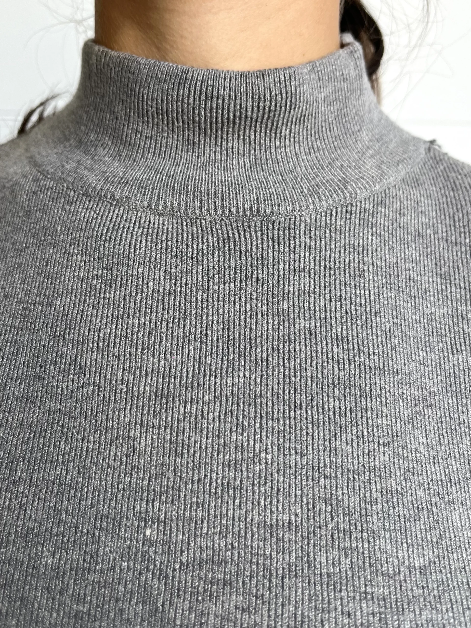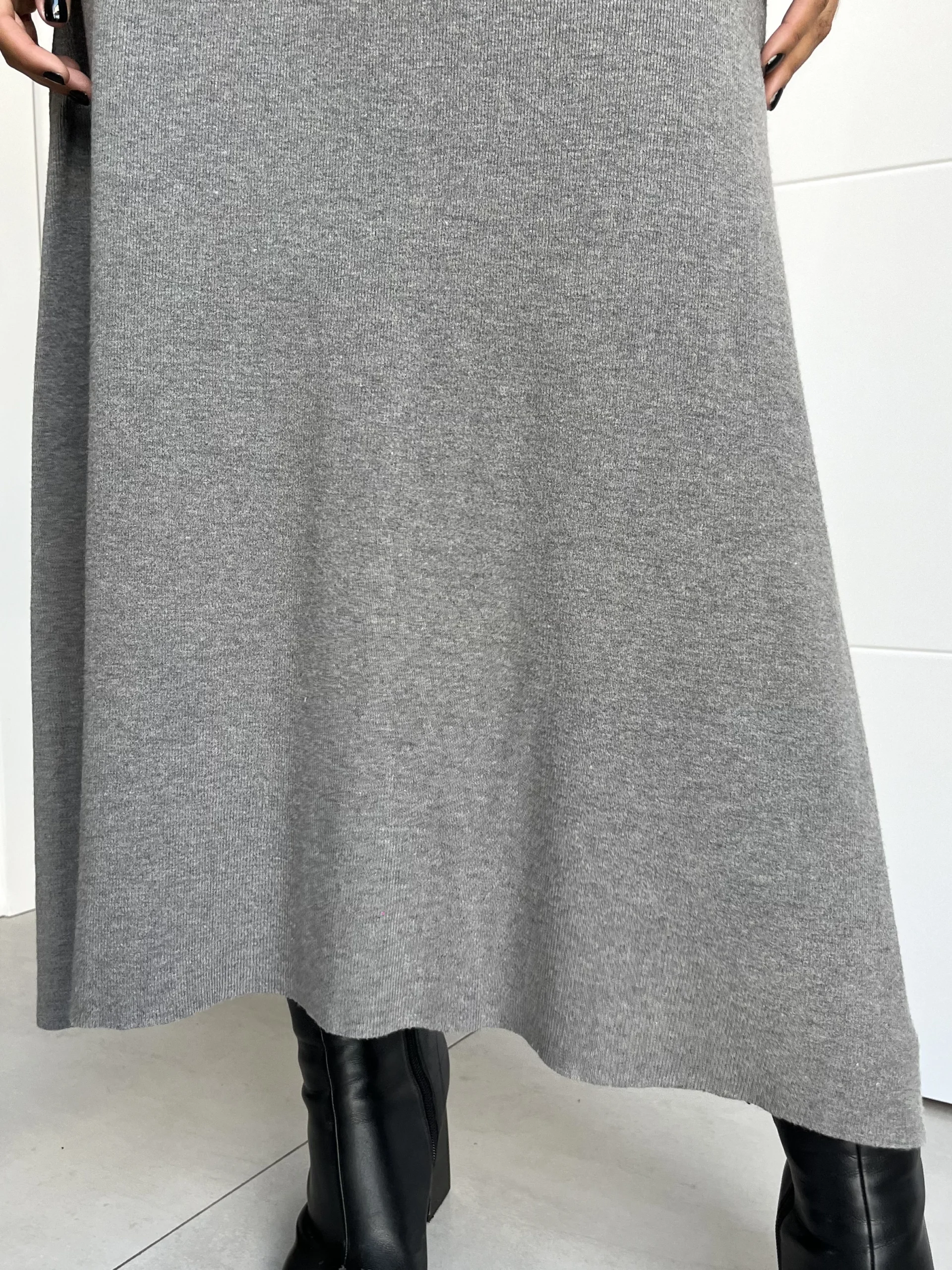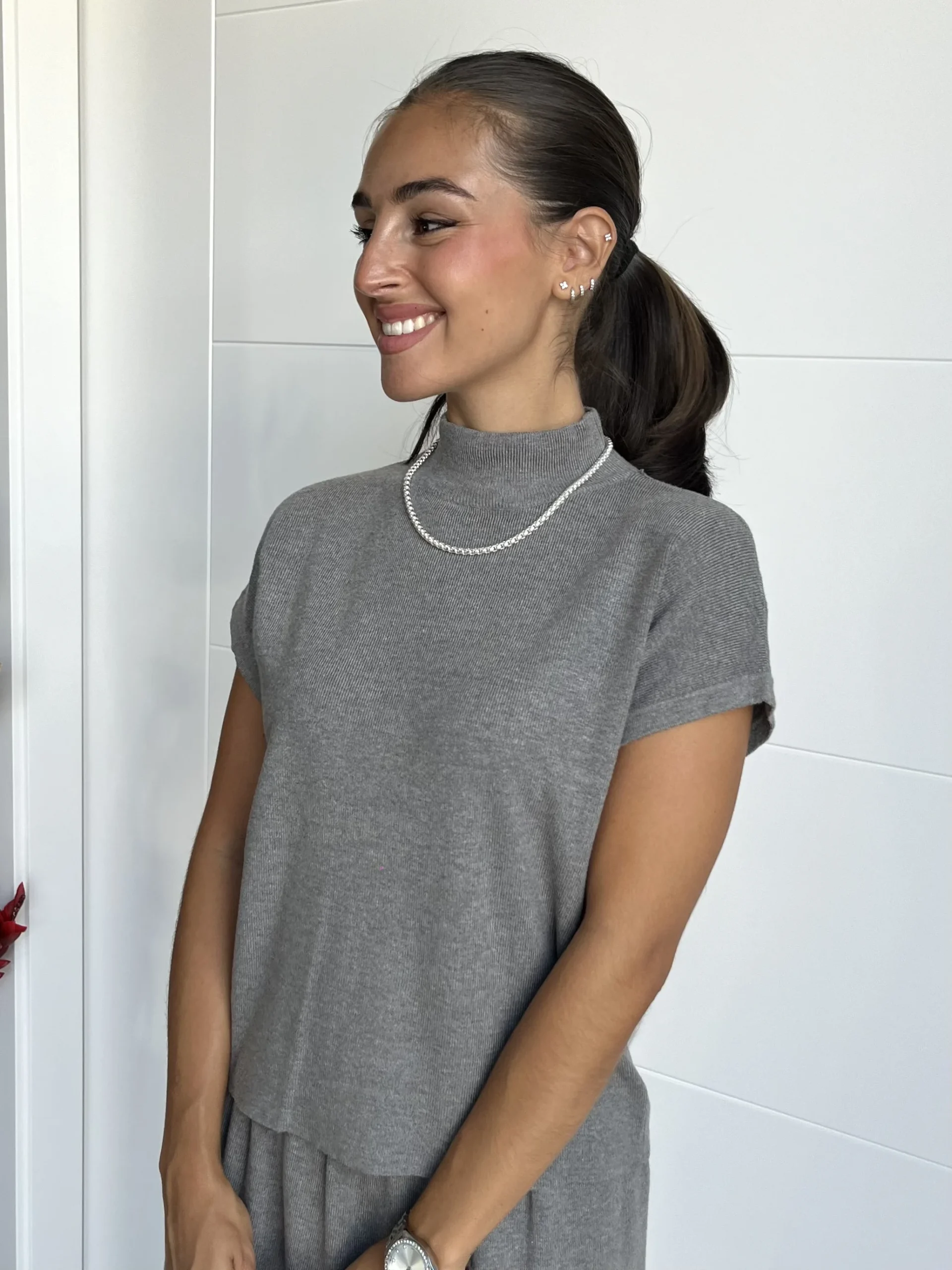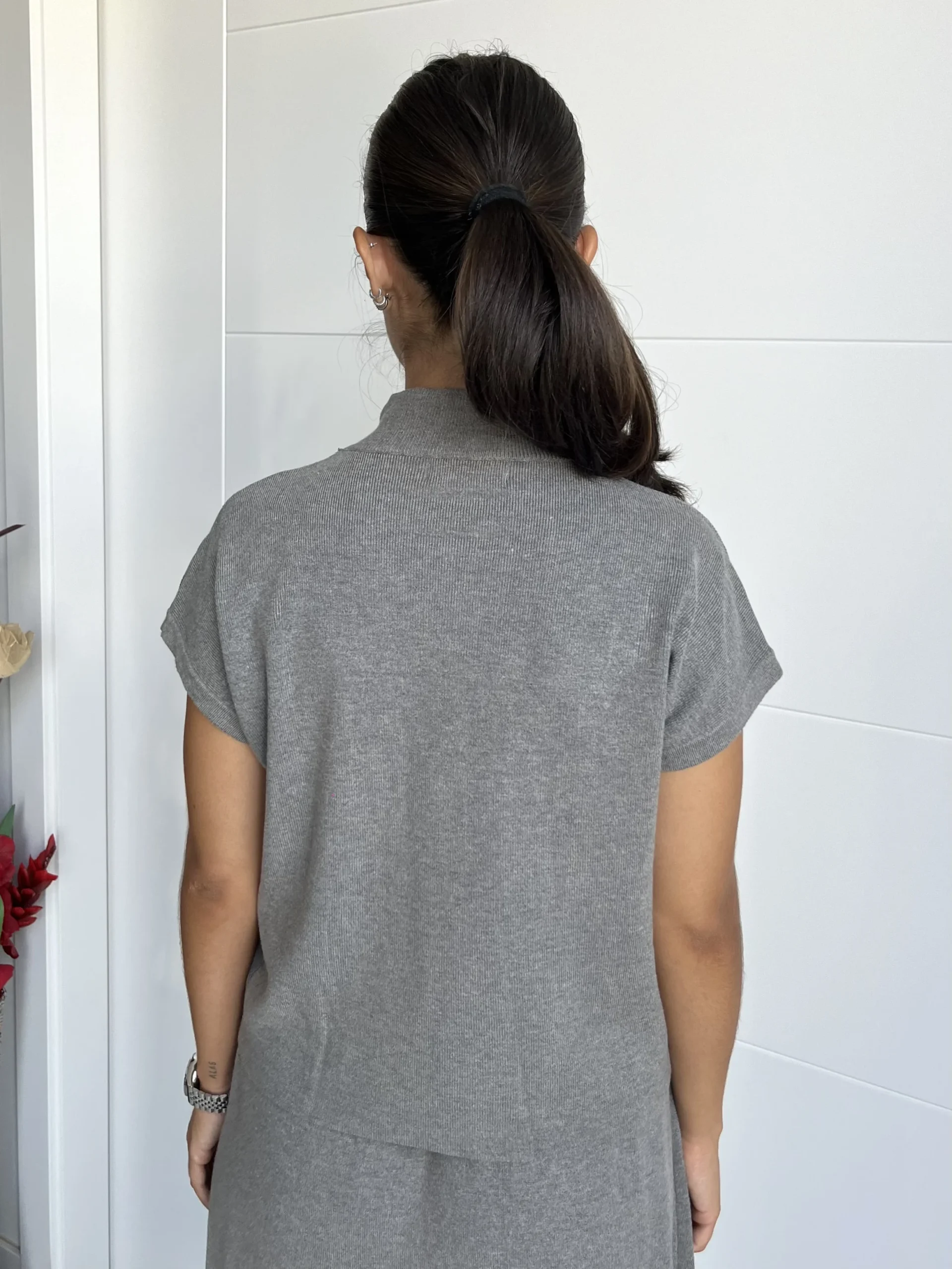 Top de manga corta y cuello perkins. Falda midi acampanada con goma elástica en la cintura.