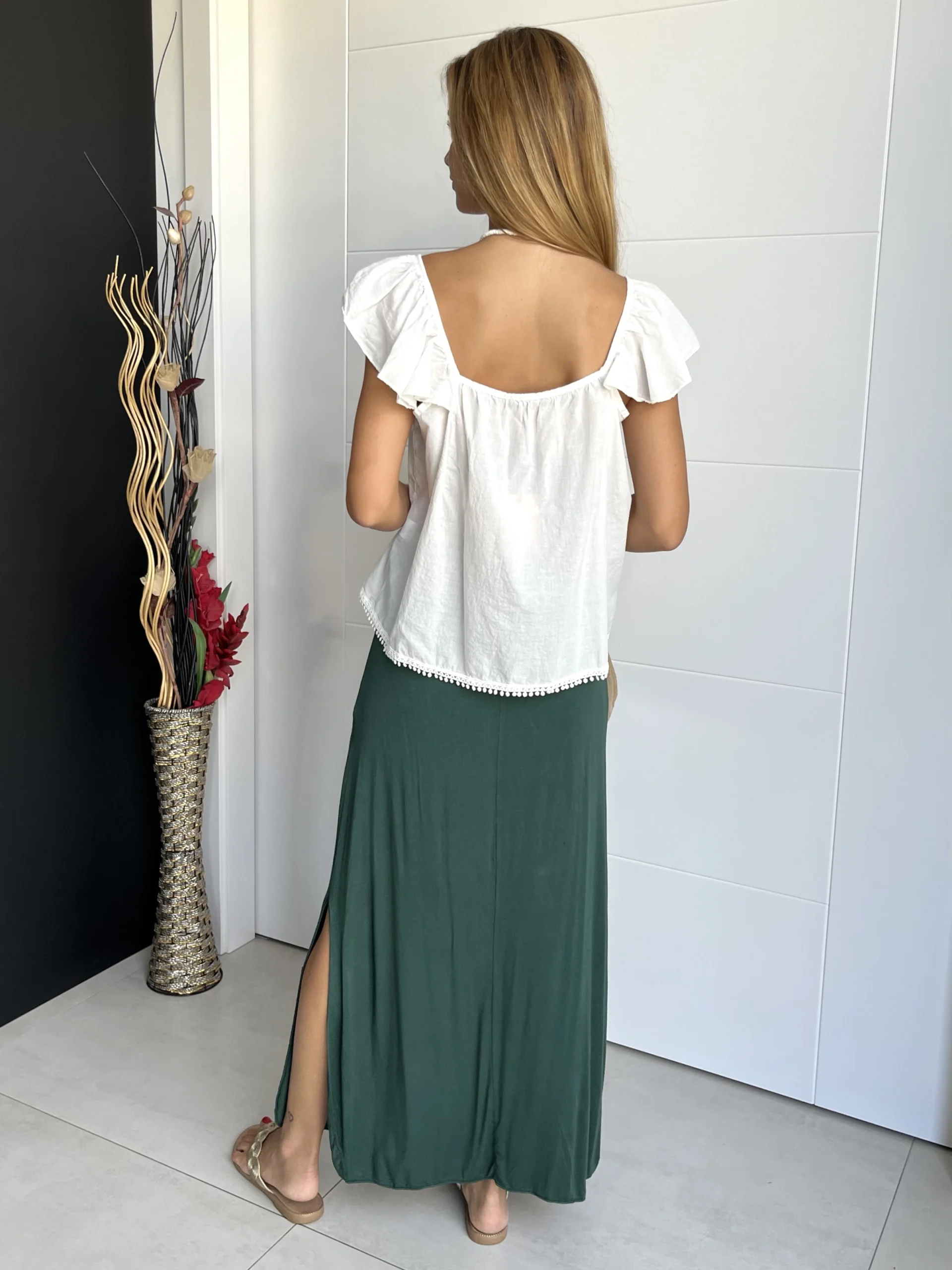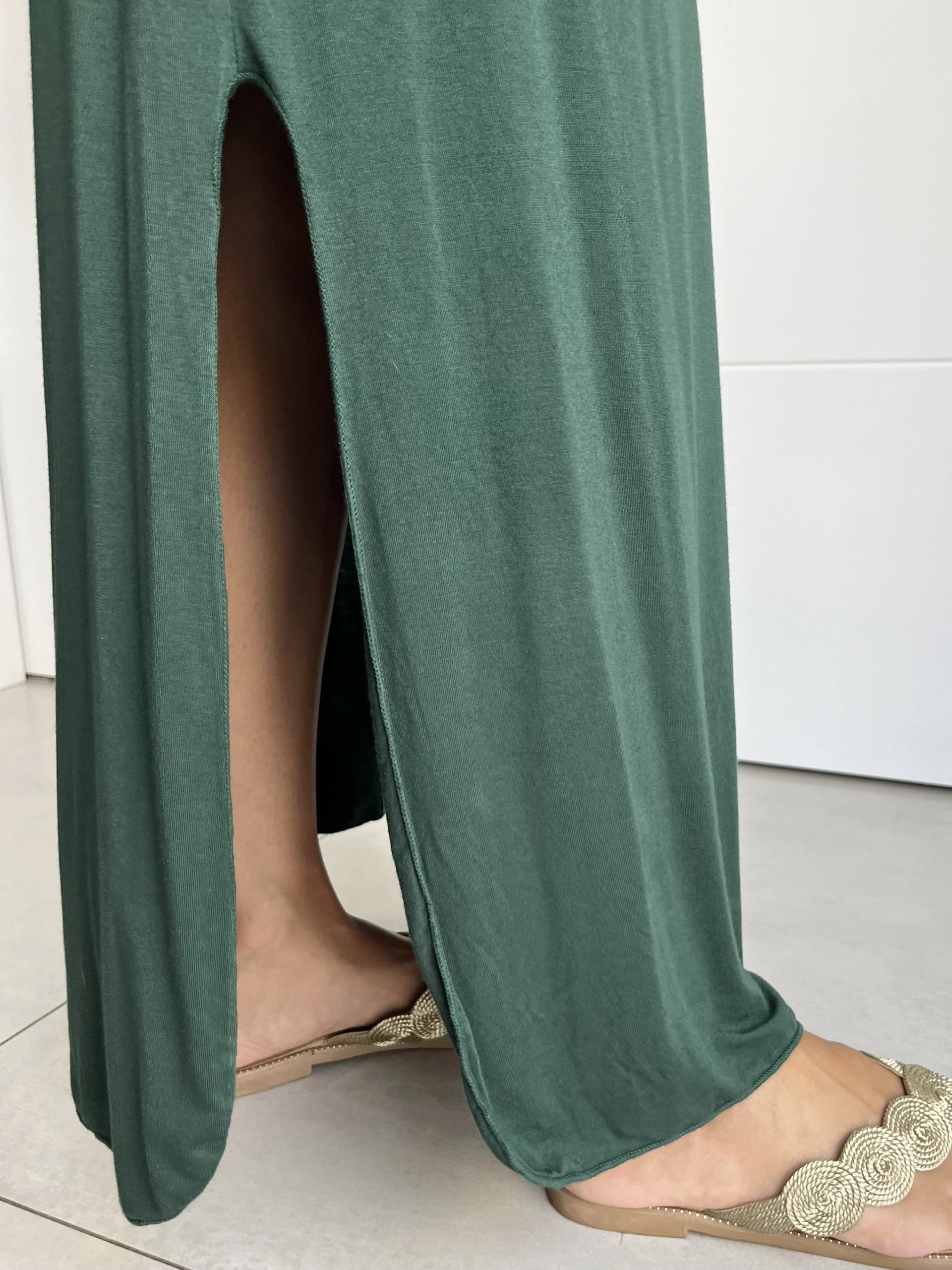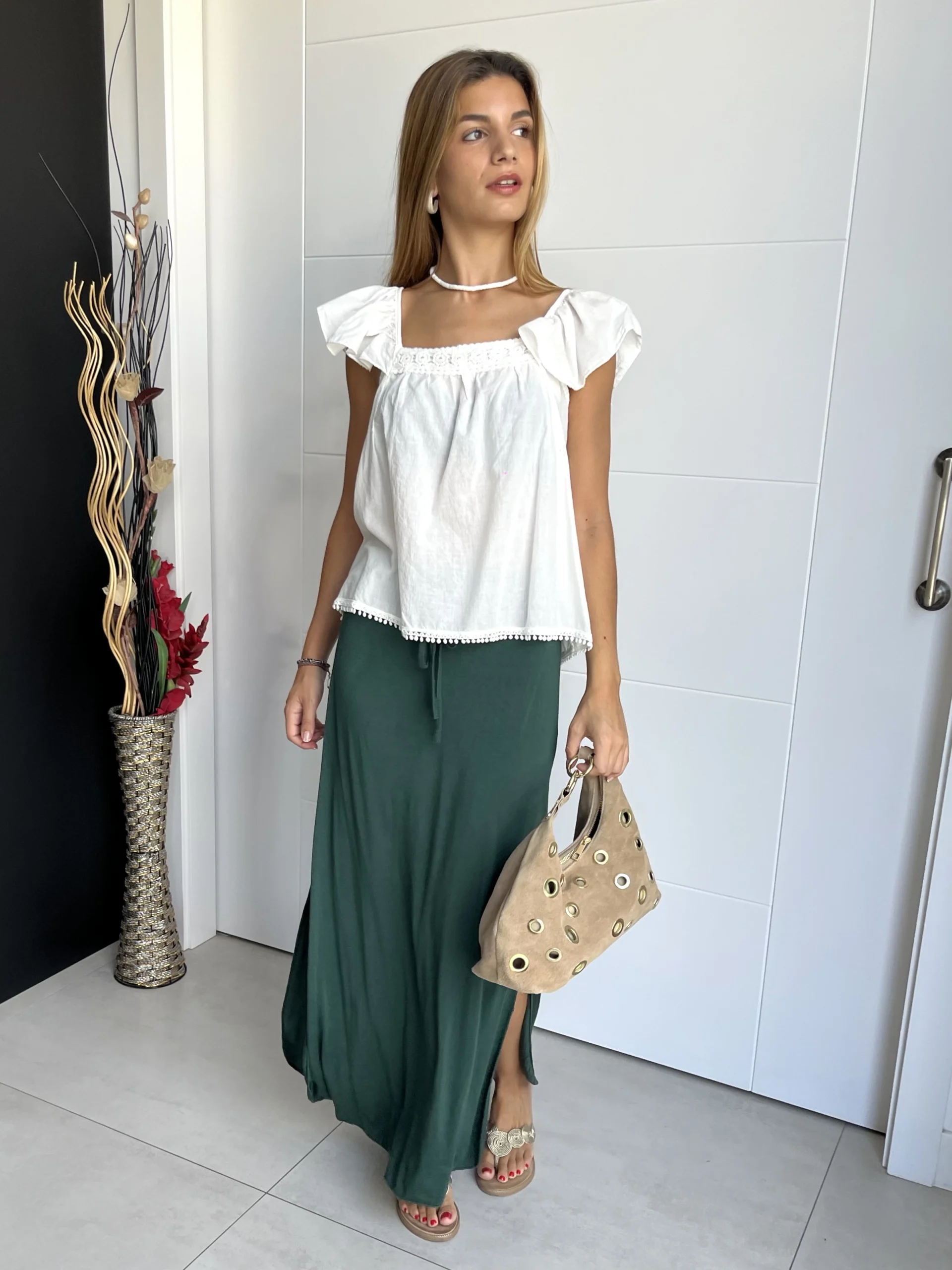 Falda midi elástica en color verde botella, con caída evasé y cintura elástica con goma. Abertturas en los laterales y cordón en la cintura.