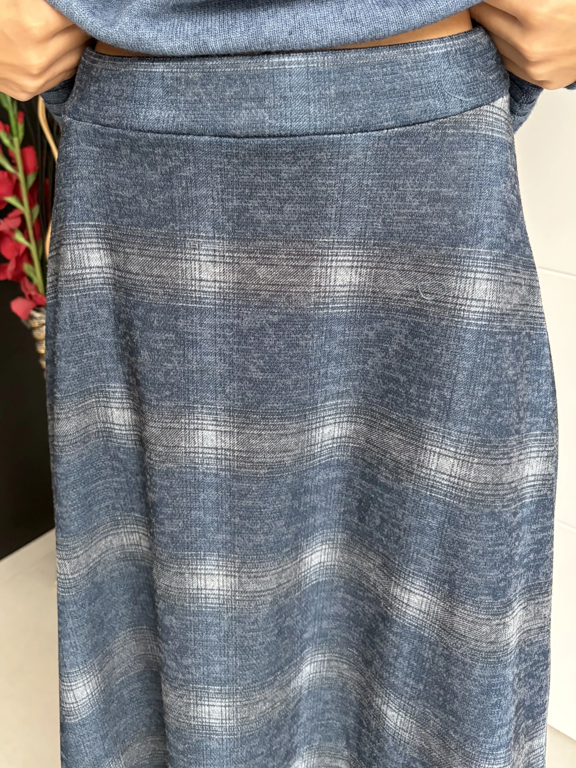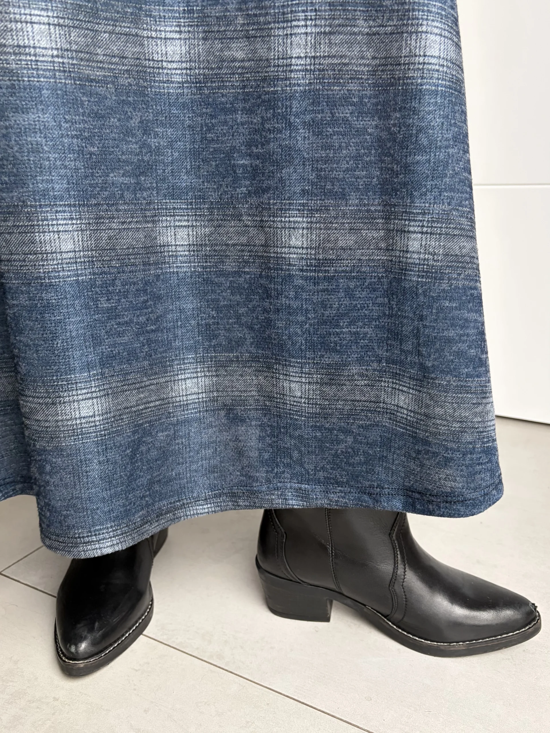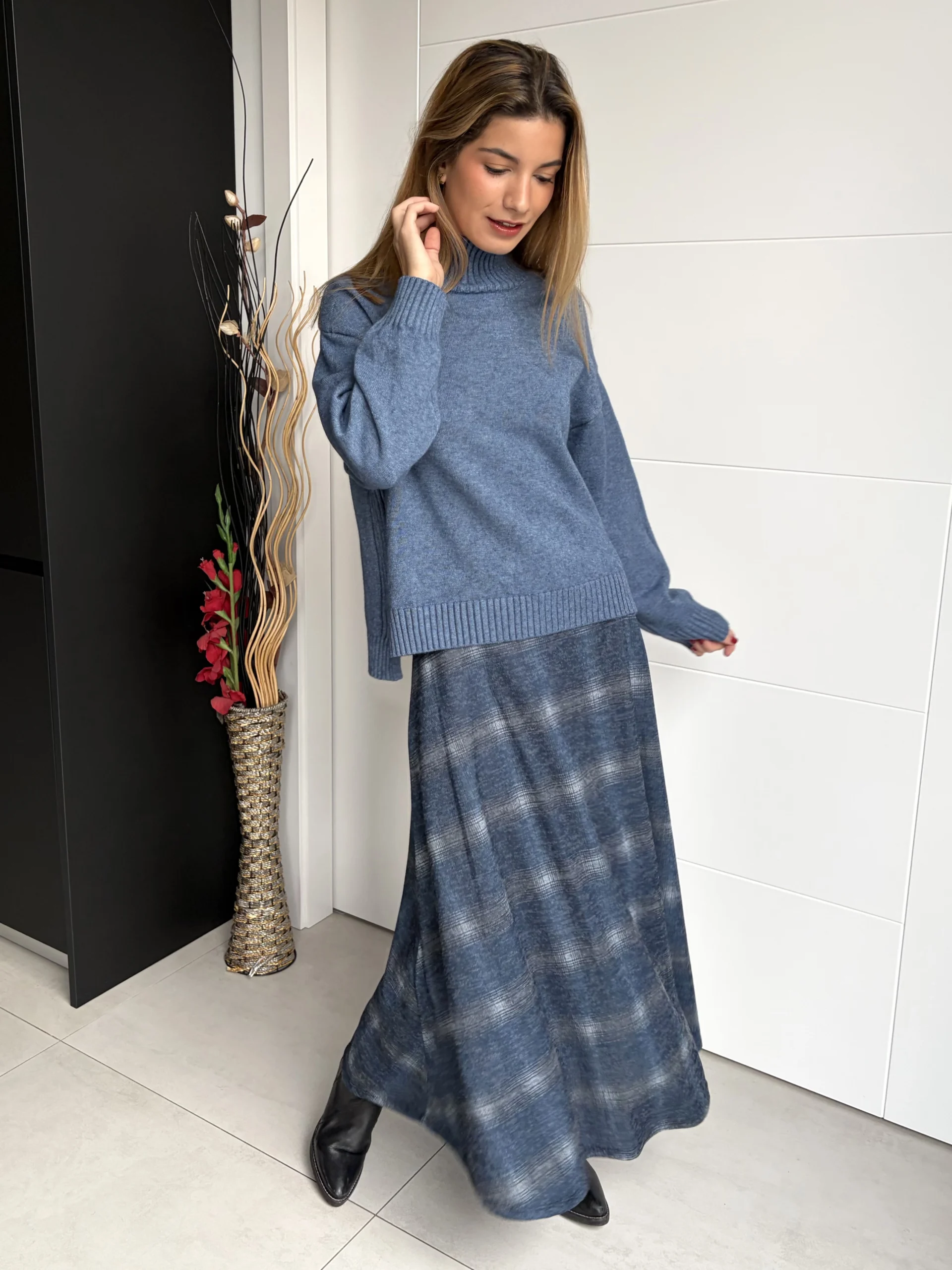 Falda larga azul con estampado de cuadros difuminados en blanco. Caída evasé, acabado acampanado y goma elástica. Sin forro interior.