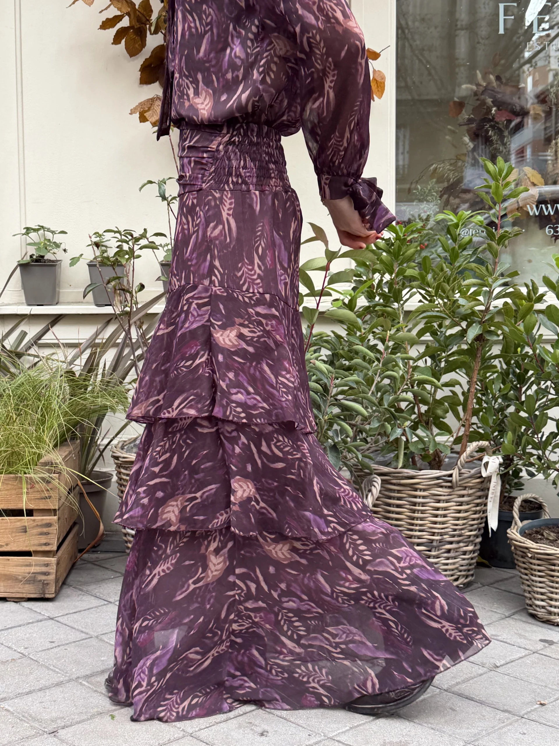 Falda Larga de Gasa en tonos granate con diseño vegetal y volantes asimétricos en niveles. Drapeada en cintura, tipo fajín, cómoda, silueta evasé y movimiento suave.