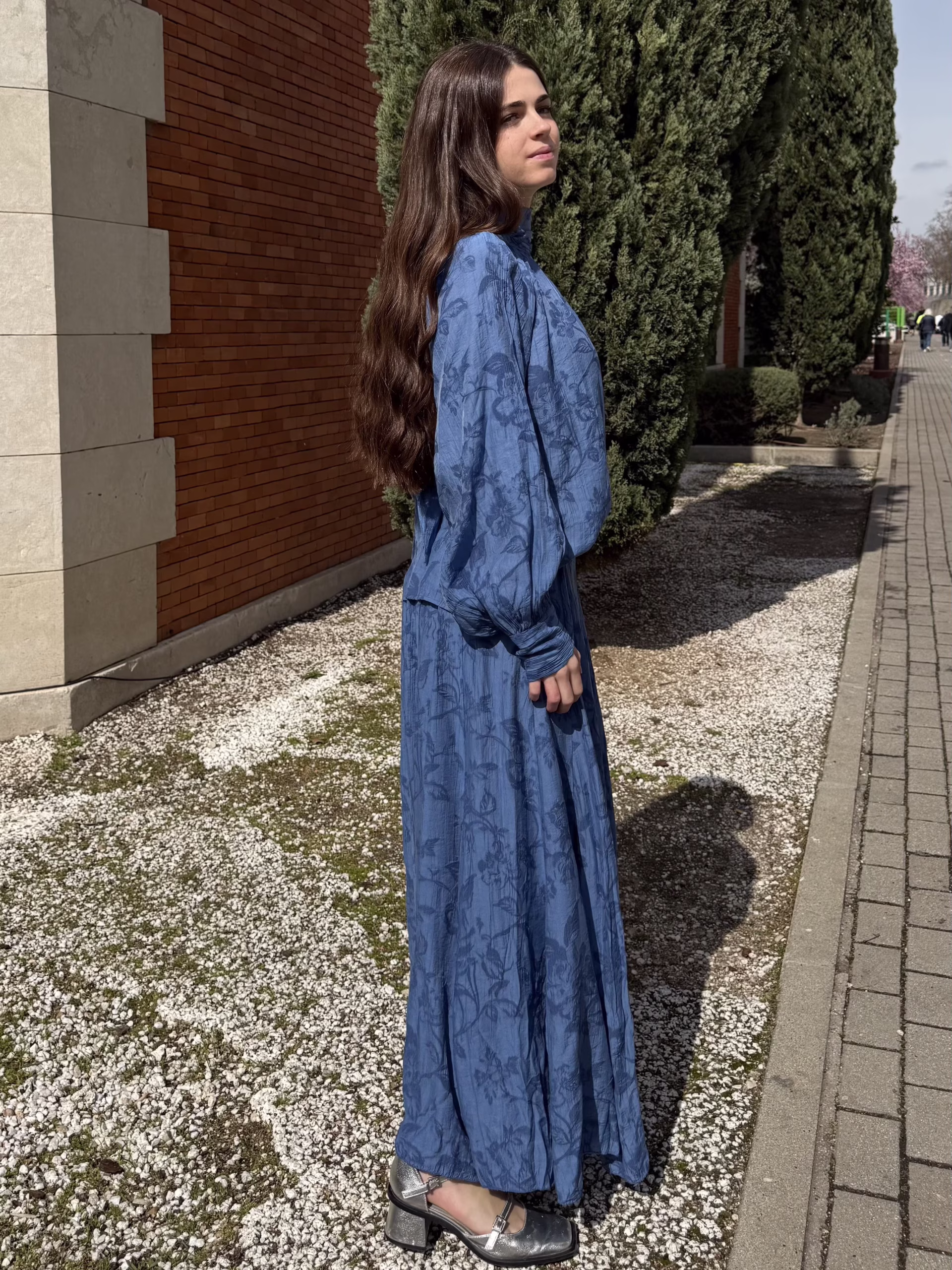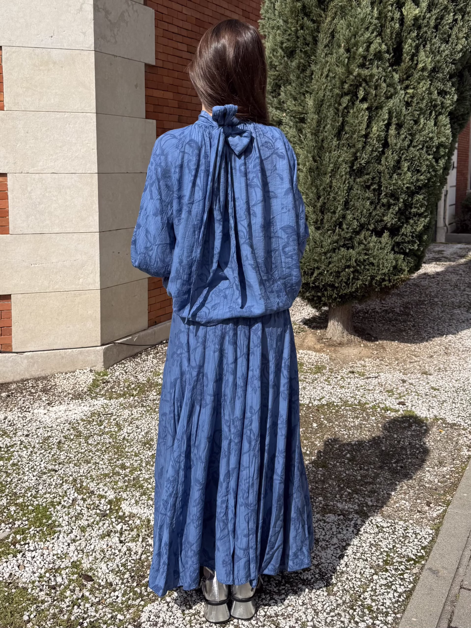 Falda larga en tono azul empolvado con bordado floral, de caída fluida y elegante. Cuenta con cintura elástica que se adapta cómodamente al cuerpo. Combina perfectamente con la Blusa Arándano Bordada Lazo para un look completo.