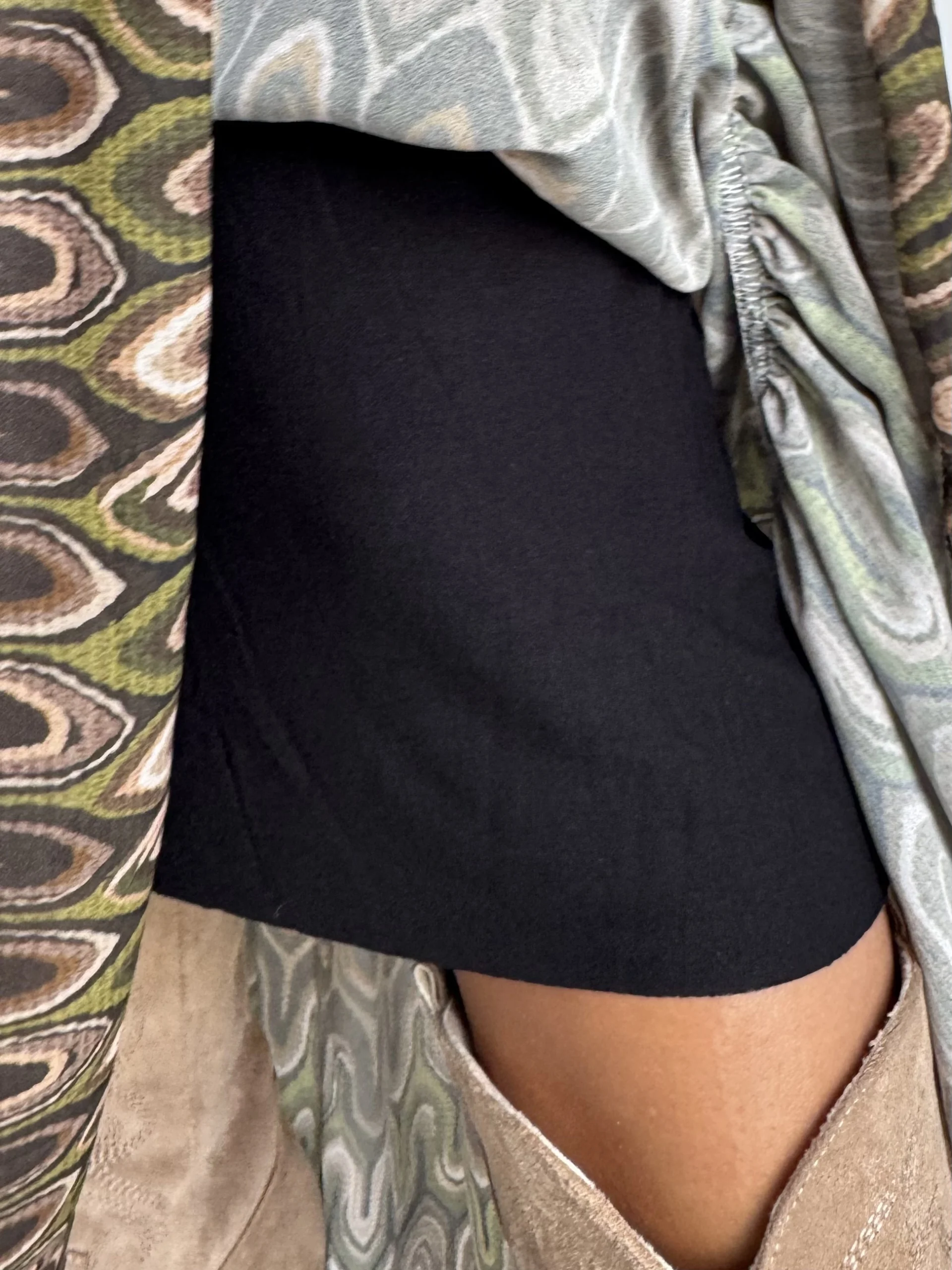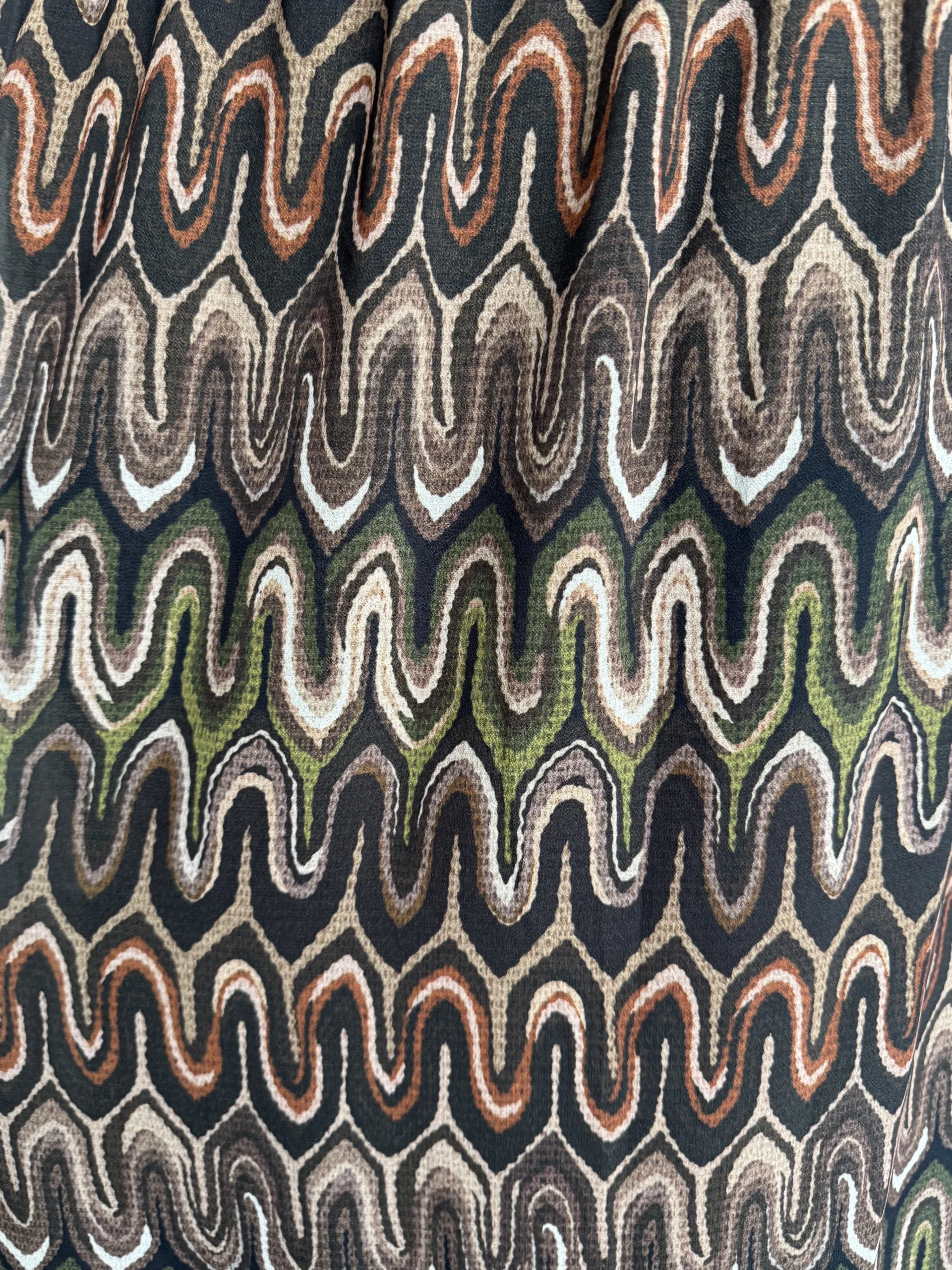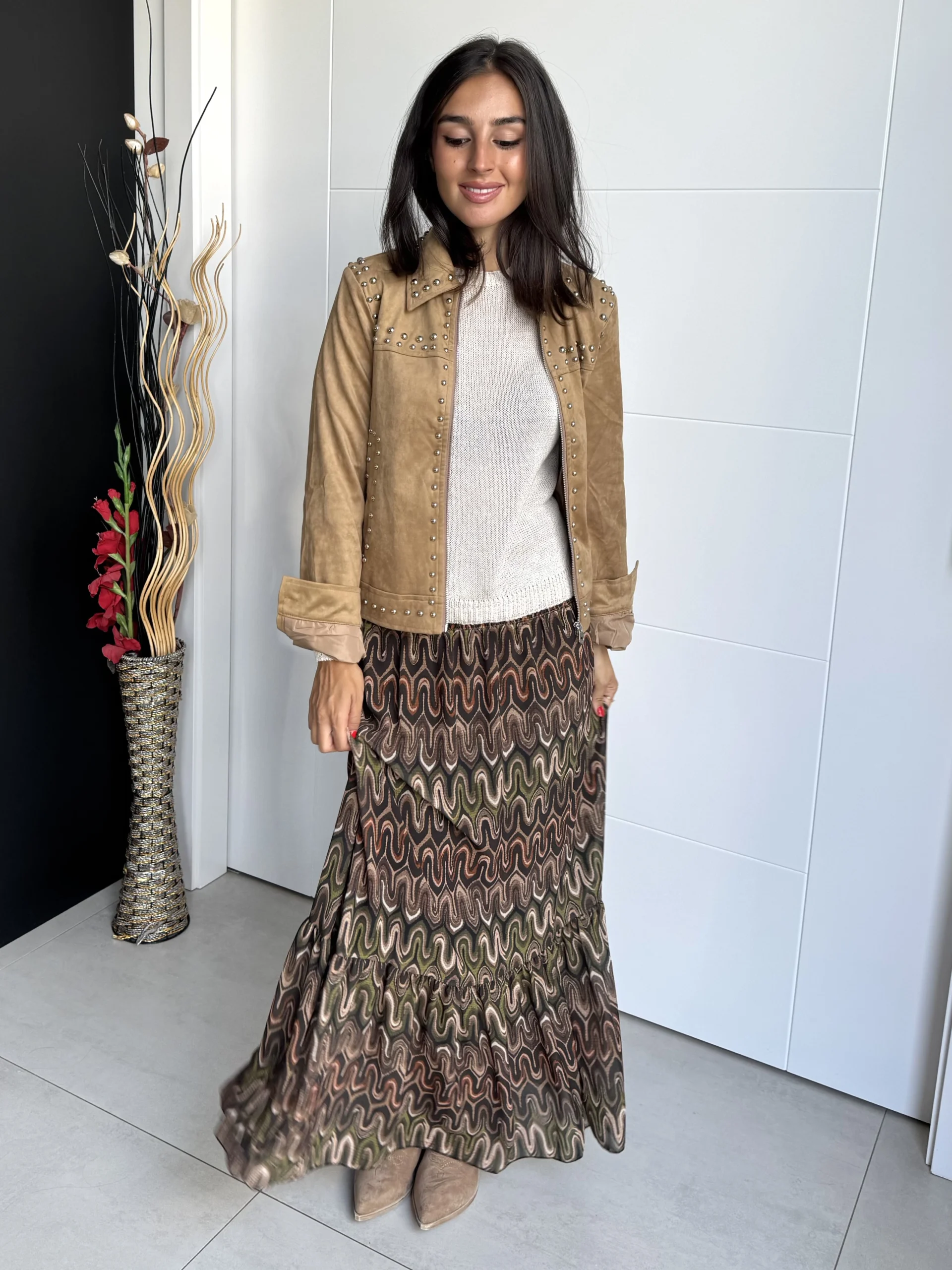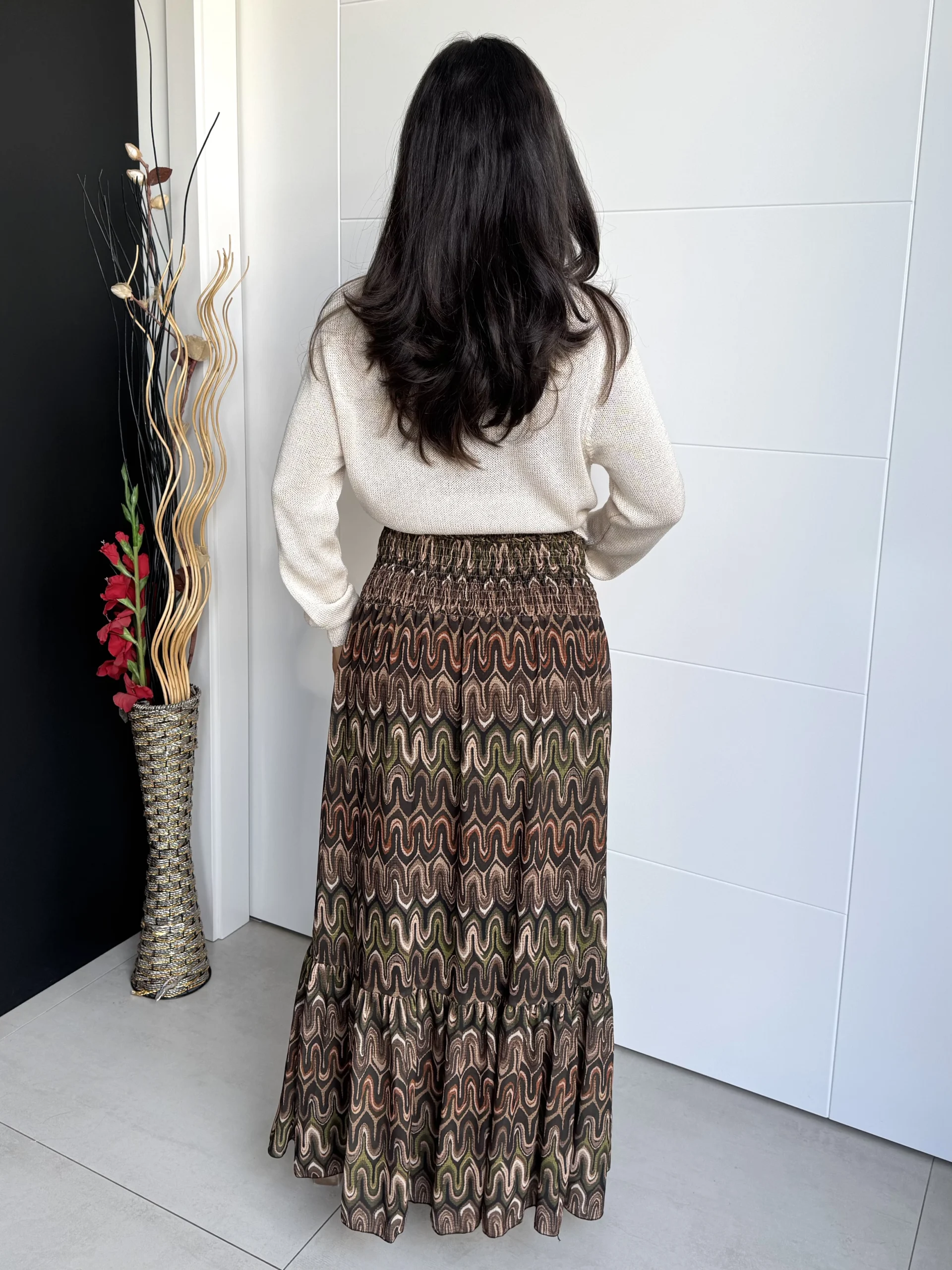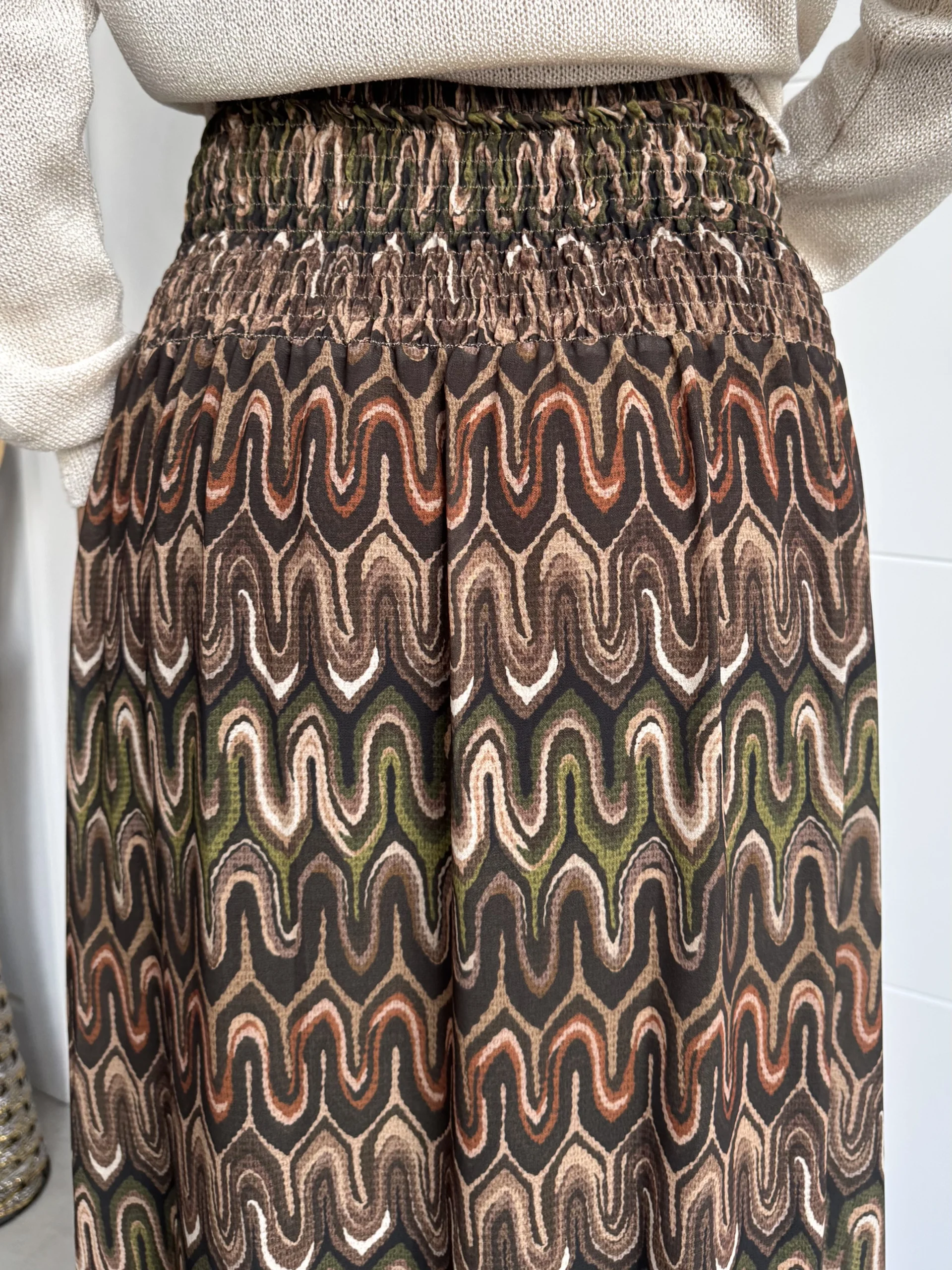 Falda larga estampada geométrica en tonos tierra, verdes y naranjas. Con cintura elástica tipo nido de abeja que se ajusta a la silueta y aporta comodidad. Su diseño ligero y con caída suave la convierte en la prenda perfecta para combinar con jerséis, blusas o camisetas, creando looks versátiles para el día a día o para ocasiones especiales.