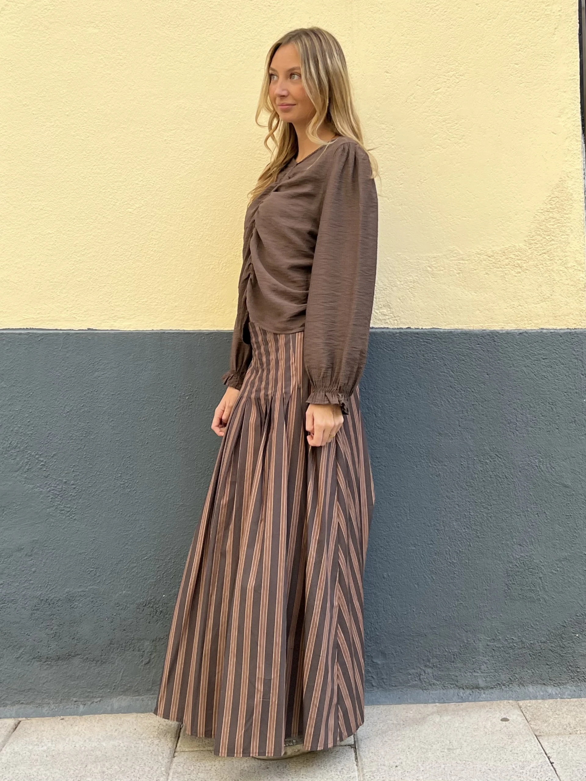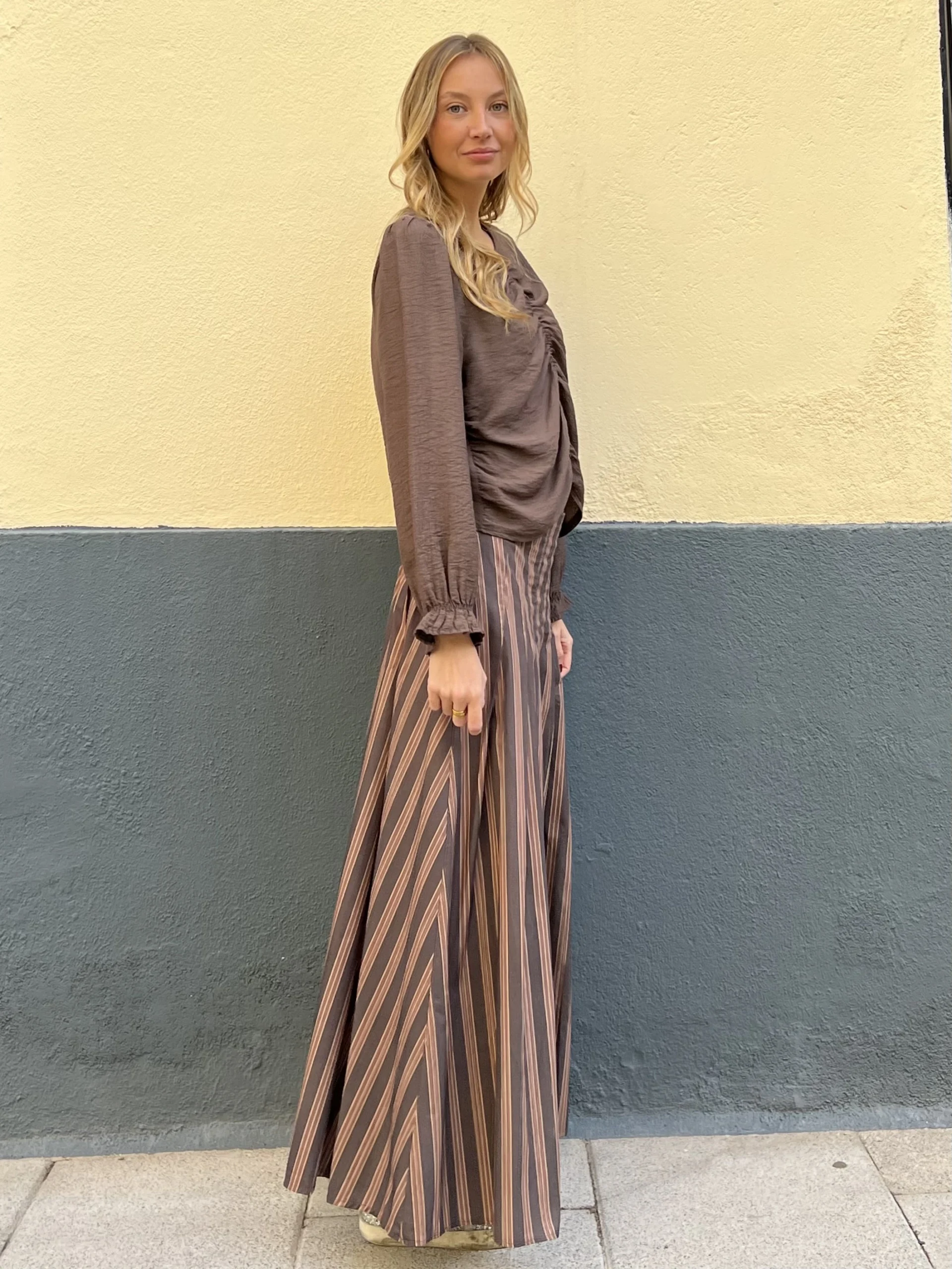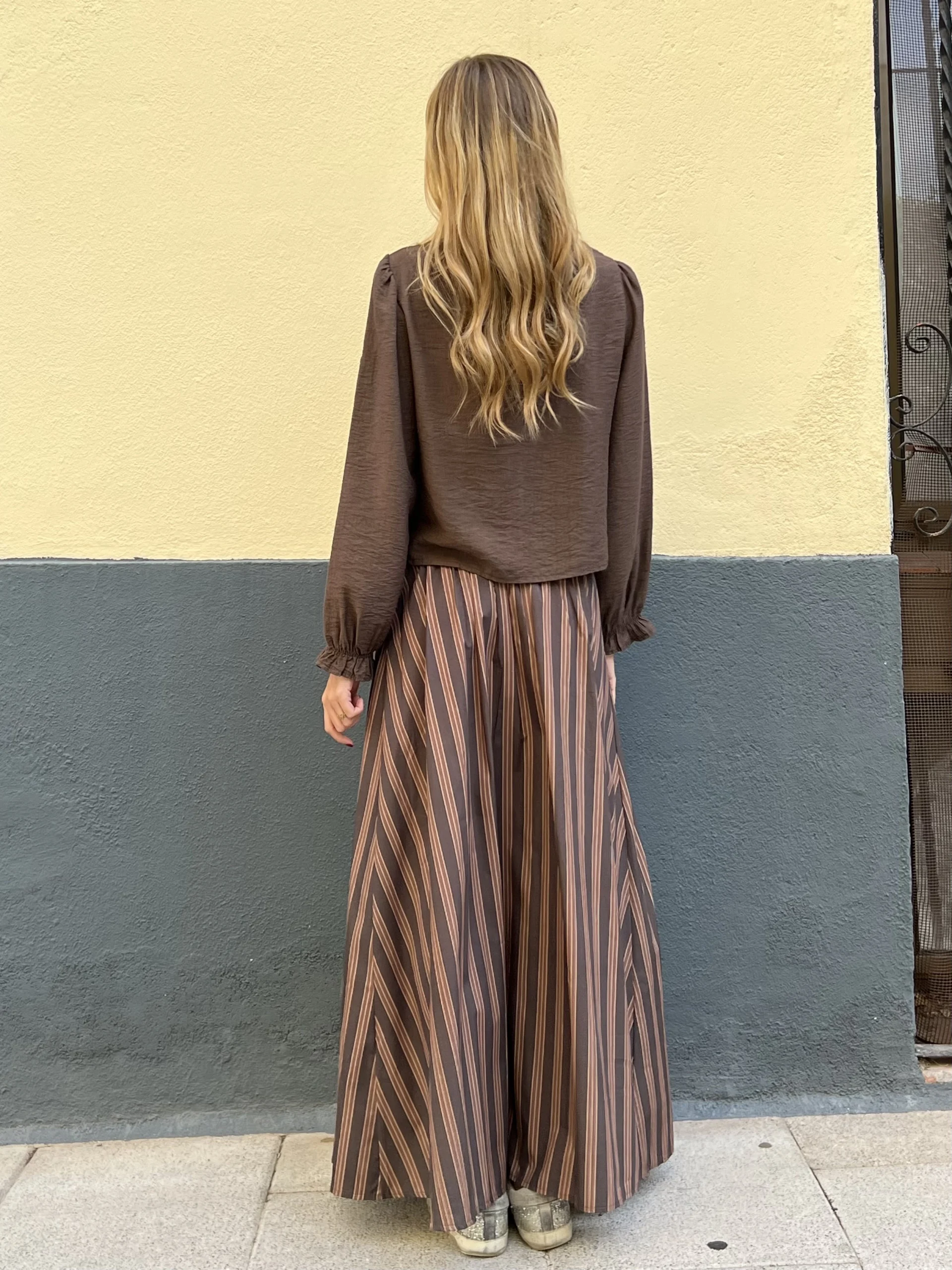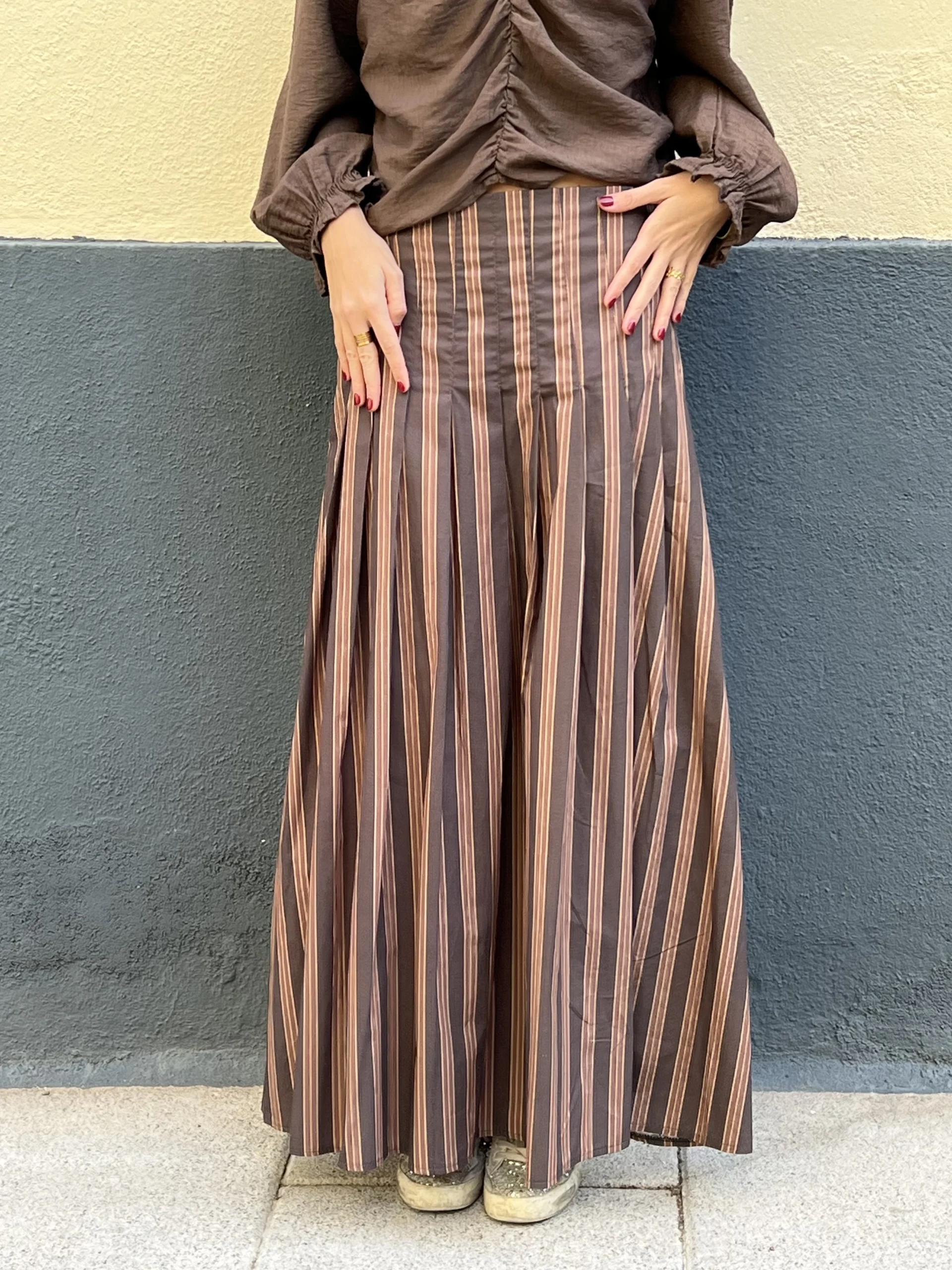 Falda larga con estampado de rayas verticales marrones oscuras y claras. Prenda acampanada con movimiento y cintura elástica con goma en la parte trasera.