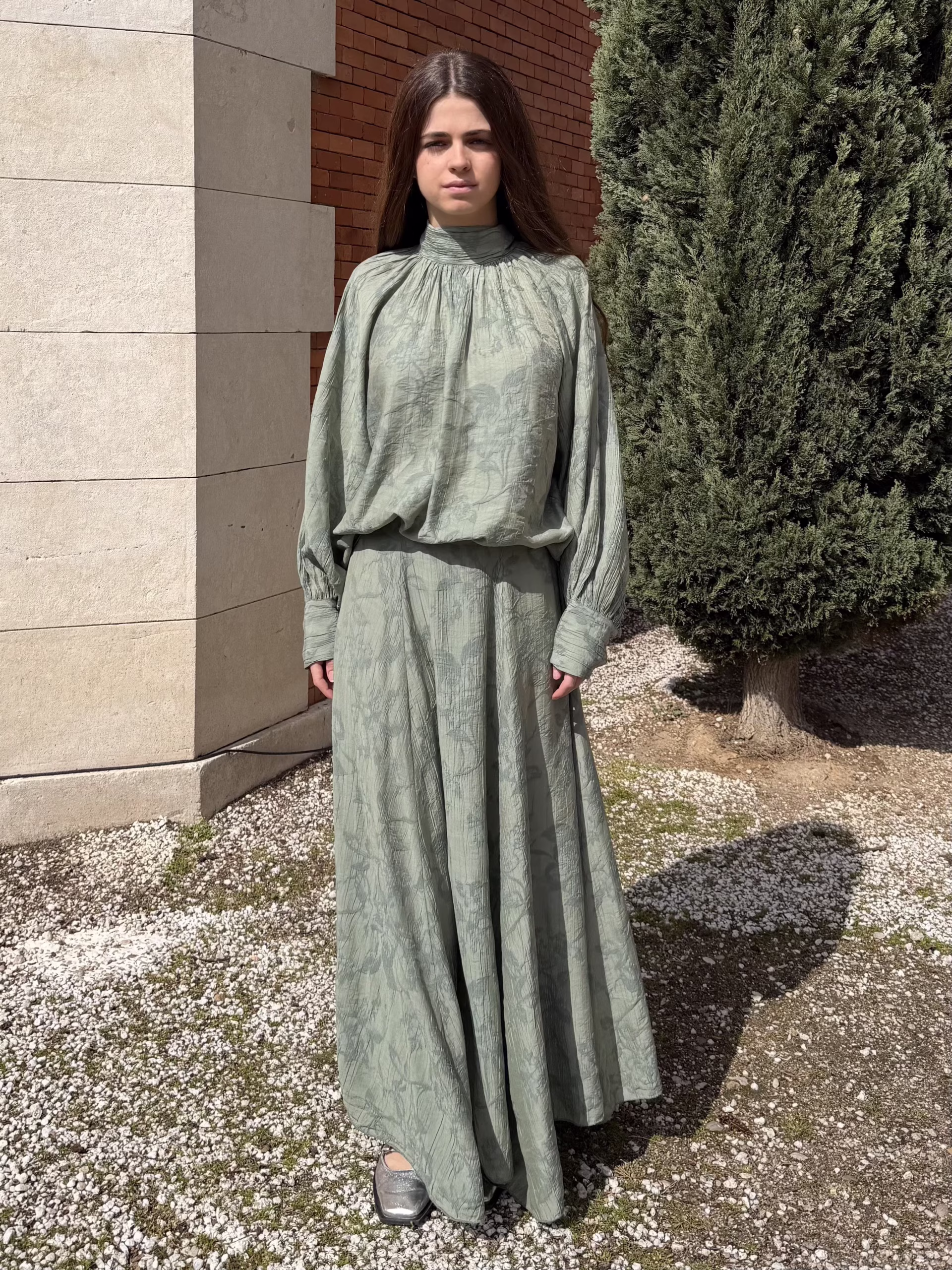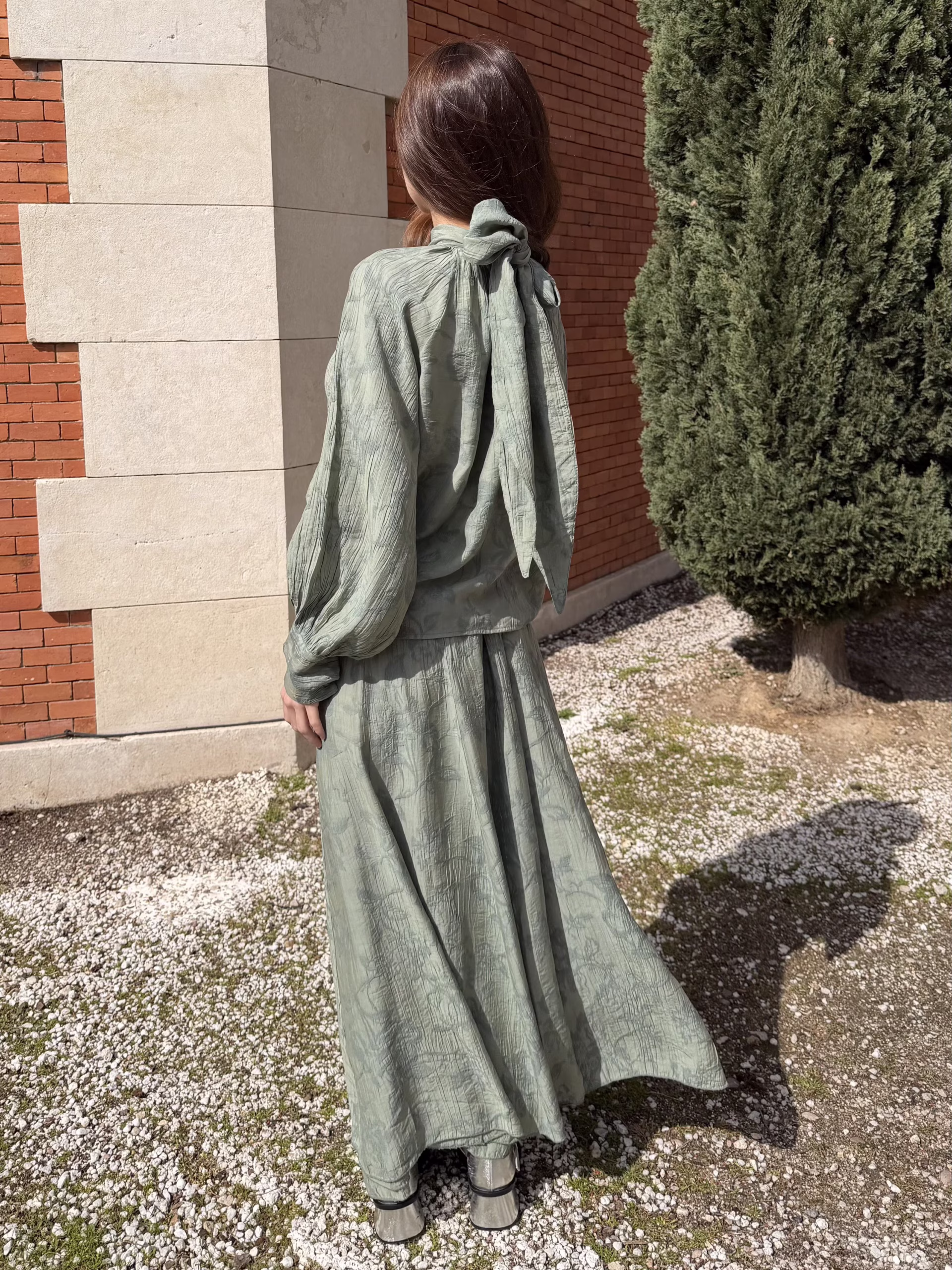 Falda larga en tono verde salvia con bordado floral, de caída fluida y elegante. Cintura con goma elástica. Combina perfectamente con la Blusa Verde Salvia Bordada Lazo para un look completo.