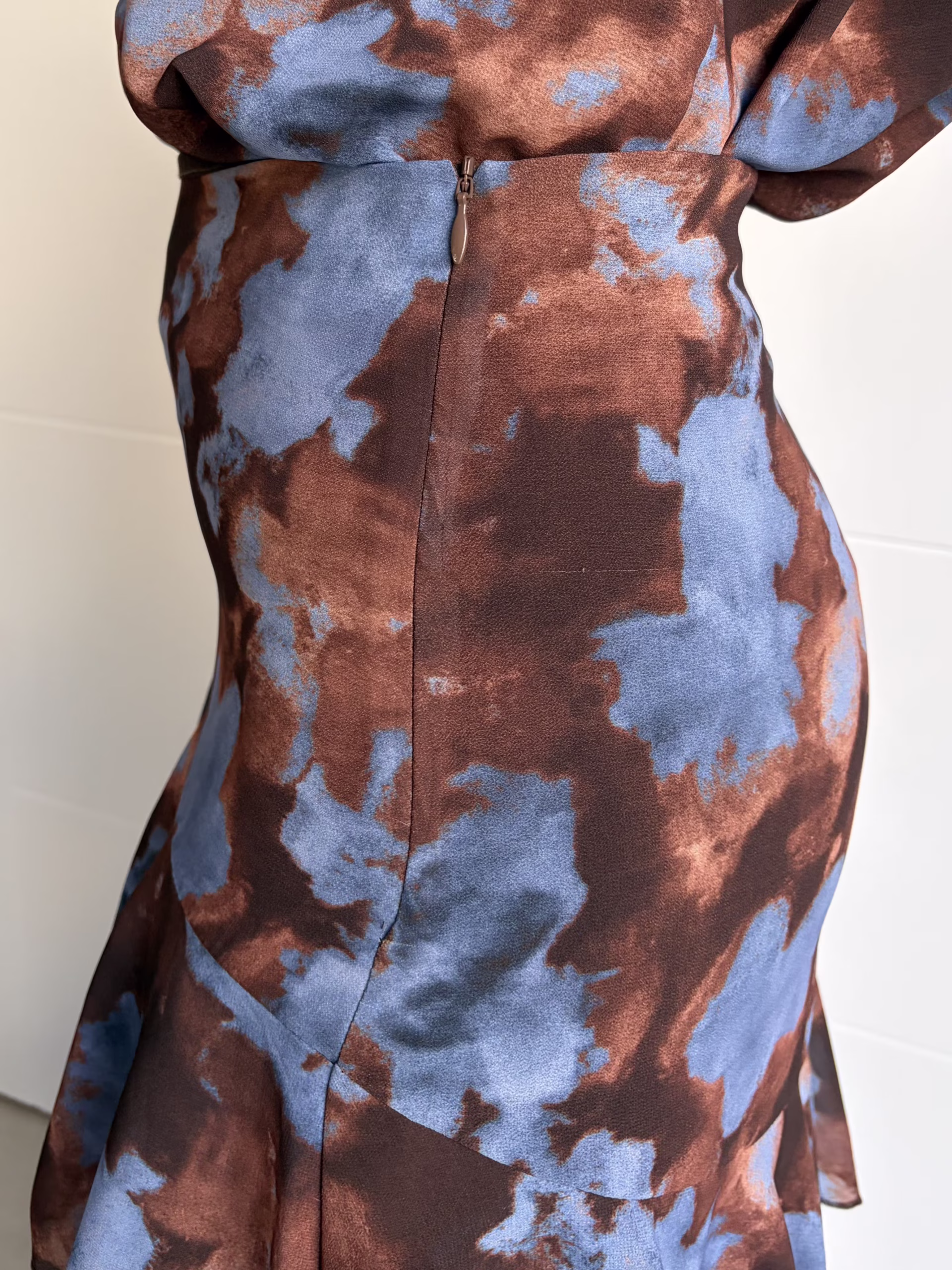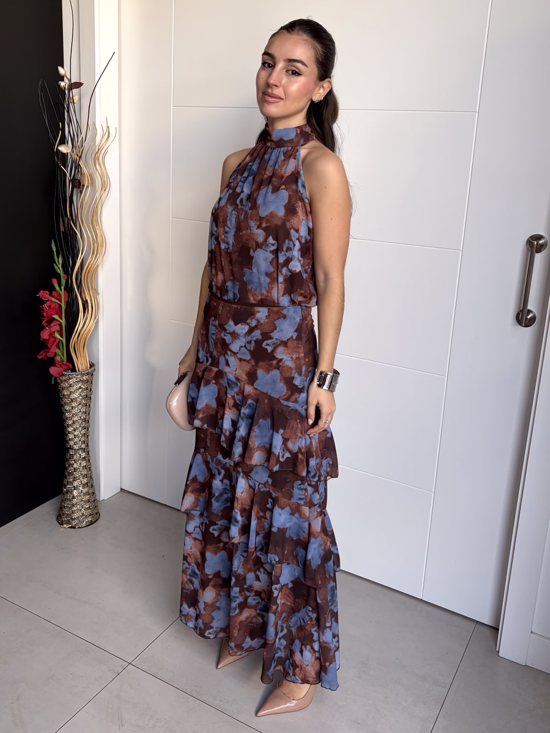 Falda larga de gasa con estampado en tonos marrón chocolate y azul. Diseño de tiro medio con cremallera lateral invisible. Volantes estructurados en cascada que aportan movimiento y volumen. Forro interior en color marrón chocolate.