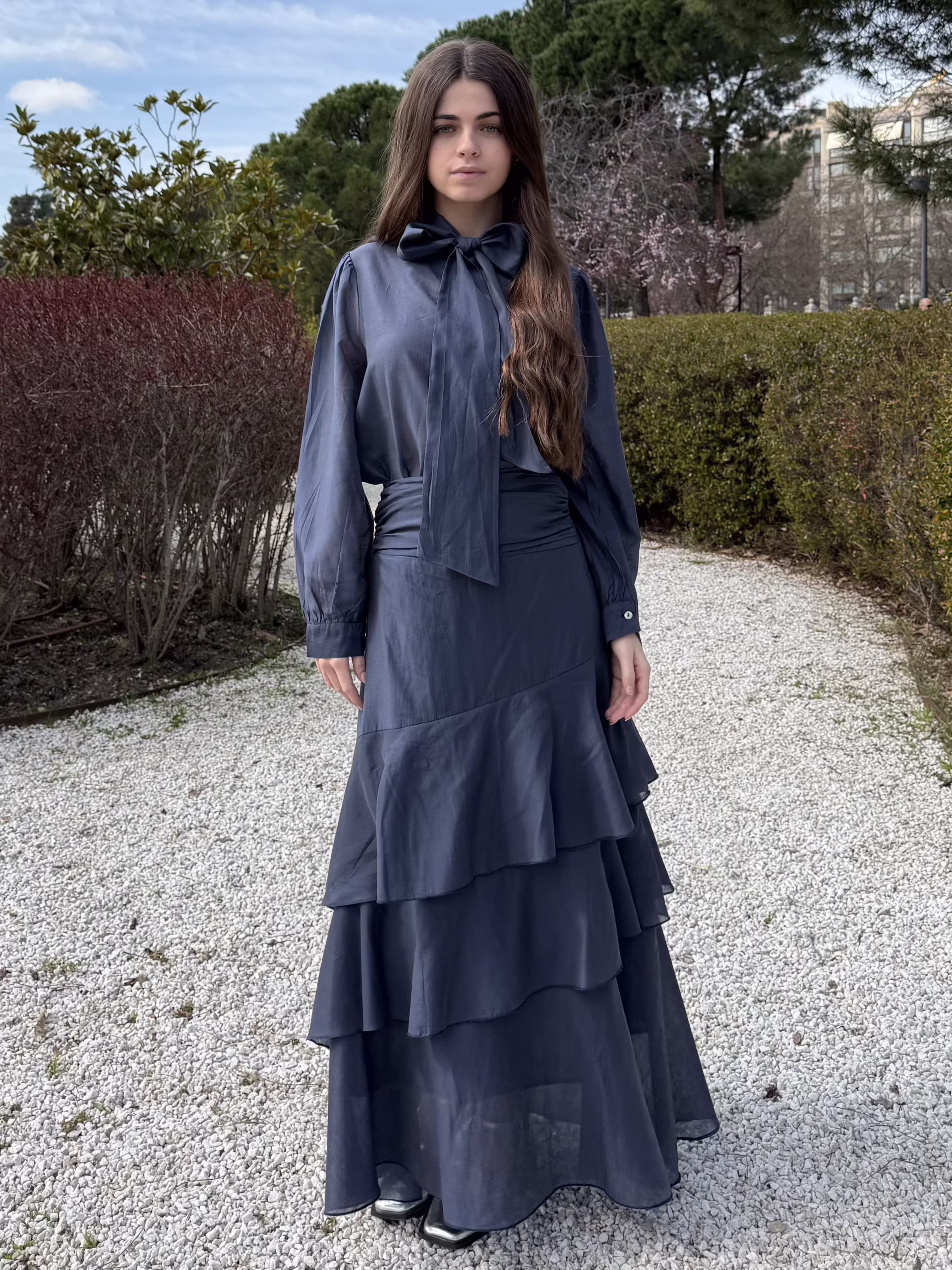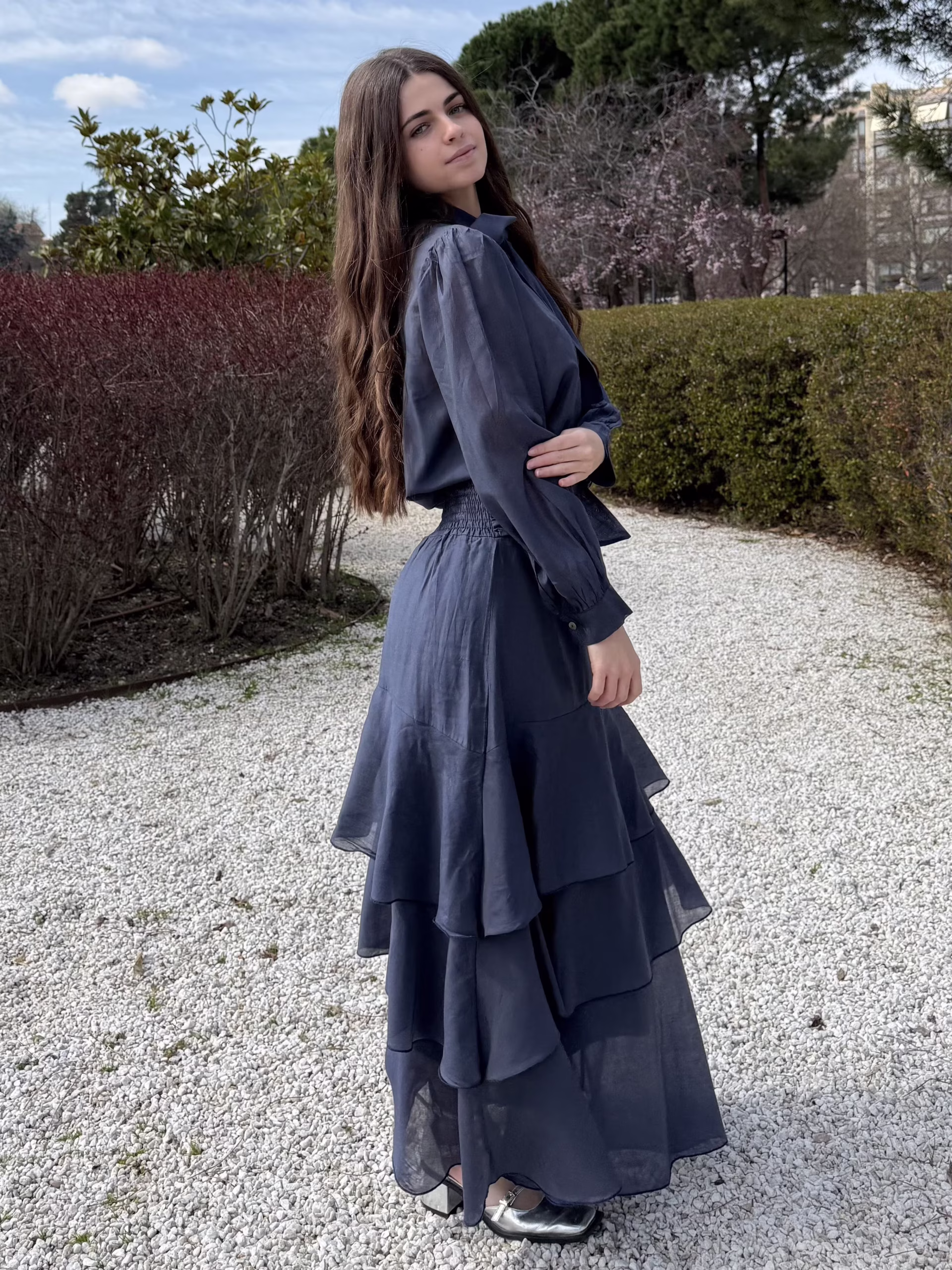 Falda midi en tono azul marino con diseño en capas y volantes que aportan movimiento. Cuenta con cintura que se adapta cómodamente al cuerpo. El tejido ligero aporta fluidez y una caída natural.