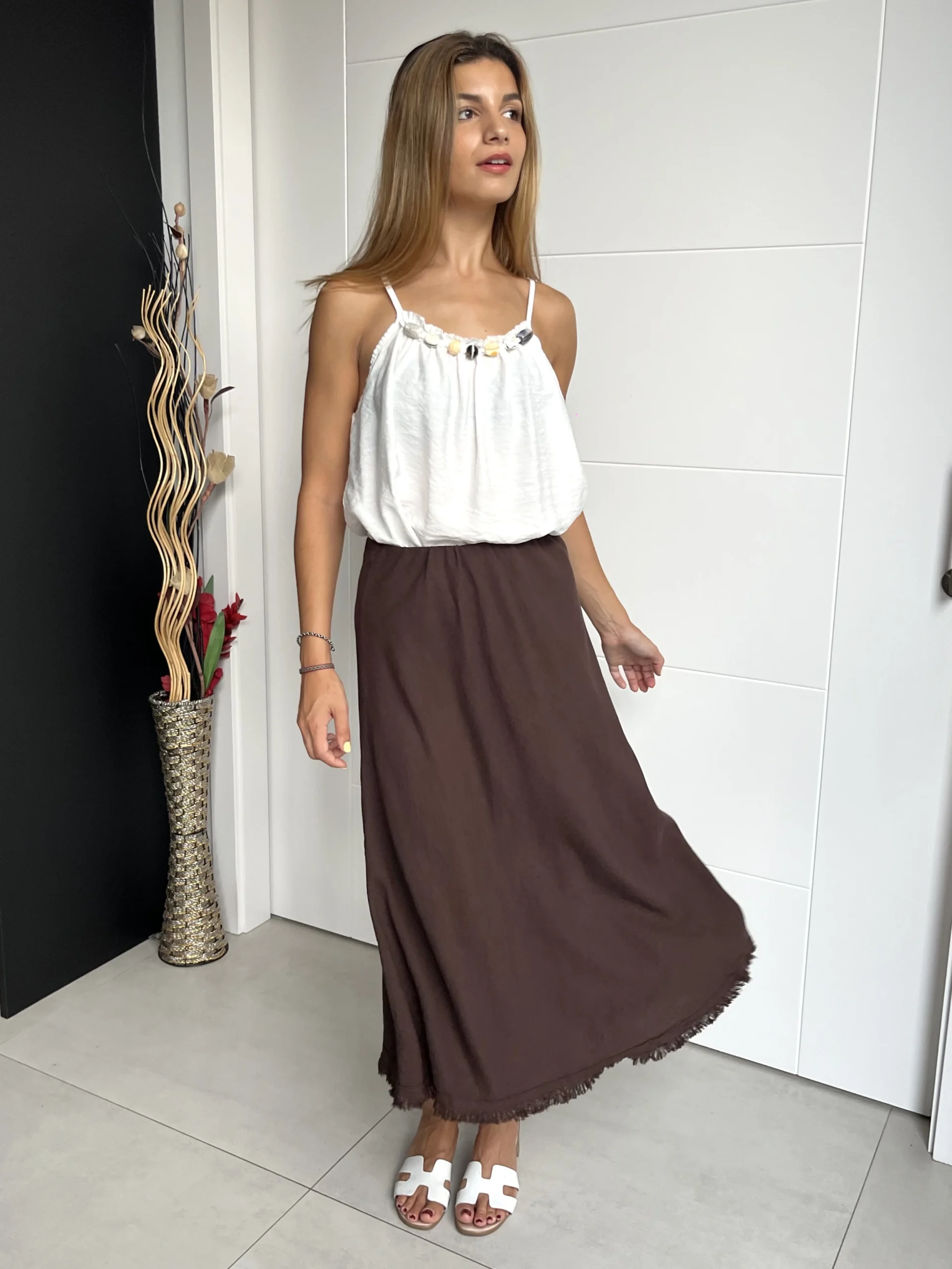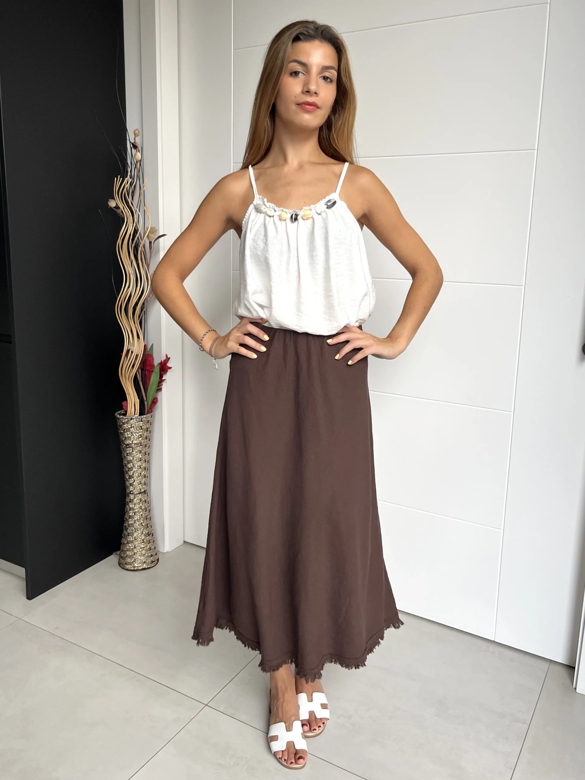 Falda midi en color marrón chocolate con caída evasé, acampanada y cintura elástica con goma. Acabado con hilo.