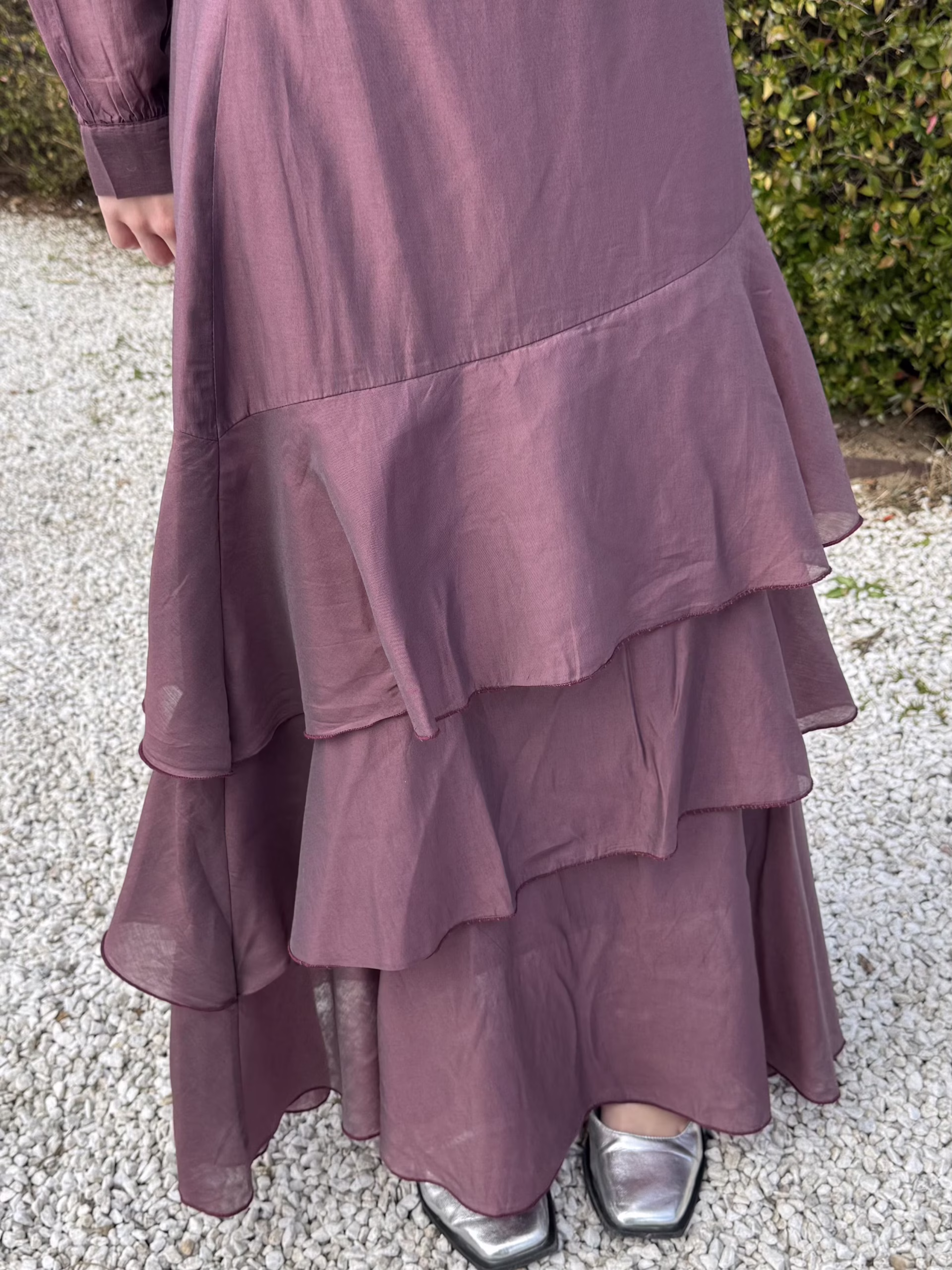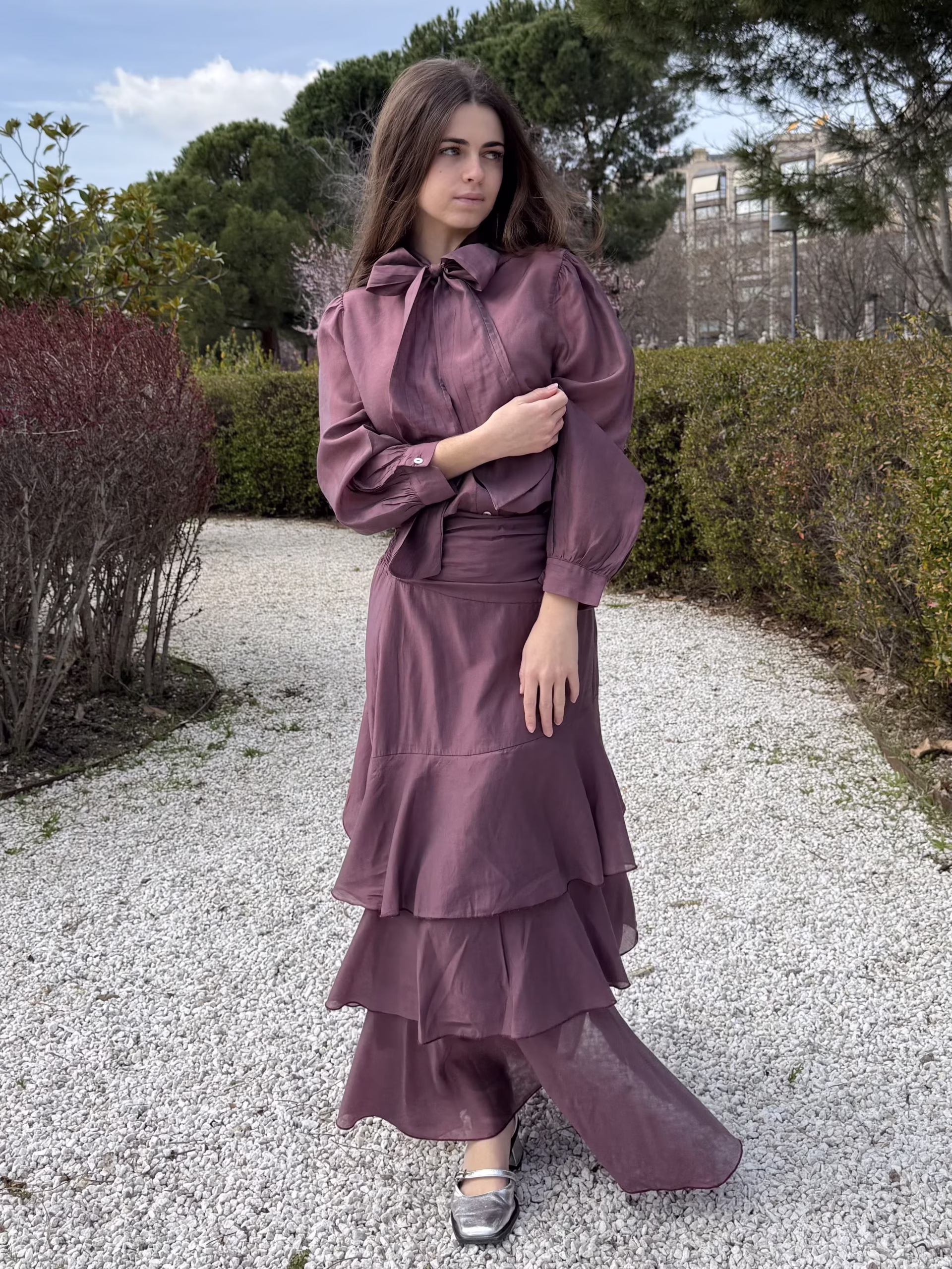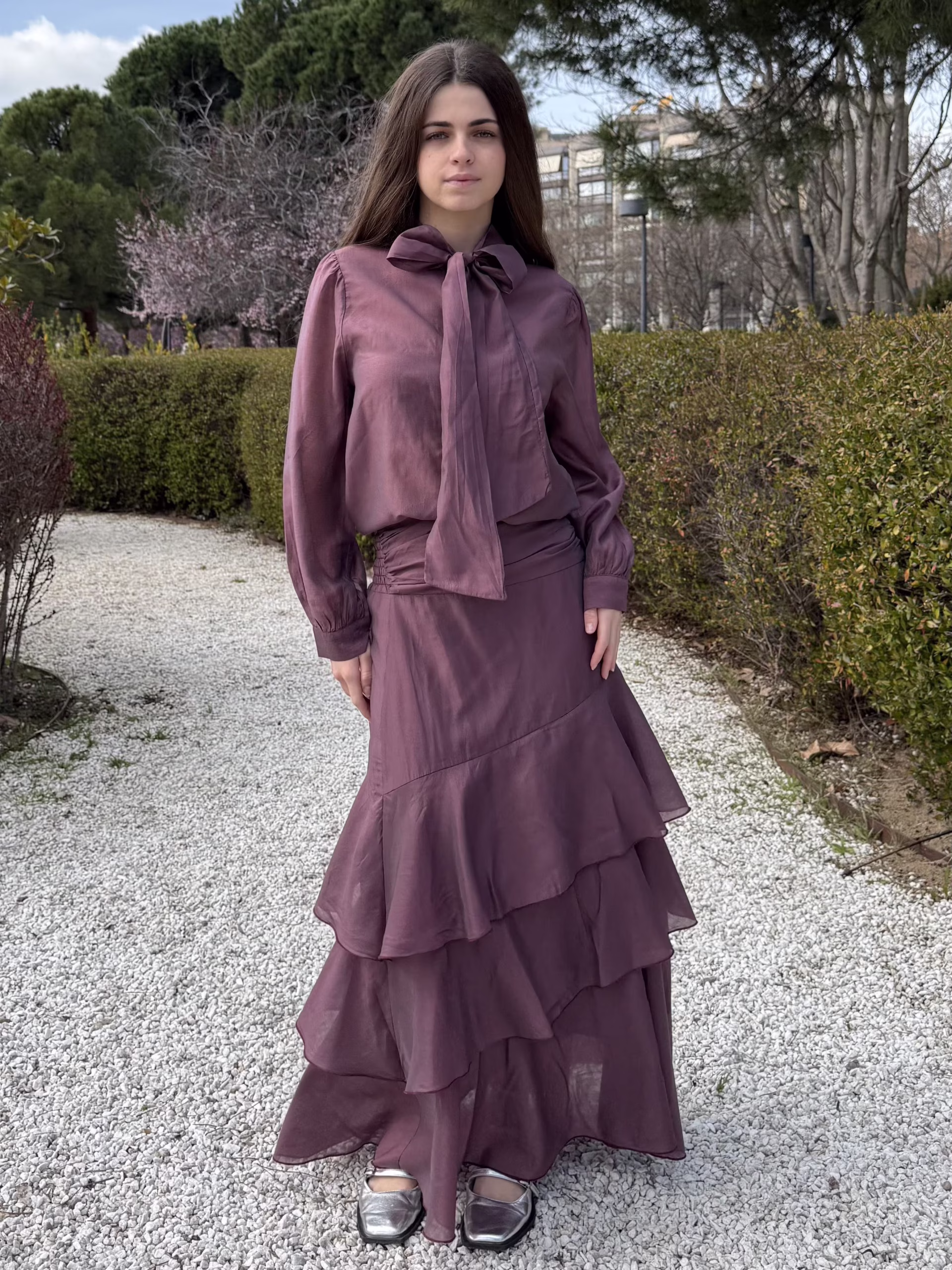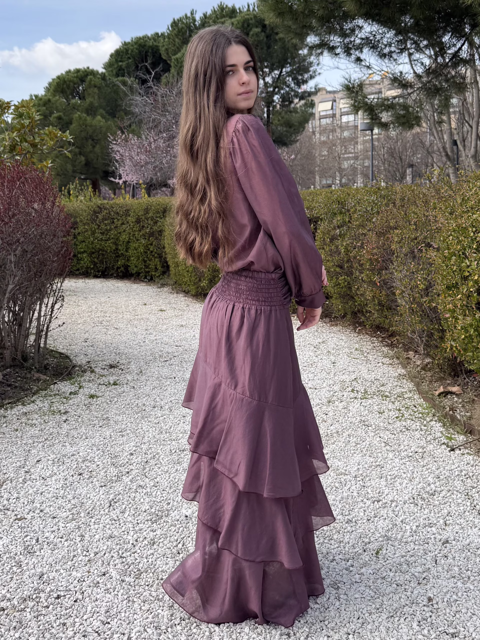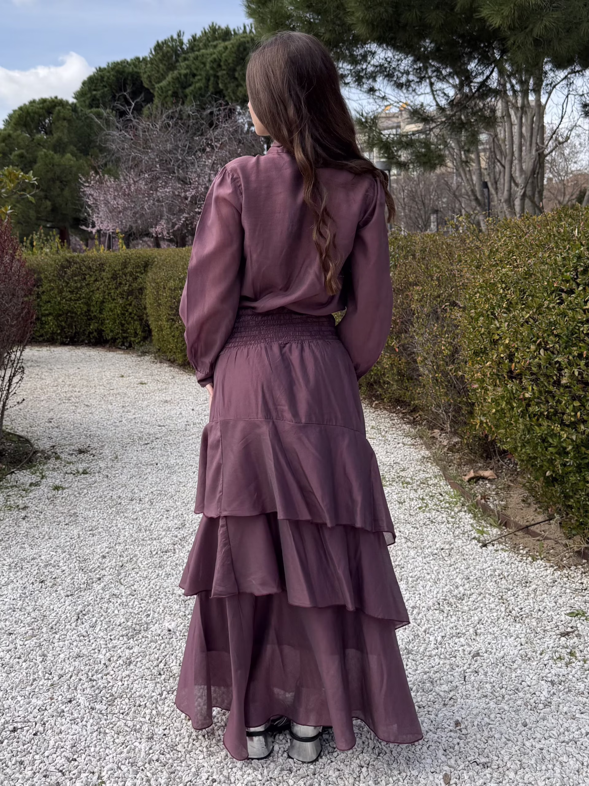 Falda midi en tono ciruela con diseño en capas y volantes que aportan movimiento. Cuenta con cintura que se adapta cómodamente al cuerpo. El tejido ligero aporta fluidez y una caída natural.