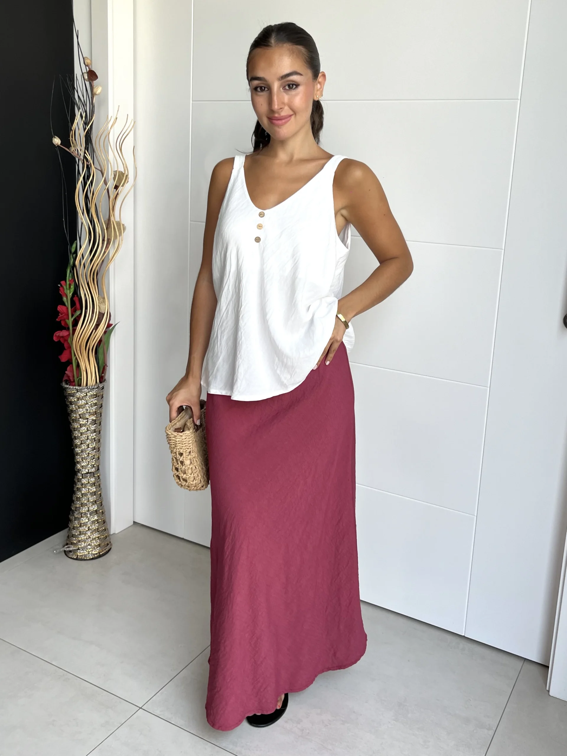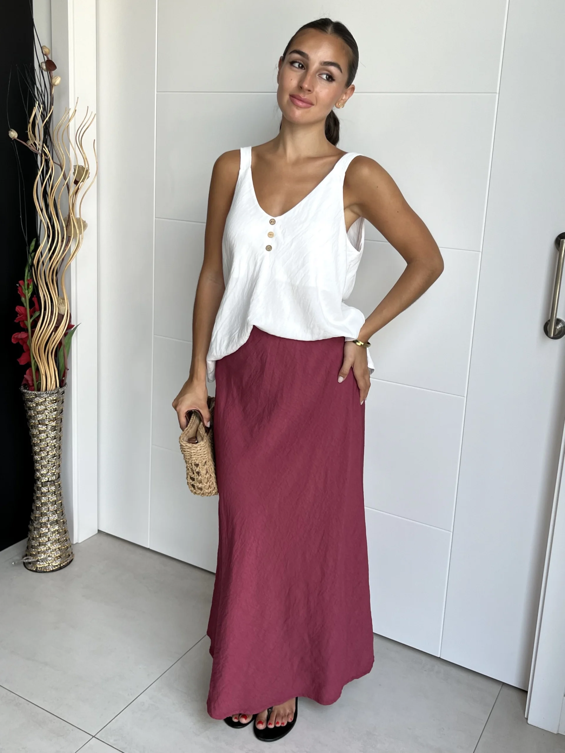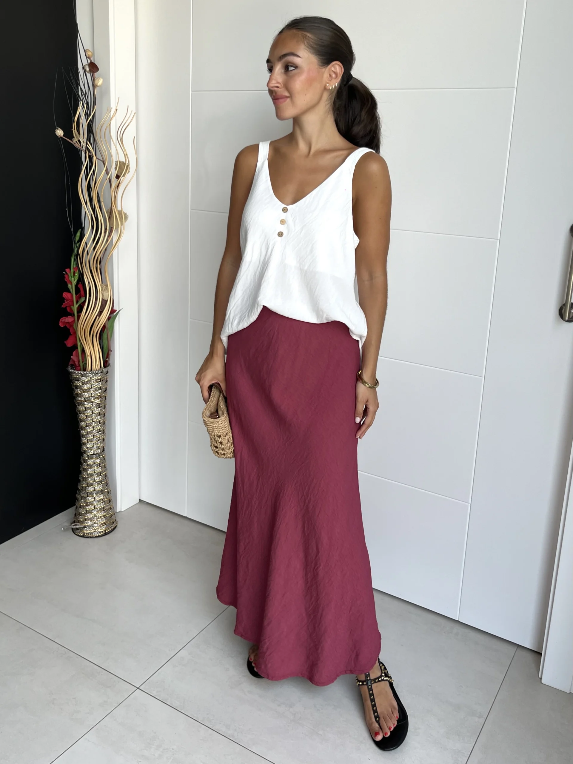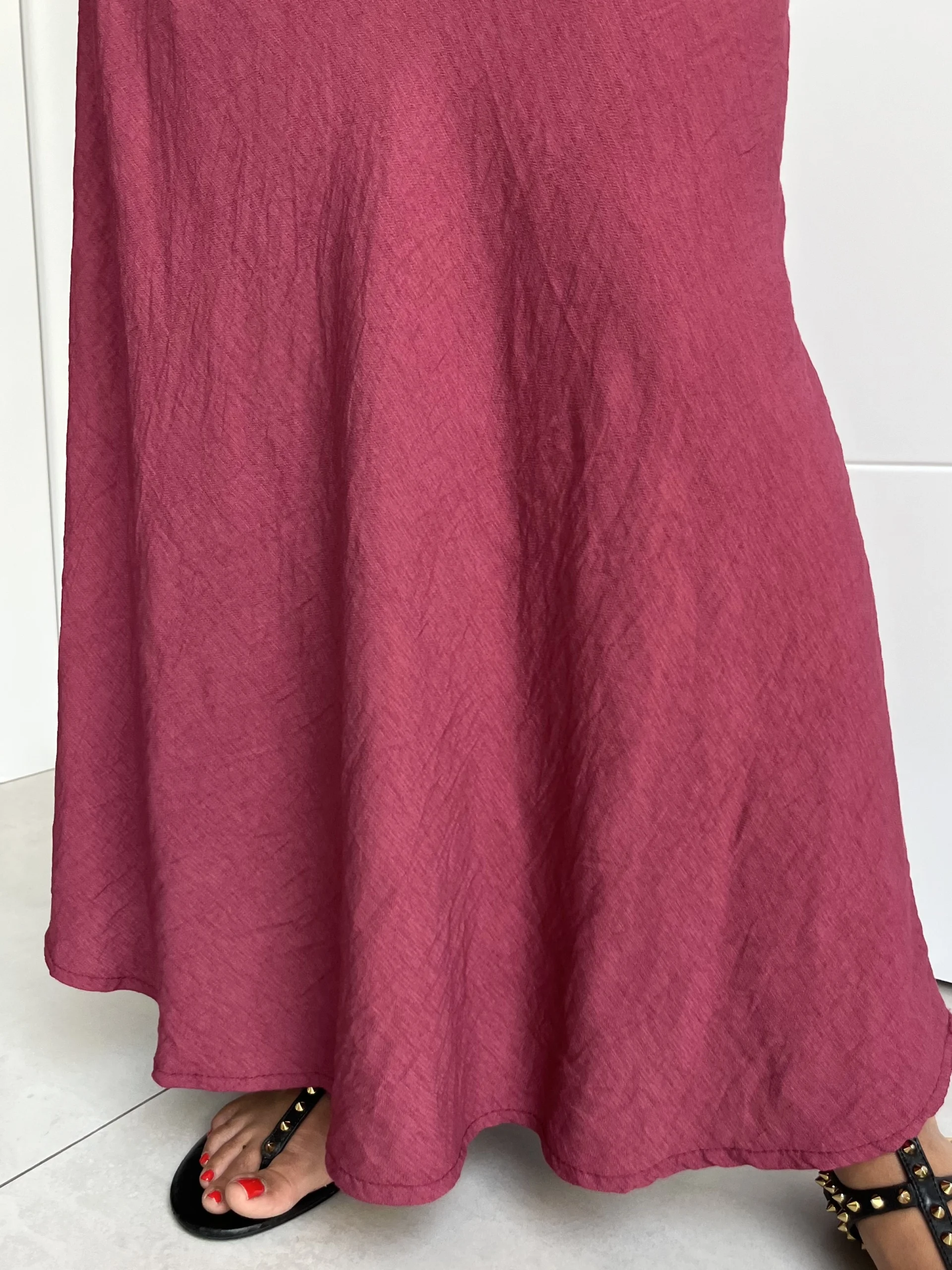 Falda midi en color frambuesa, con caída evasé y cintura elástica con goma.