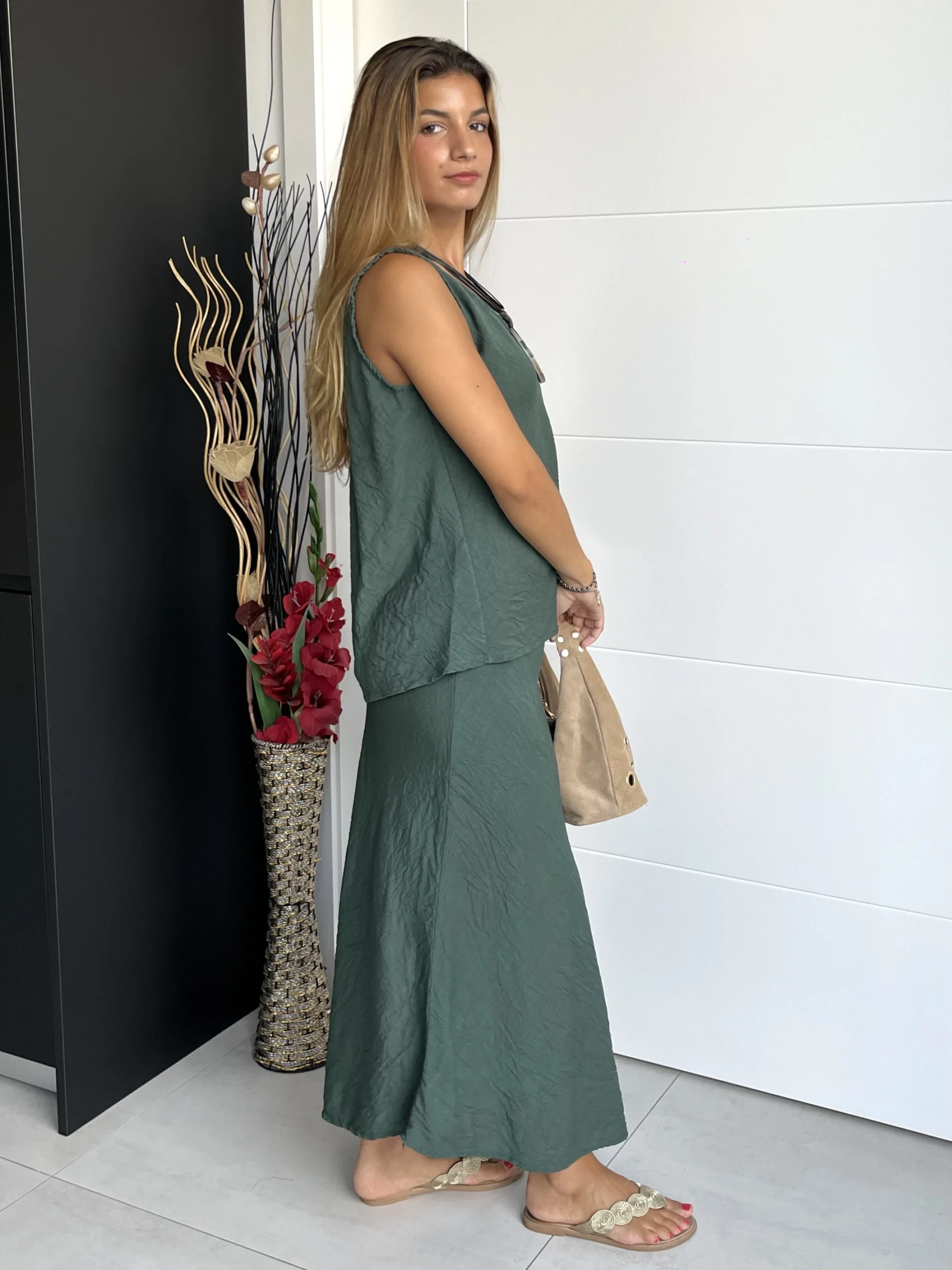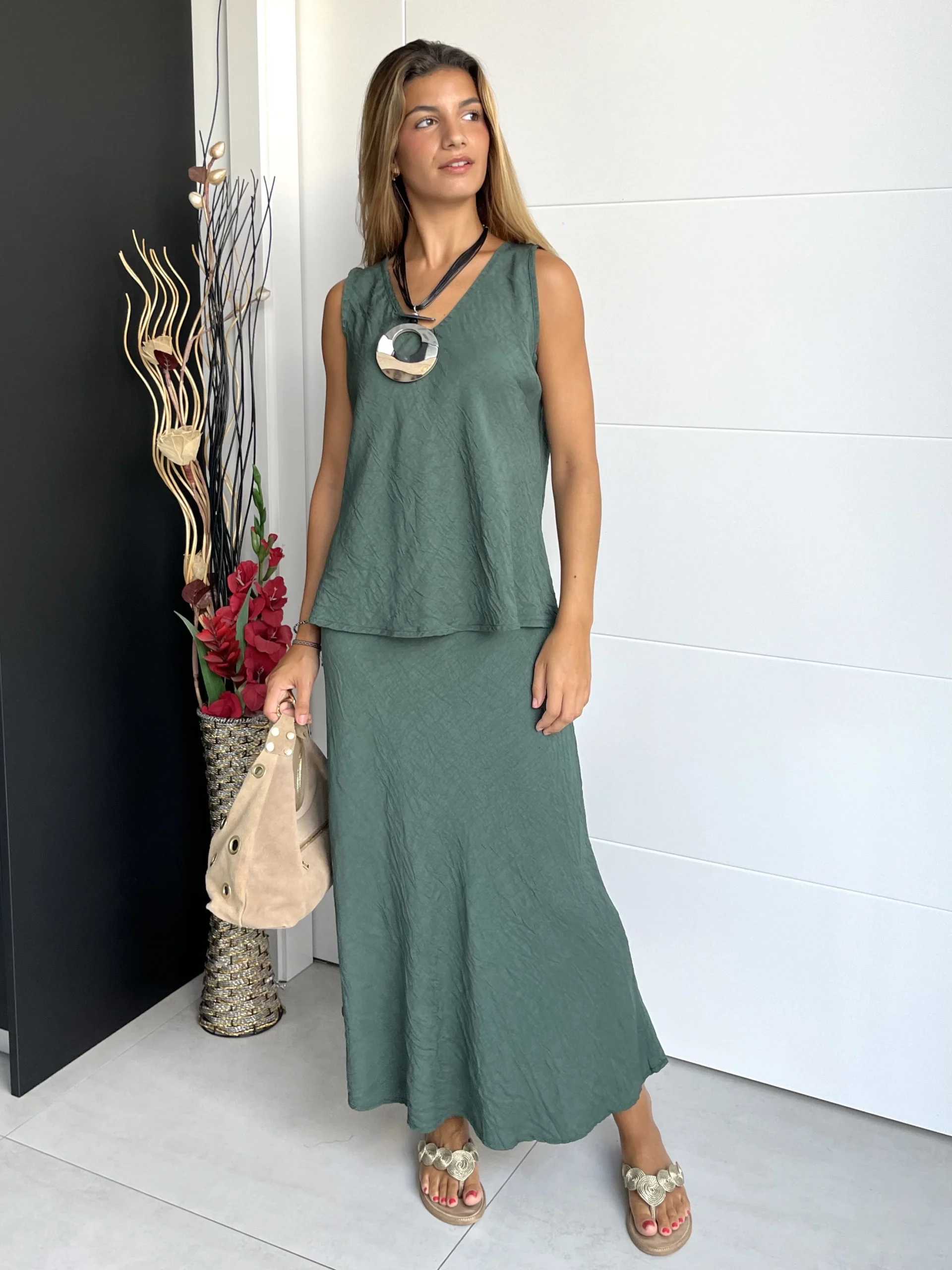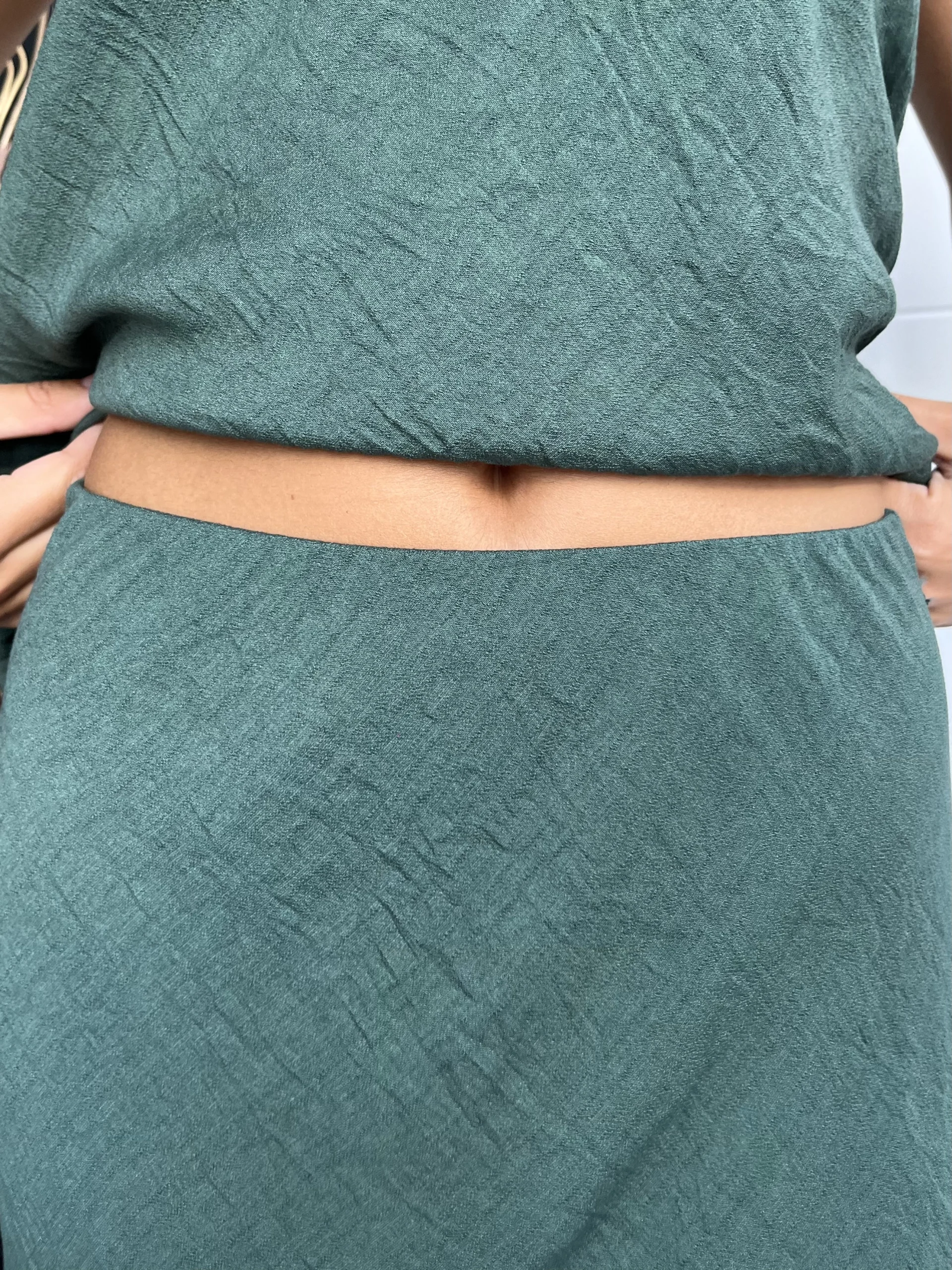 Falda midi en color verde botella, con caída evasé y cintura elástica con goma. A juego con la Blusa Básica Tirantes Verde Botella.