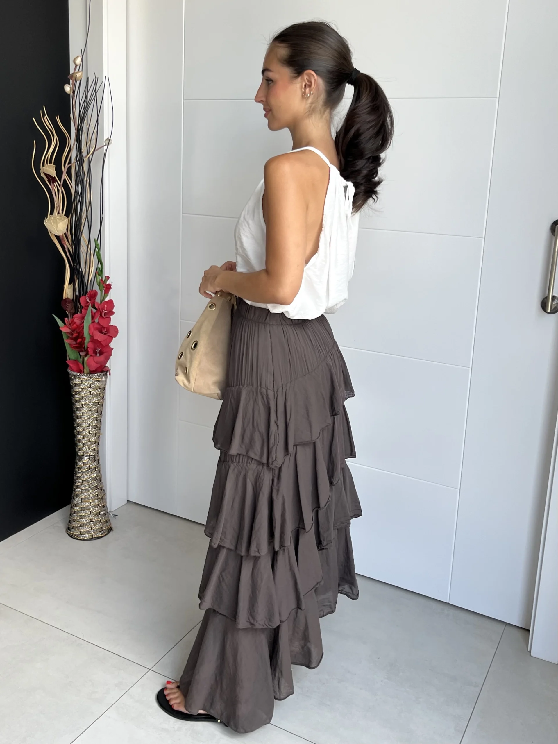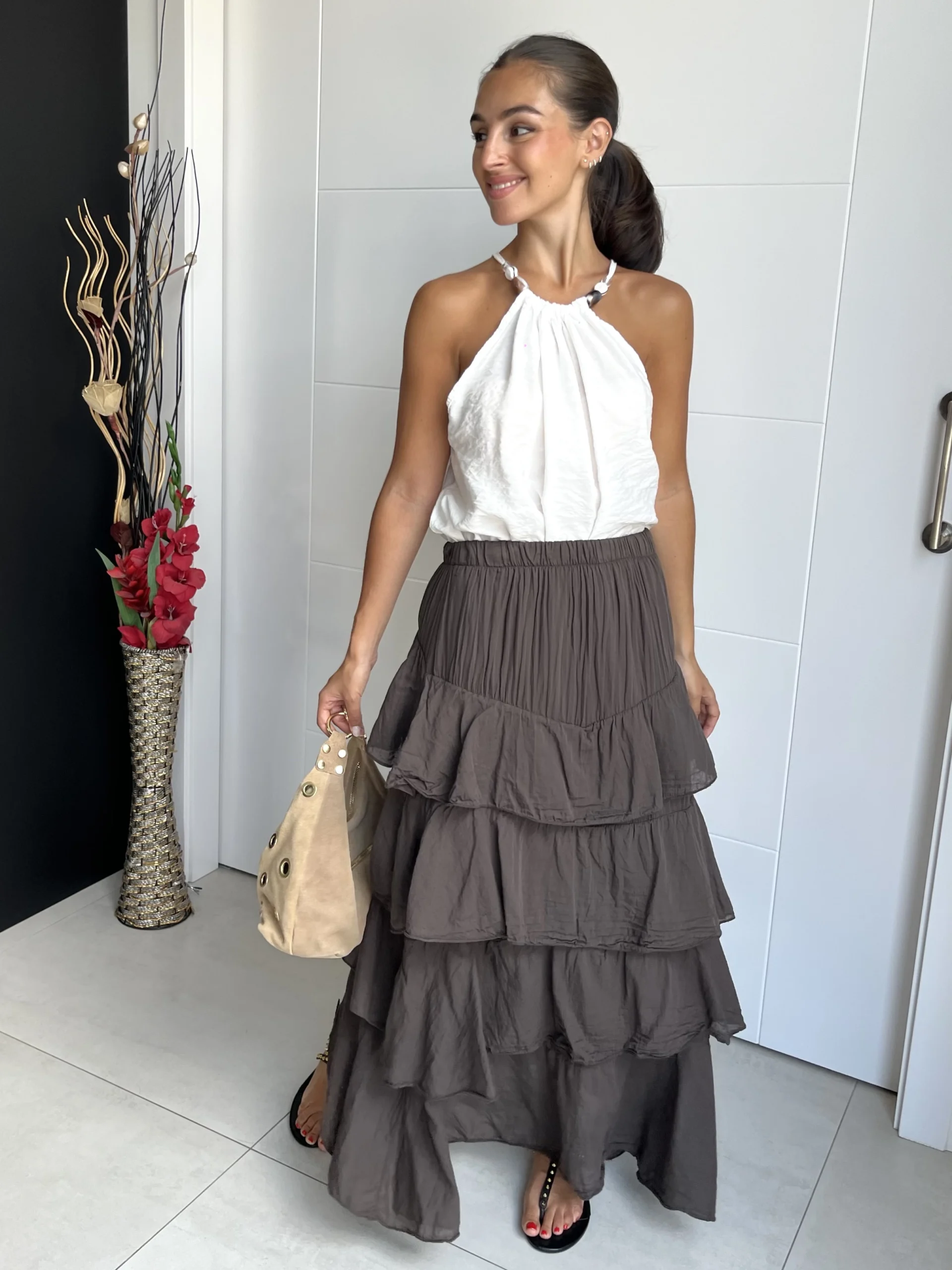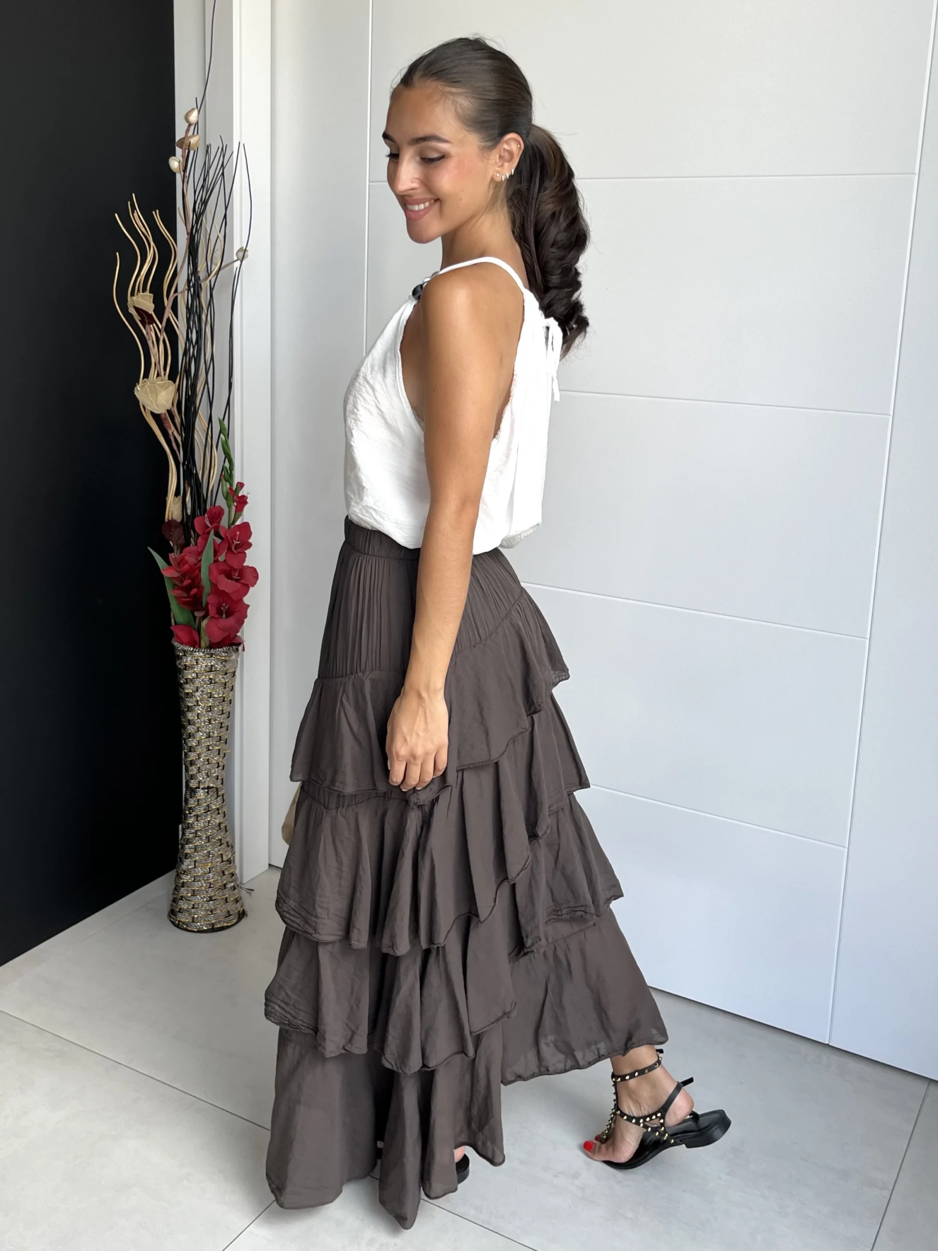 Falda midi plisada con volantes en color marrón chocolate. Con forro interior corto y goma elástica en la cintura. Falda con movimiento.