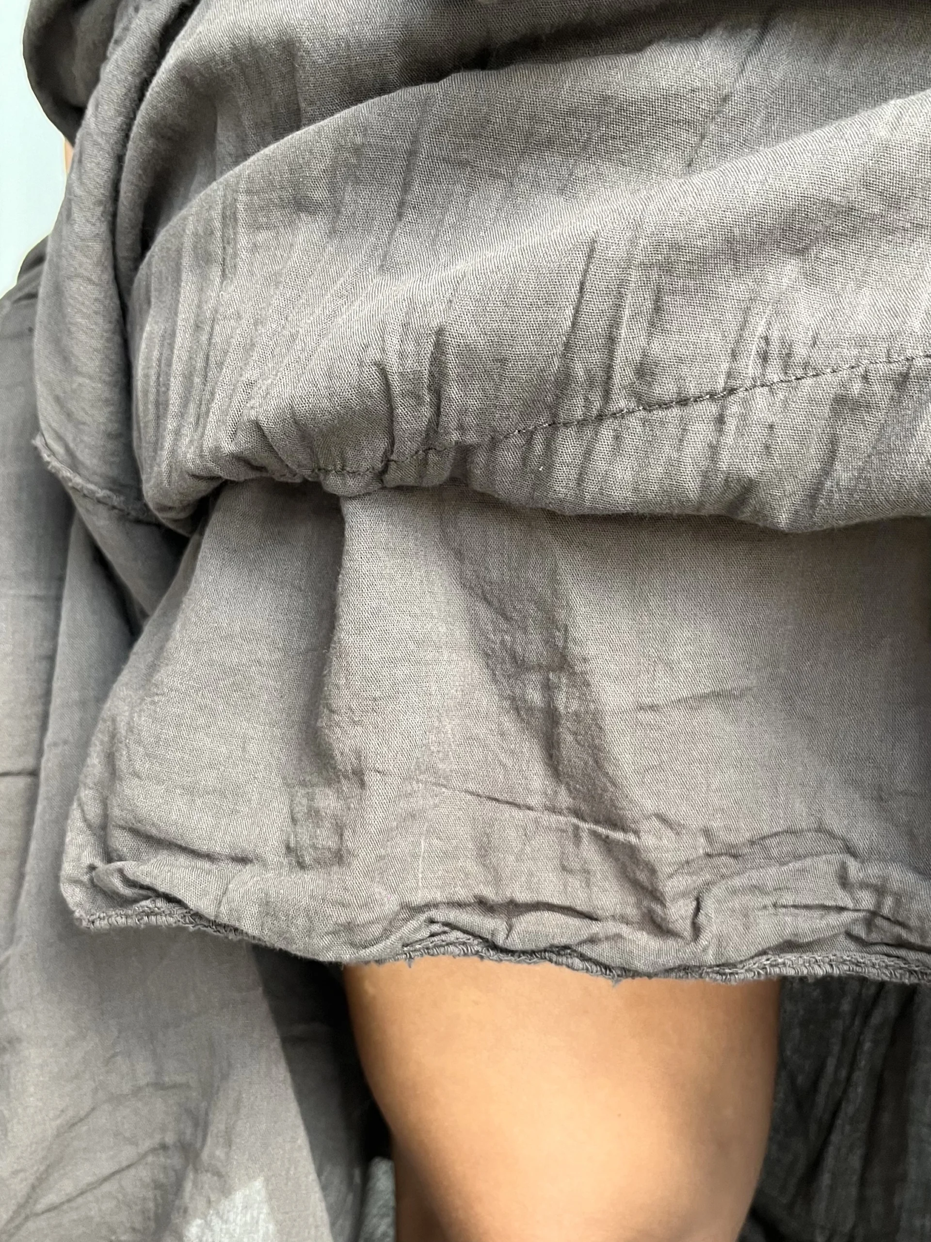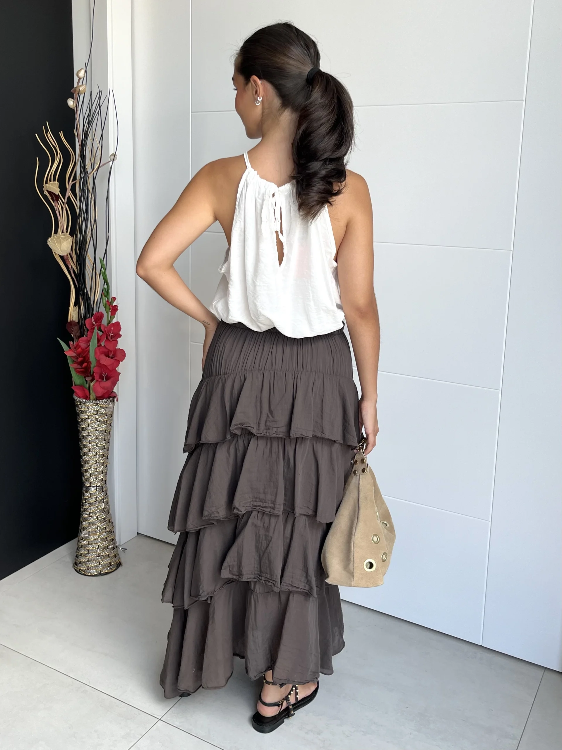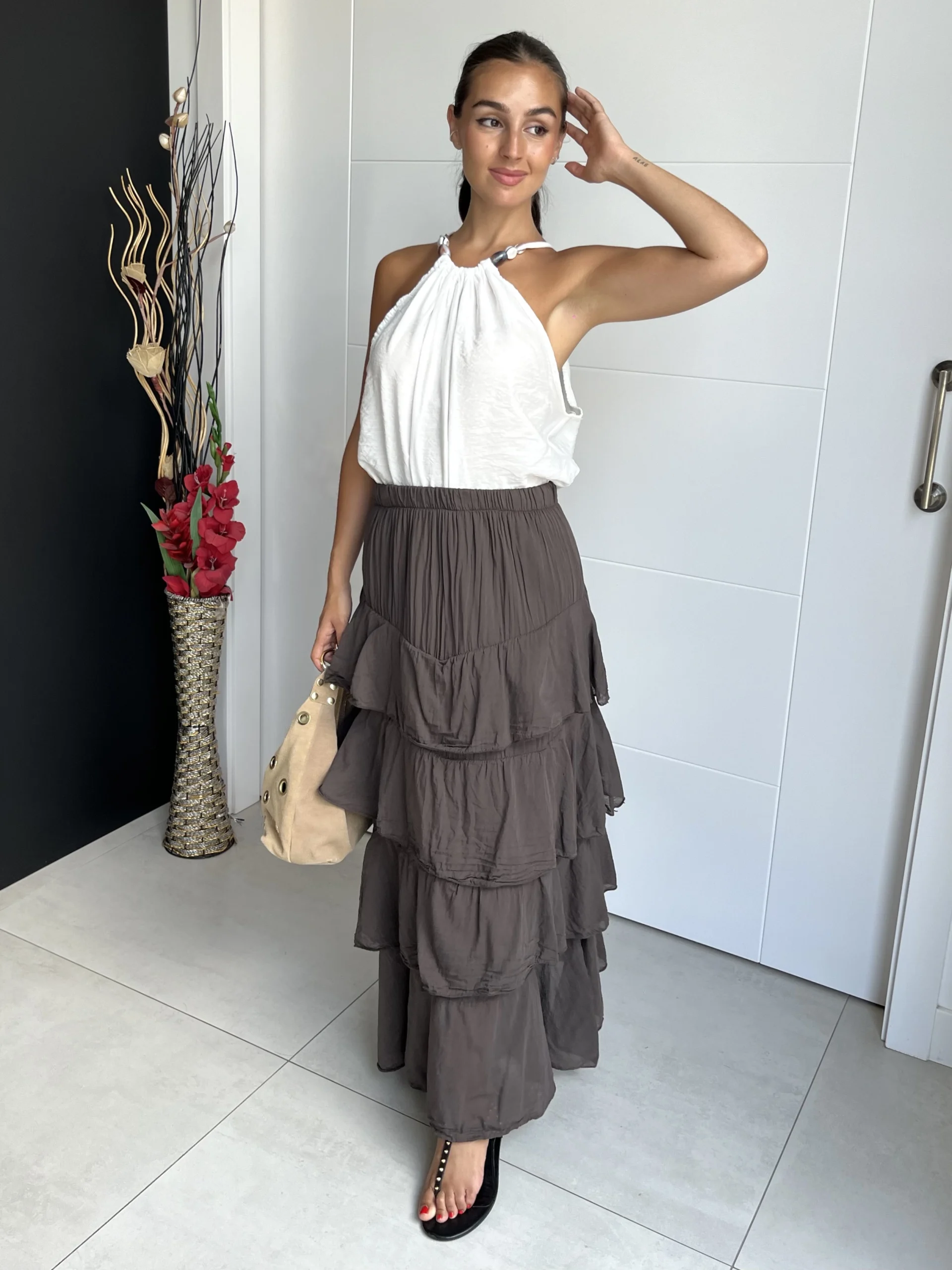 Falda midi plisada con volantes en color marrón chocolate. Con forro interior corto y goma elástica en la cintura. Falda con movimiento.