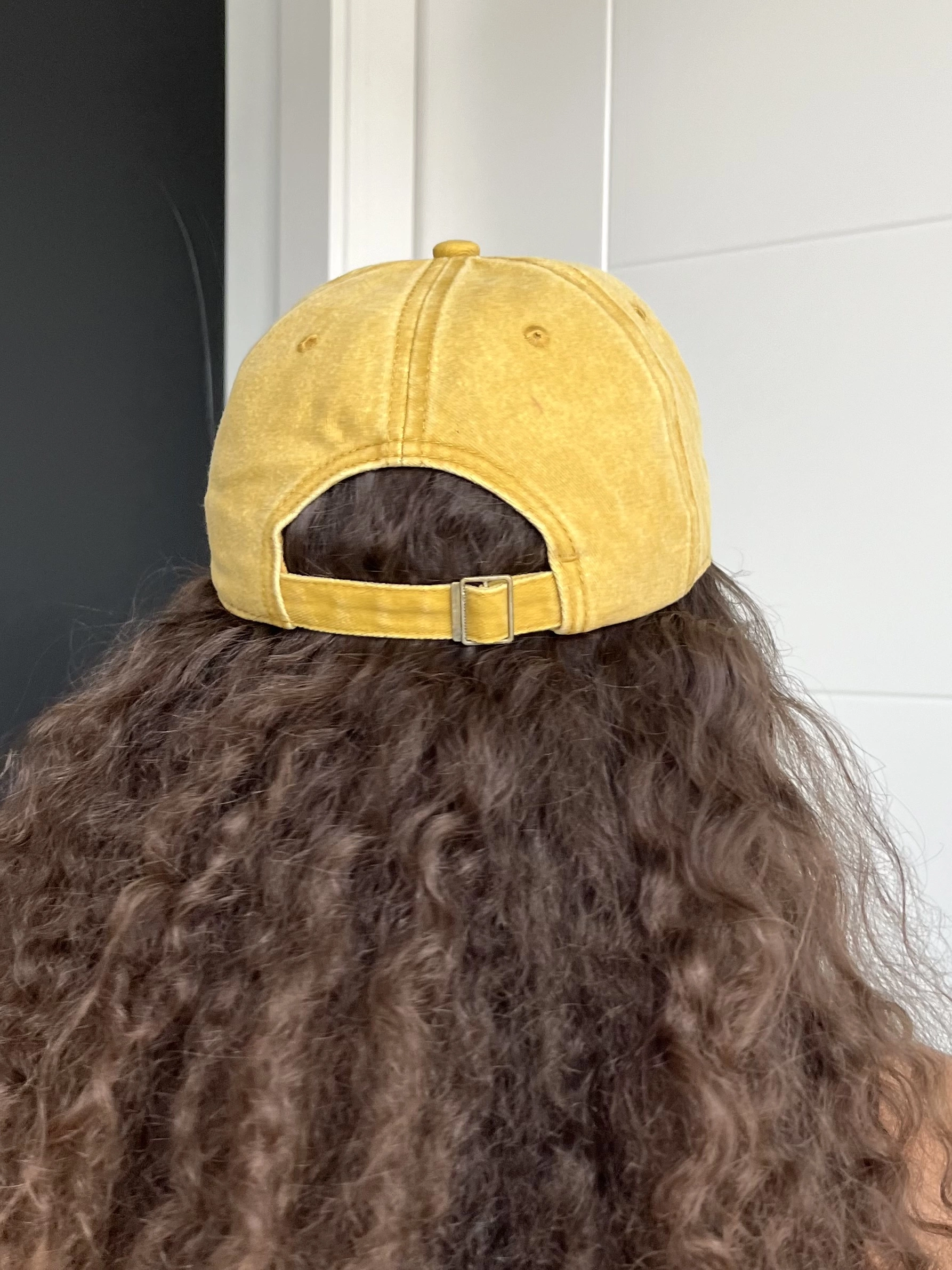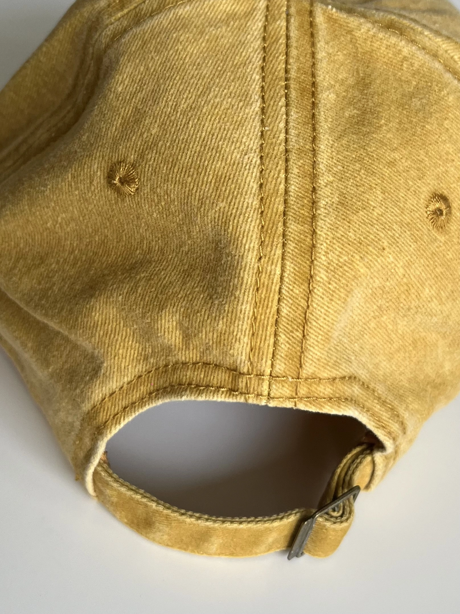 Gorra en color amarillo mostaza con correa ajustable. Con la palabra AZALEA bordada con hilo rosa palo.