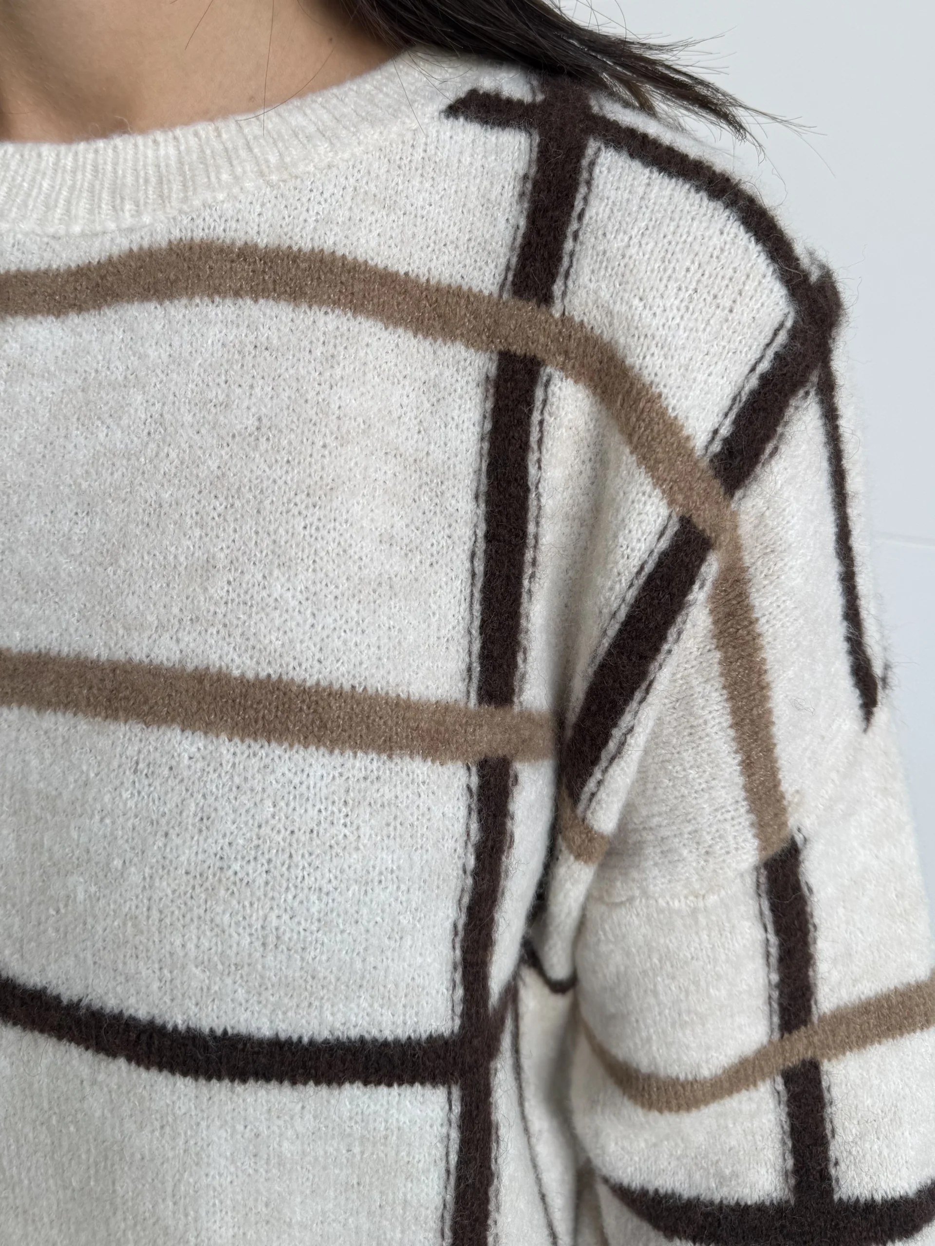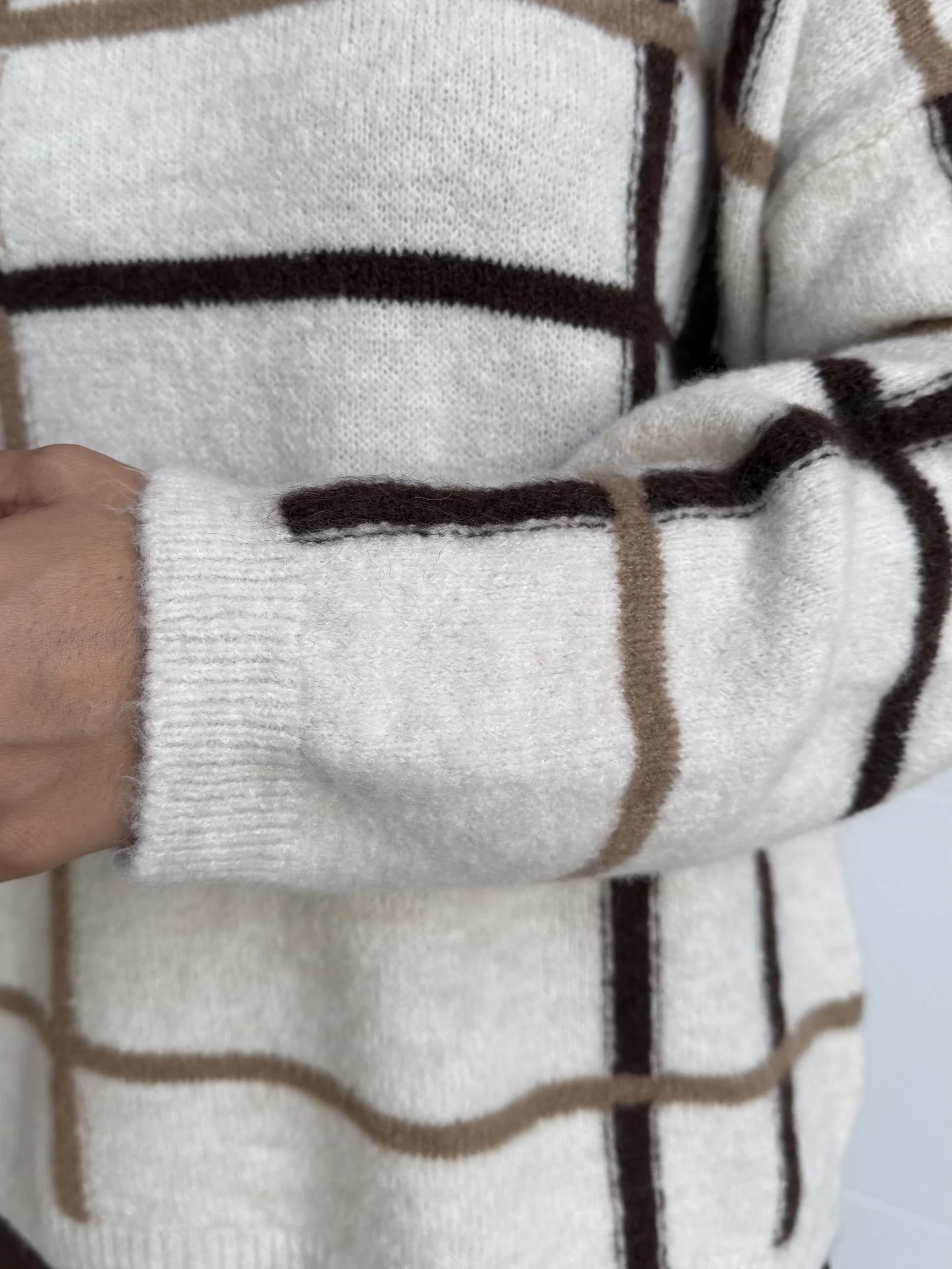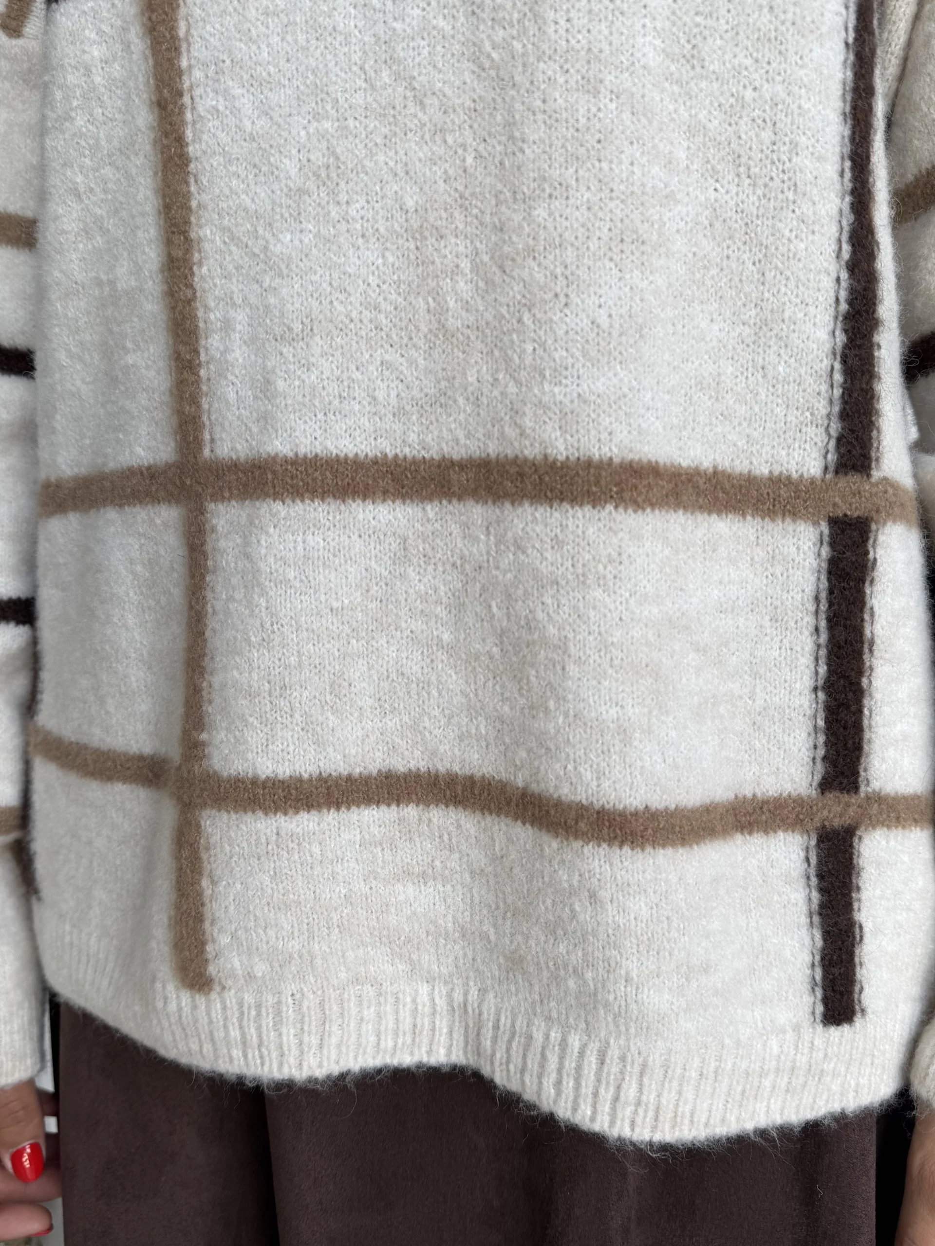 Renueva tu armario de otoño-invierno con este jersey de cuadros beige con rayas marrones. Confeccionado en un punto suave y cálido, destaca por su estampado geométrico en tonos neutros que combinan fácilmente con pantalones, faldas o vaqueros. Su corte oversize con caída natural y cuello redondo lo convierten en una prenda versátil, cómoda y estilosa para el día a día. Perfecto para crear looks relajados sin perder un toque chic.