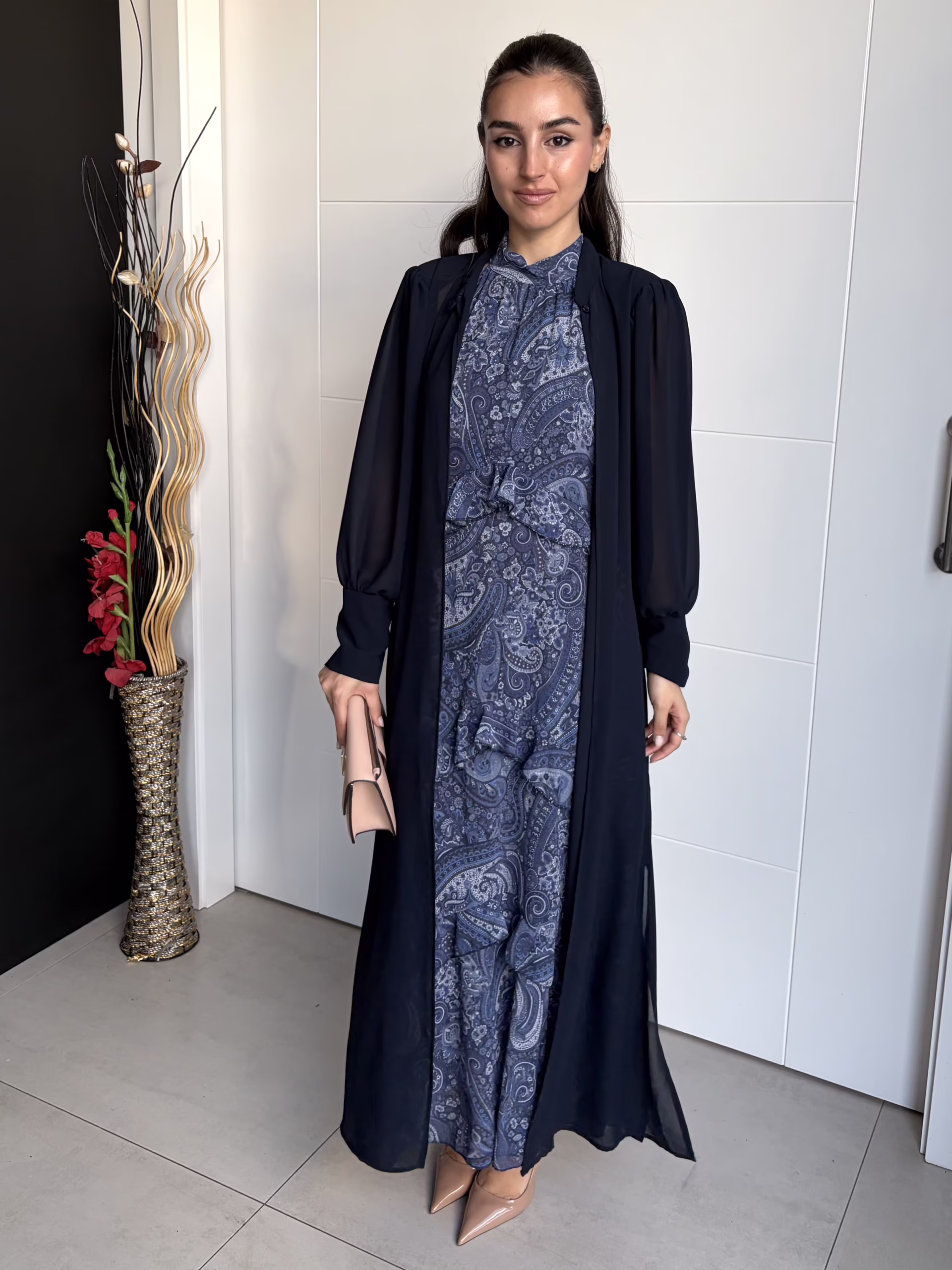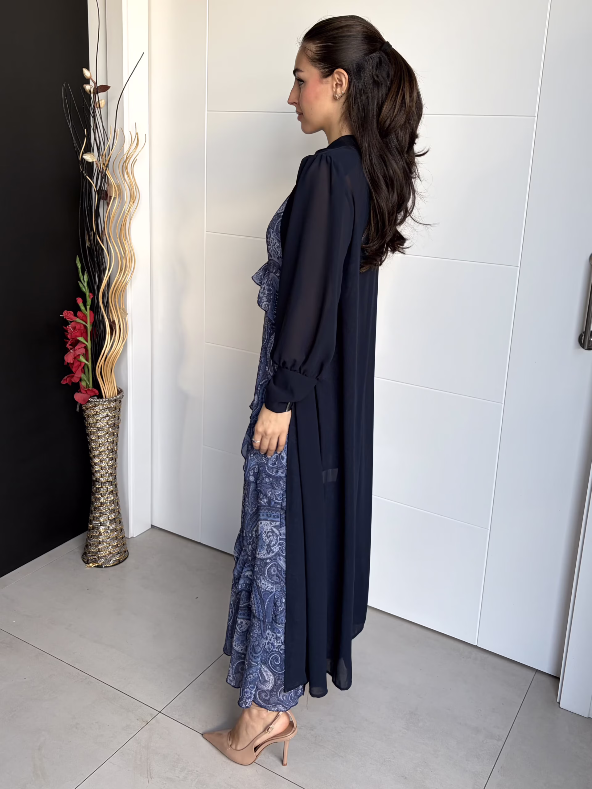 Capa larga de gasa en color azul marino. Diseño recto con hombreras que aportan estructura. Cierre delantero con botón superior. Manga larga con puño amplio. Aberturas laterales que aportan movimiento y ligereza.