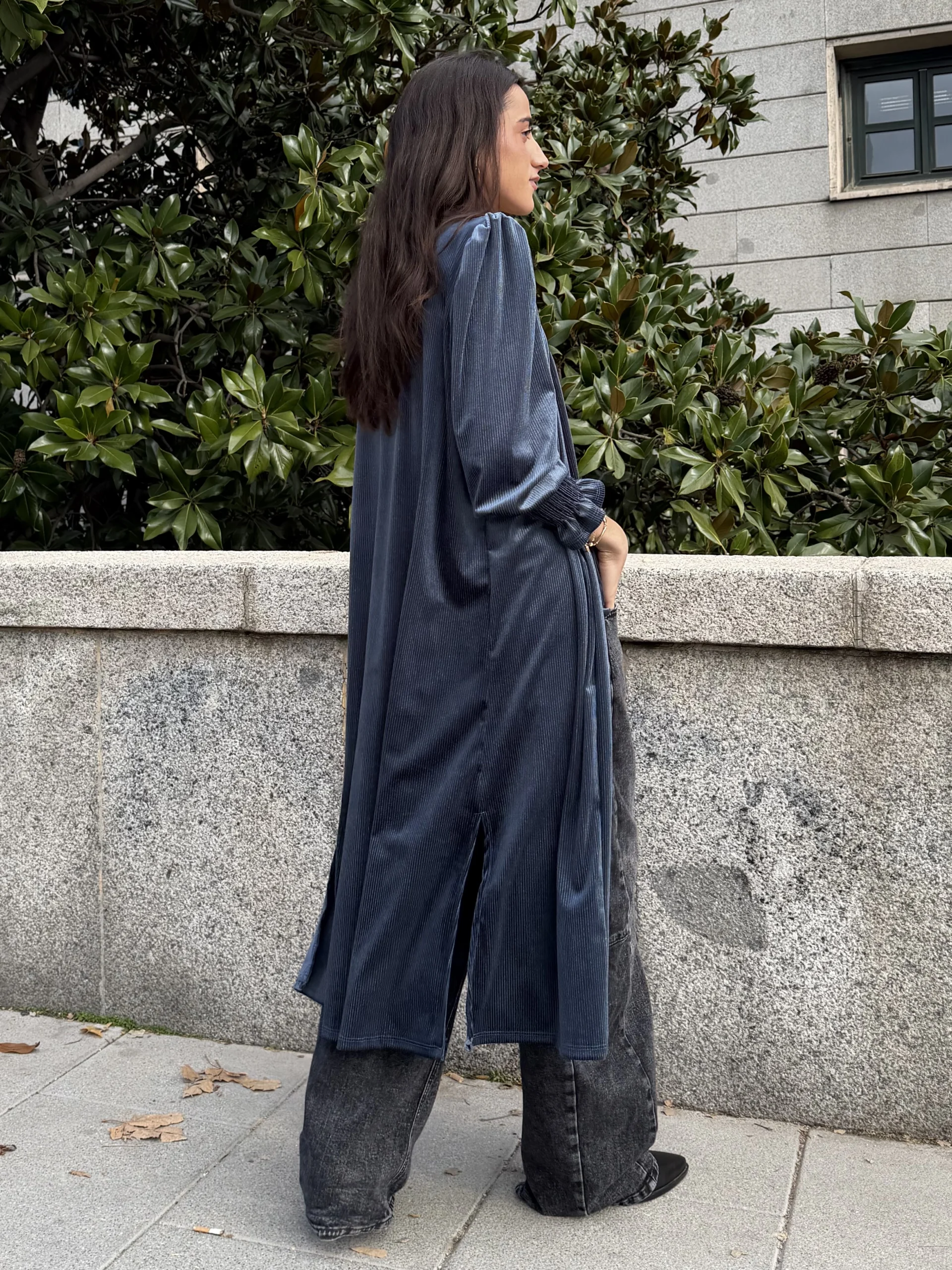 Kimono velvet azul grisáceo con caída fluida y brillo suave. Perfecto para elevar cualquier look o completar un conjunto coordinado.