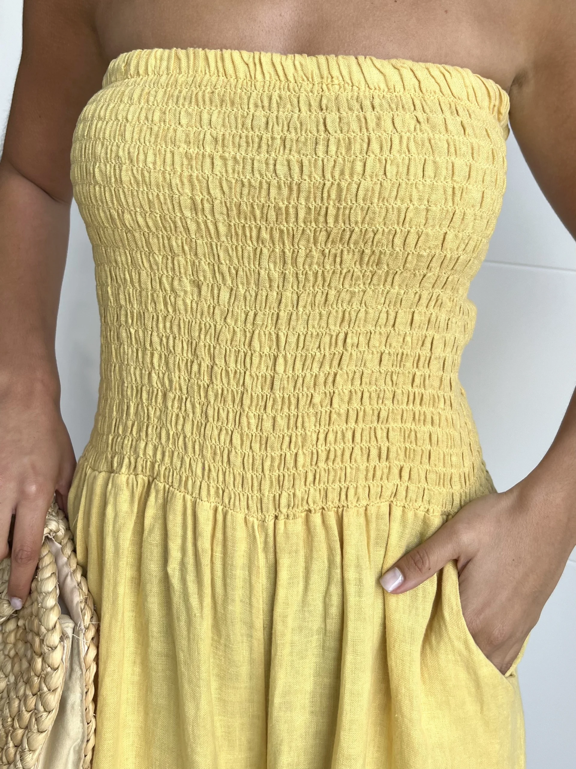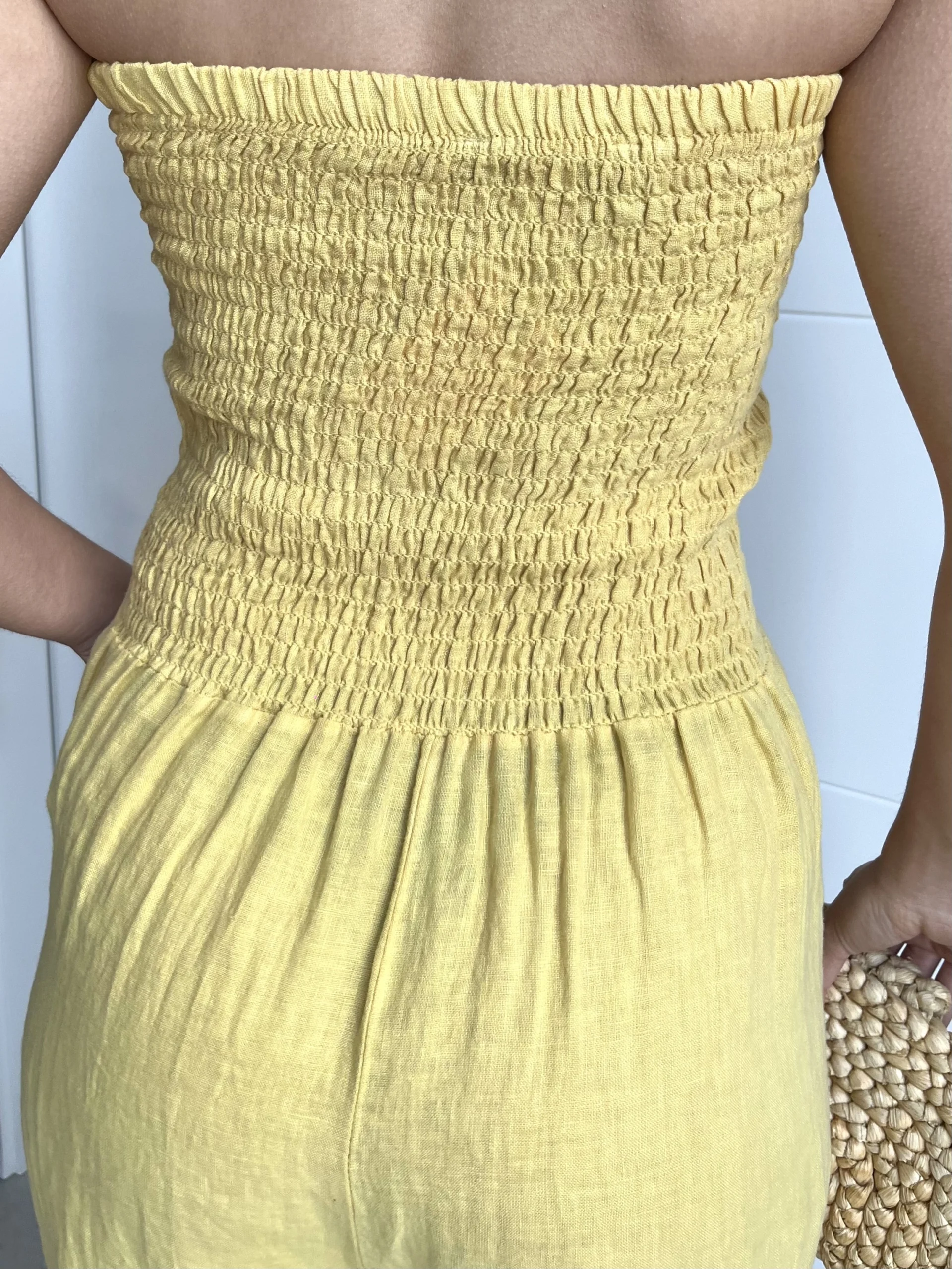 Mono largo de lino en color amarillo. Escote palabra de honor y pecho y espalda drapeadas. Bolsillos en los laterales y pernera ancha.