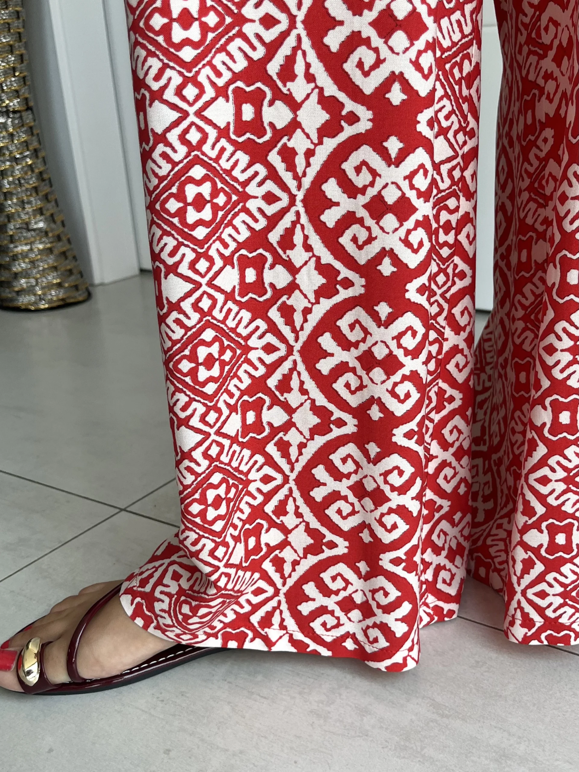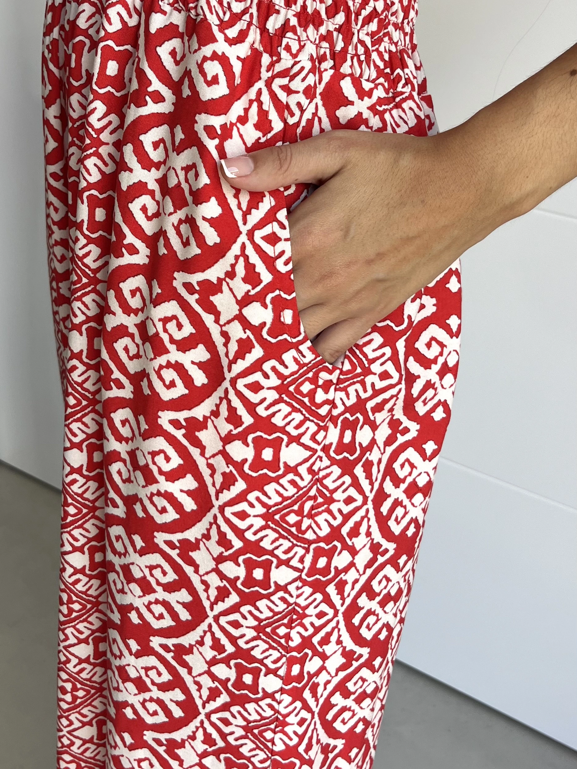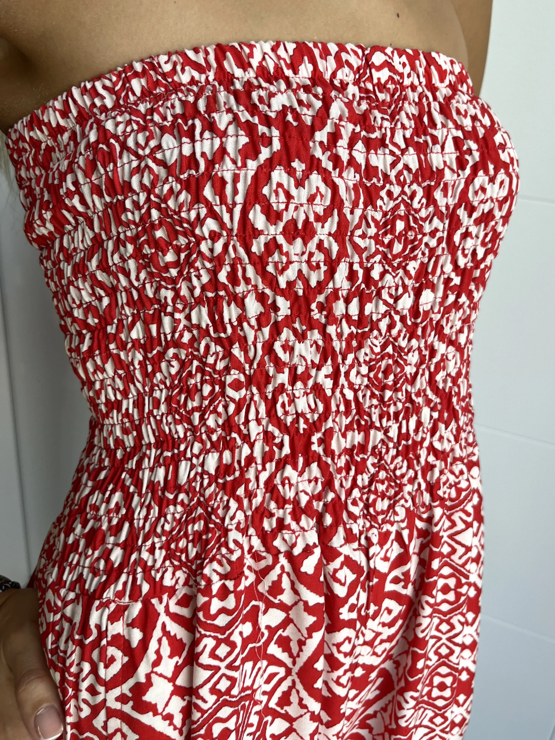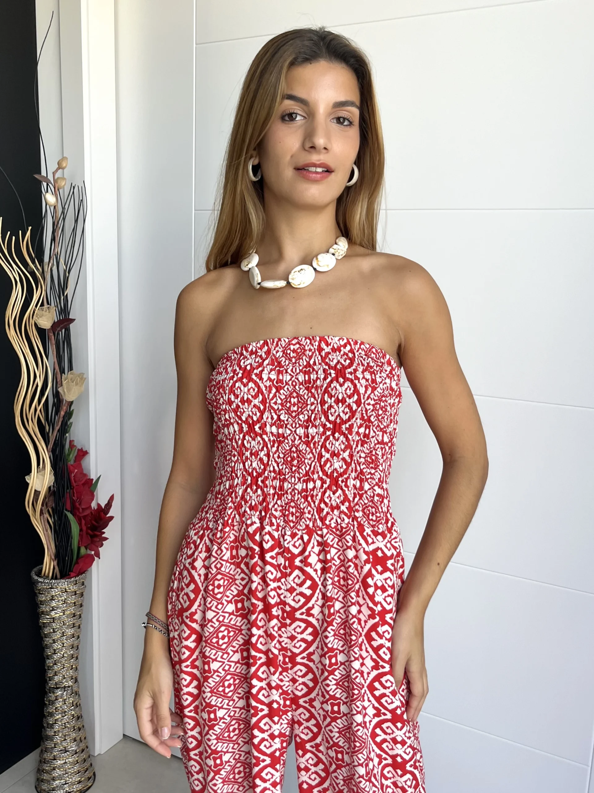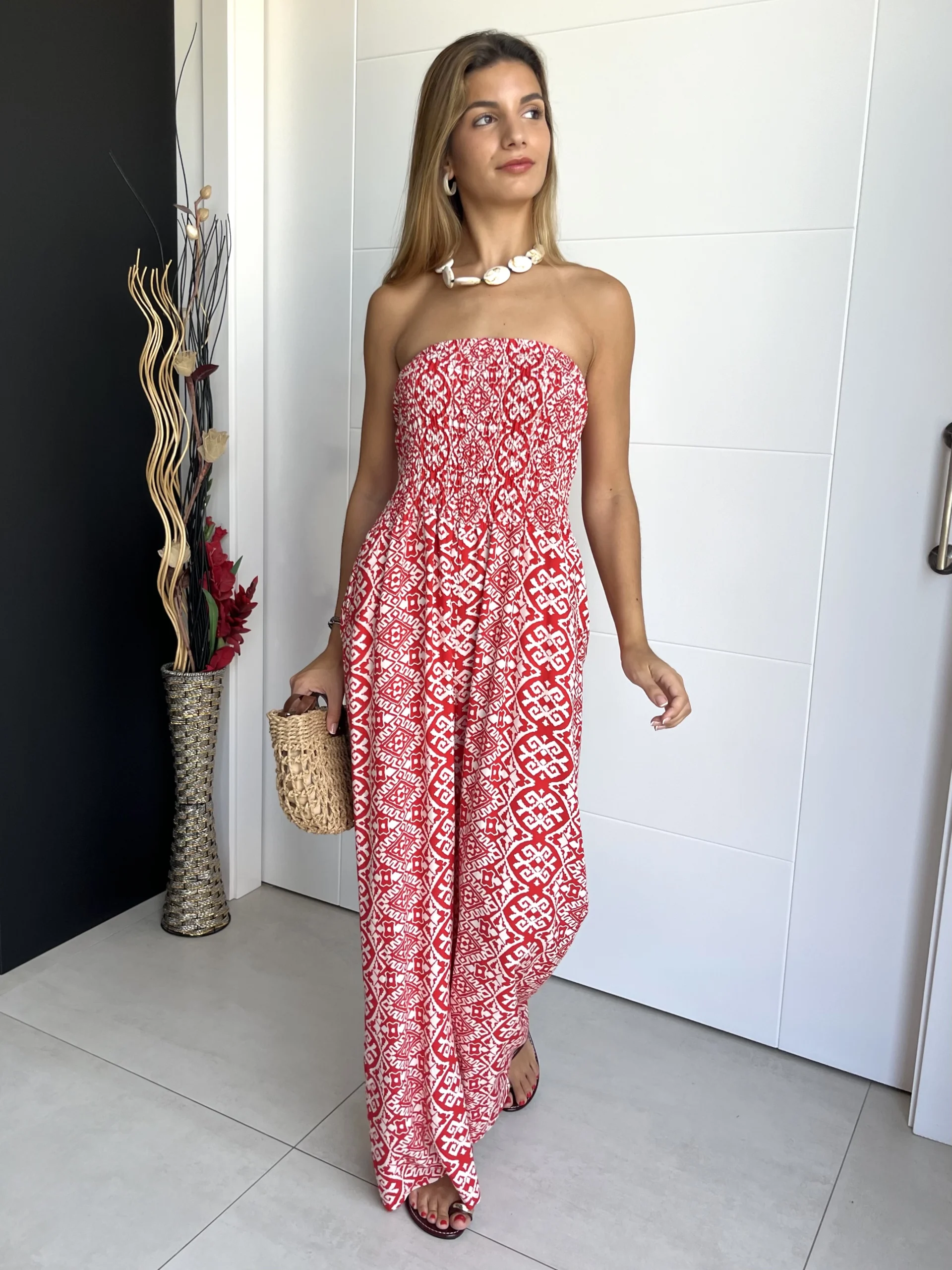 Mono largo con estampado abstracto en colores rojo y blanco. Escote palabra de honor y pecho y espalda drapeadas. Bolsillos en los laterales y pernera ancha.