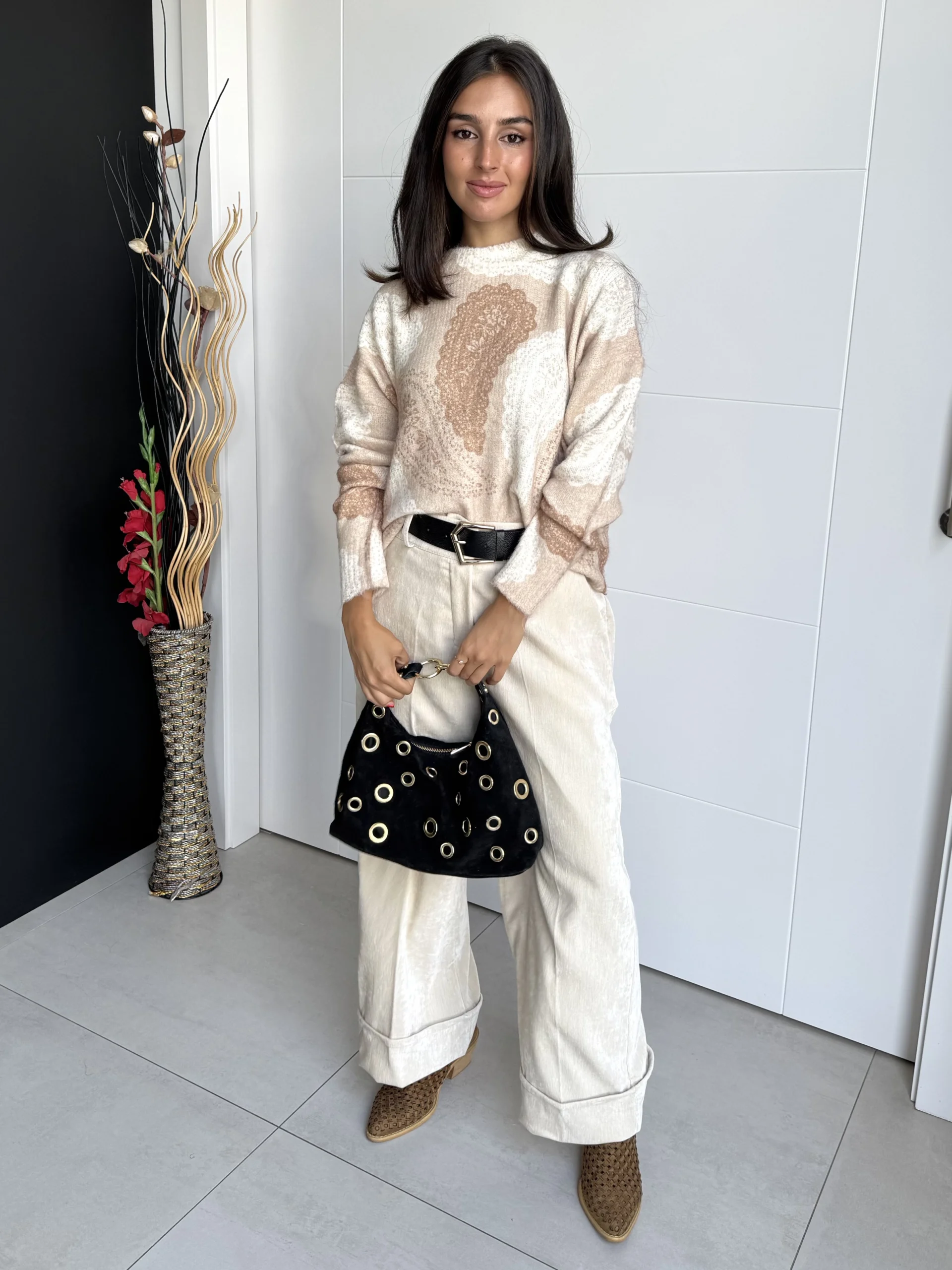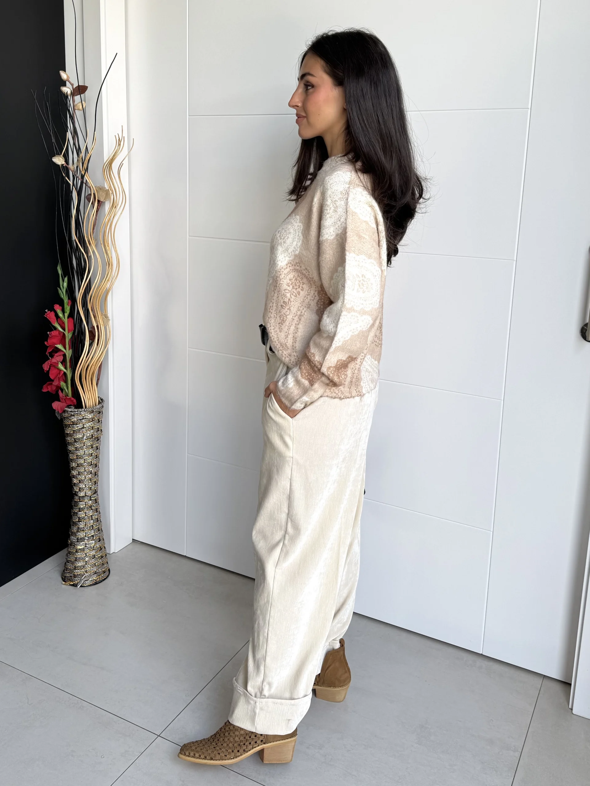 Pantalón Ancho Satén Beige fluido de tiro medio con acabado satinado suave. Con pinzas frontales, bolsillos laterales y dobladillo vuelto ancho, aporta comodidad y elegancia a la vez. Ideal para looks casual chic o de oficina.